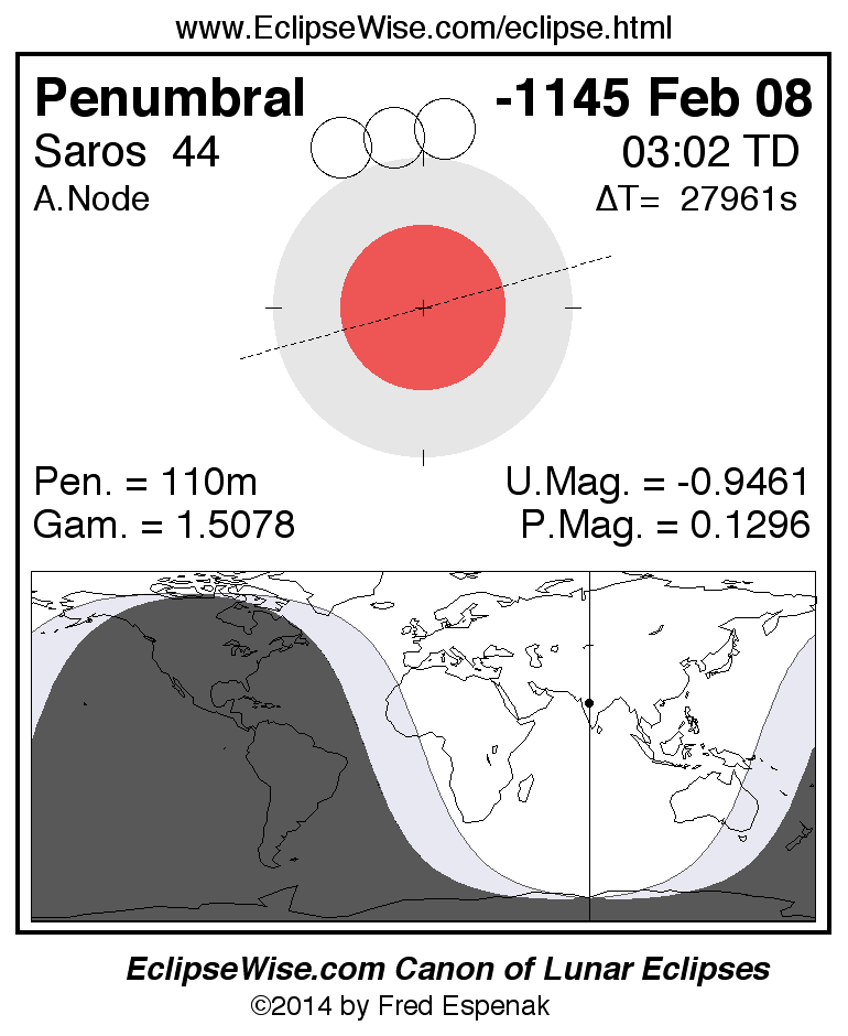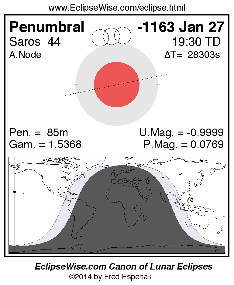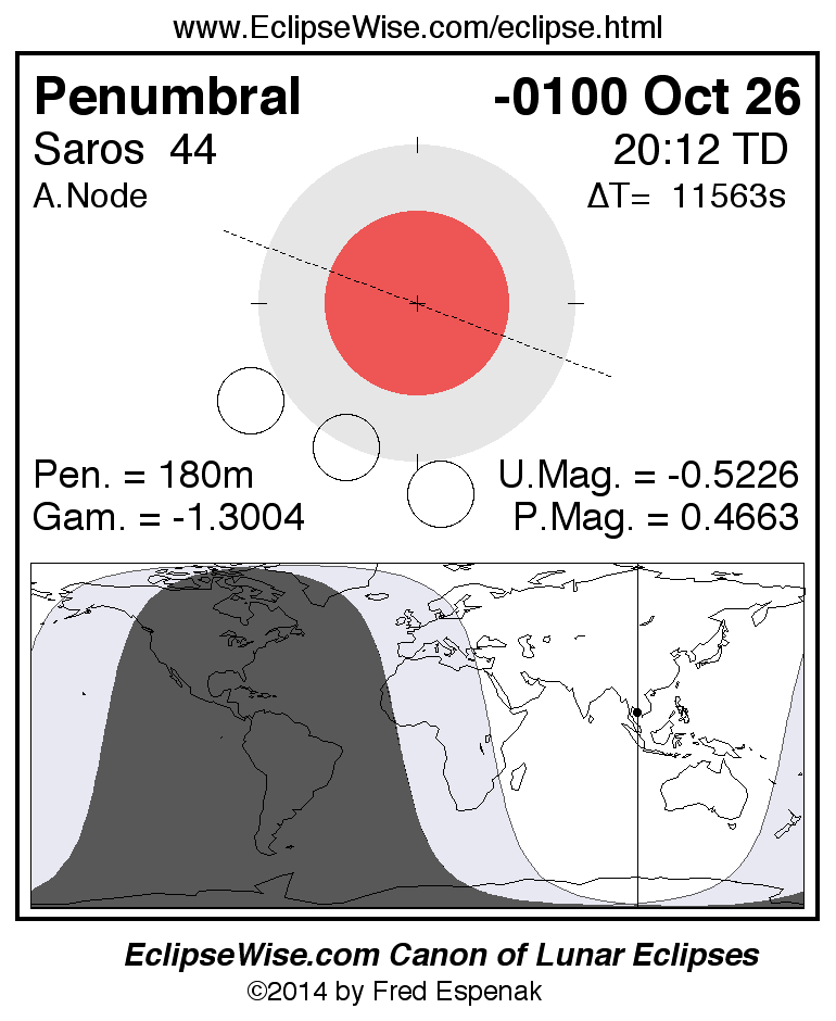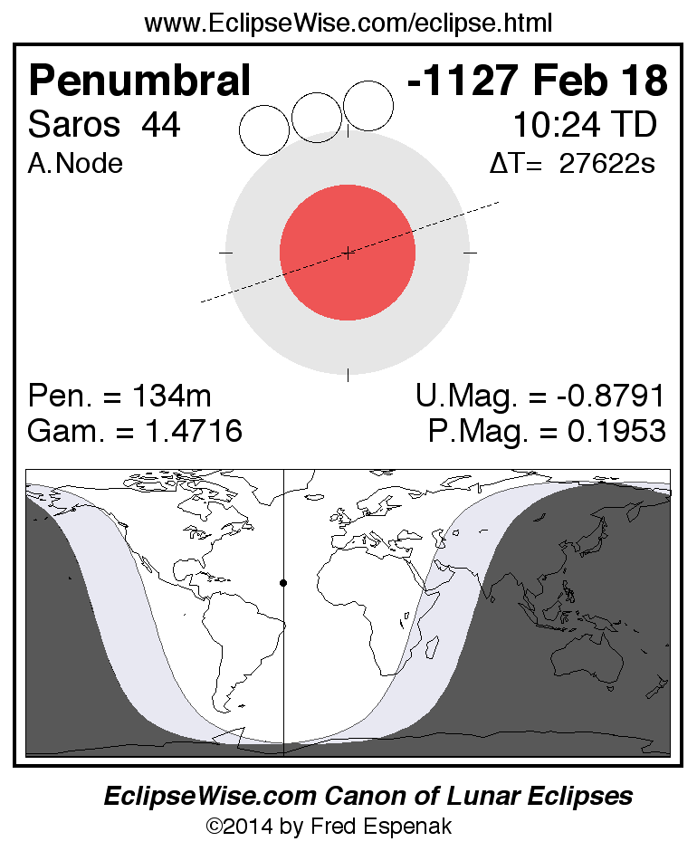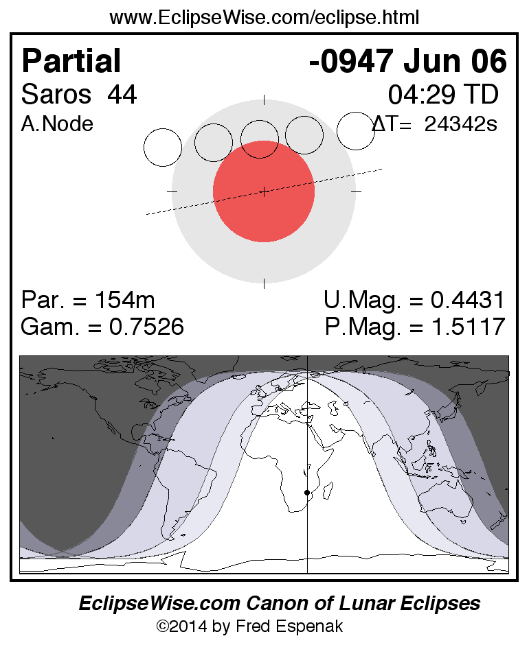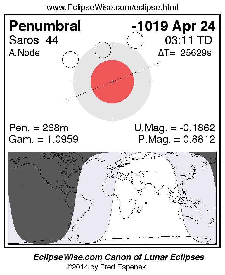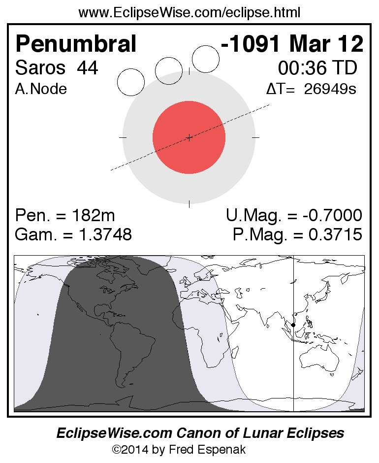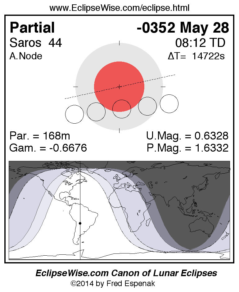 A panorama of all lunar eclipses belonging to Saros 44 is presented here. Each figure shows the Moon's path with respect to Earth's penumbral and umbral shadows. Below the path is a map depicting the geographic region of visibility for the eclipse. The date and time are given for the instant of Greatest Eclipse. Every figure serves as a hyperlink to the EclipseWise Prime page for that eclipse with a larger figure and complete details for the eclipse. Visit the Key to Lunar Eclipse Figures for a detailed explanation of these diagrams. Near the bottom of this page are a series of hyperlinks for more on lunar eclipses.