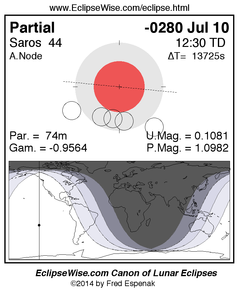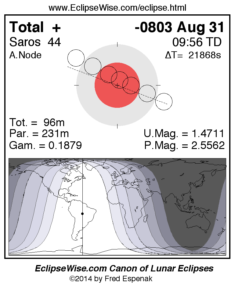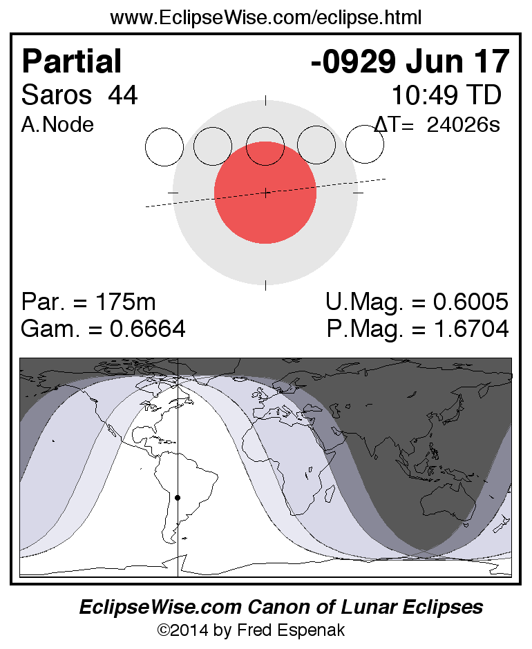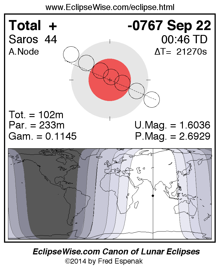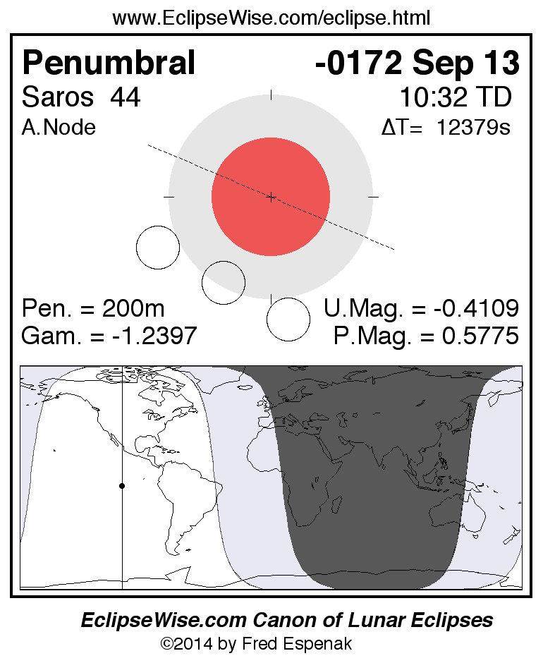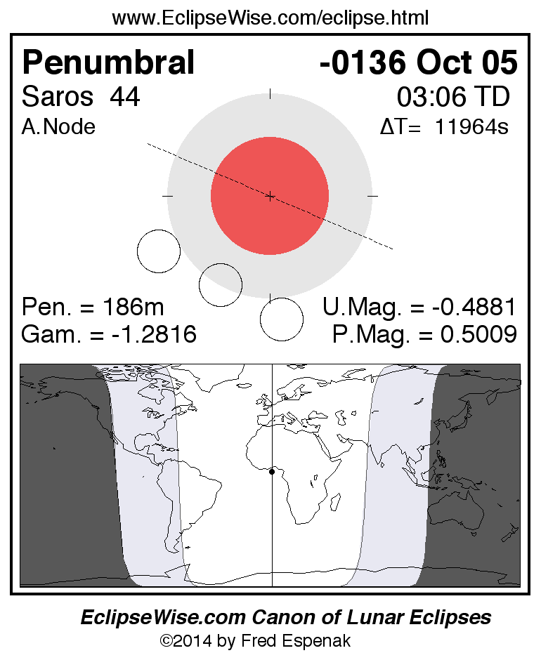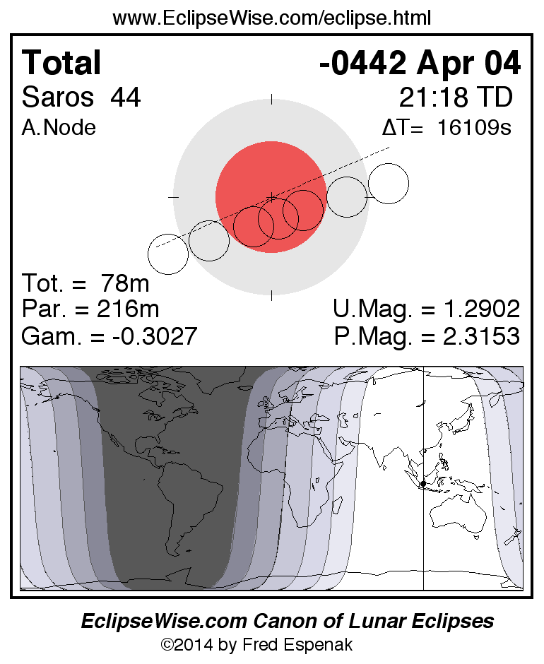 A panorama of all lunar eclipses belonging to Saros 44 is presented here. Each figure shows the Moon's path with respect to Earth's penumbral and umbral shadows. Below the path is a map depicting the geographic region of visibility for the eclipse. The date and time are given for the instant of Greatest Eclipse. Every figure serves as a hyperlink to the EclipseWise Prime page for that eclipse with a larger figure and complete details for the eclipse. Visit the Key to Lunar Eclipse Figures for a detailed explanation of these diagrams. Near the bottom of this page are a series of hyperlinks for more on lunar eclipses.