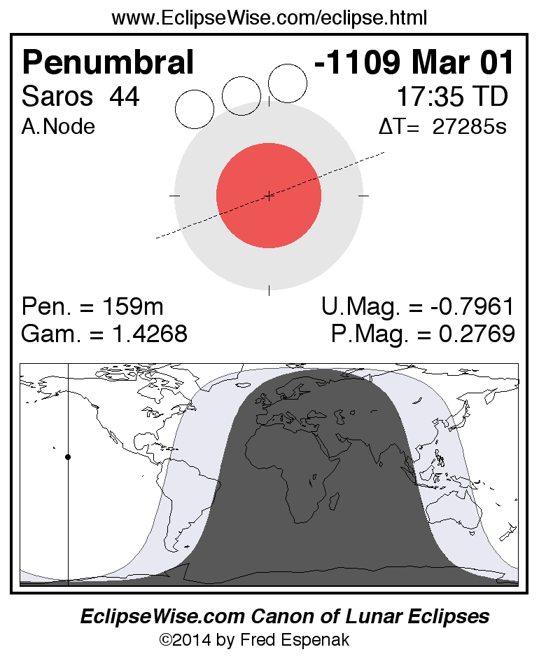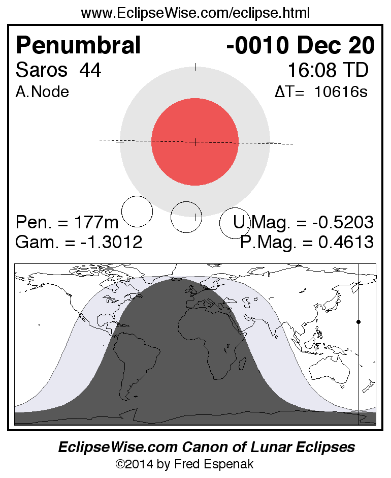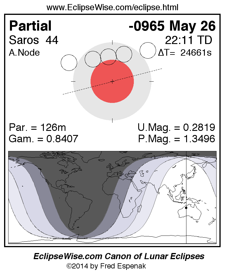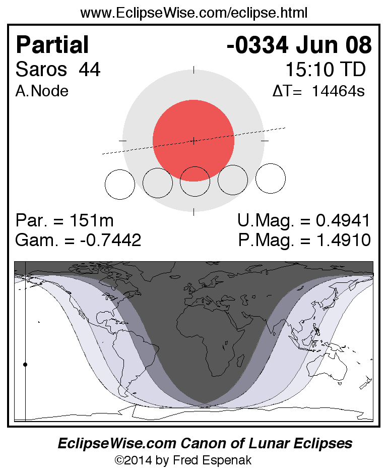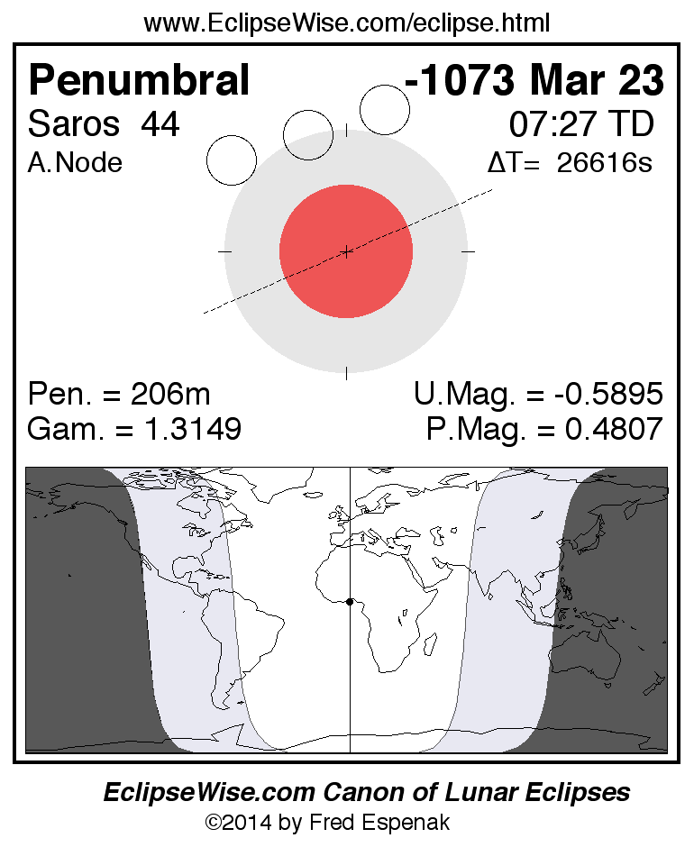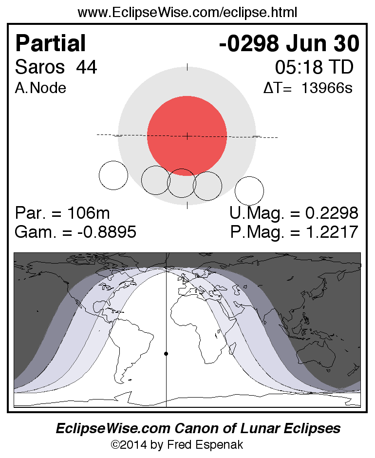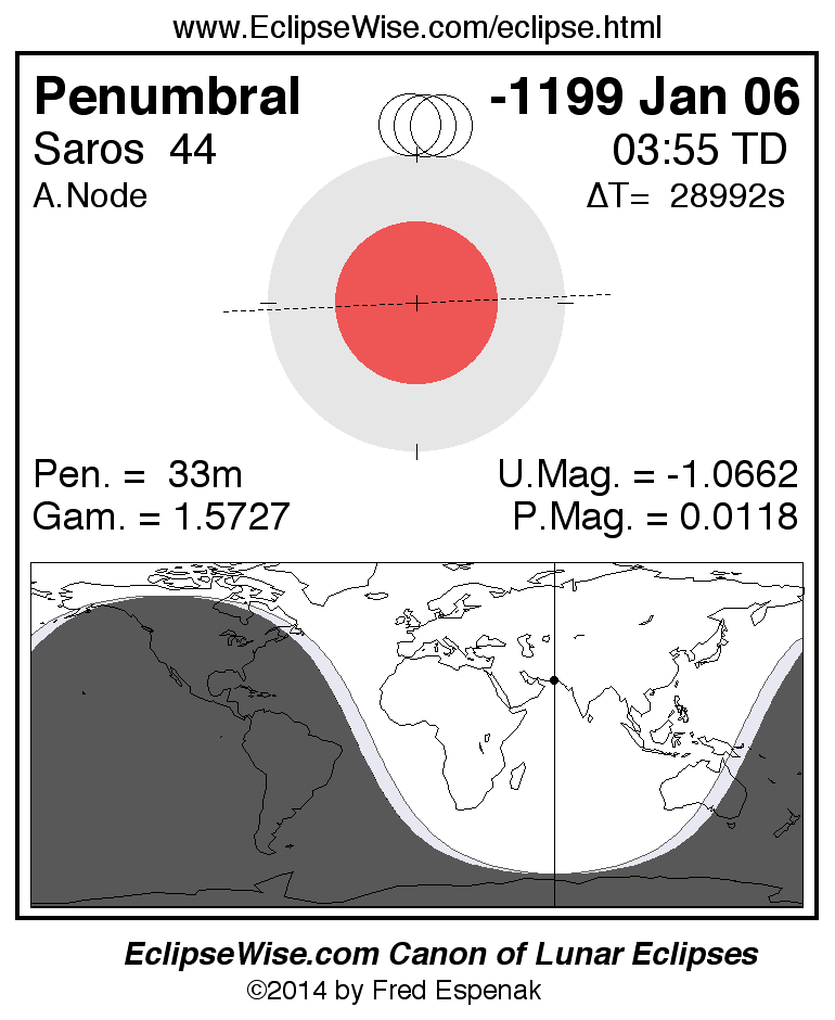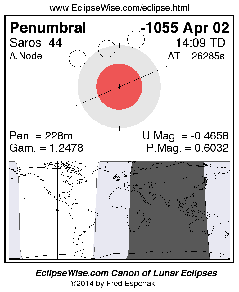A panorama of all lunar eclipses belonging to Saros 44 is presented here. Each figure shows the Moon's path with respect to Earth's penumbral and umbral shadows. Below the path is a map depicting the geographic region of visibility for the eclipse. The date and time are given for the instant of Greatest Eclipse. Every figure serves as a hyperlink to the EclipseWise Prime page for that eclipse with a larger figure and complete details for the eclipse. Visit the Key to Lunar Eclipse Figures for a detailed explanation of these diagrams. Near the bottom of this page are a series of hyperlinks for more on lunar eclipses.