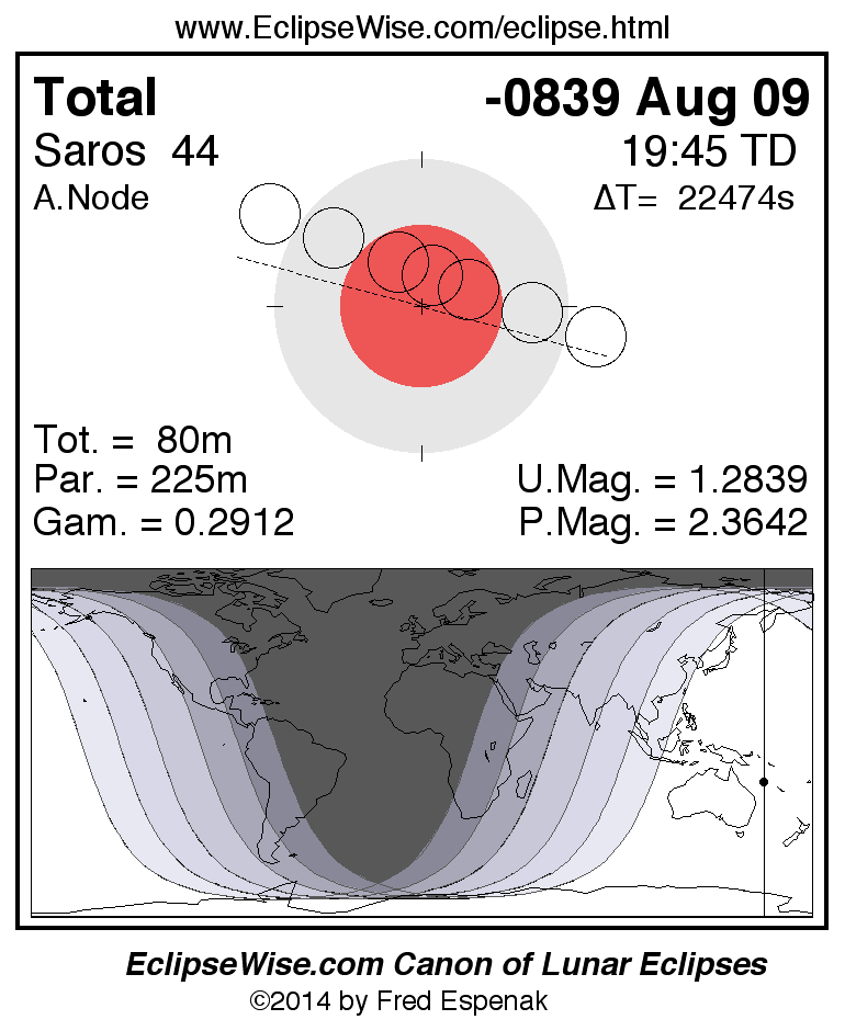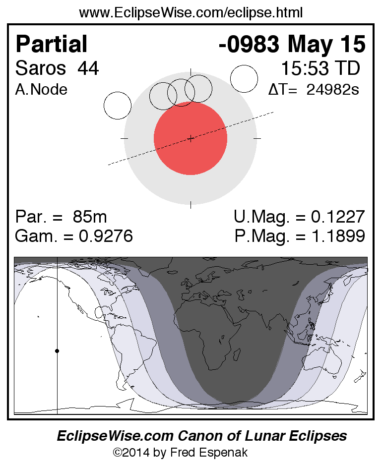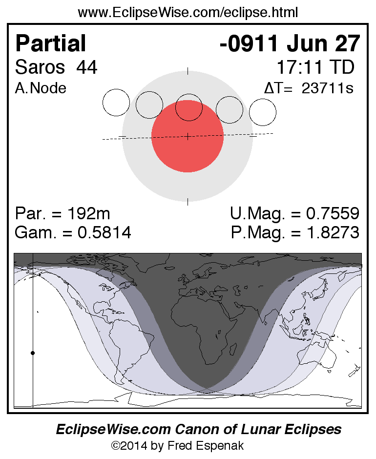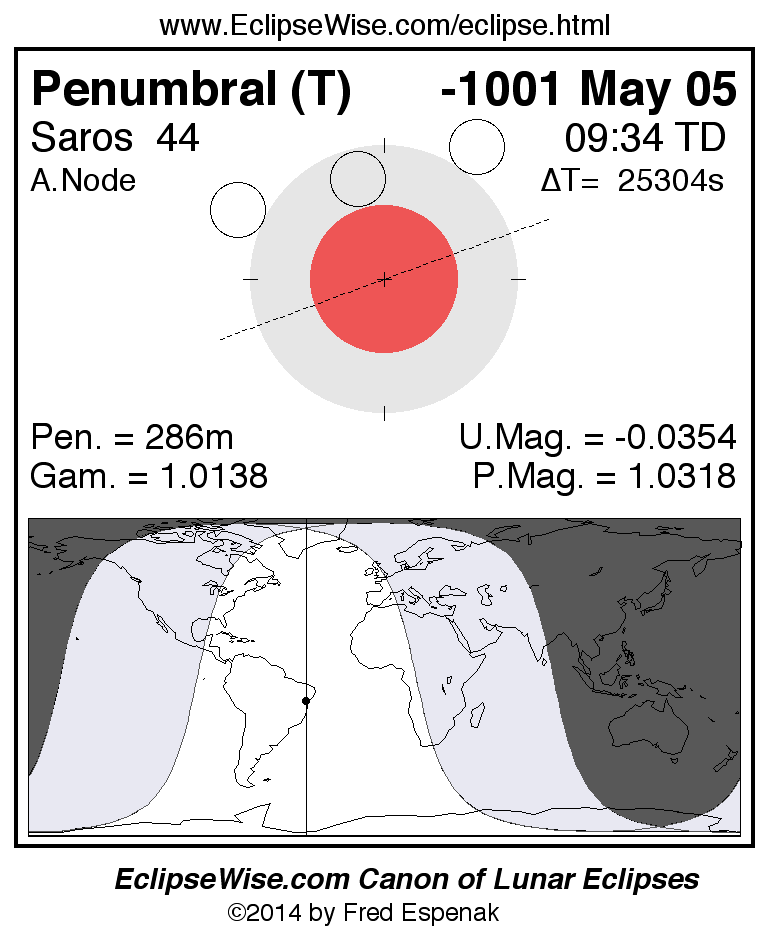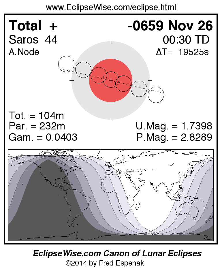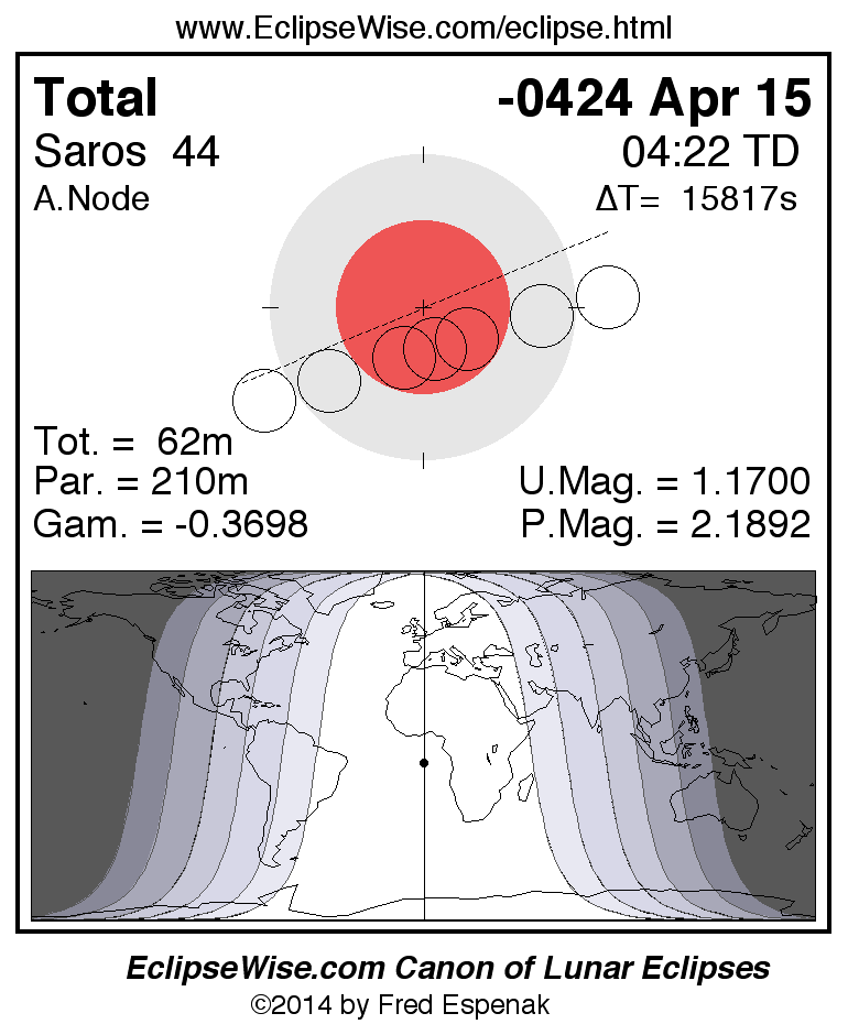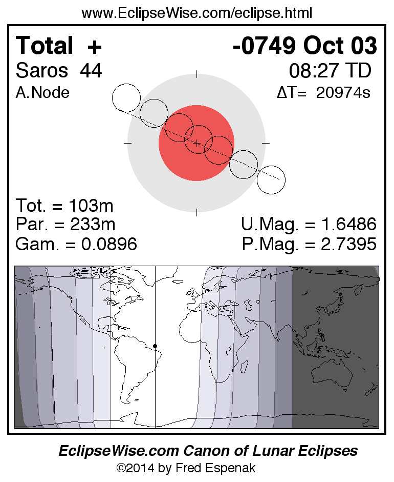 A panorama of all lunar eclipses belonging to Saros 44 is presented here. Each figure shows the Moon's path with respect to Earth's penumbral and umbral shadows. Below the path is a map depicting the geographic region of visibility for the eclipse. The date and time are given for the instant of Greatest Eclipse. Every figure serves as a hyperlink to the EclipseWise Prime page for that eclipse with a larger figure and complete details for the eclipse. Visit the Key to Lunar Eclipse Figures for a detailed explanation of these diagrams. Near the bottom of this page are a series of hyperlinks for more on lunar eclipses.