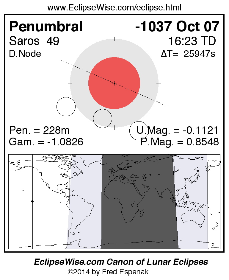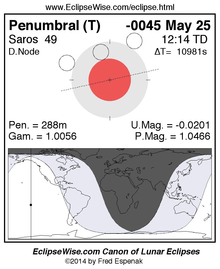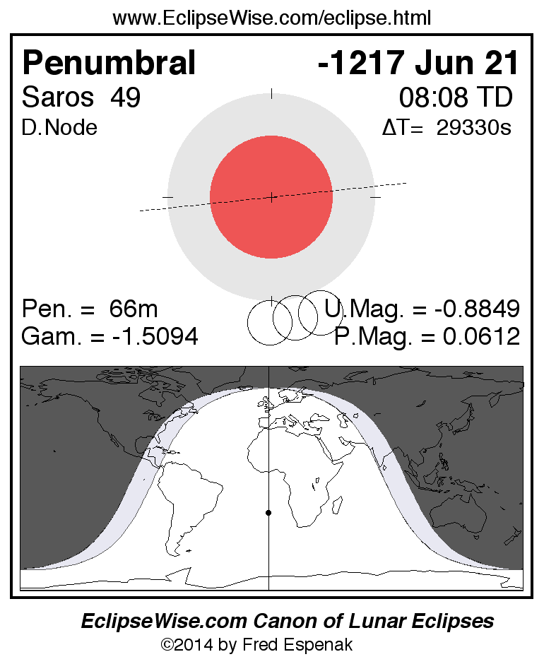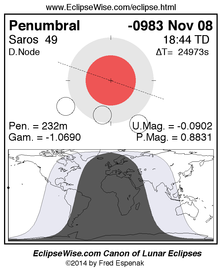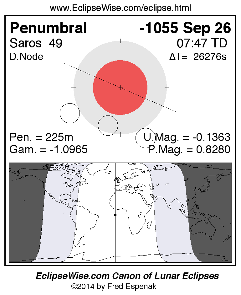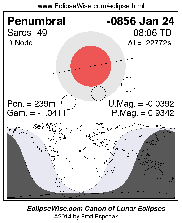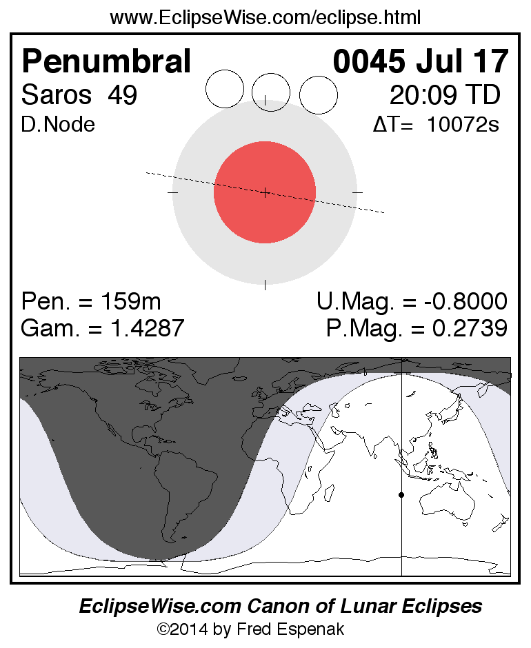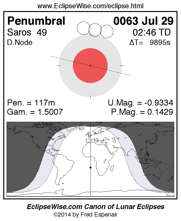 A panorama of all lunar eclipses belonging to Saros 49 is presented here. Each figure shows the Moon's path with respect to Earth's penumbral and umbral shadows. Below the path is a map depicting the geographic region of visibility for the eclipse. The date and time are given for the instant of Greatest Eclipse. Every figure serves as a hyperlink to the EclipseWise Prime page for that eclipse with a larger figure and complete details for the eclipse. Visit the Key to Lunar Eclipse Figures for a detailed explanation of these diagrams. Near the bottom of this page are a series of hyperlinks for more on lunar eclipses.
