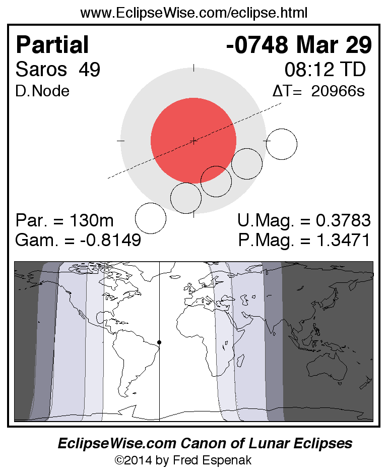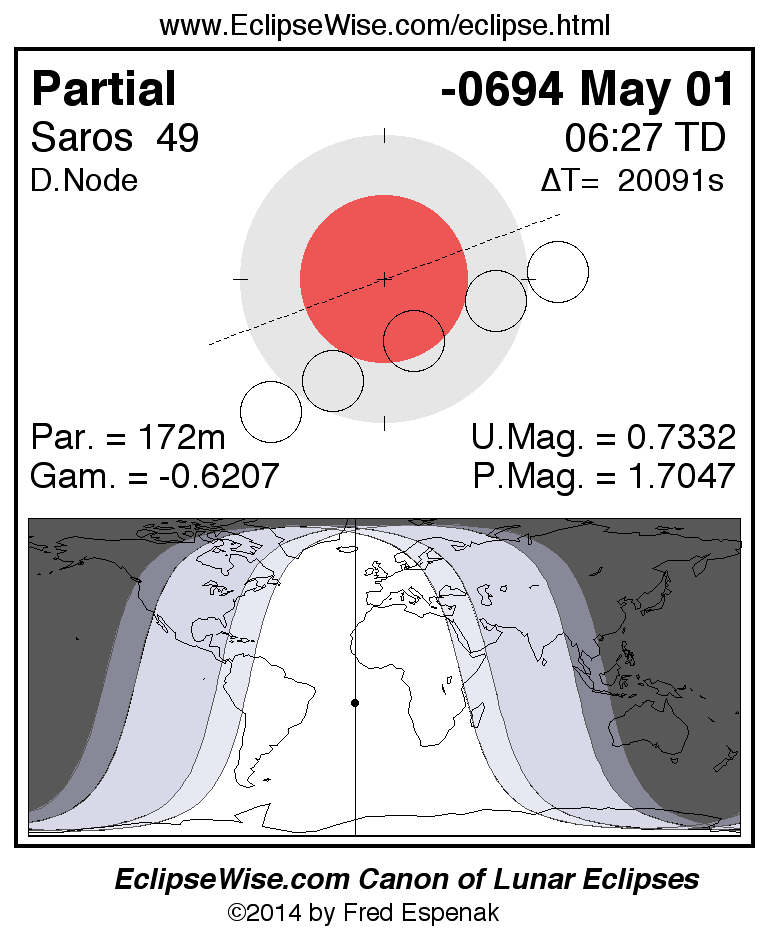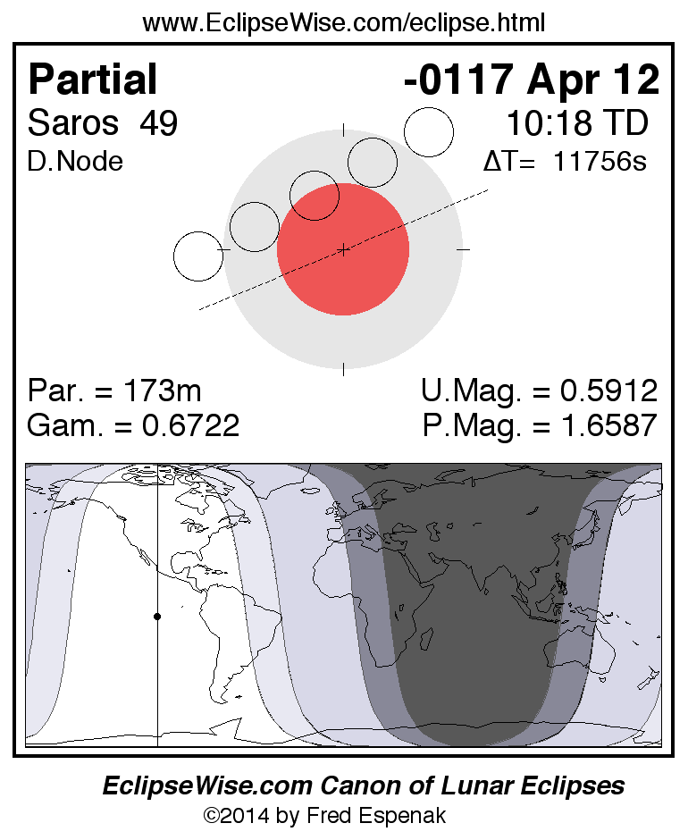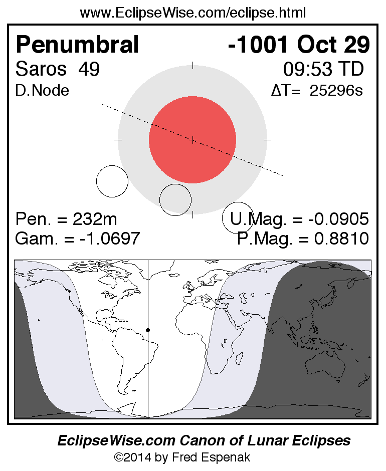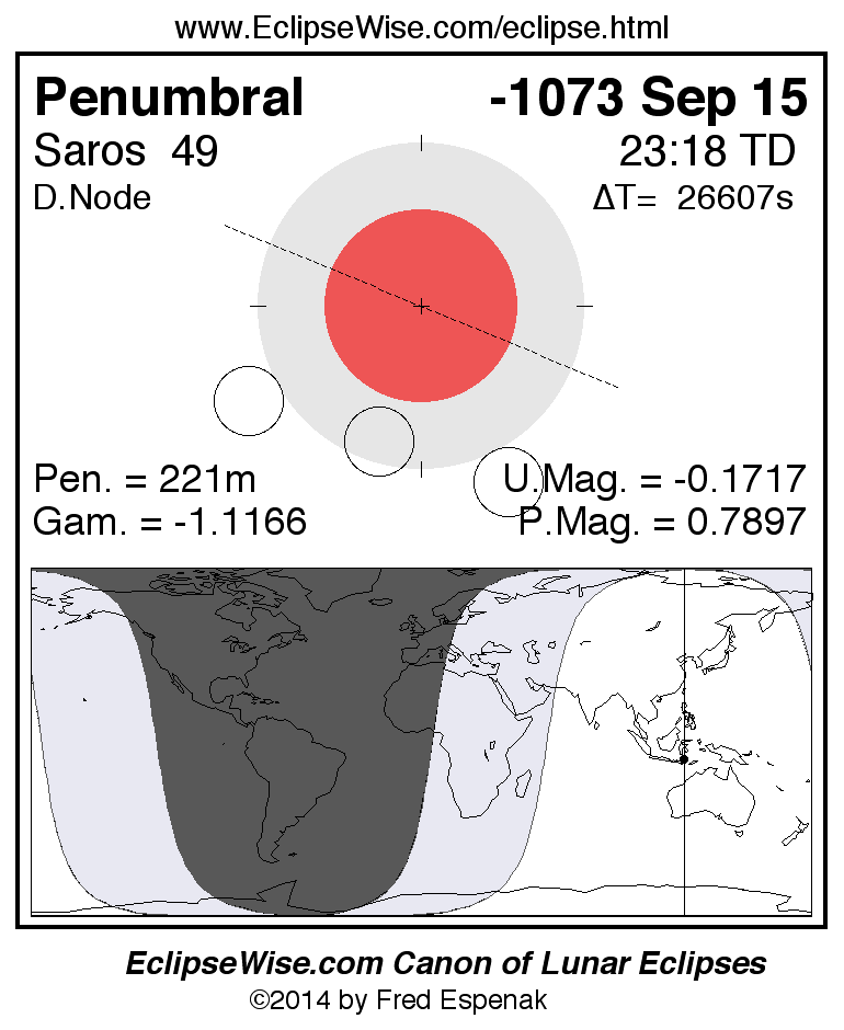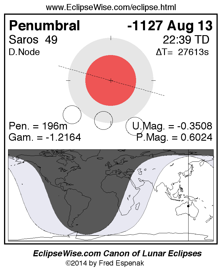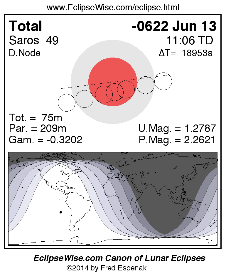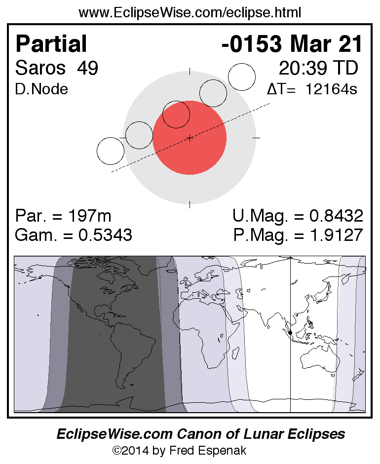 A panorama of all lunar eclipses belonging to Saros 49 is presented here. Each figure shows the Moon's path with respect to Earth's penumbral and umbral shadows. Below the path is a map depicting the geographic region of visibility for the eclipse. The date and time are given for the instant of Greatest Eclipse. Every figure serves as a hyperlink to the EclipseWise Prime page for that eclipse with a larger figure and complete details for the eclipse. Visit the Key to Lunar Eclipse Figures for a detailed explanation of these diagrams. Near the bottom of this page are a series of hyperlinks for more on lunar eclipses.