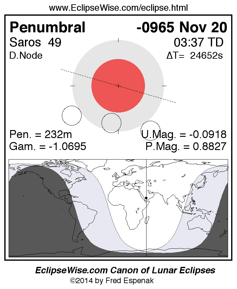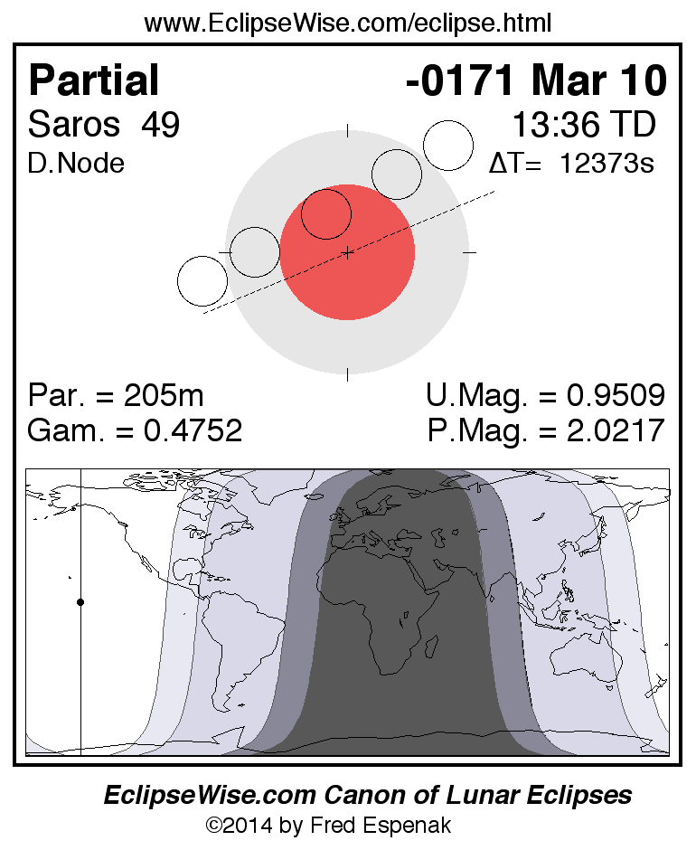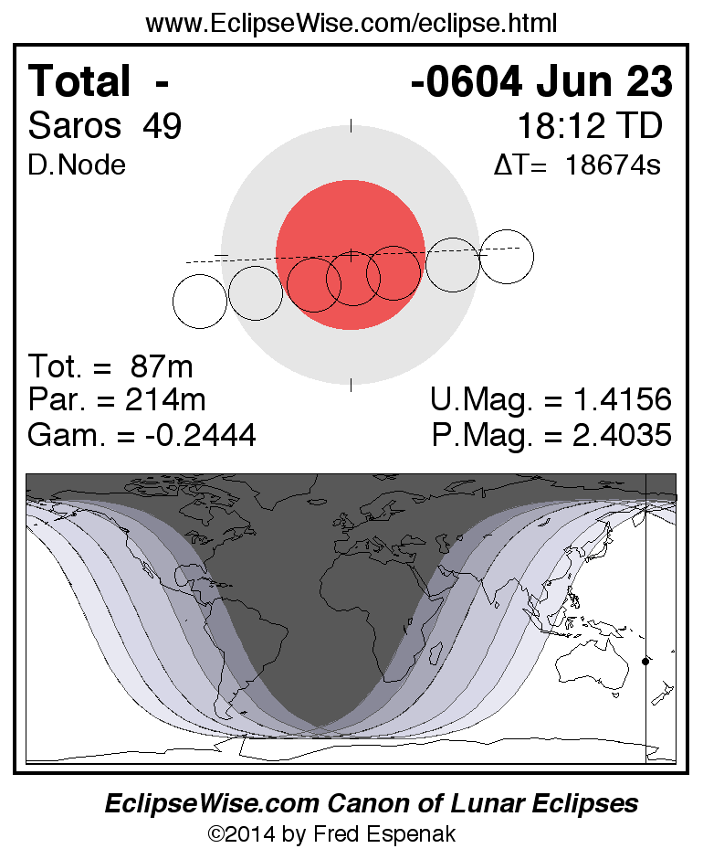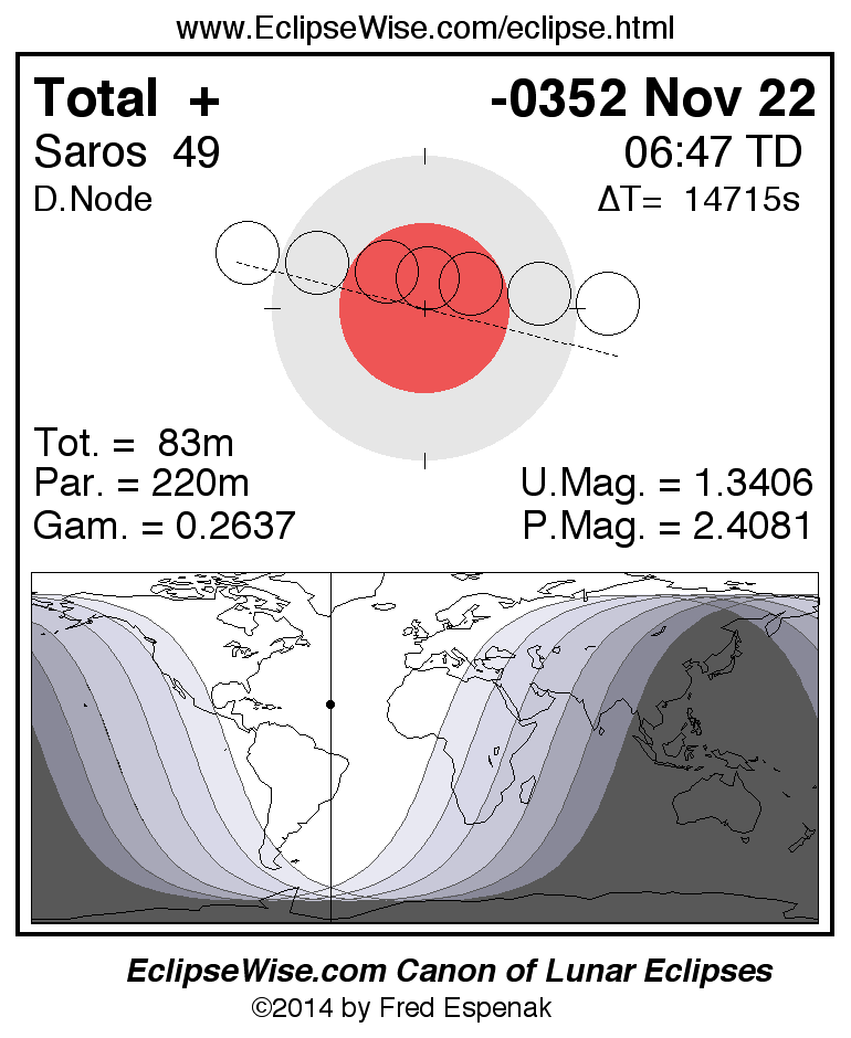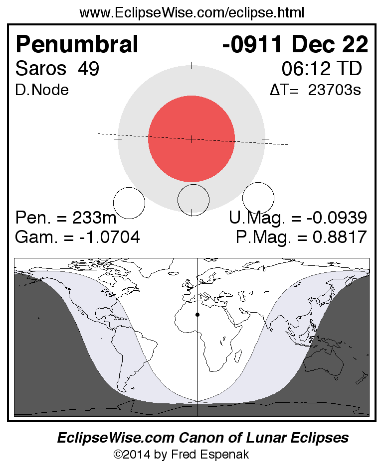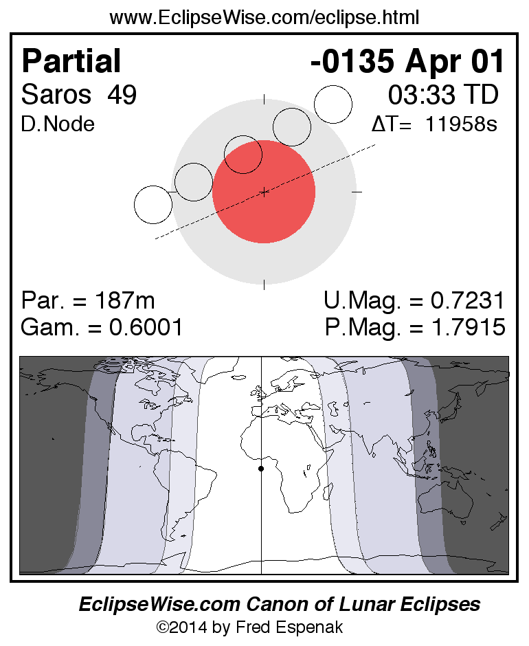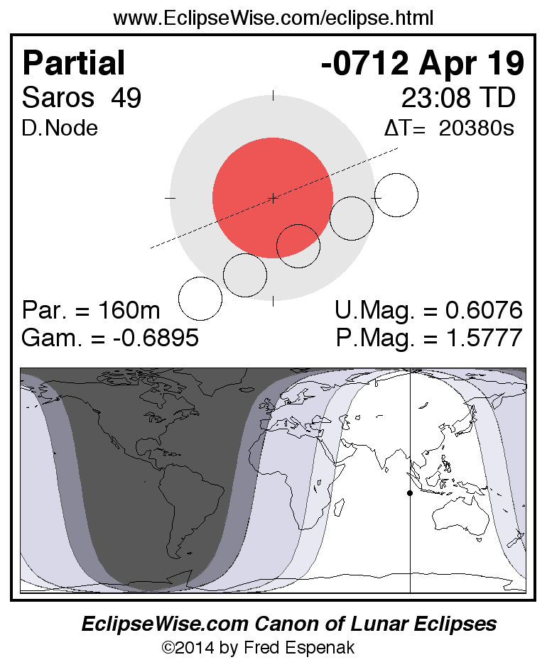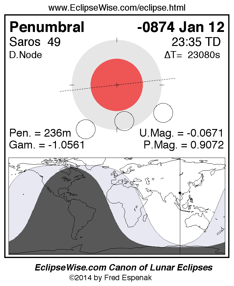 A panorama of all lunar eclipses belonging to Saros 49 is presented here. Each figure shows the Moon's path with respect to Earth's penumbral and umbral shadows. Below the path is a map depicting the geographic region of visibility for the eclipse. The date and time are given for the instant of Greatest Eclipse. Every figure serves as a hyperlink to the EclipseWise Prime page for that eclipse with a larger figure and complete details for the eclipse. Visit the Key to Lunar Eclipse Figures for a detailed explanation of these diagrams. Near the bottom of this page are a series of hyperlinks for more on lunar eclipses.