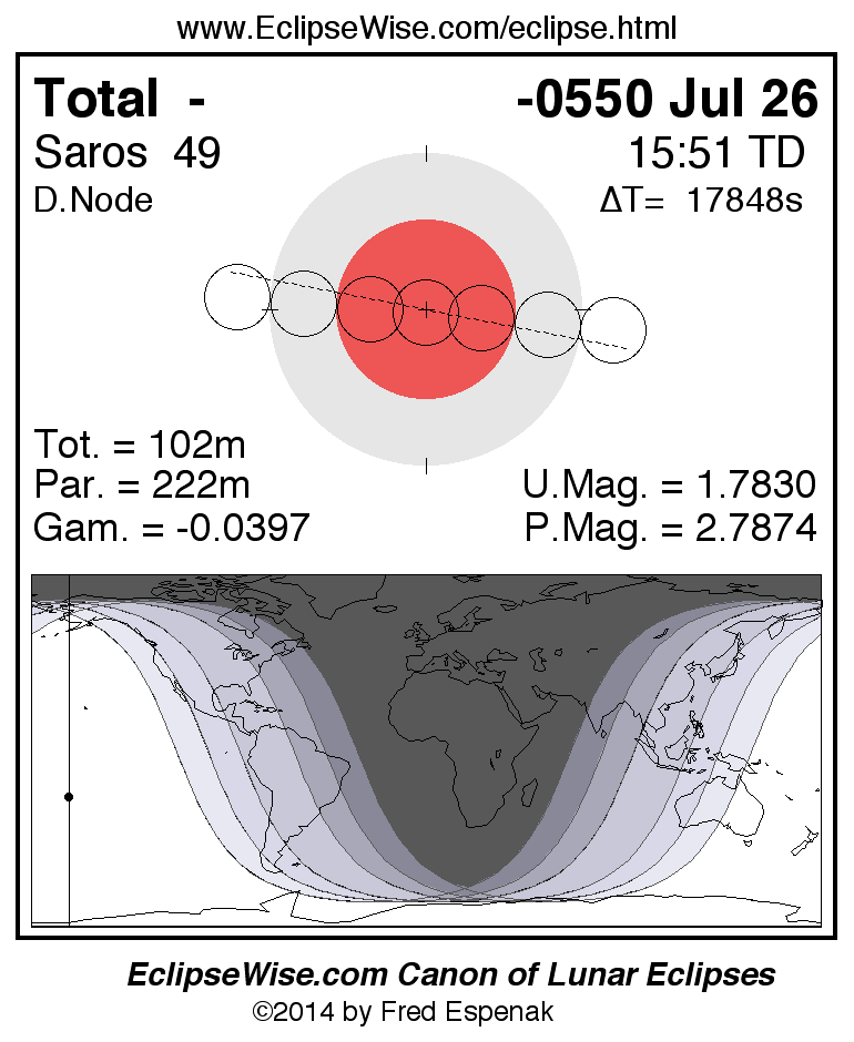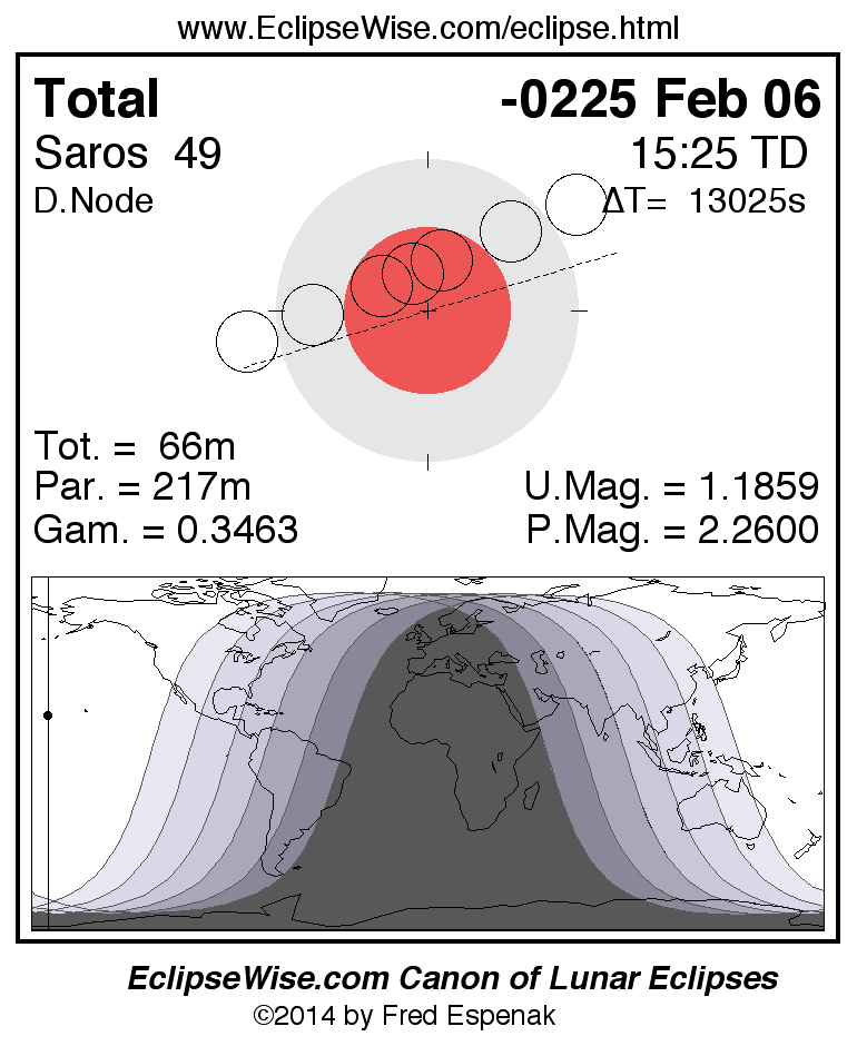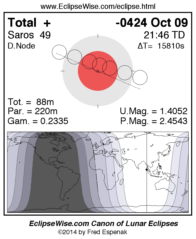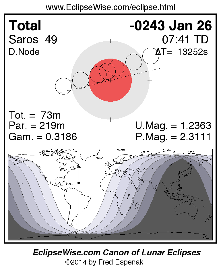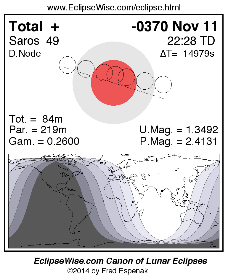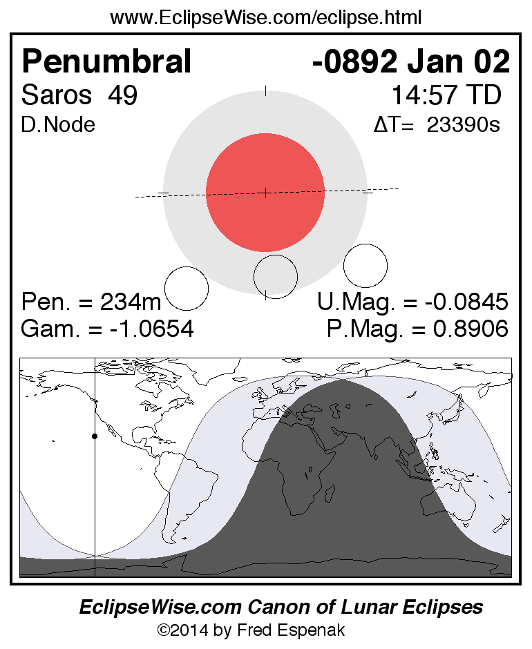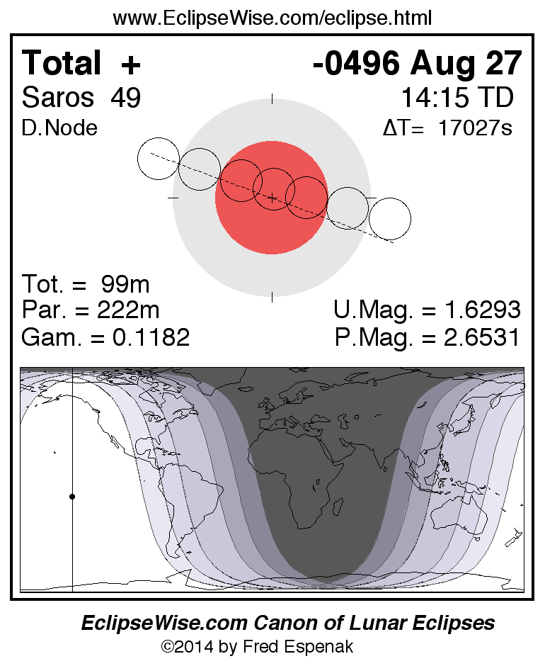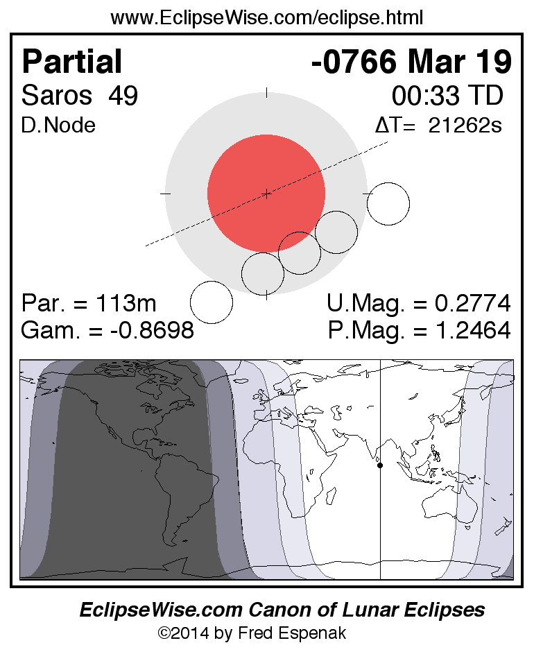 A panorama of all lunar eclipses belonging to Saros 49 is presented here. Each figure shows the Moon's path with respect to Earth's penumbral and umbral shadows. Below the path is a map depicting the geographic region of visibility for the eclipse. The date and time are given for the instant of Greatest Eclipse. Every figure serves as a hyperlink to the EclipseWise Prime page for that eclipse with a larger figure and complete details for the eclipse. Visit the Key to Lunar Eclipse Figures for a detailed explanation of these diagrams. Near the bottom of this page are a series of hyperlinks for more on lunar eclipses.