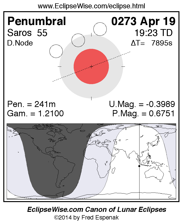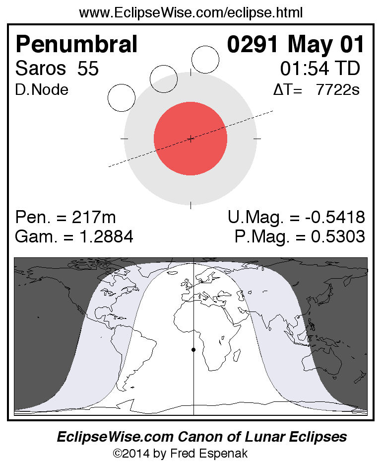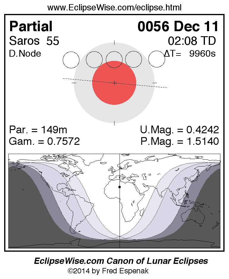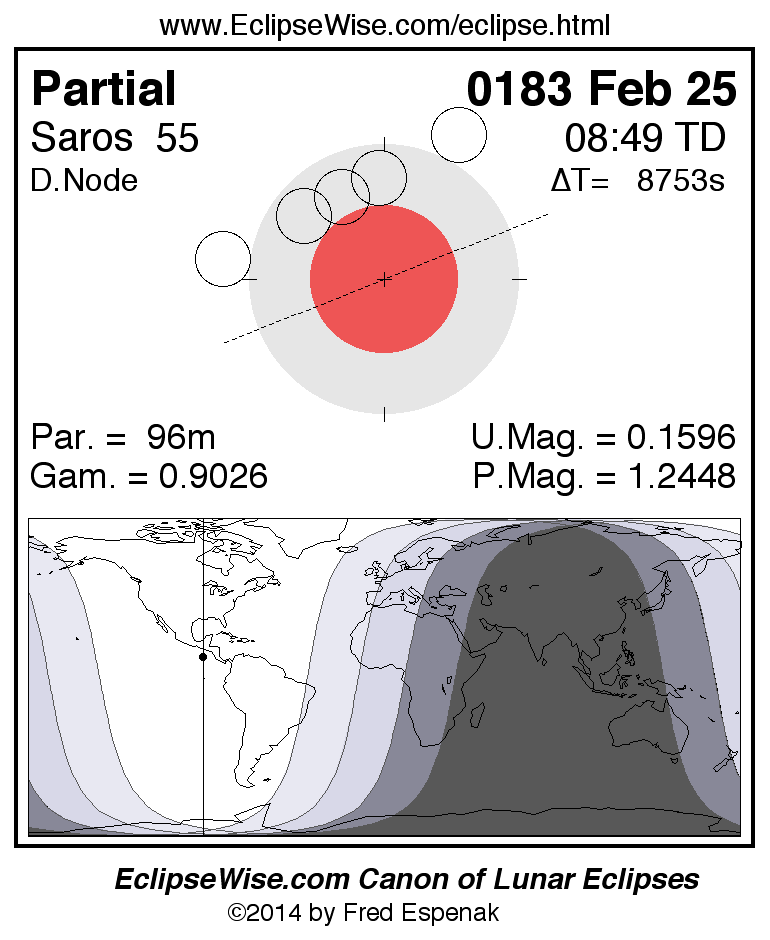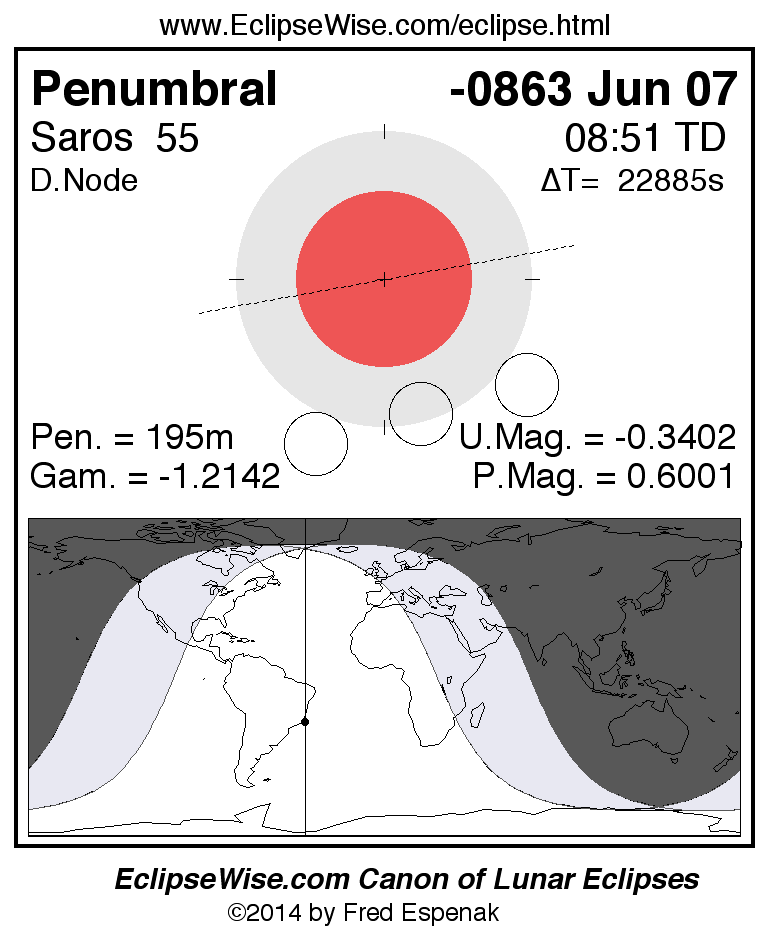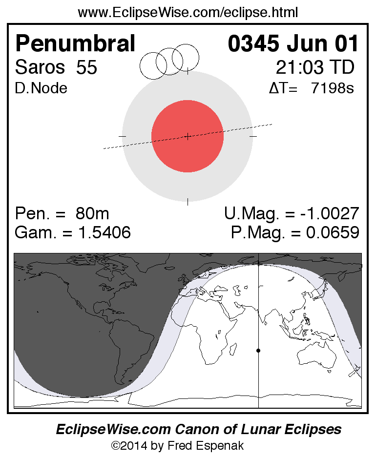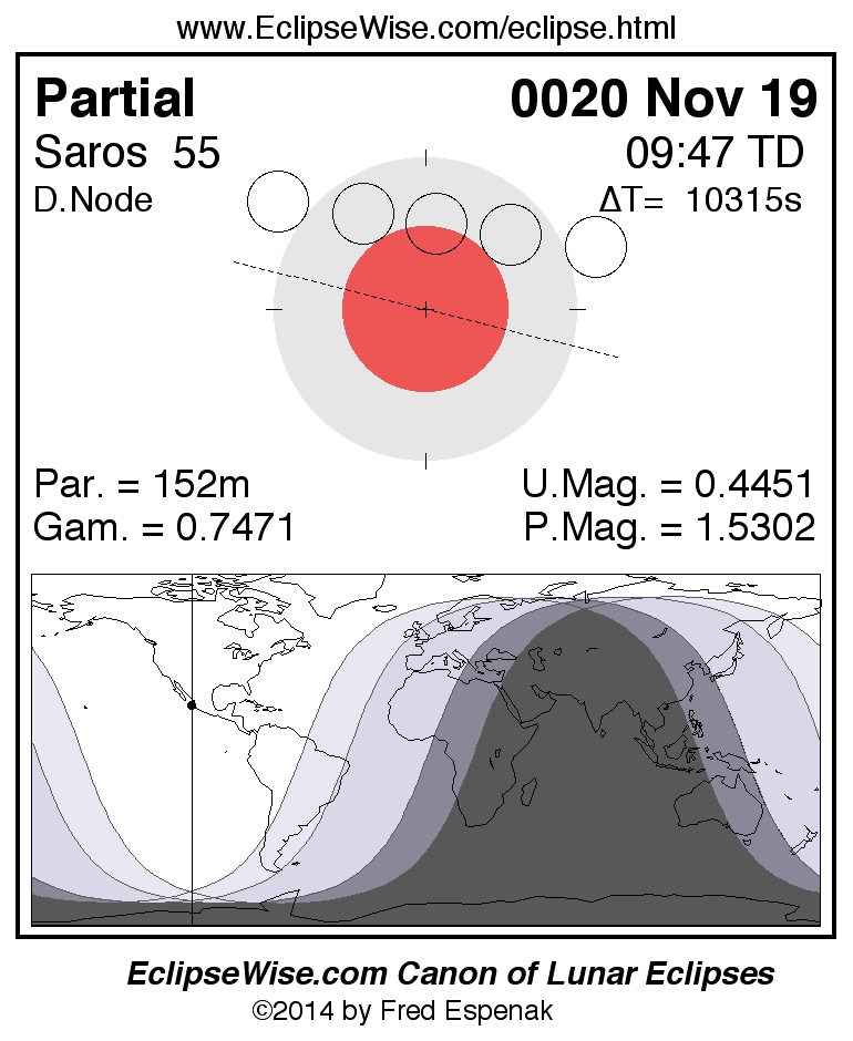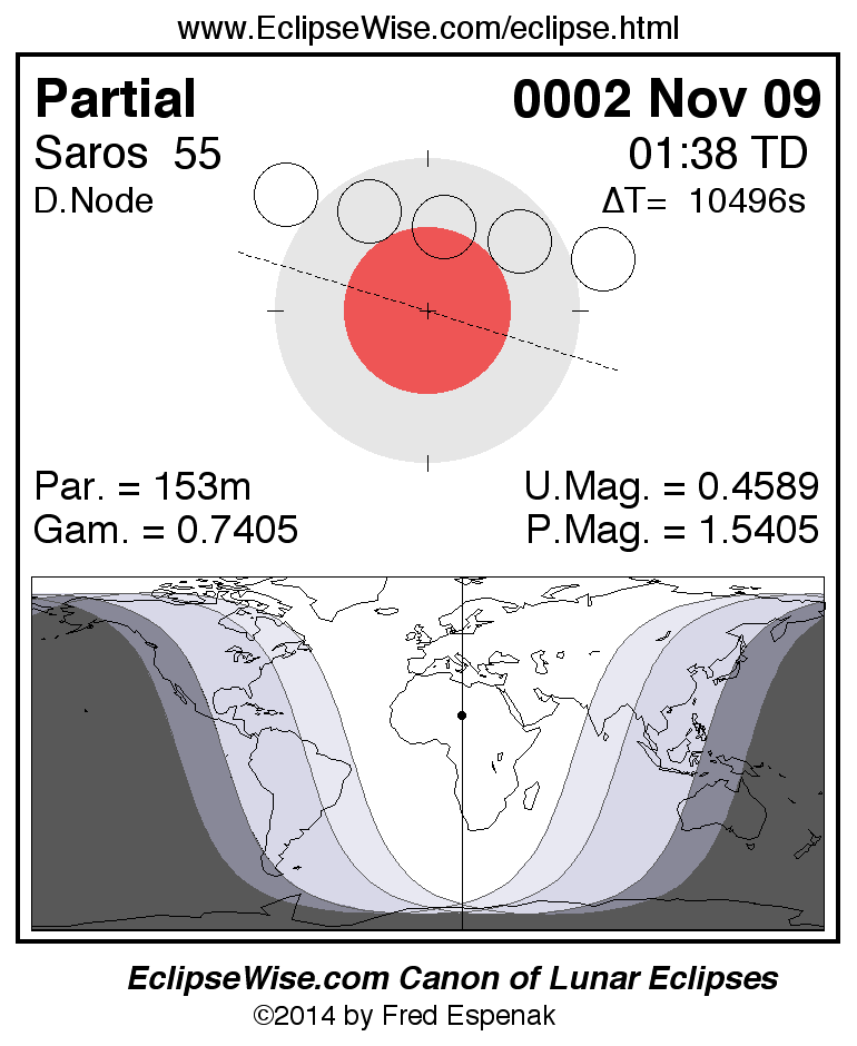 A panorama of all lunar eclipses belonging to Saros 55 is presented here. Each figure shows the Moon's path with respect to Earth's penumbral and umbral shadows. Below the path is a map depicting the geographic region of visibility for the eclipse. The date and time are given for the instant of Greatest Eclipse. Every figure serves as a hyperlink to the EclipseWise Prime page for that eclipse with a larger figure and complete details for the eclipse. Visit the Key to Lunar Eclipse Figures for a detailed explanation of these diagrams. Near the bottom of this page are a series of hyperlinks for more on lunar eclipses.
