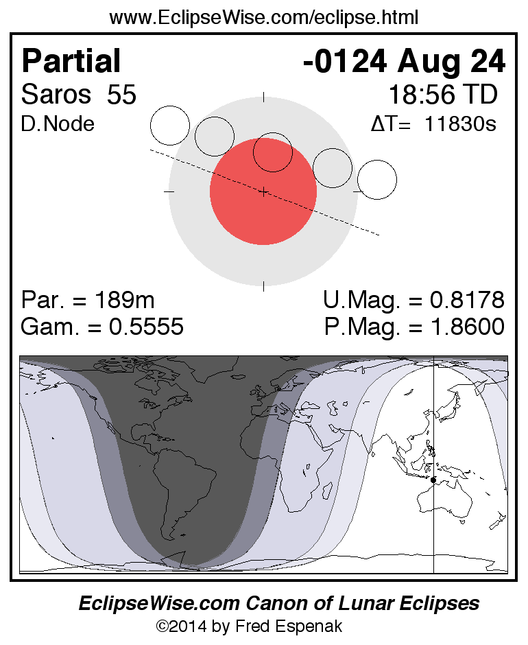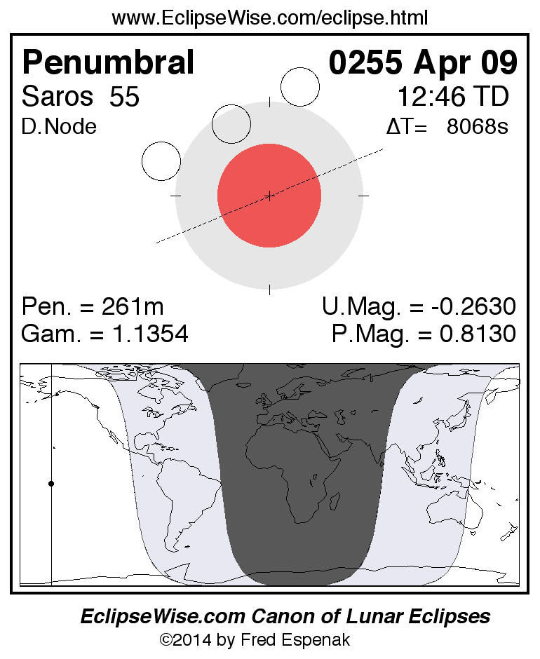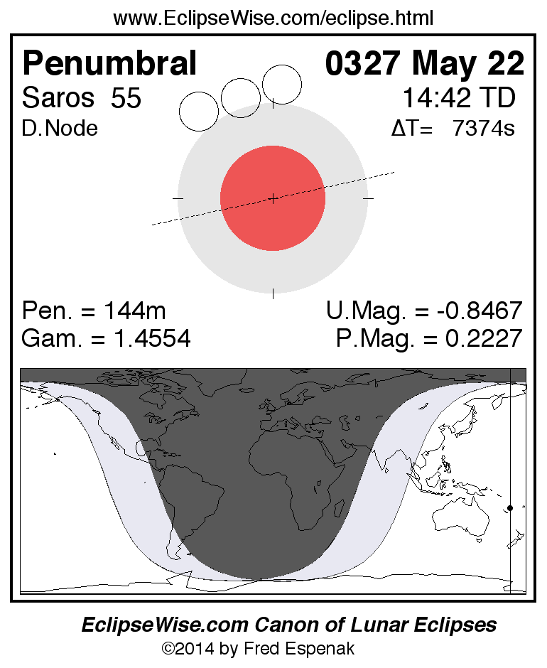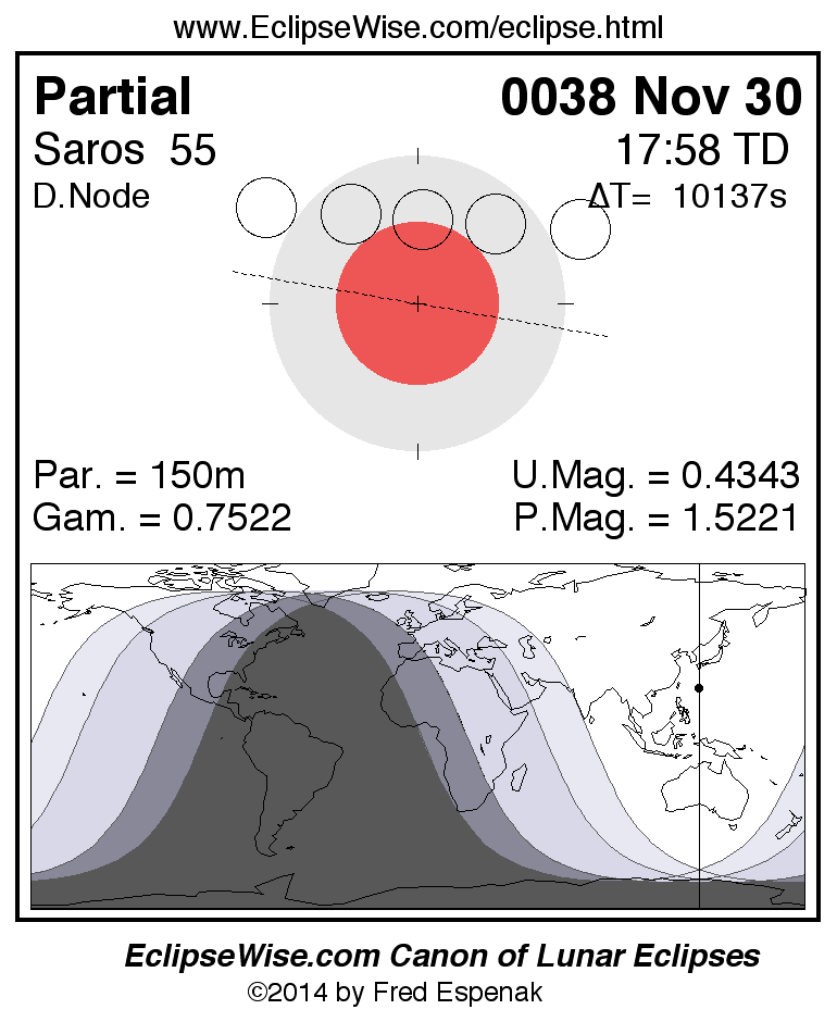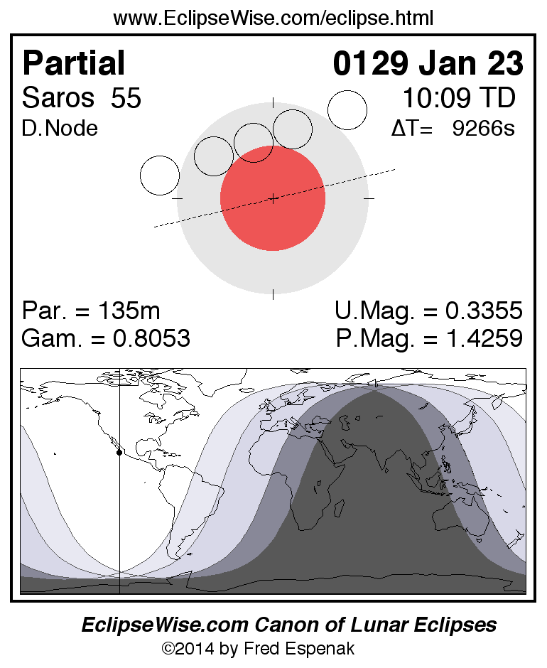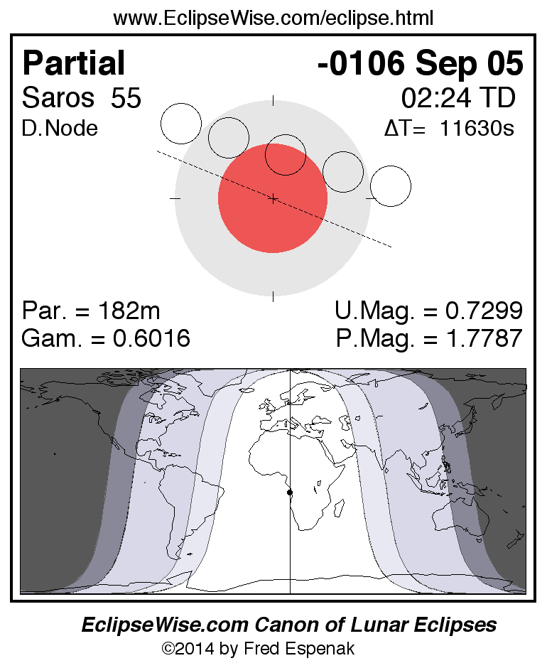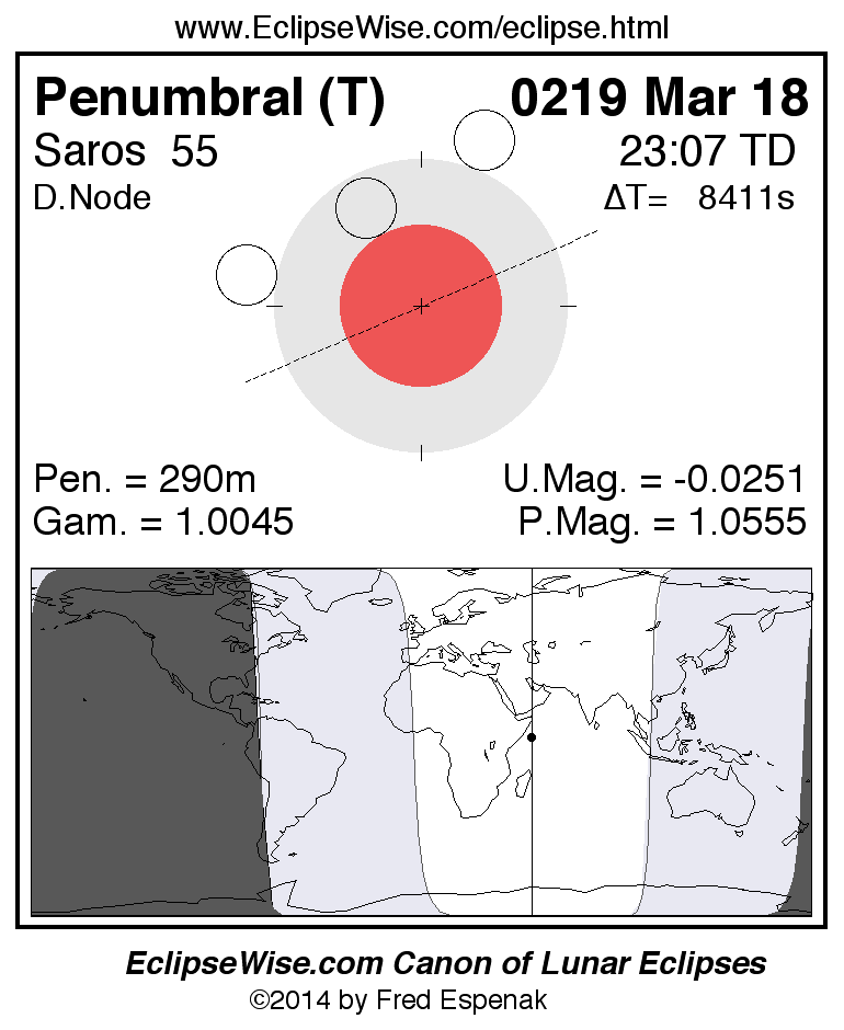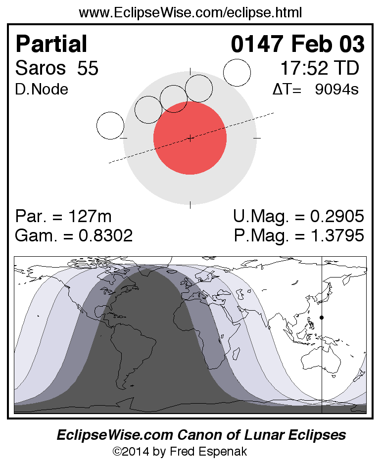 A panorama of all lunar eclipses belonging to Saros 55 is presented here. Each figure shows the Moon's path with respect to Earth's penumbral and umbral shadows. Below the path is a map depicting the geographic region of visibility for the eclipse. The date and time are given for the instant of Greatest Eclipse. Every figure serves as a hyperlink to the EclipseWise Prime page for that eclipse with a larger figure and complete details for the eclipse. Visit the Key to Lunar Eclipse Figures for a detailed explanation of these diagrams. Near the bottom of this page are a series of hyperlinks for more on lunar eclipses.
