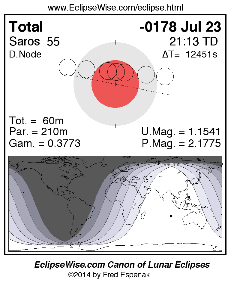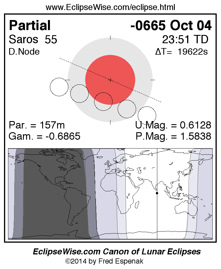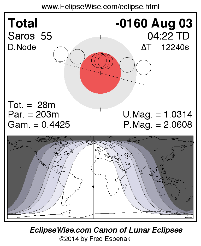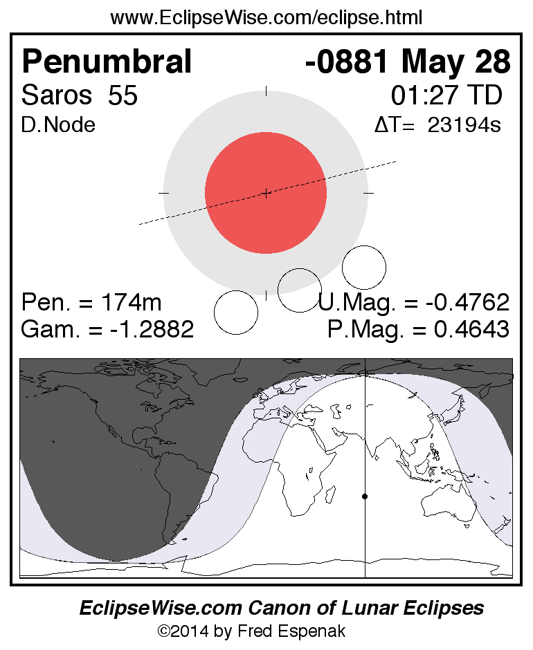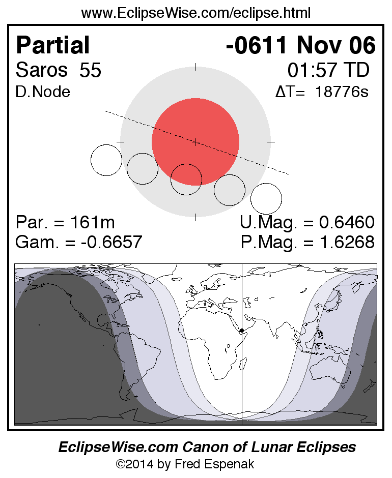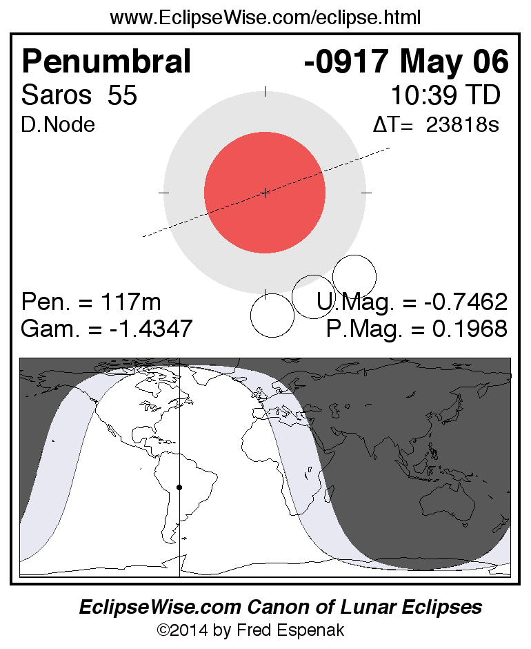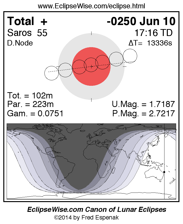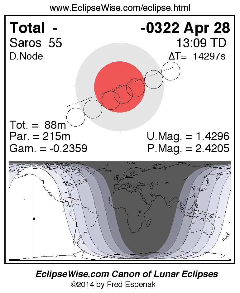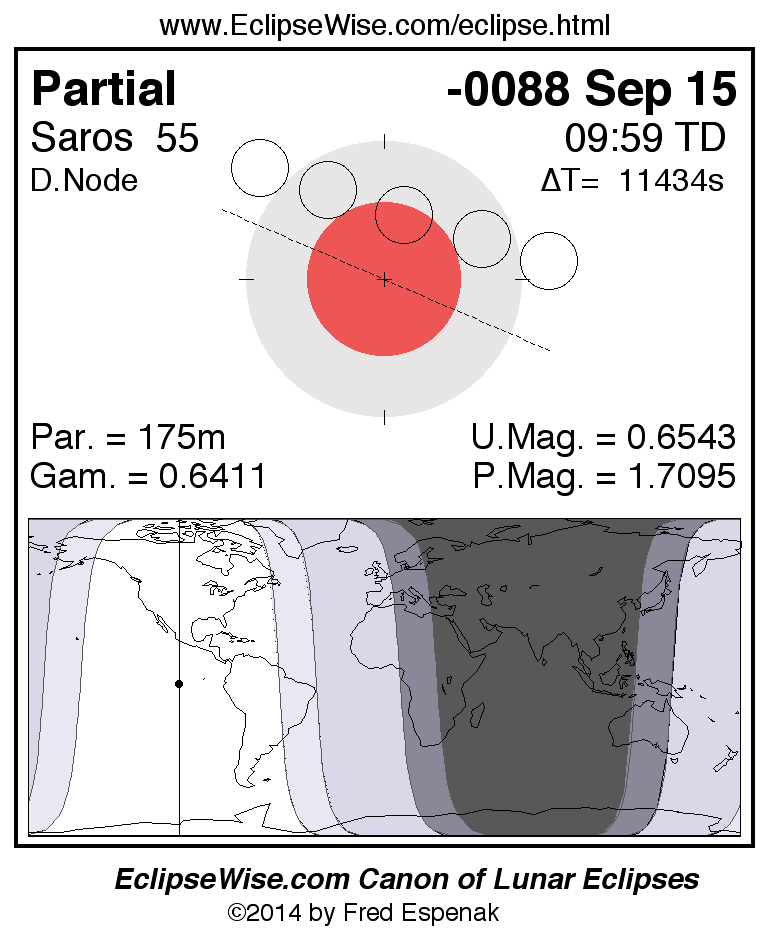 A panorama of all lunar eclipses belonging to Saros 55 is presented here. Each figure shows the Moon's path with respect to Earth's penumbral and umbral shadows. Below the path is a map depicting the geographic region of visibility for the eclipse. The date and time are given for the instant of Greatest Eclipse. Every figure serves as a hyperlink to the EclipseWise Prime page for that eclipse with a larger figure and complete details for the eclipse. Visit the Key to Lunar Eclipse Figures for a detailed explanation of these diagrams. Near the bottom of this page are a series of hyperlinks for more on lunar eclipses.