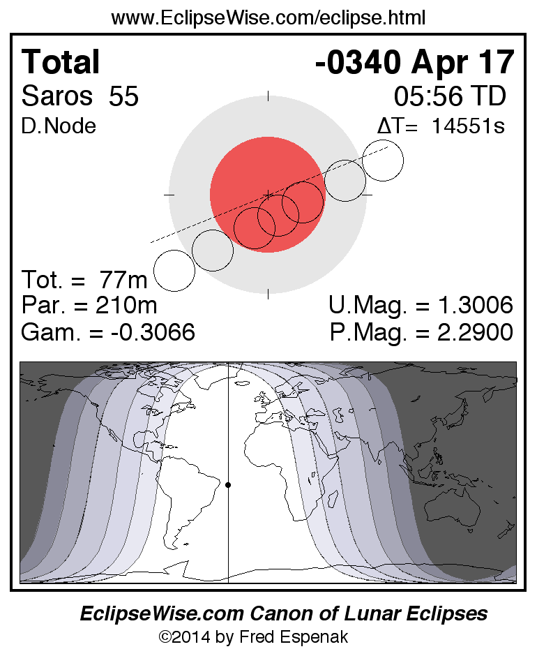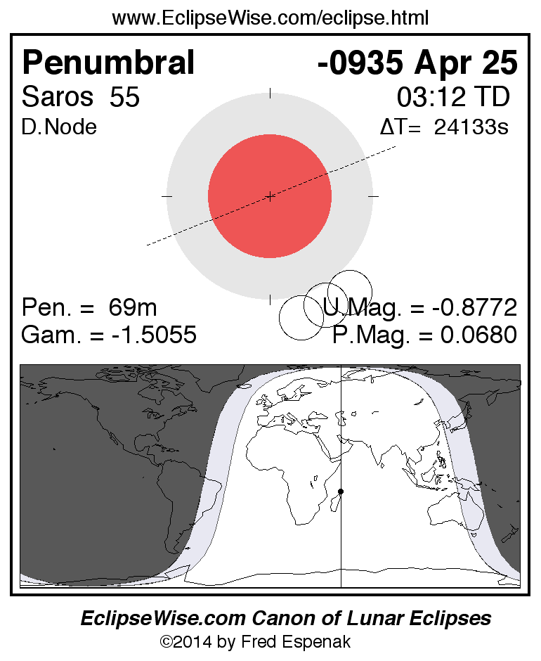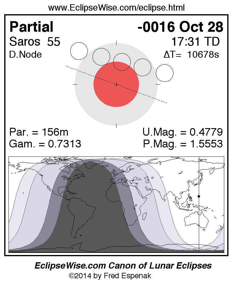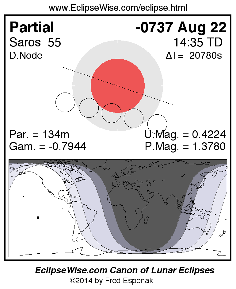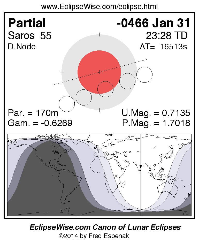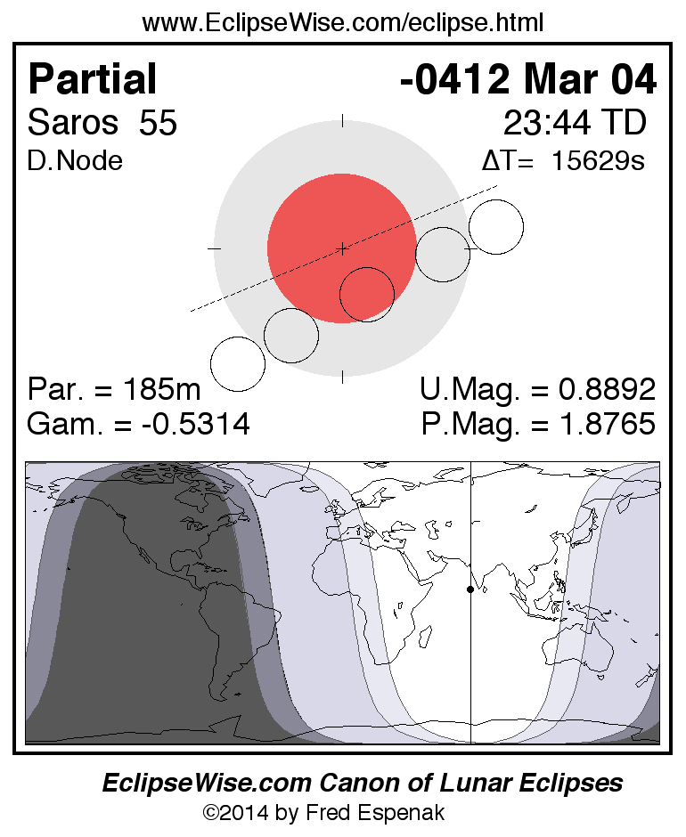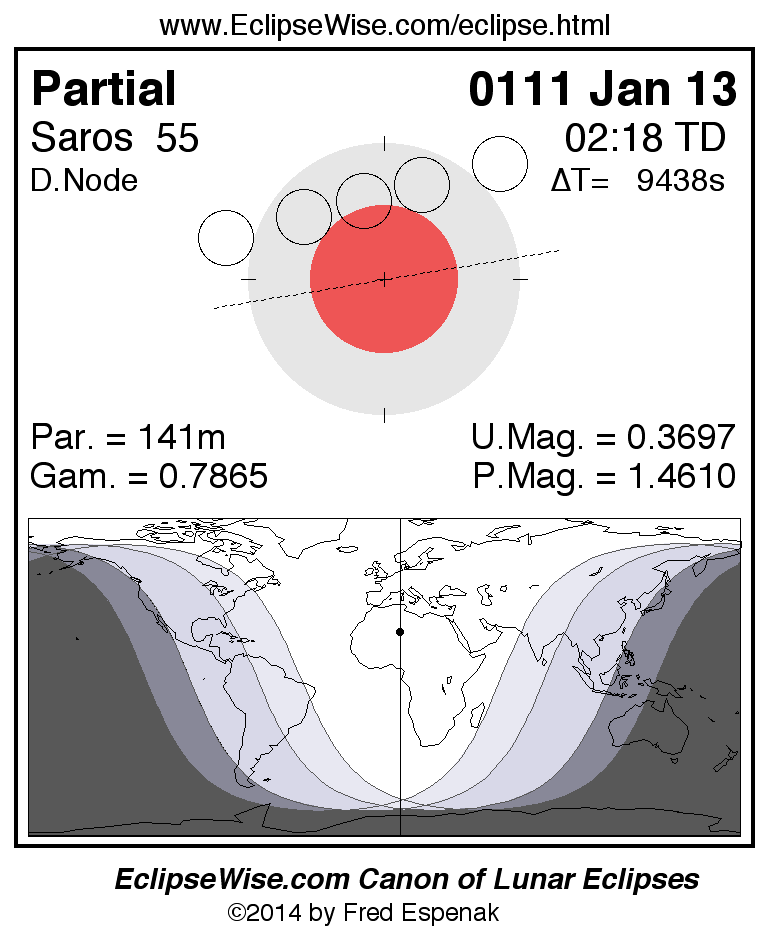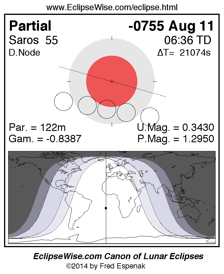 A panorama of all lunar eclipses belonging to Saros 55 is presented here. Each figure shows the Moon's path with respect to Earth's penumbral and umbral shadows. Below the path is a map depicting the geographic region of visibility for the eclipse. The date and time are given for the instant of Greatest Eclipse. Every figure serves as a hyperlink to the EclipseWise Prime page for that eclipse with a larger figure and complete details for the eclipse. Visit the Key to Lunar Eclipse Figures for a detailed explanation of these diagrams. Near the bottom of this page are a series of hyperlinks for more on lunar eclipses.