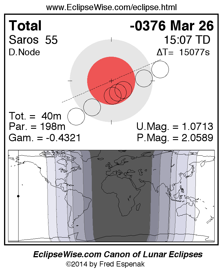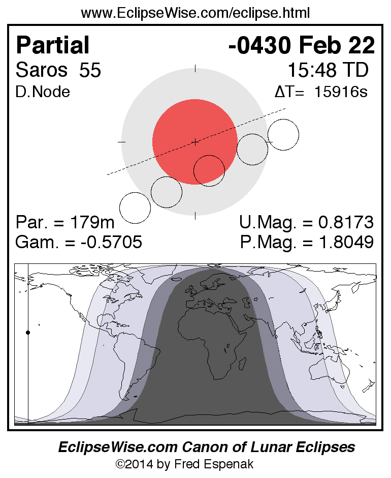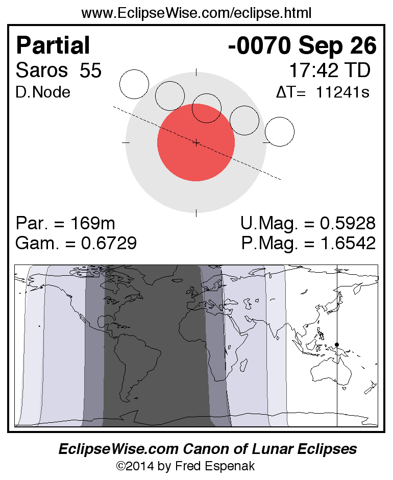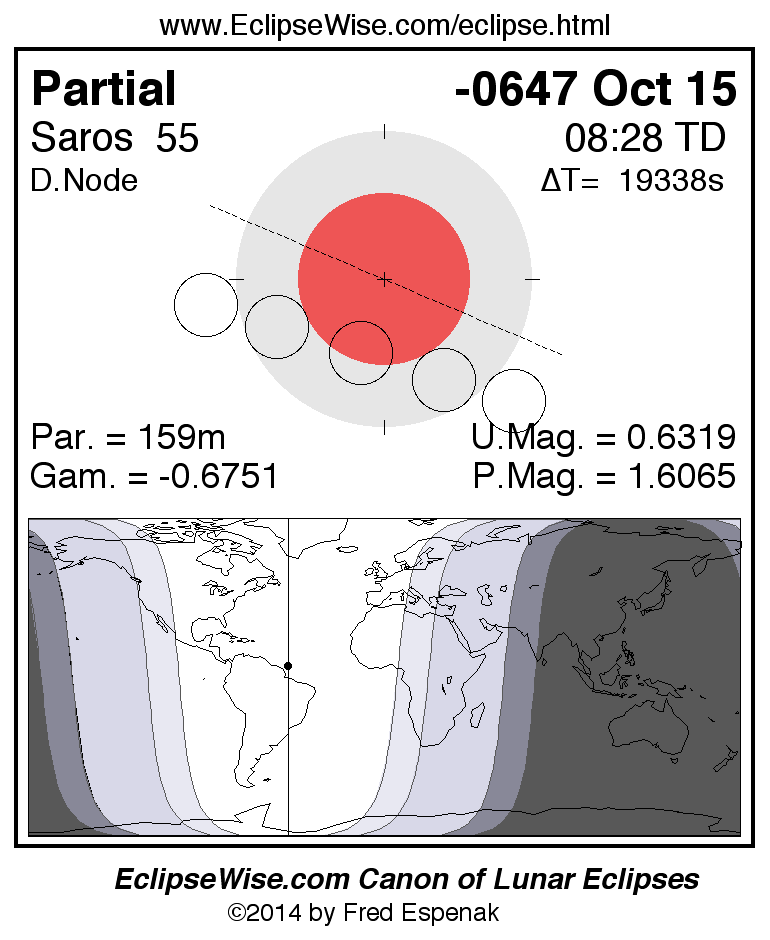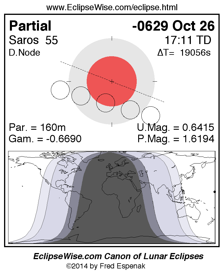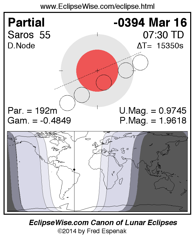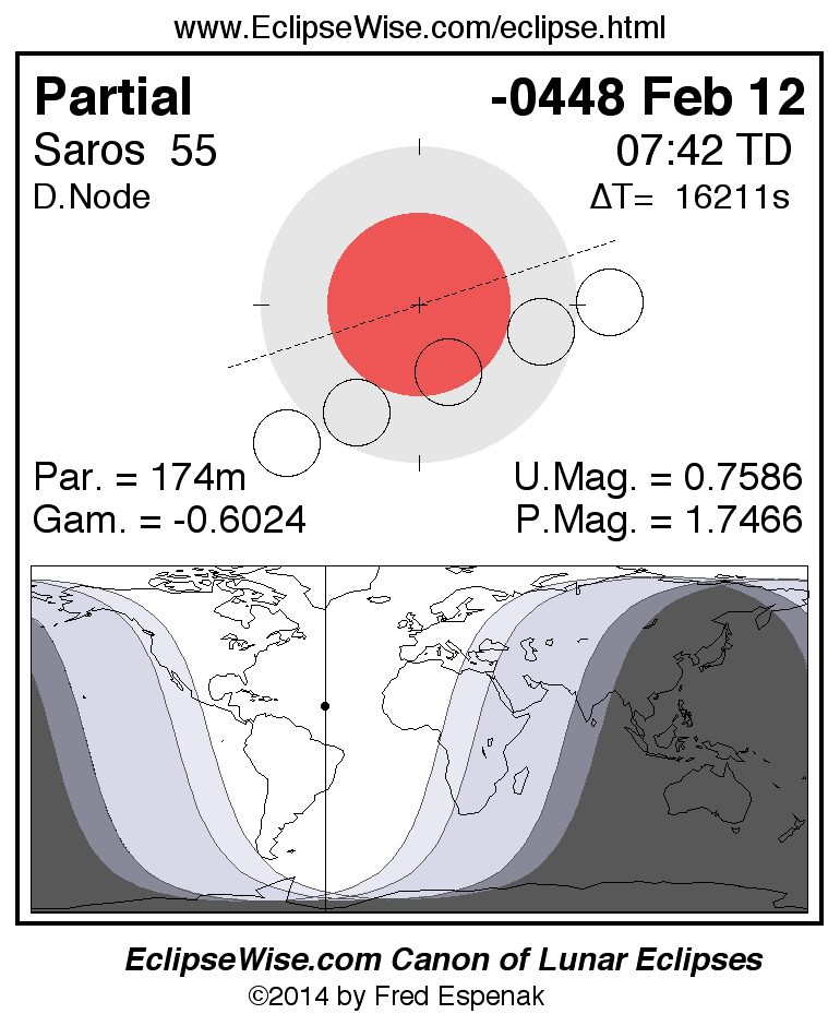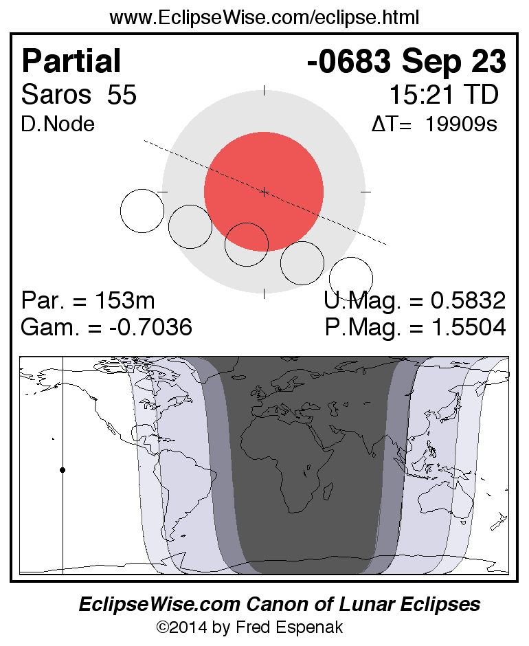 A panorama of all lunar eclipses belonging to Saros 55 is presented here. Each figure shows the Moon's path with respect to Earth's penumbral and umbral shadows. Below the path is a map depicting the geographic region of visibility for the eclipse. The date and time are given for the instant of Greatest Eclipse. Every figure serves as a hyperlink to the EclipseWise Prime page for that eclipse with a larger figure and complete details for the eclipse. Visit the Key to Lunar Eclipse Figures for a detailed explanation of these diagrams. Near the bottom of this page are a series of hyperlinks for more on lunar eclipses.