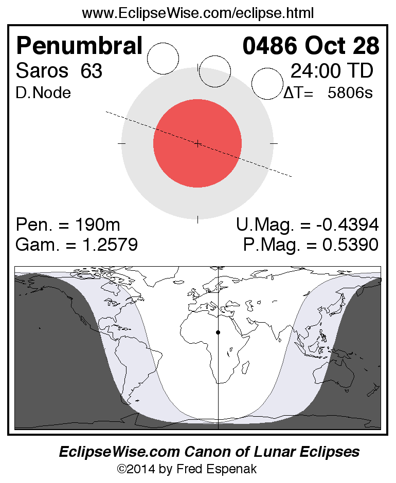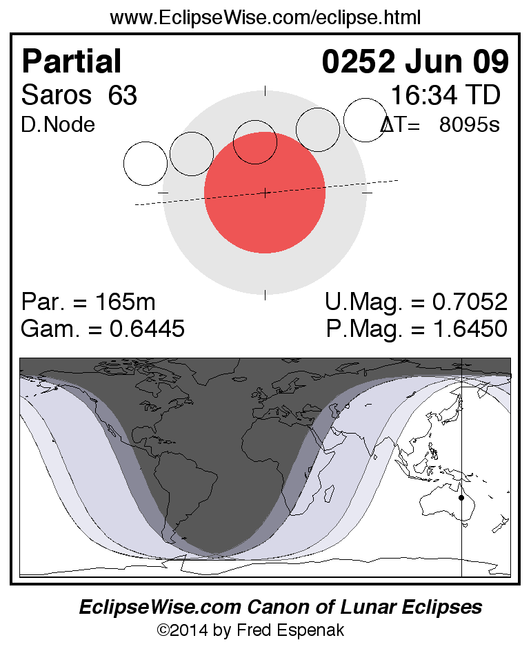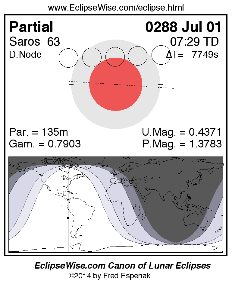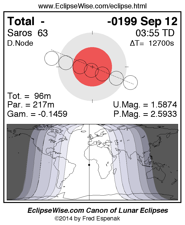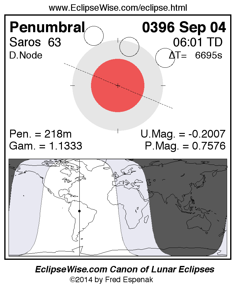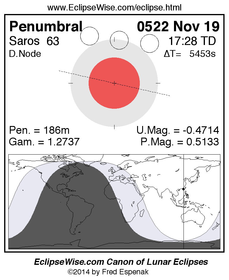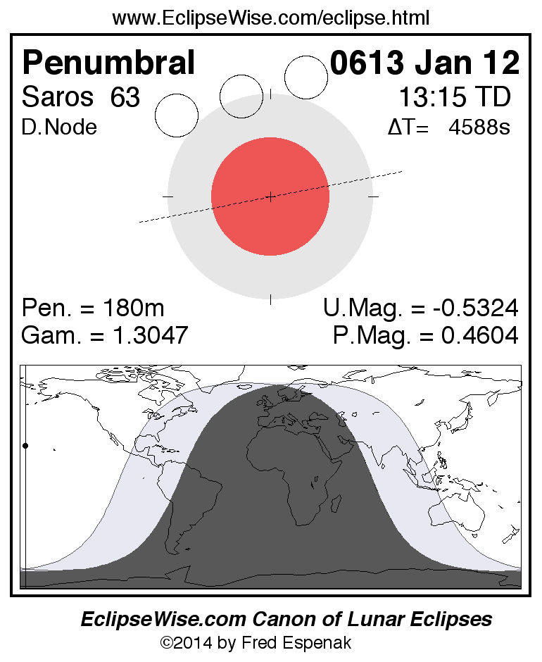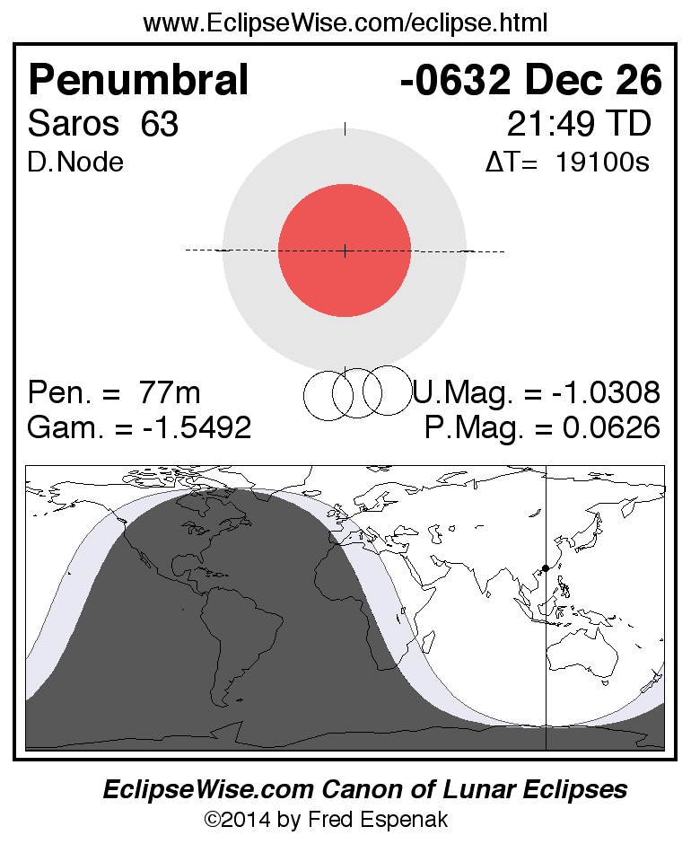 A panorama of all lunar eclipses belonging to Saros 63 is presented here. Each figure shows the Moon's path with respect to Earth's penumbral and umbral shadows. Below the path is a map depicting the geographic region of visibility for the eclipse. The date and time are given for the instant of Greatest Eclipse. Every figure serves as a hyperlink to the EclipseWise Prime page for that eclipse with a larger figure and complete details for the eclipse. Visit the Key to Lunar Eclipse Figures for a detailed explanation of these diagrams. Near the bottom of this page are a series of hyperlinks for more on lunar eclipses.