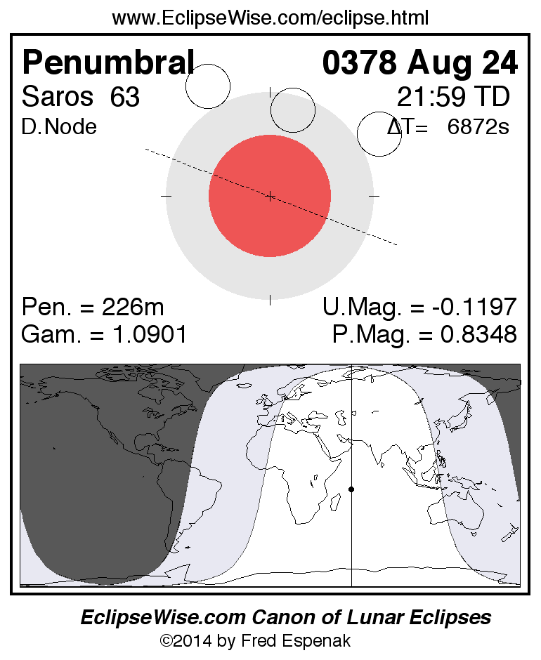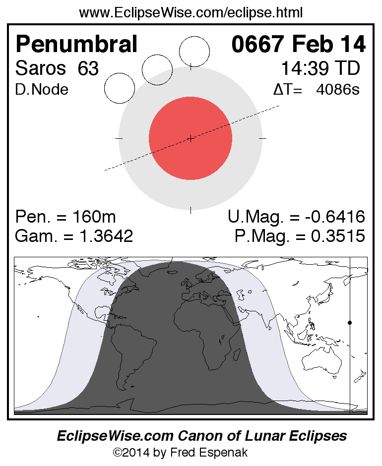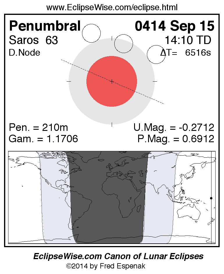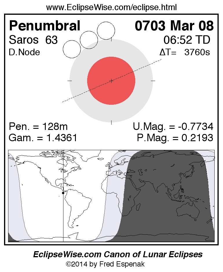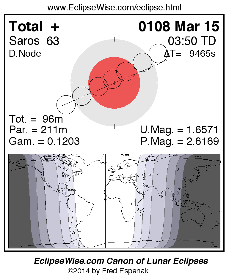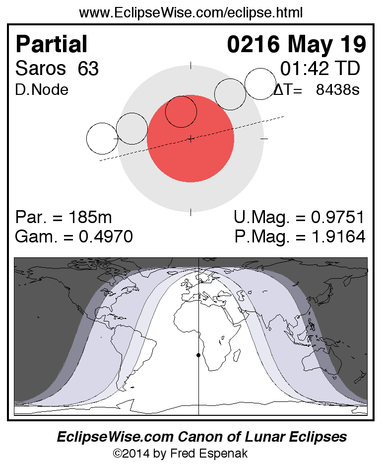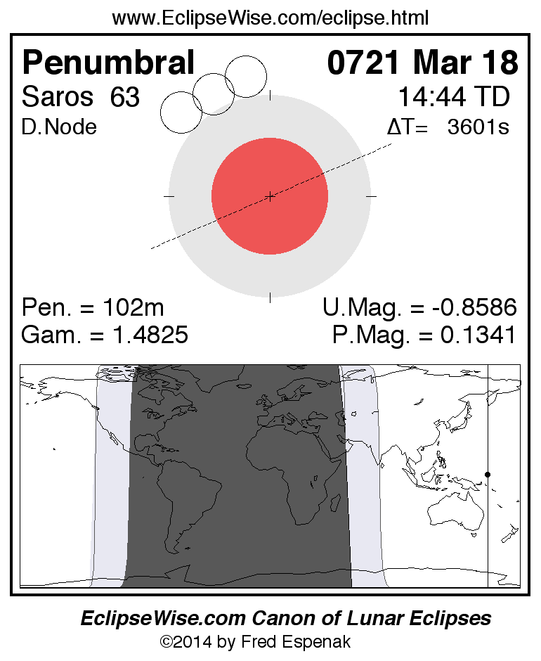 A panorama of all lunar eclipses belonging to Saros 63 is presented here. Each figure shows the Moon's path with respect to Earth's penumbral and umbral shadows. Below the path is a map depicting the geographic region of visibility for the eclipse. The date and time are given for the instant of Greatest Eclipse. Every figure serves as a hyperlink to the EclipseWise Prime page for that eclipse with a larger figure and complete details for the eclipse. Visit the Key to Lunar Eclipse Figures for a detailed explanation of these diagrams. Near the bottom of this page are a series of hyperlinks for more on lunar eclipses.