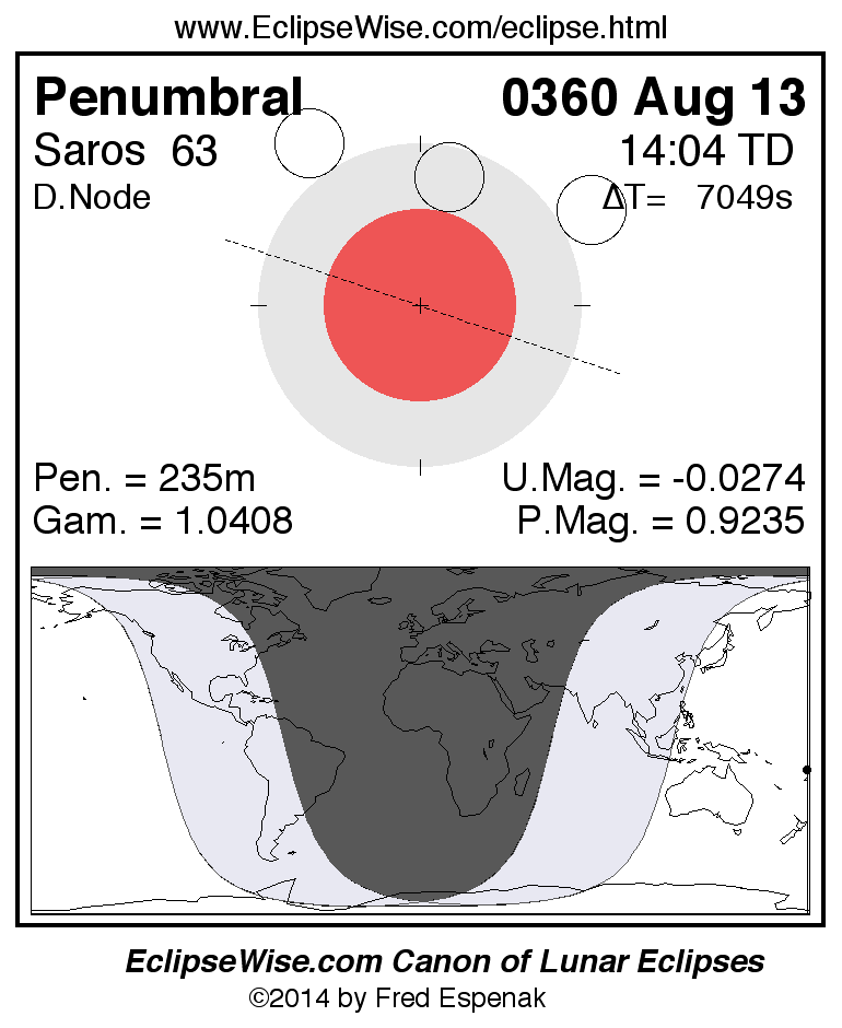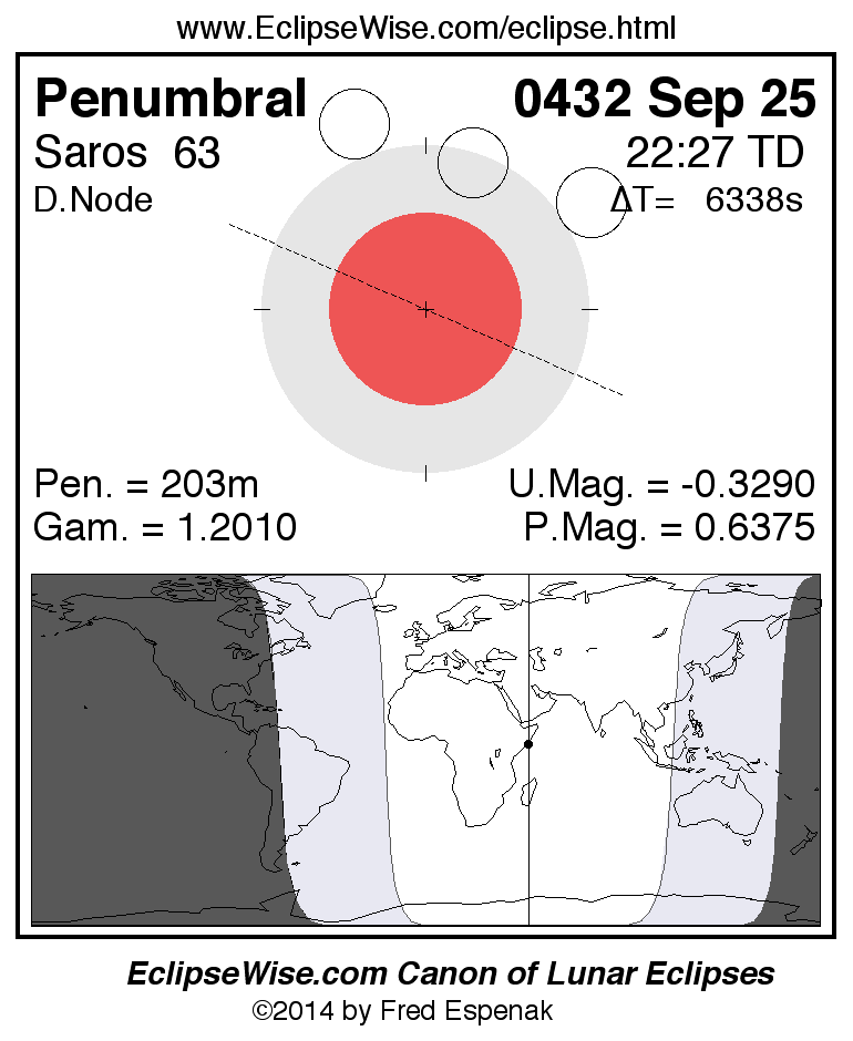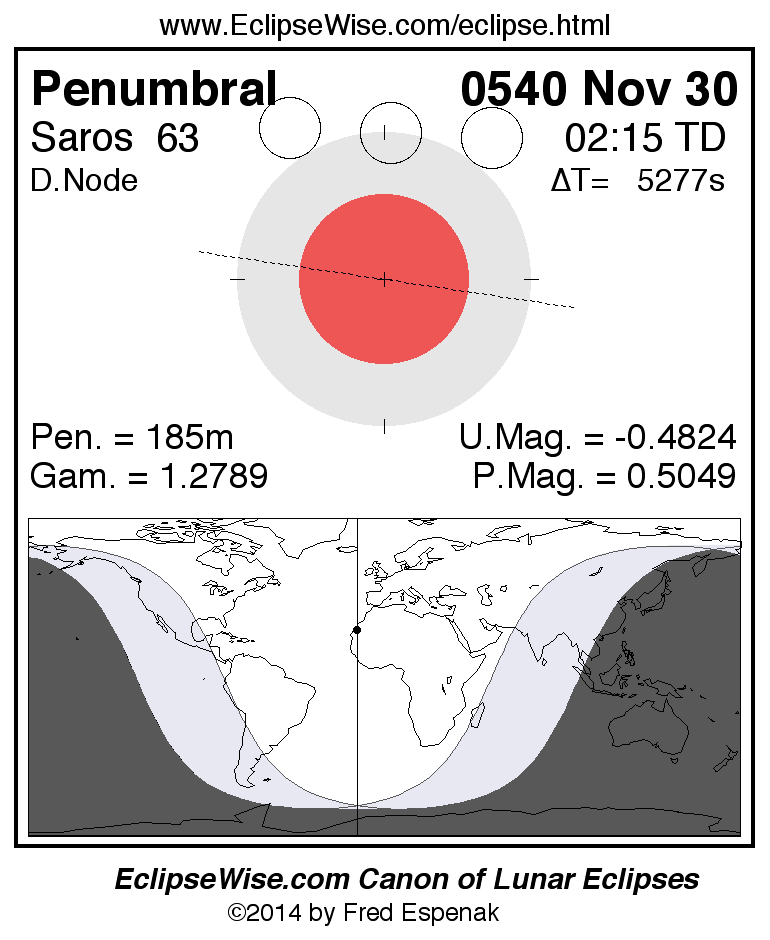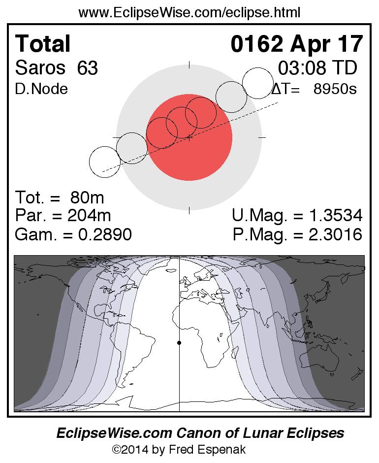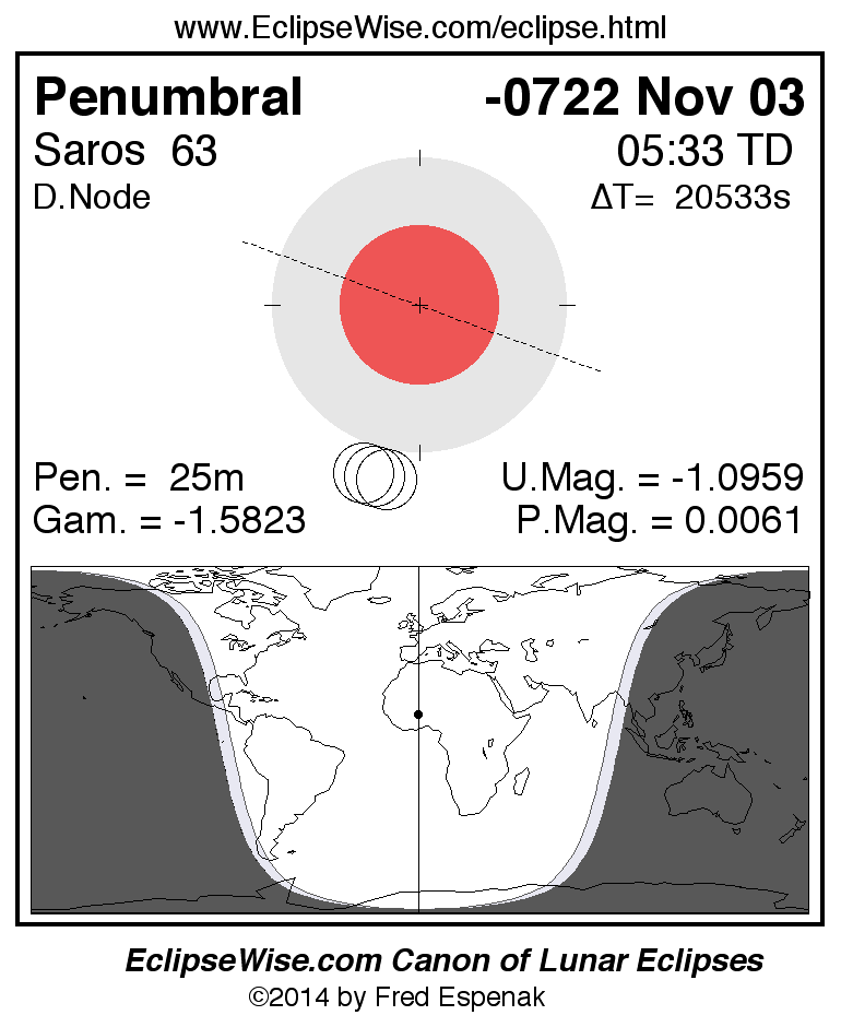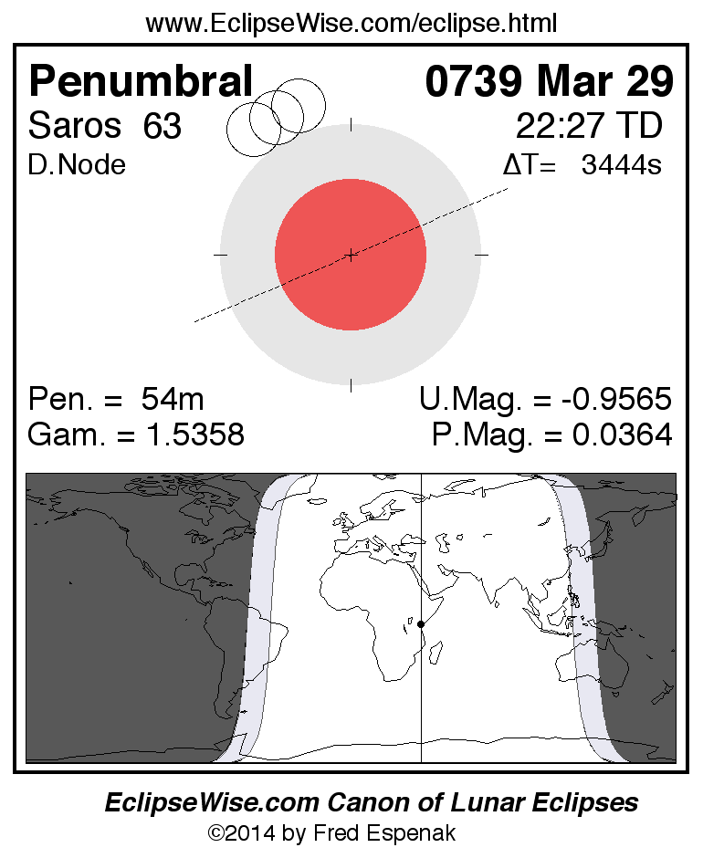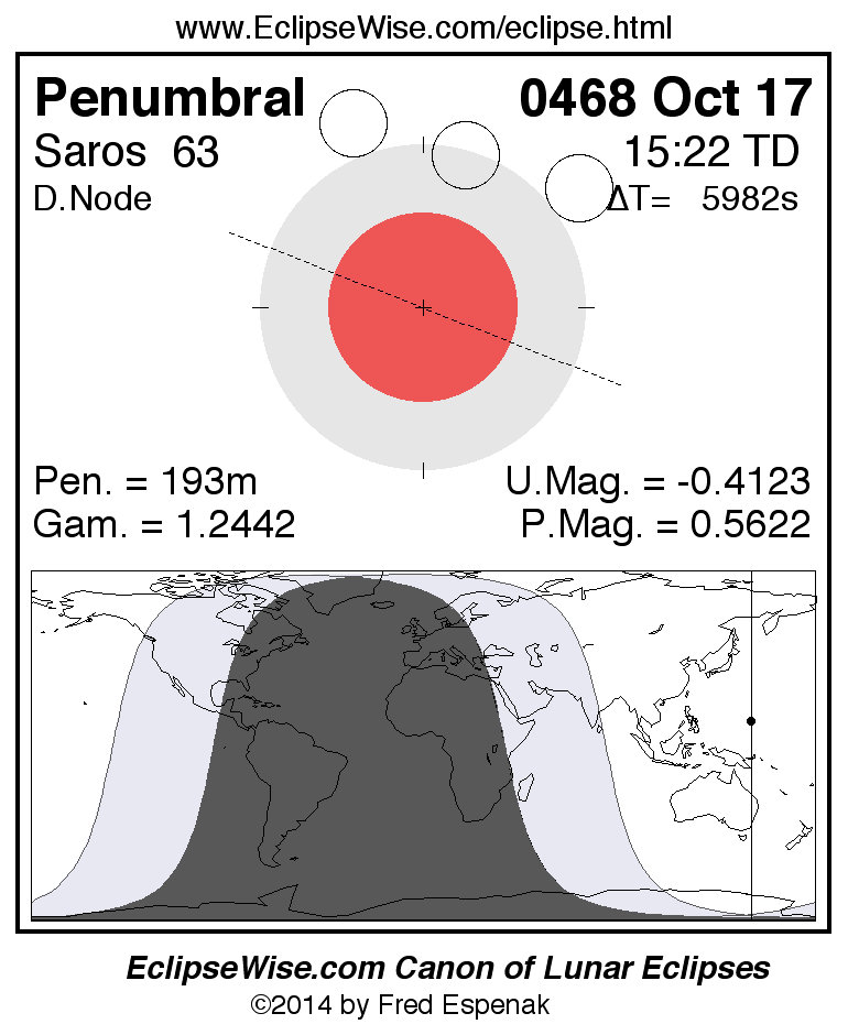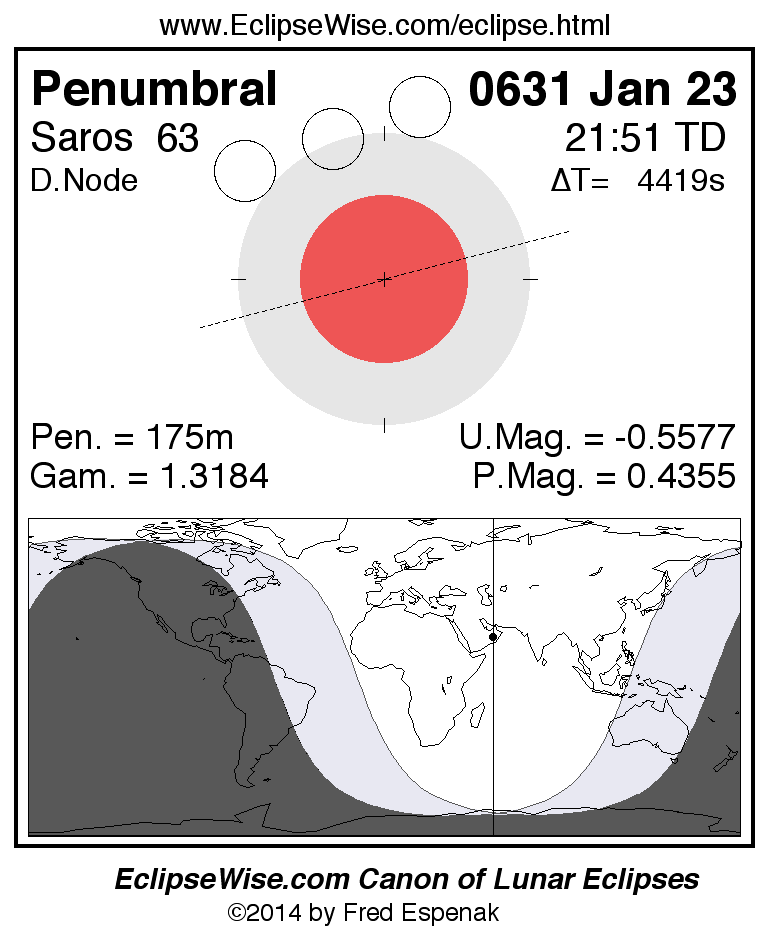 A panorama of all lunar eclipses belonging to Saros 63 is presented here. Each figure shows the Moon's path with respect to Earth's penumbral and umbral shadows. Below the path is a map depicting the geographic region of visibility for the eclipse. The date and time are given for the instant of Greatest Eclipse. Every figure serves as a hyperlink to the EclipseWise Prime page for that eclipse with a larger figure and complete details for the eclipse. Visit the Key to Lunar Eclipse Figures for a detailed explanation of these diagrams. Near the bottom of this page are a series of hyperlinks for more on lunar eclipses.