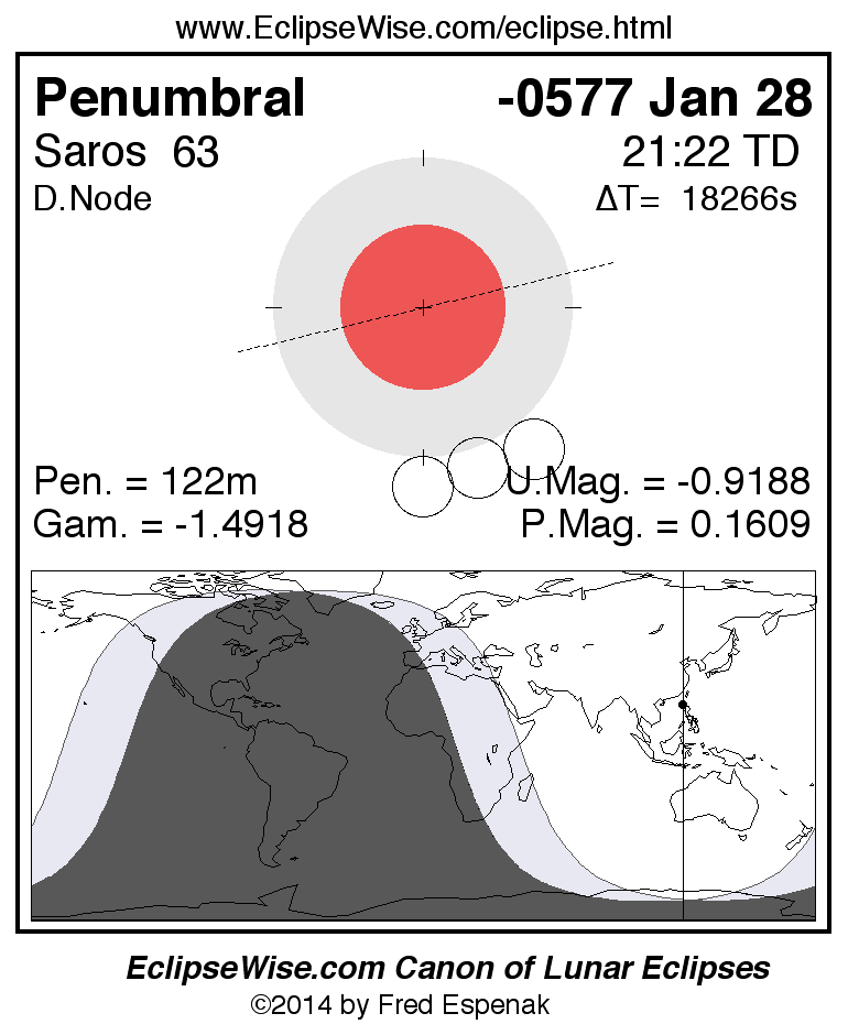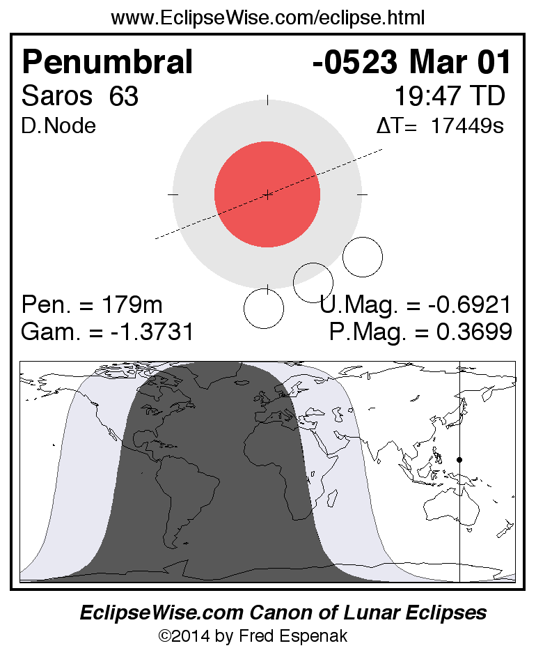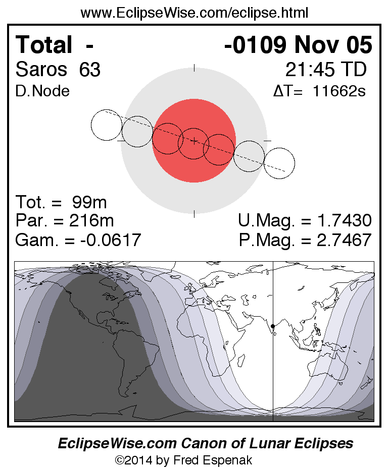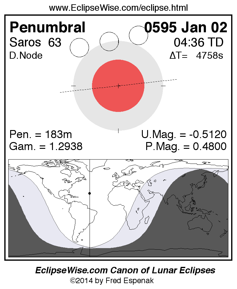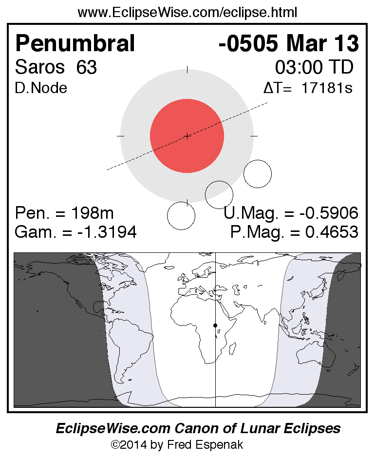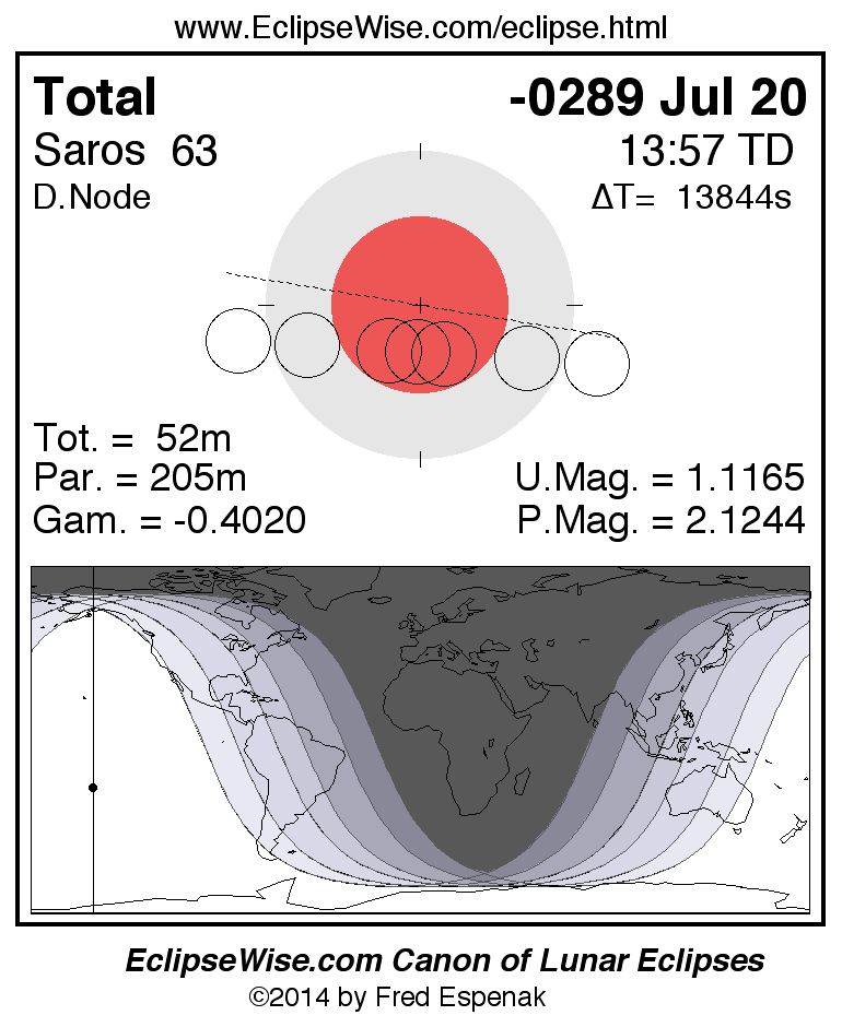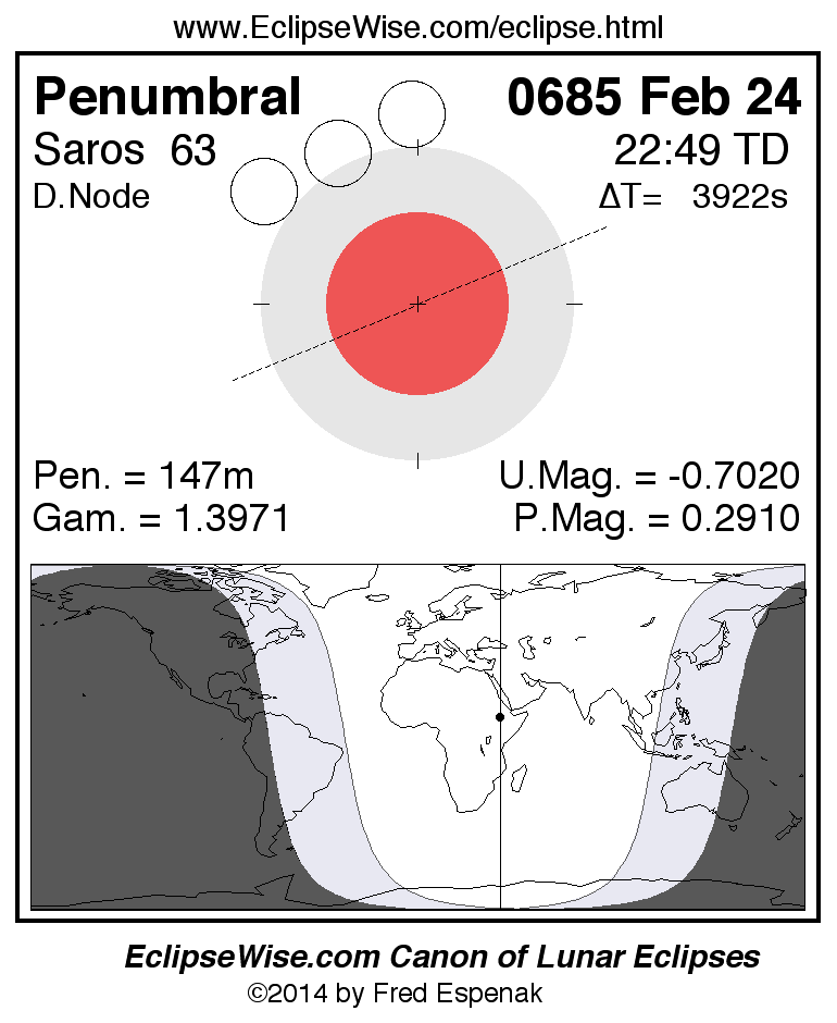 A panorama of all lunar eclipses belonging to Saros 63 is presented here. Each figure shows the Moon's path with respect to Earth's penumbral and umbral shadows. Below the path is a map depicting the geographic region of visibility for the eclipse. The date and time are given for the instant of Greatest Eclipse. Every figure serves as a hyperlink to the EclipseWise Prime page for that eclipse with a larger figure and complete details for the eclipse. Visit the Key to Lunar Eclipse Figures for a detailed explanation of these diagrams. Near the bottom of this page are a series of hyperlinks for more on lunar eclipses.