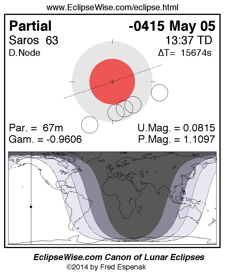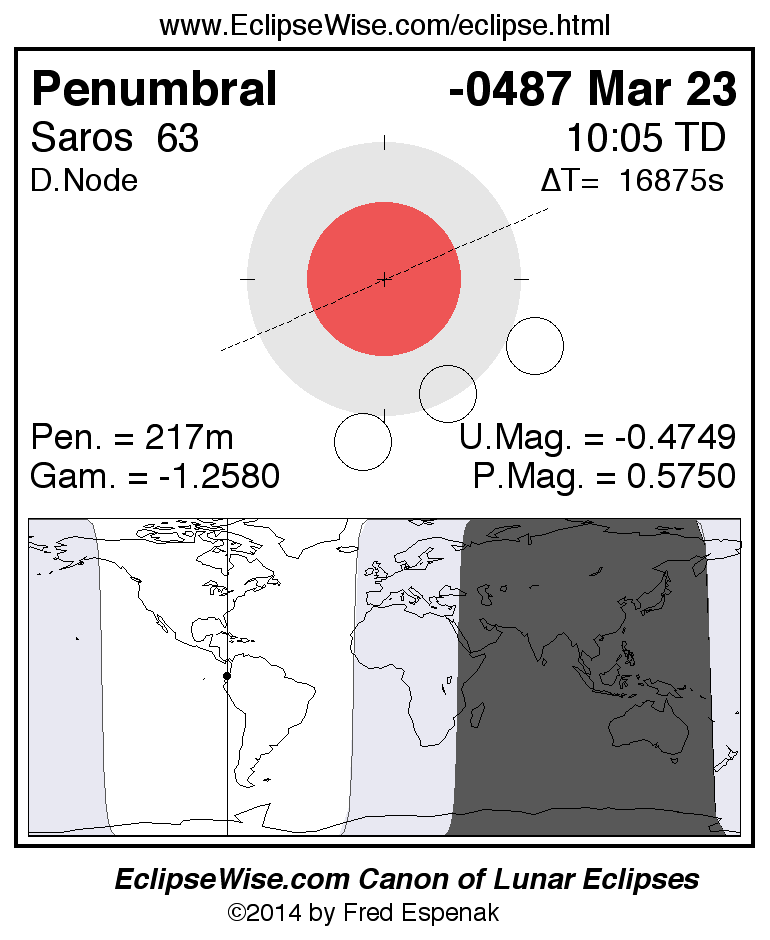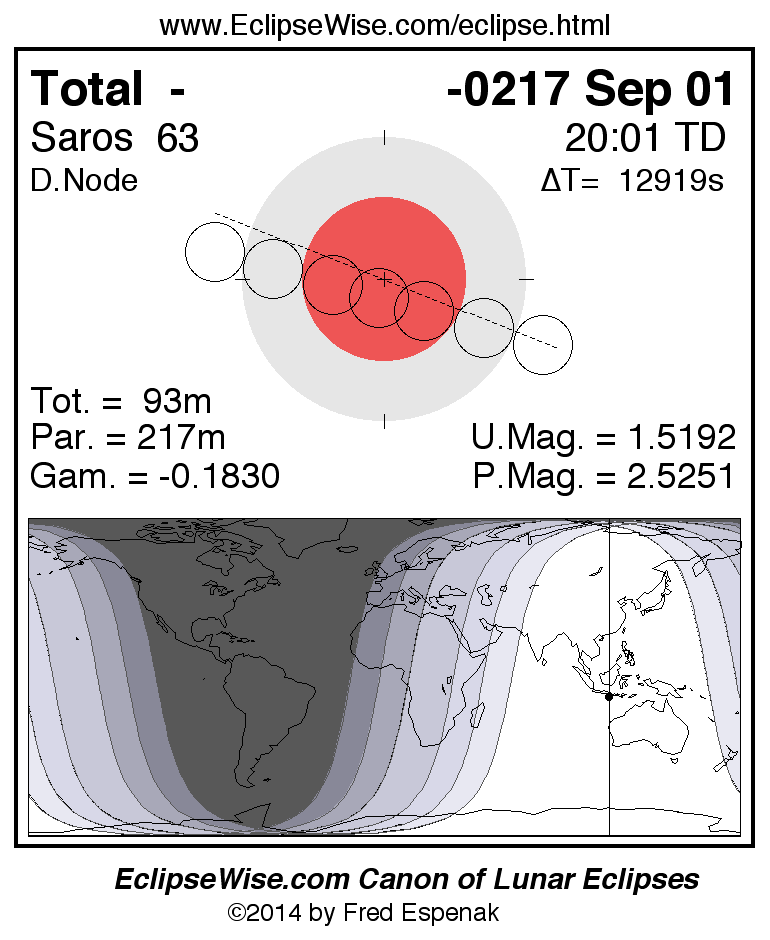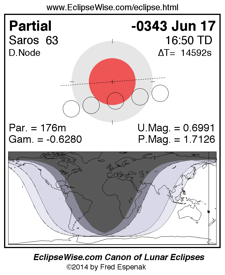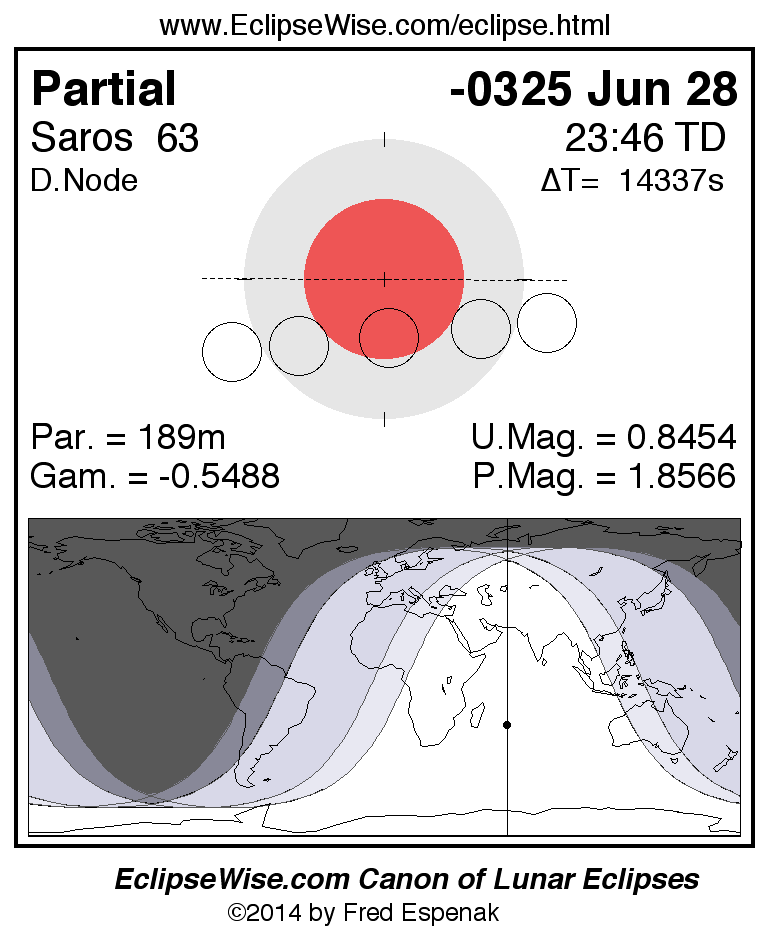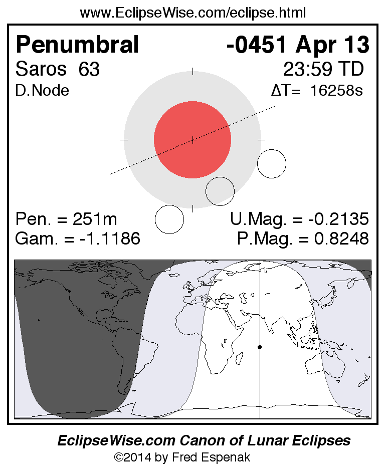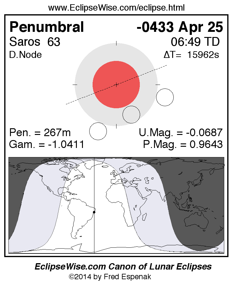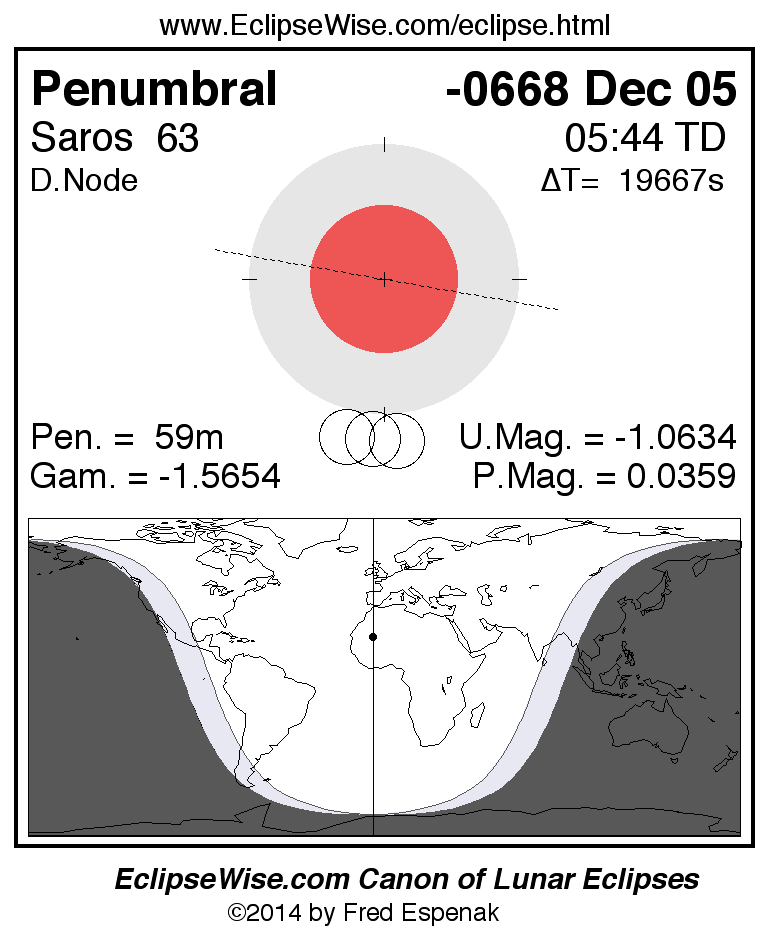 A panorama of all lunar eclipses belonging to Saros 63 is presented here. Each figure shows the Moon's path with respect to Earth's penumbral and umbral shadows. Below the path is a map depicting the geographic region of visibility for the eclipse. The date and time are given for the instant of Greatest Eclipse. Every figure serves as a hyperlink to the EclipseWise Prime page for that eclipse with a larger figure and complete details for the eclipse. Visit the Key to Lunar Eclipse Figures for a detailed explanation of these diagrams. Near the bottom of this page are a series of hyperlinks for more on lunar eclipses.