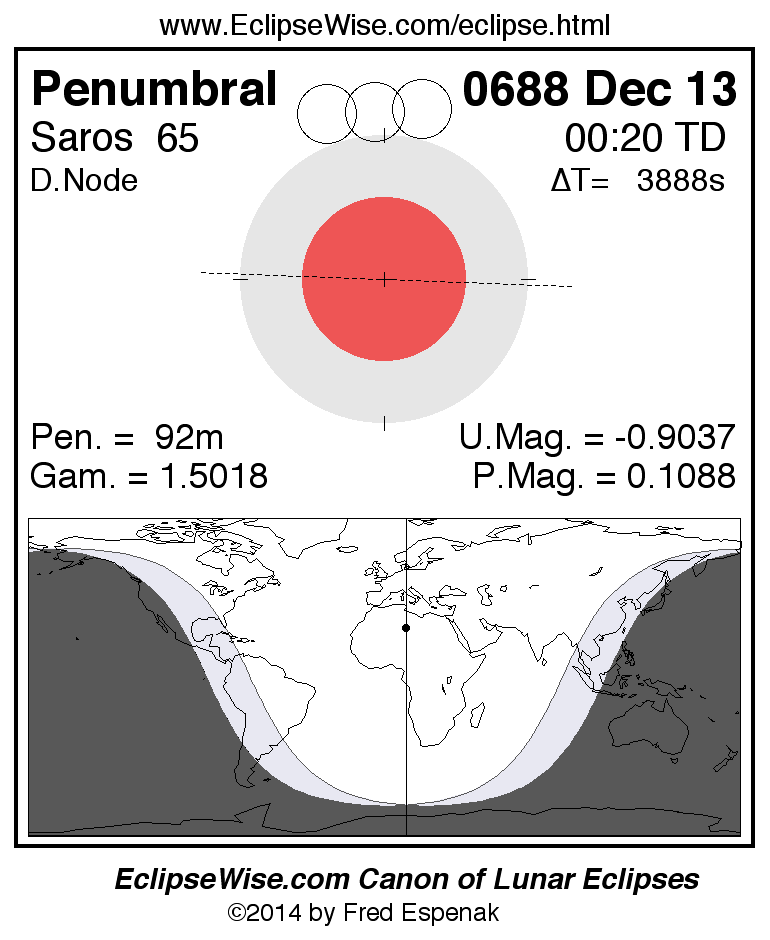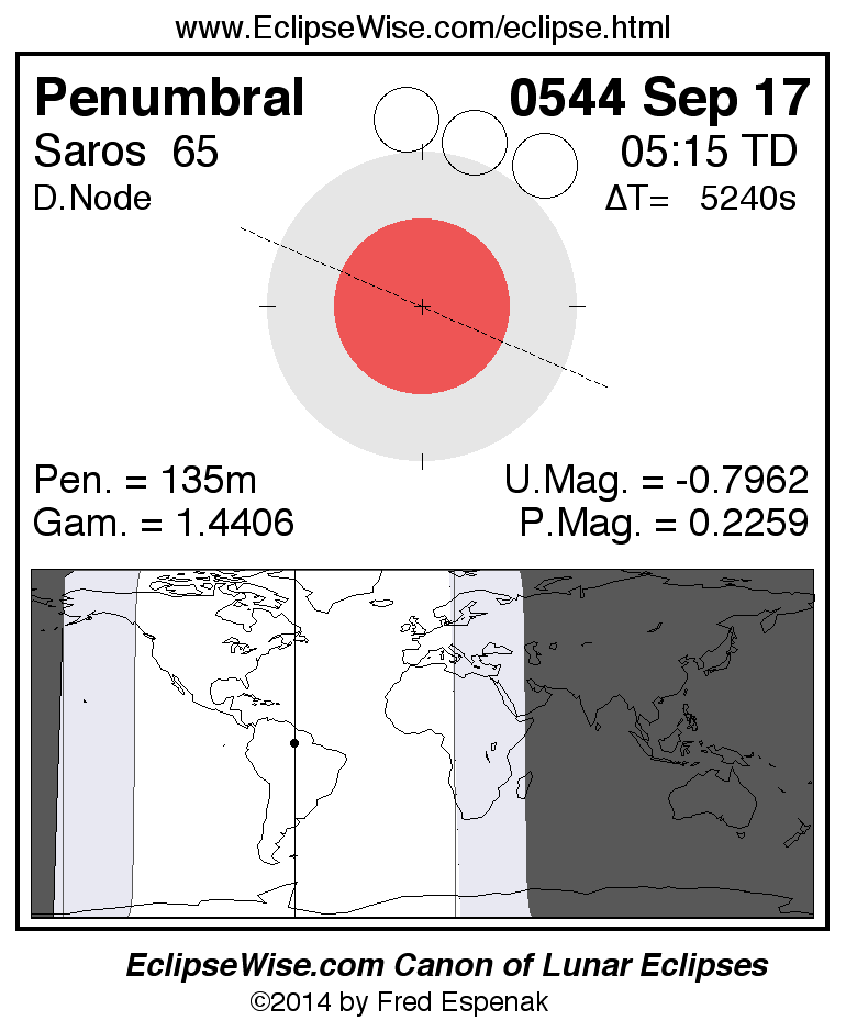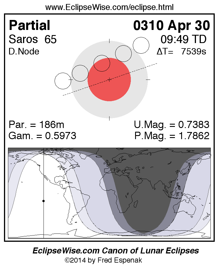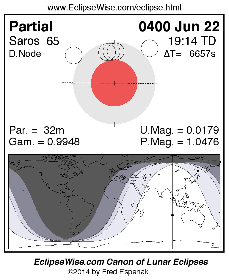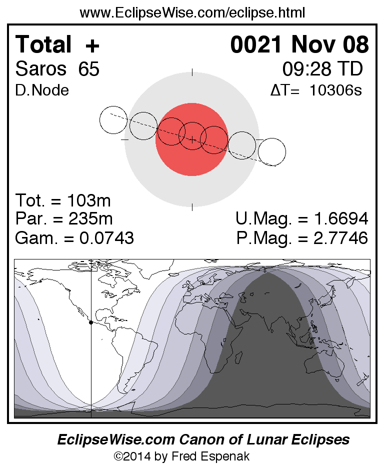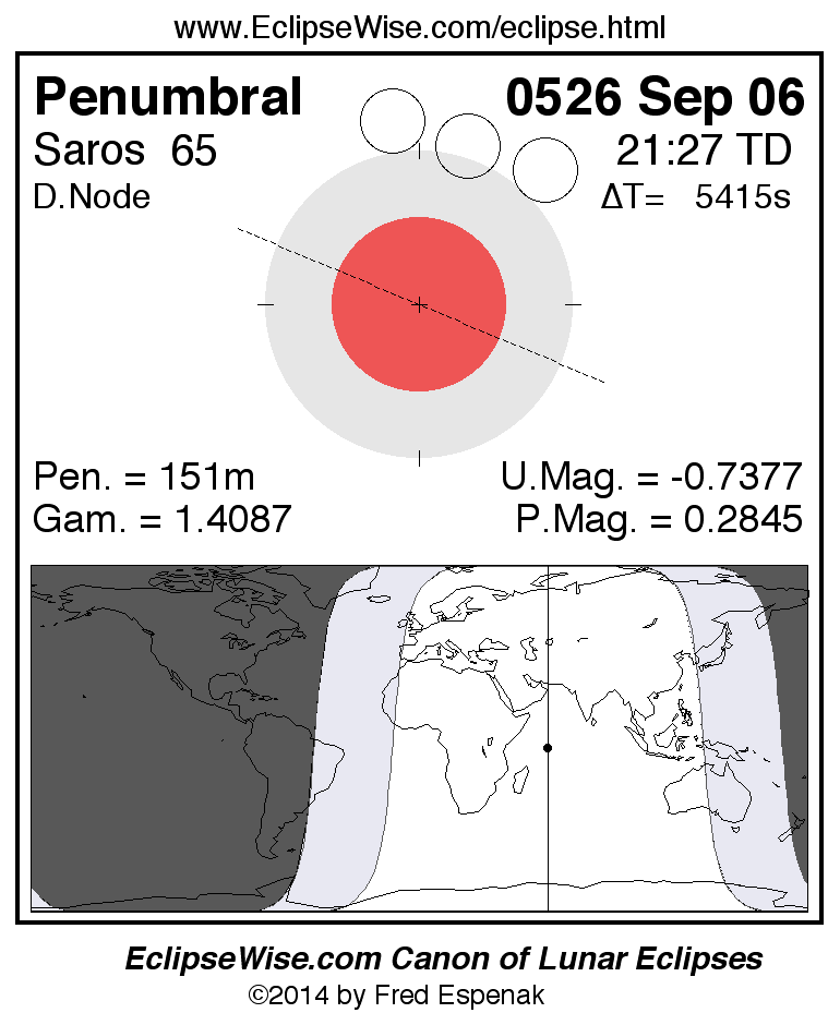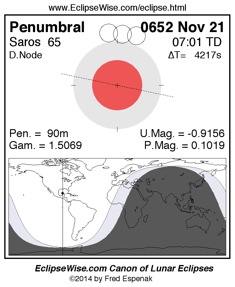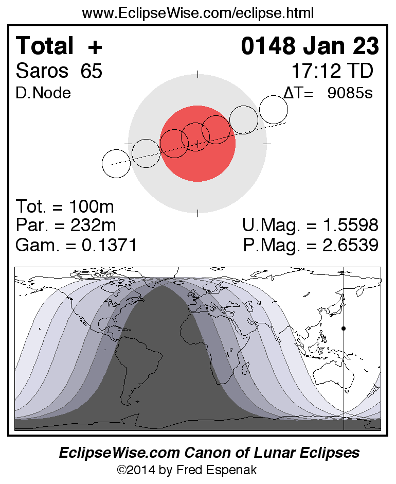 A panorama of all lunar eclipses belonging to Saros 65 is presented here. Each figure shows the Moon's path with respect to Earth's penumbral and umbral shadows. Below the path is a map depicting the geographic region of visibility for the eclipse. The date and time are given for the instant of Greatest Eclipse. Every figure serves as a hyperlink to the EclipseWise Prime page for that eclipse with a larger figure and complete details for the eclipse. Visit the Key to Lunar Eclipse Figures for a detailed explanation of these diagrams. Near the bottom of this page are a series of hyperlinks for more on lunar eclipses.