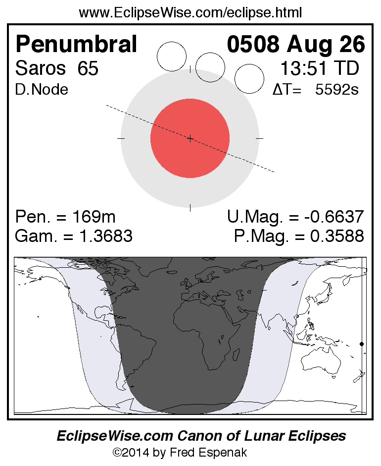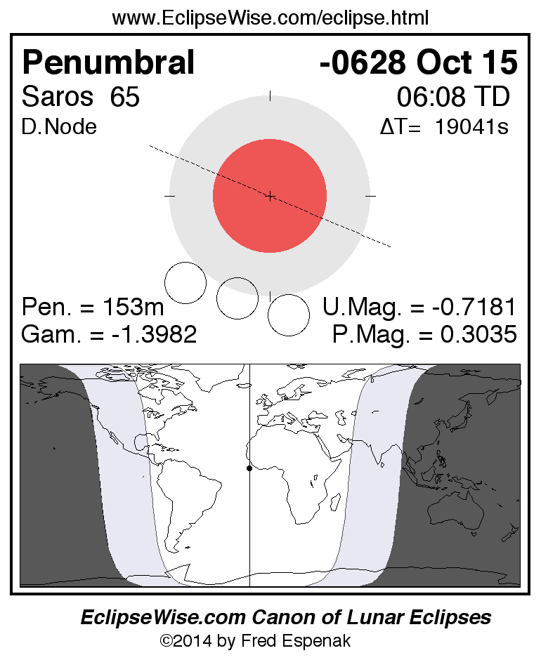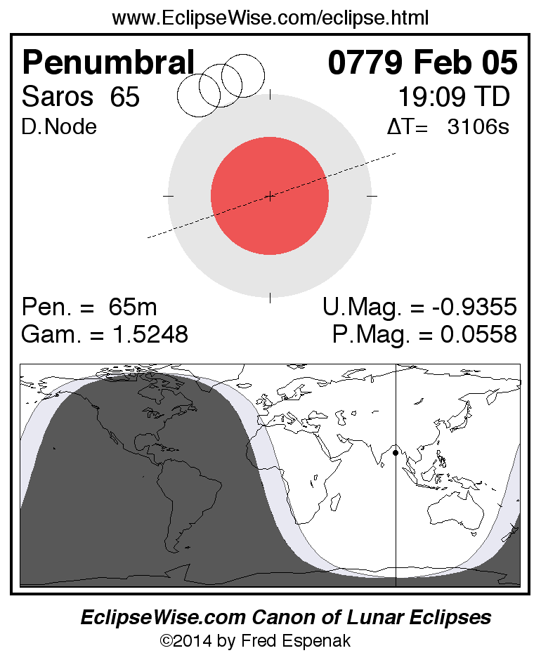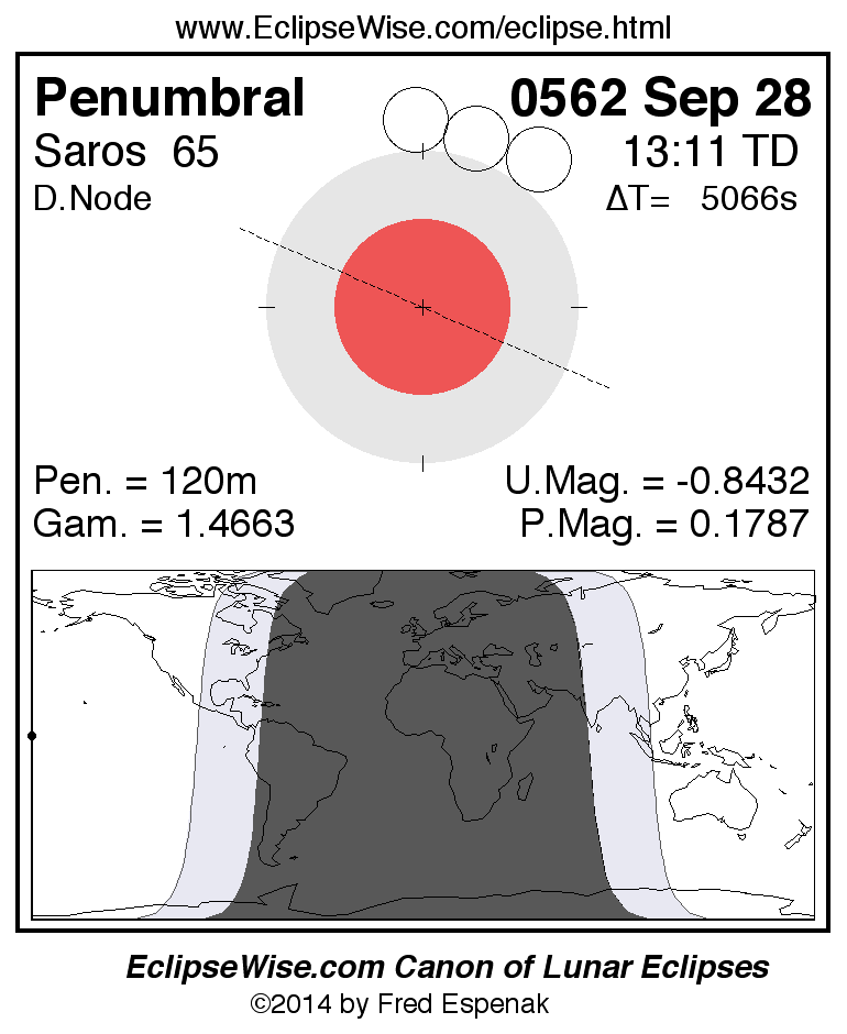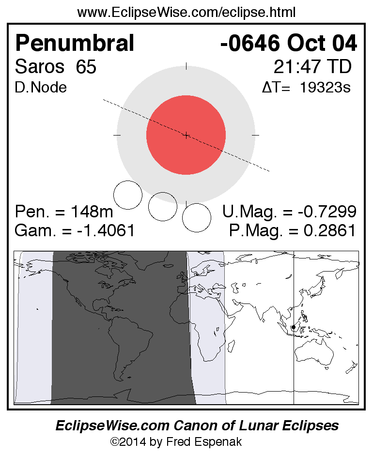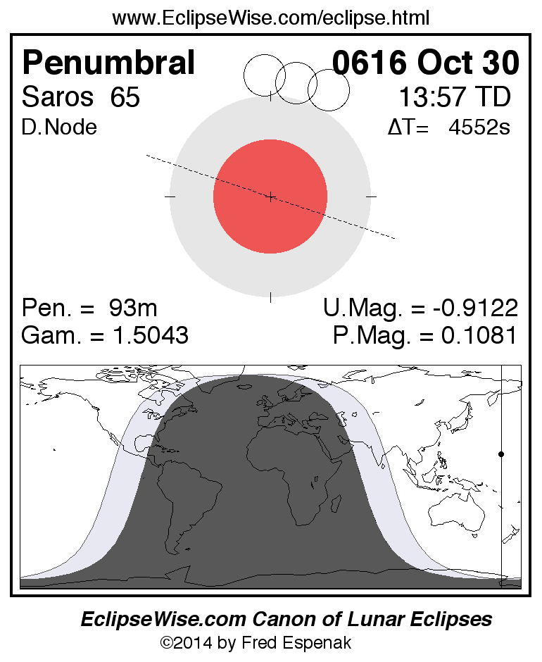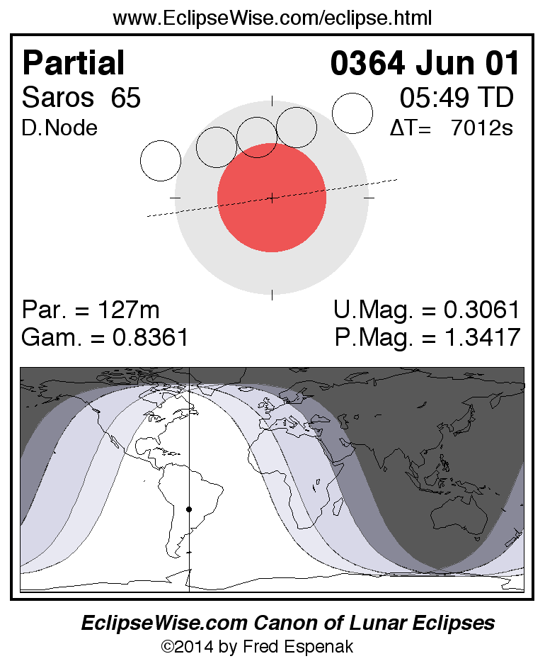 A panorama of all lunar eclipses belonging to Saros 65 is presented here. Each figure shows the Moon's path with respect to Earth's penumbral and umbral shadows. Below the path is a map depicting the geographic region of visibility for the eclipse. The date and time are given for the instant of Greatest Eclipse. Every figure serves as a hyperlink to the EclipseWise Prime page for that eclipse with a larger figure and complete details for the eclipse. Visit the Key to Lunar Eclipse Figures for a detailed explanation of these diagrams. Near the bottom of this page are a series of hyperlinks for more on lunar eclipses.