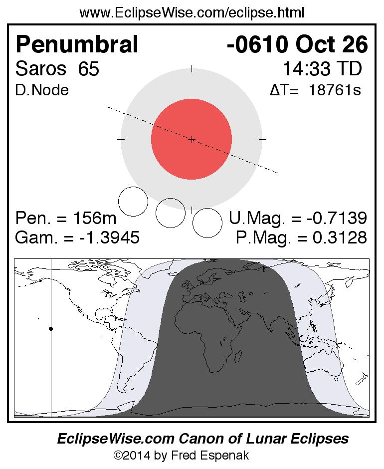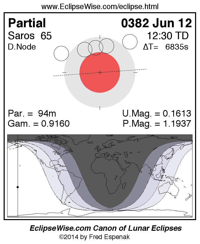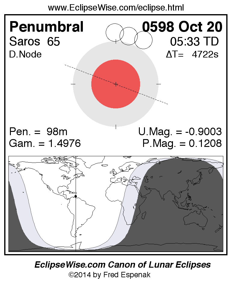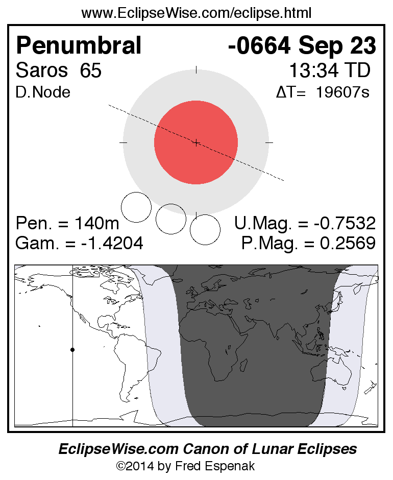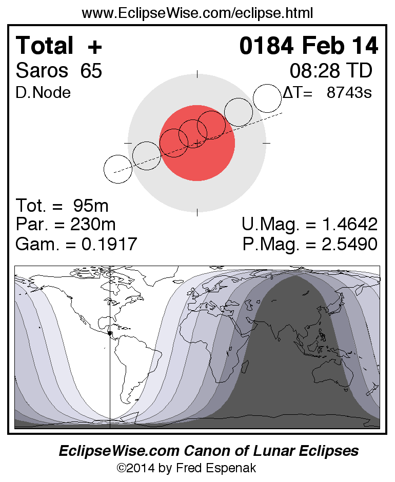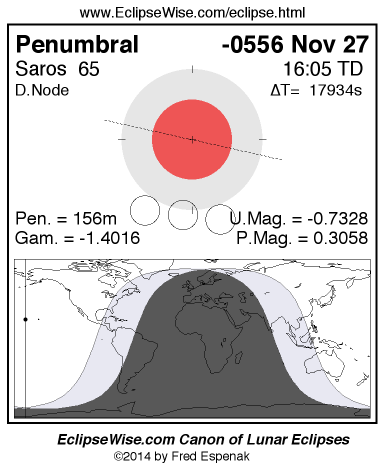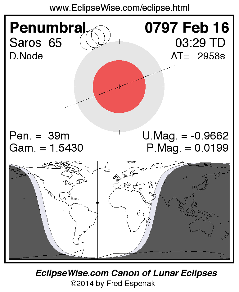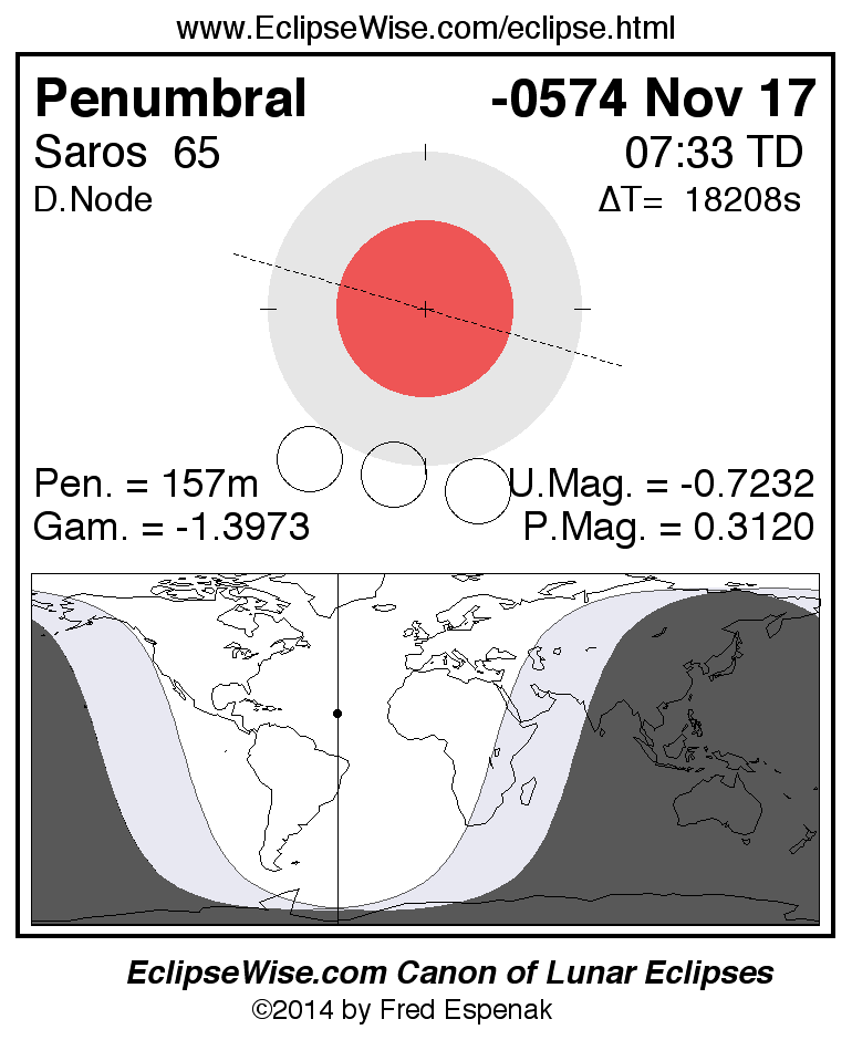 A panorama of all lunar eclipses belonging to Saros 65 is presented here. Each figure shows the Moon's path with respect to Earth's penumbral and umbral shadows. Below the path is a map depicting the geographic region of visibility for the eclipse. The date and time are given for the instant of Greatest Eclipse. Every figure serves as a hyperlink to the EclipseWise Prime page for that eclipse with a larger figure and complete details for the eclipse. Visit the Key to Lunar Eclipse Figures for a detailed explanation of these diagrams. Near the bottom of this page are a series of hyperlinks for more on lunar eclipses.
