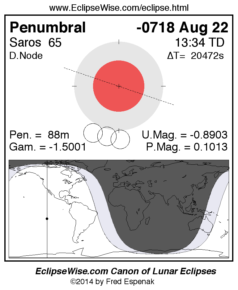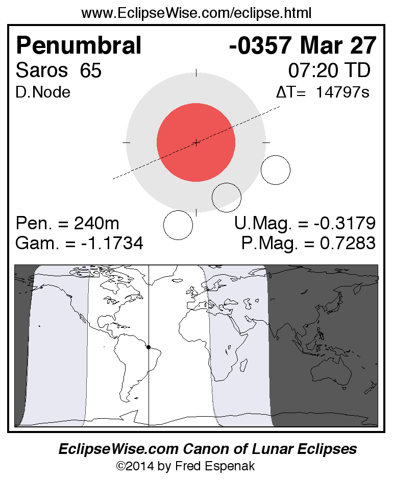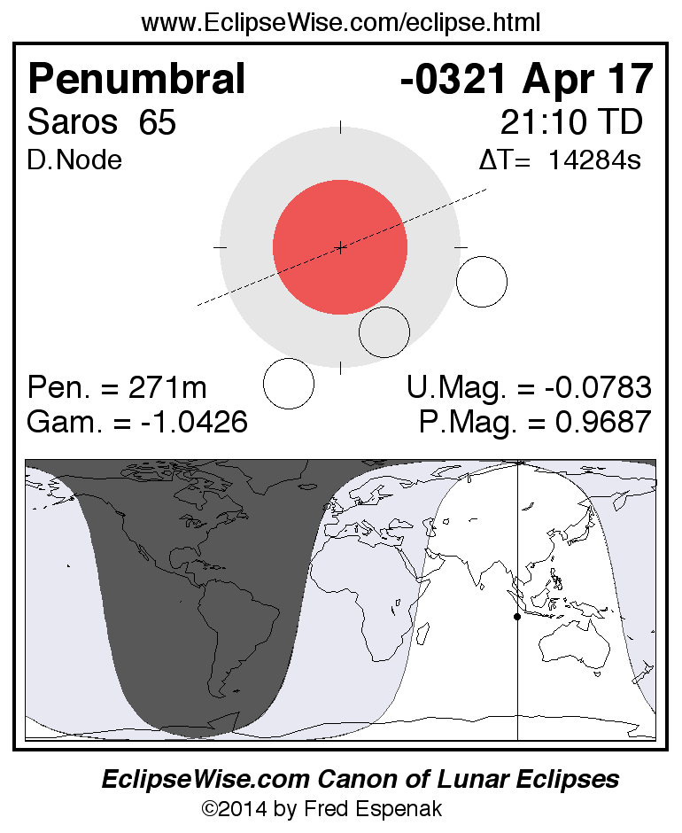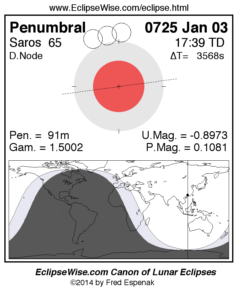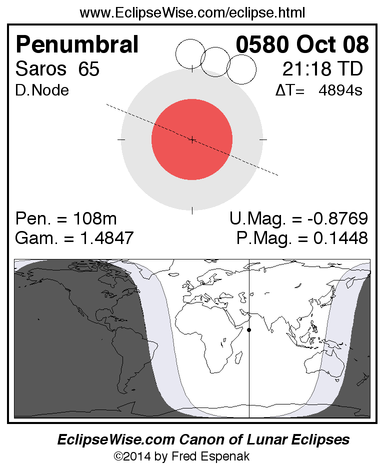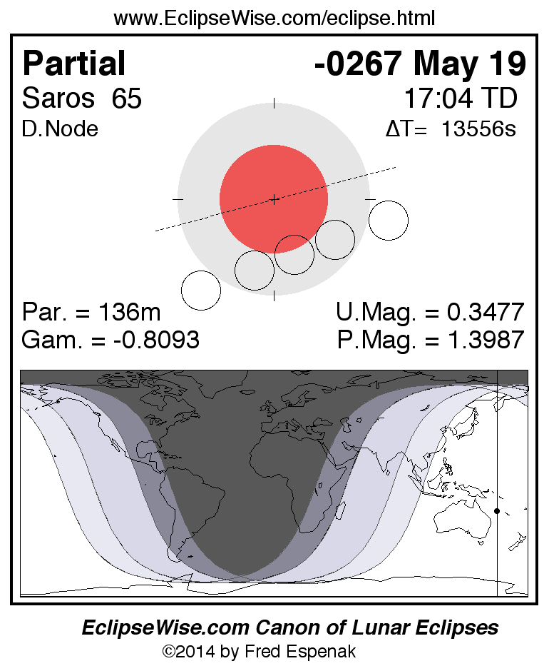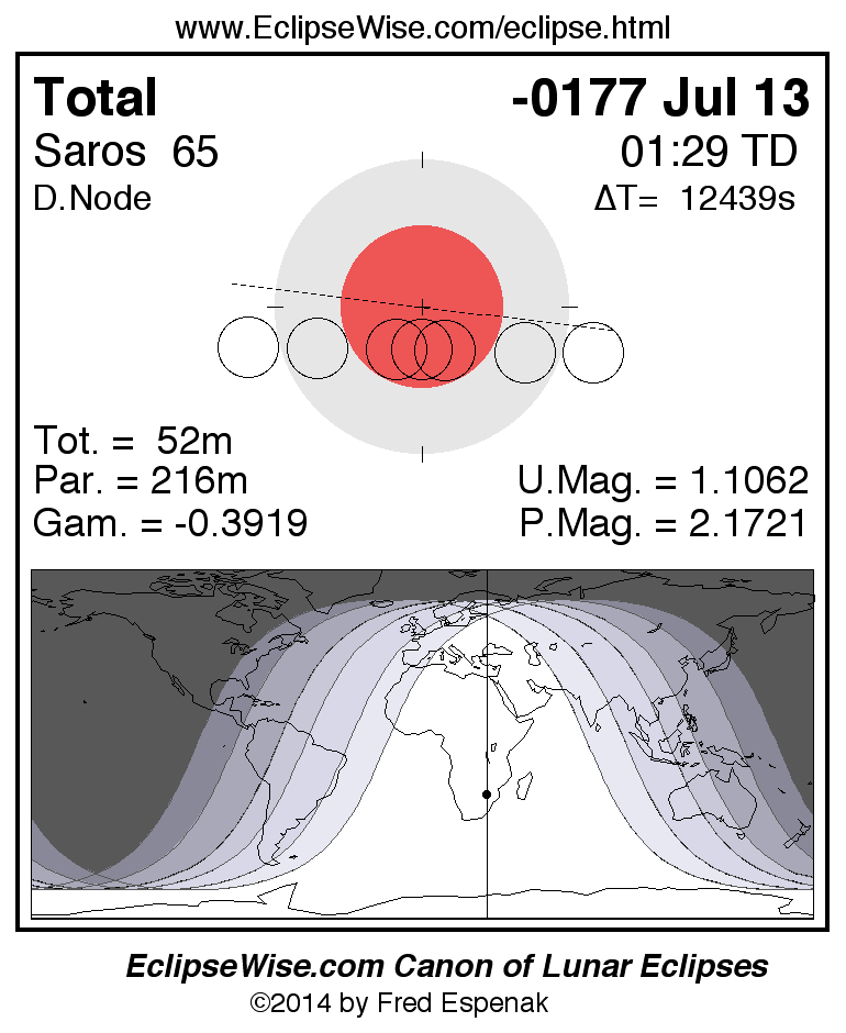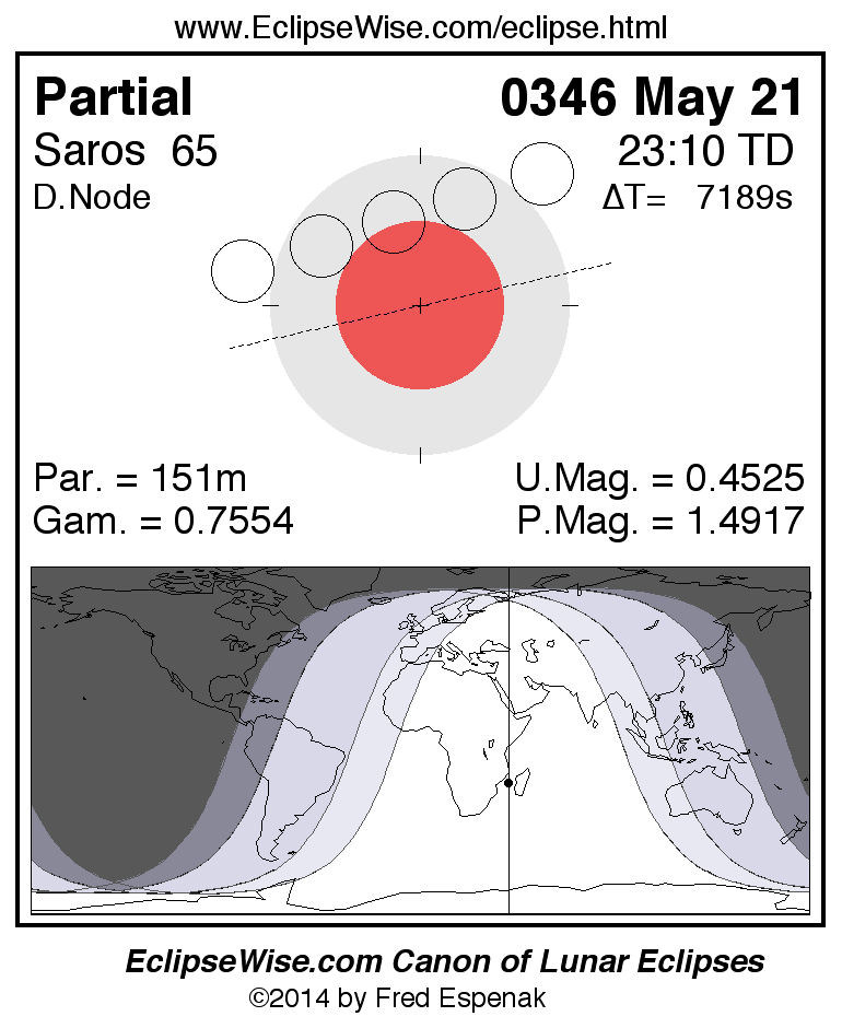 A panorama of all lunar eclipses belonging to Saros 65 is presented here. Each figure shows the Moon's path with respect to Earth's penumbral and umbral shadows. Below the path is a map depicting the geographic region of visibility for the eclipse. The date and time are given for the instant of Greatest Eclipse. Every figure serves as a hyperlink to the EclipseWise Prime page for that eclipse with a larger figure and complete details for the eclipse. Visit the Key to Lunar Eclipse Figures for a detailed explanation of these diagrams. Near the bottom of this page are a series of hyperlinks for more on lunar eclipses.