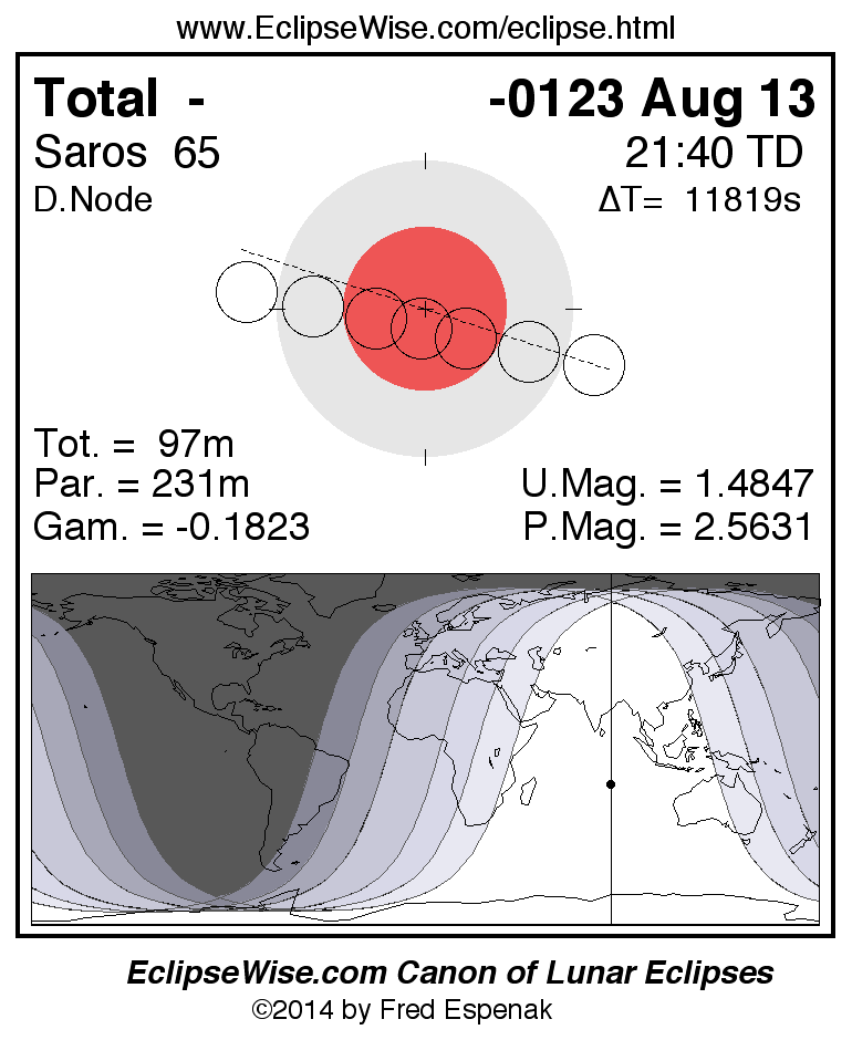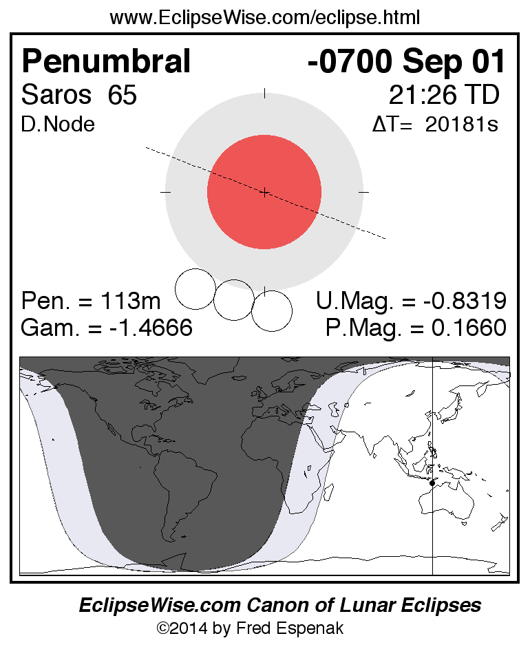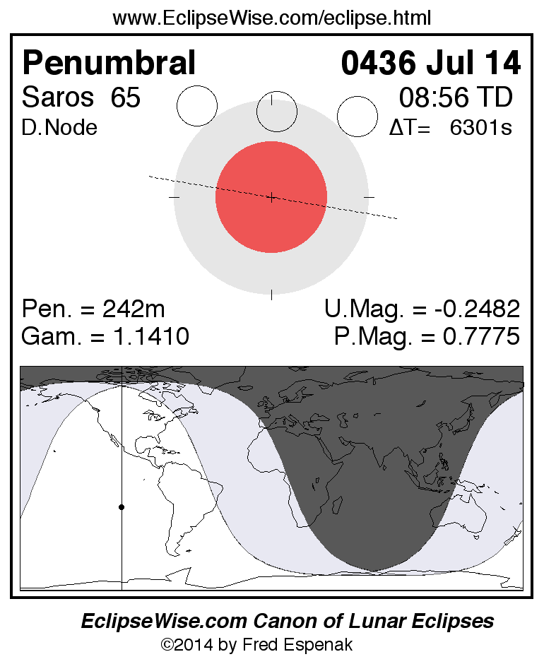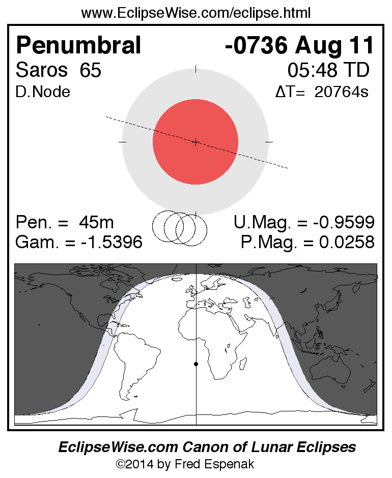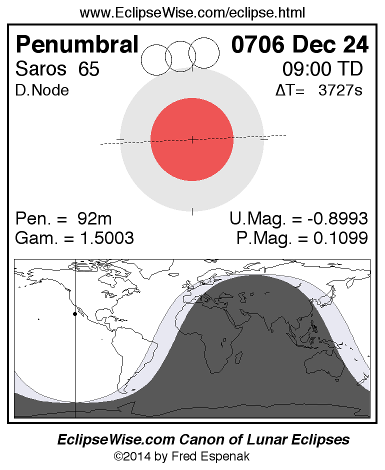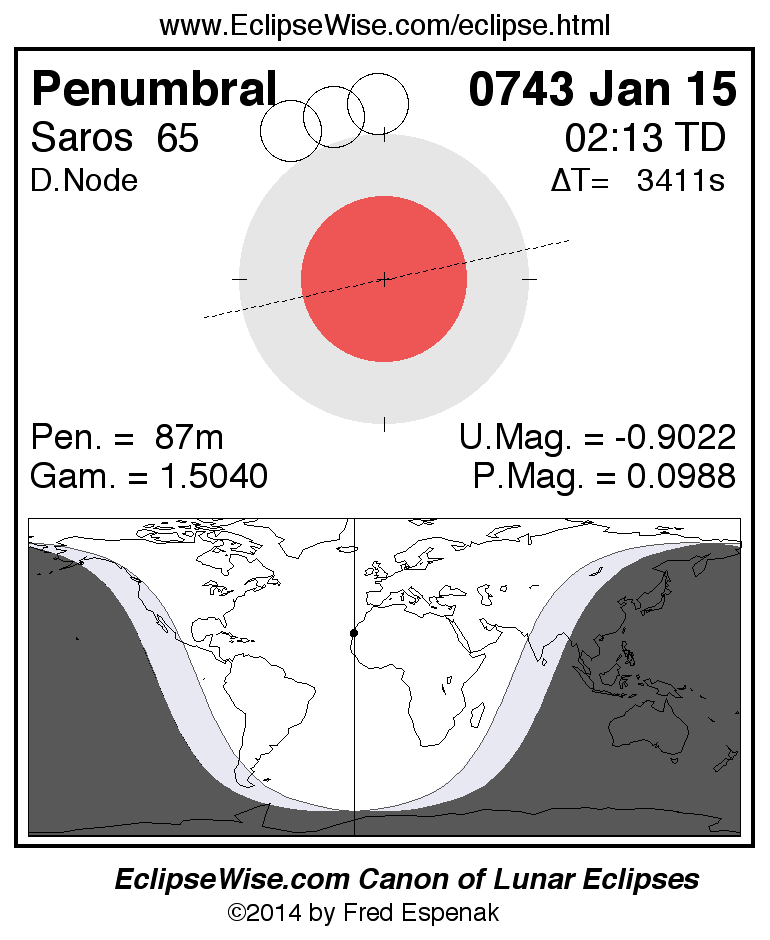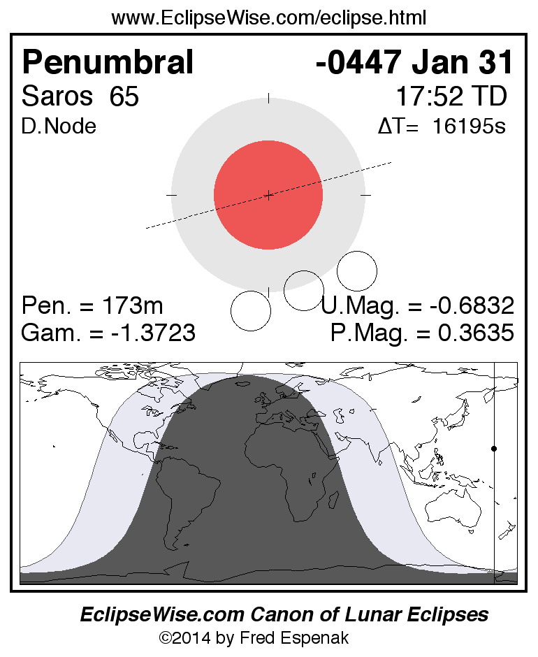 A panorama of all lunar eclipses belonging to Saros 65 is presented here. Each figure shows the Moon's path with respect to Earth's penumbral and umbral shadows. Below the path is a map depicting the geographic region of visibility for the eclipse. The date and time are given for the instant of Greatest Eclipse. Every figure serves as a hyperlink to the EclipseWise Prime page for that eclipse with a larger figure and complete details for the eclipse. Visit the Key to Lunar Eclipse Figures for a detailed explanation of these diagrams. Near the bottom of this page are a series of hyperlinks for more on lunar eclipses.