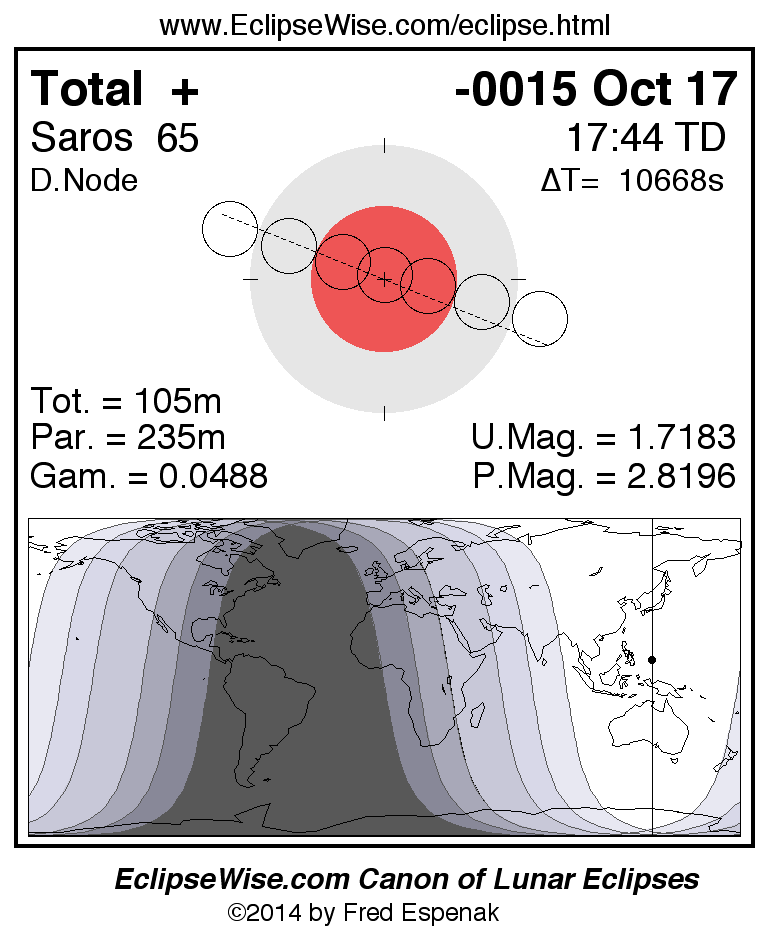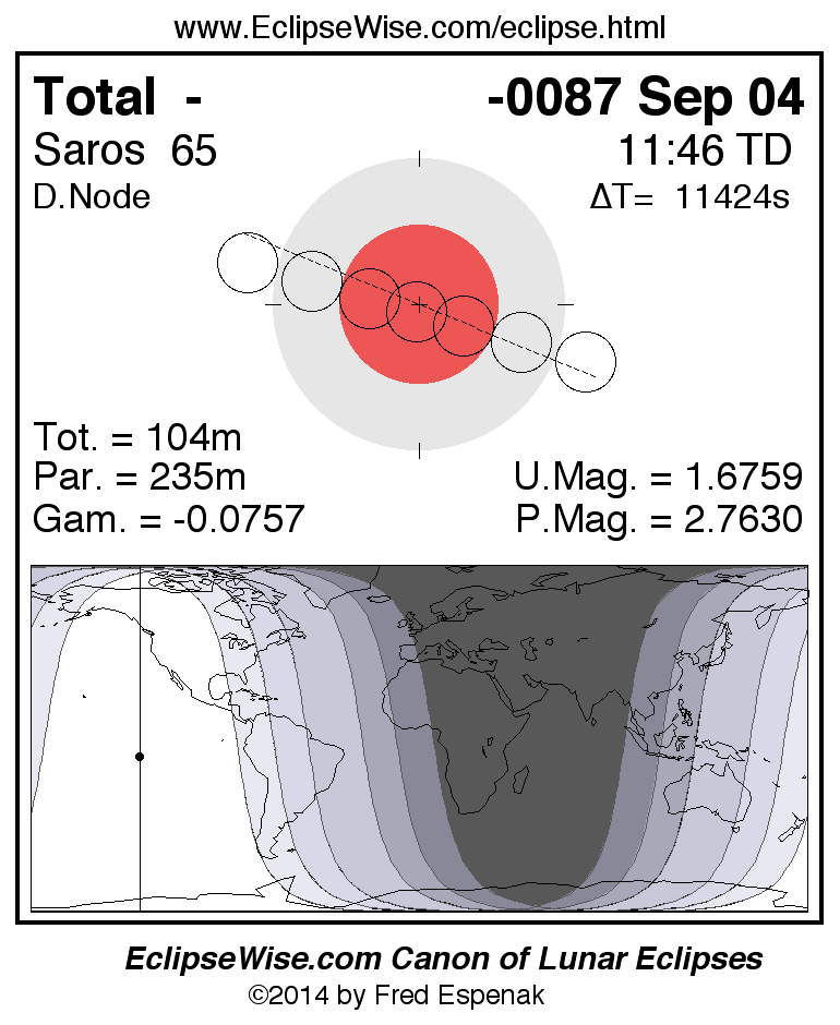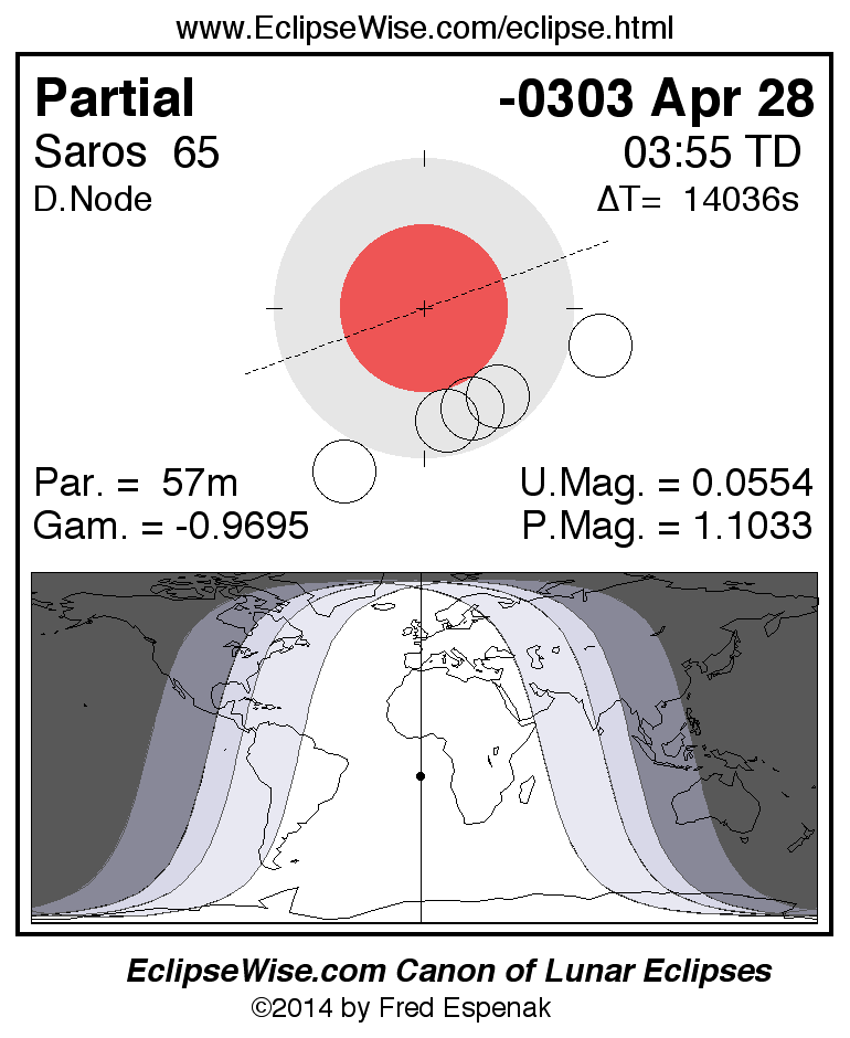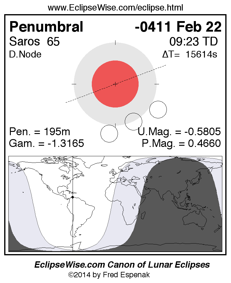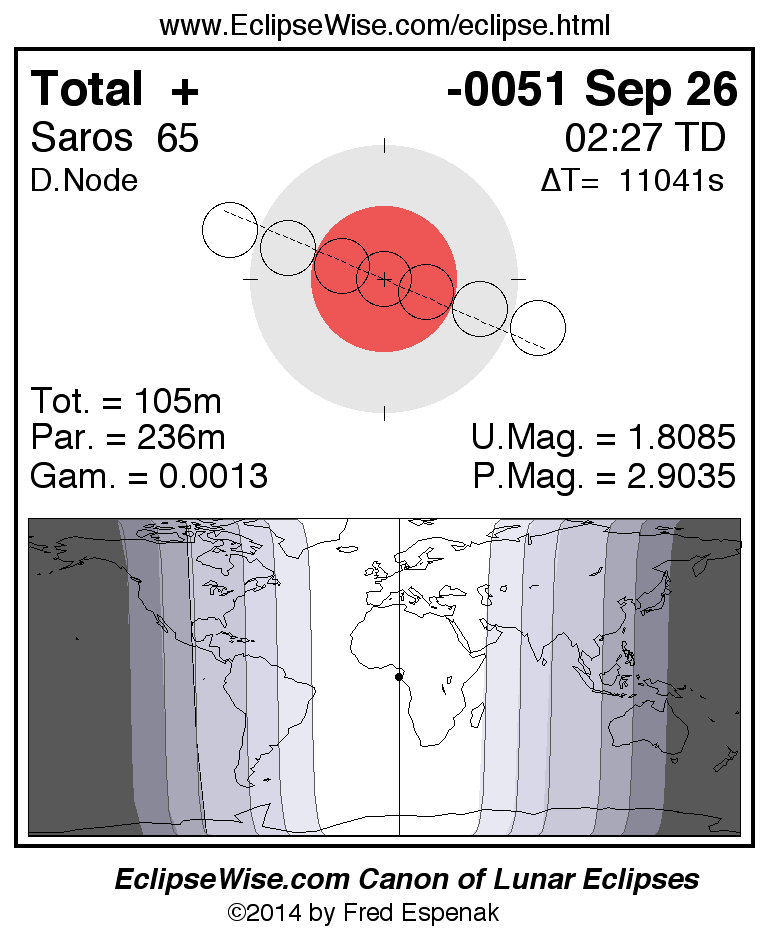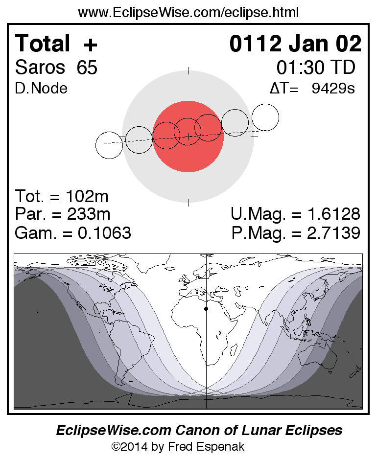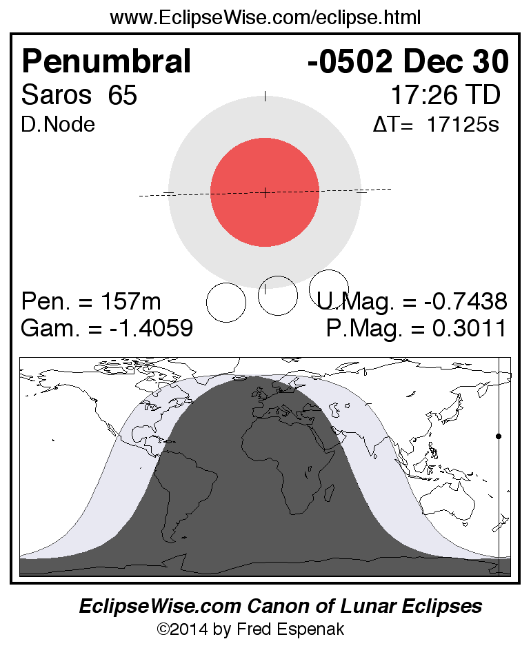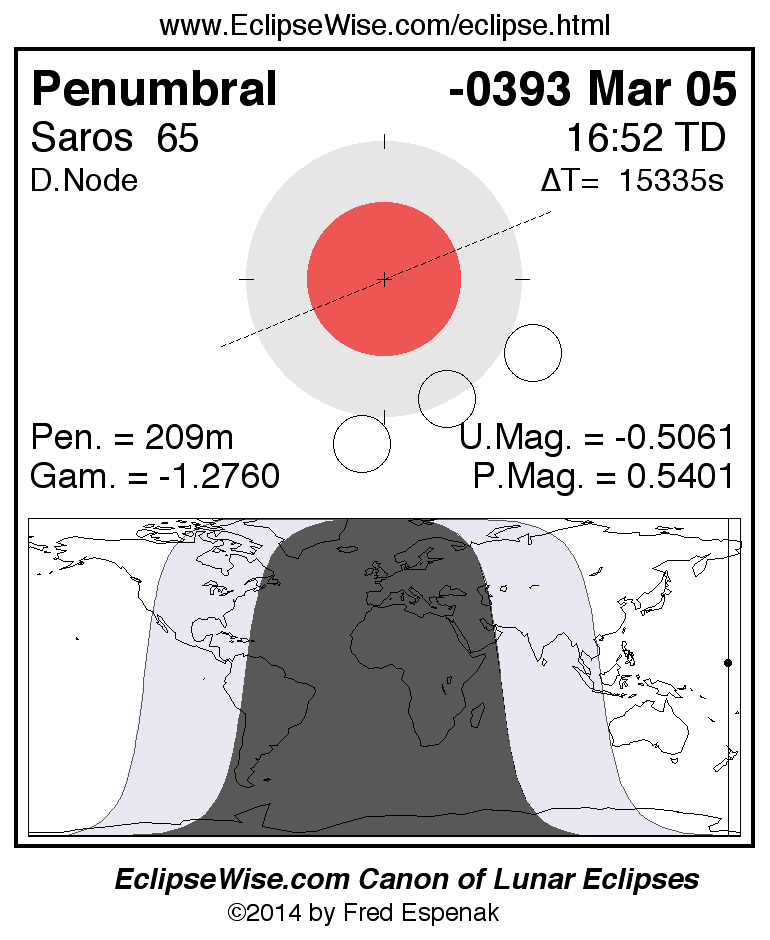 A panorama of all lunar eclipses belonging to Saros 65 is presented here. Each figure shows the Moon's path with respect to Earth's penumbral and umbral shadows. Below the path is a map depicting the geographic region of visibility for the eclipse. The date and time are given for the instant of Greatest Eclipse. Every figure serves as a hyperlink to the EclipseWise Prime page for that eclipse with a larger figure and complete details for the eclipse. Visit the Key to Lunar Eclipse Figures for a detailed explanation of these diagrams. Near the bottom of this page are a series of hyperlinks for more on lunar eclipses.