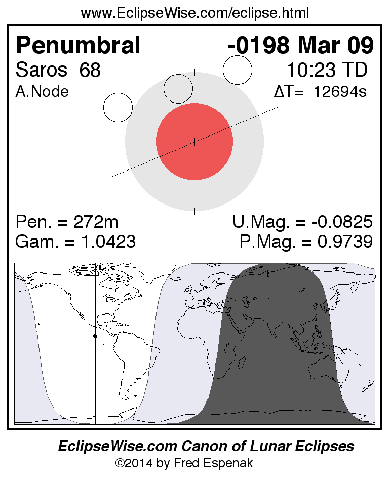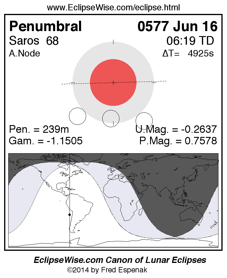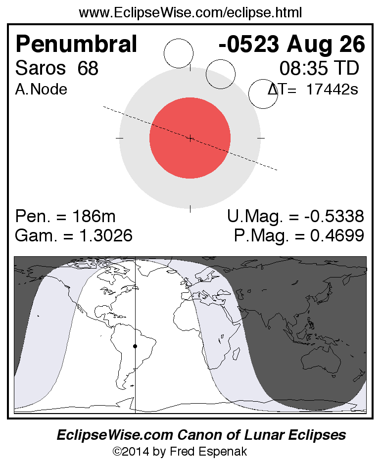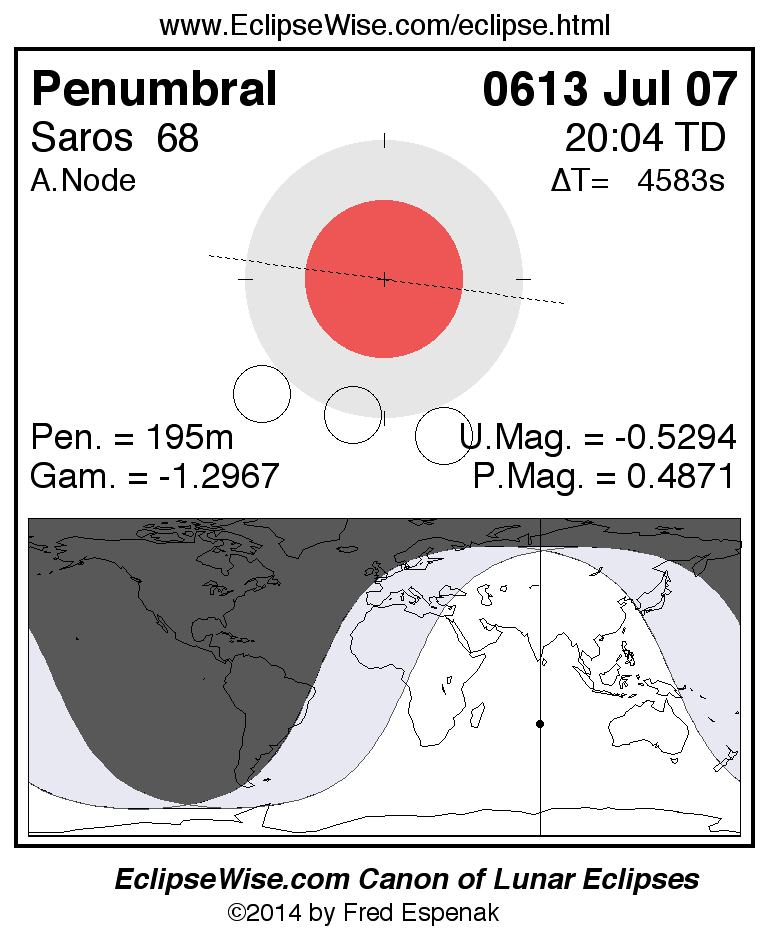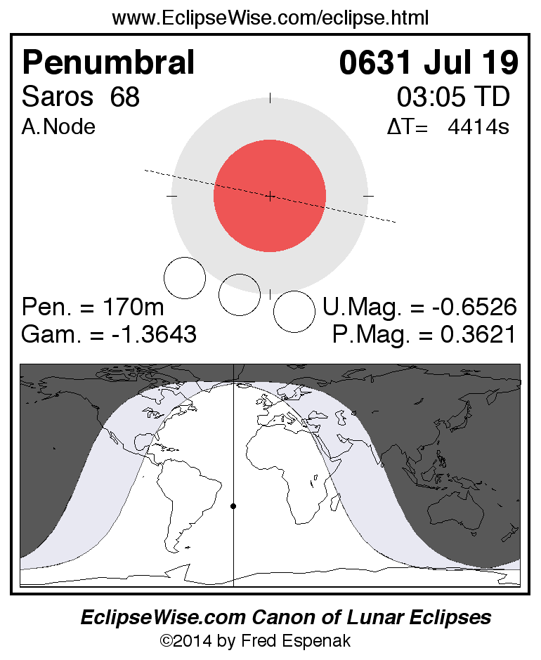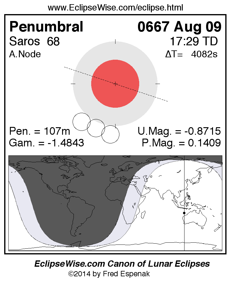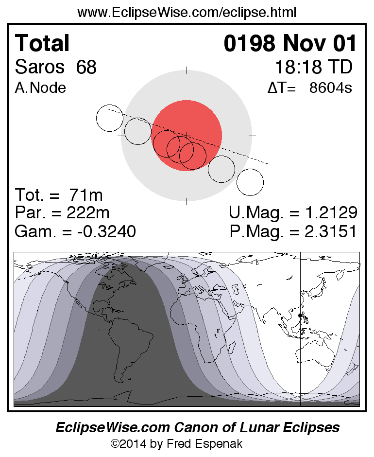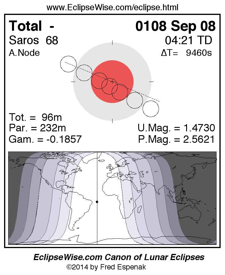 A panorama of all lunar eclipses belonging to Saros 68 is presented here. Each figure shows the Moon's path with respect to Earth's penumbral and umbral shadows. Below the path is a map depicting the geographic region of visibility for the eclipse. The date and time are given for the instant of Greatest Eclipse. Every figure serves as a hyperlink to the EclipseWise Prime page for that eclipse with a larger figure and complete details for the eclipse. Visit the Key to Lunar Eclipse Figures for a detailed explanation of these diagrams. Near the bottom of this page are a series of hyperlinks for more on lunar eclipses.