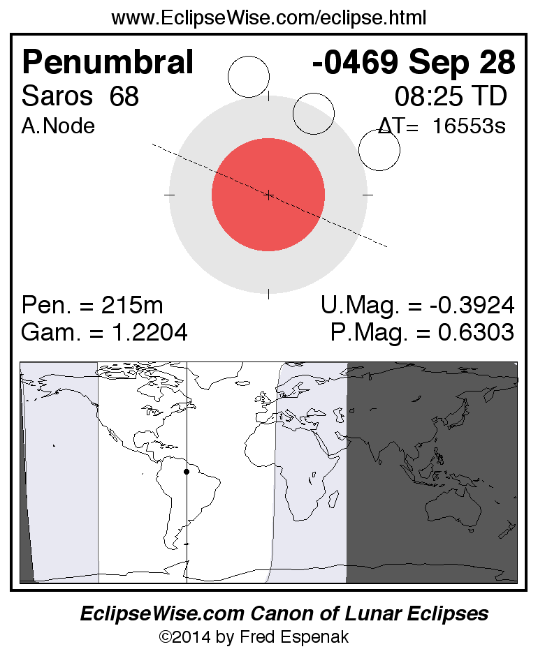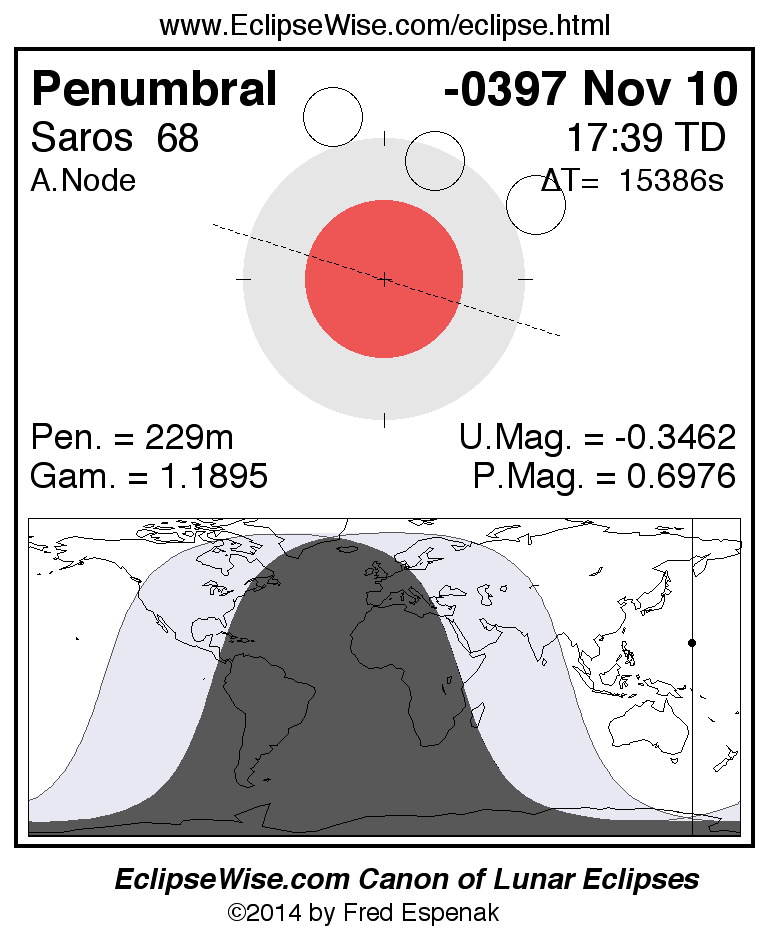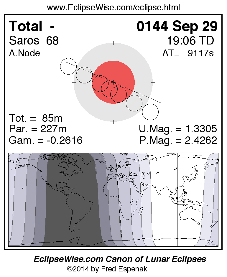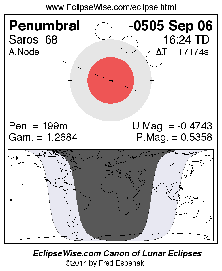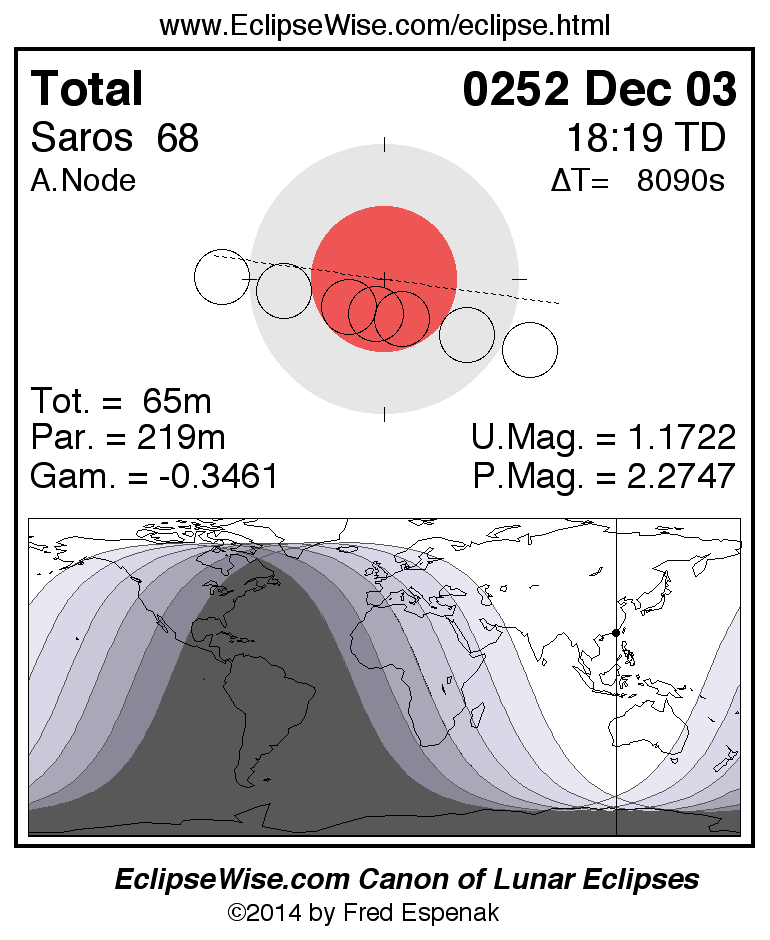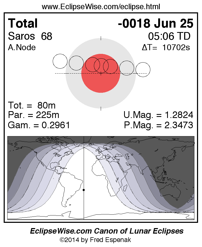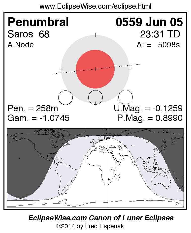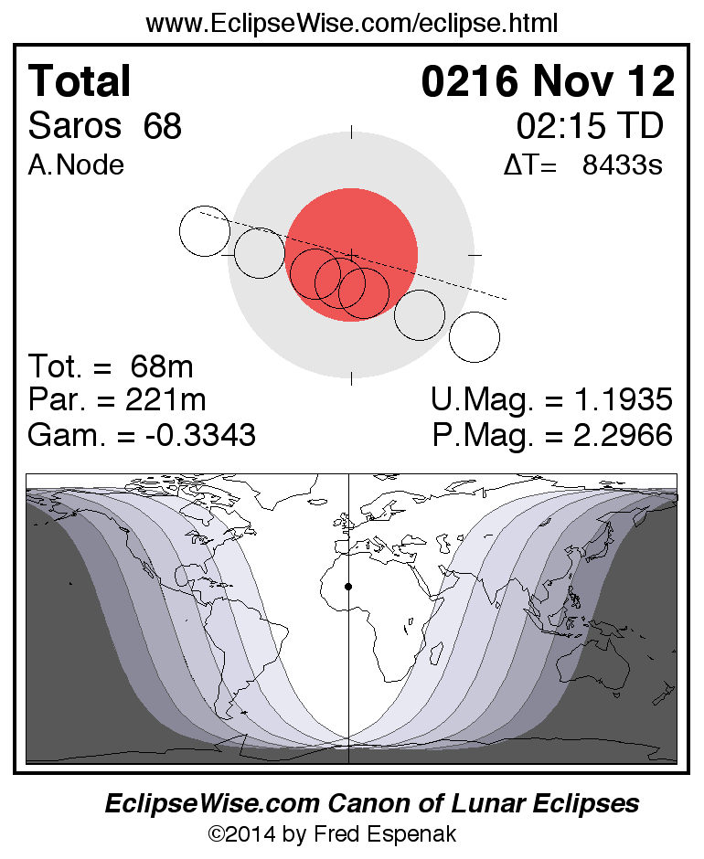 A panorama of all lunar eclipses belonging to Saros 68 is presented here. Each figure shows the Moon's path with respect to Earth's penumbral and umbral shadows. Below the path is a map depicting the geographic region of visibility for the eclipse. The date and time are given for the instant of Greatest Eclipse. Every figure serves as a hyperlink to the EclipseWise Prime page for that eclipse with a larger figure and complete details for the eclipse. Visit the Key to Lunar Eclipse Figures for a detailed explanation of these diagrams. Near the bottom of this page are a series of hyperlinks for more on lunar eclipses.
