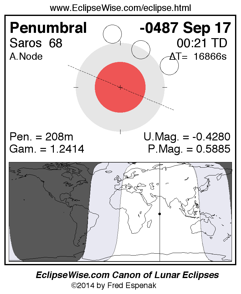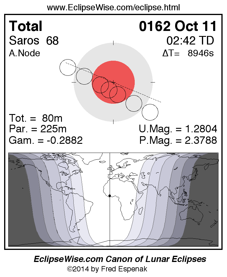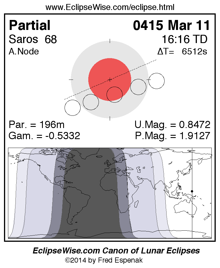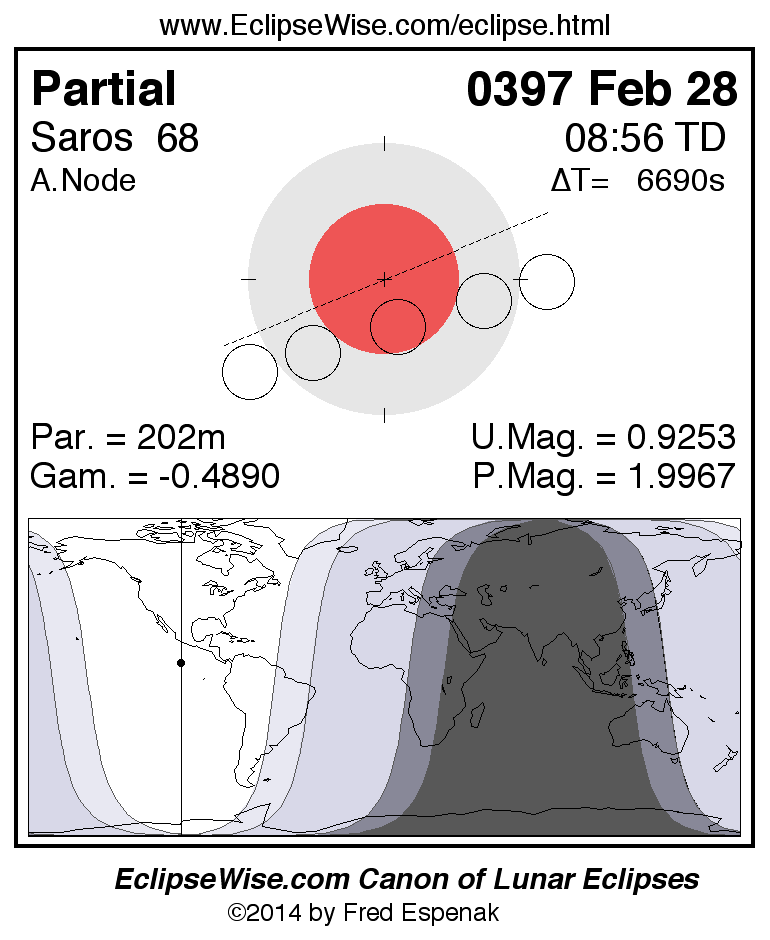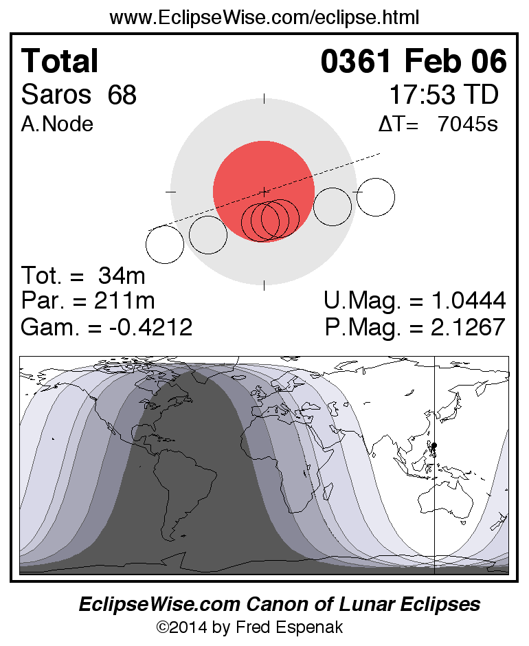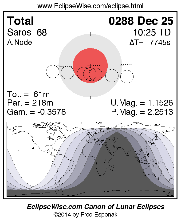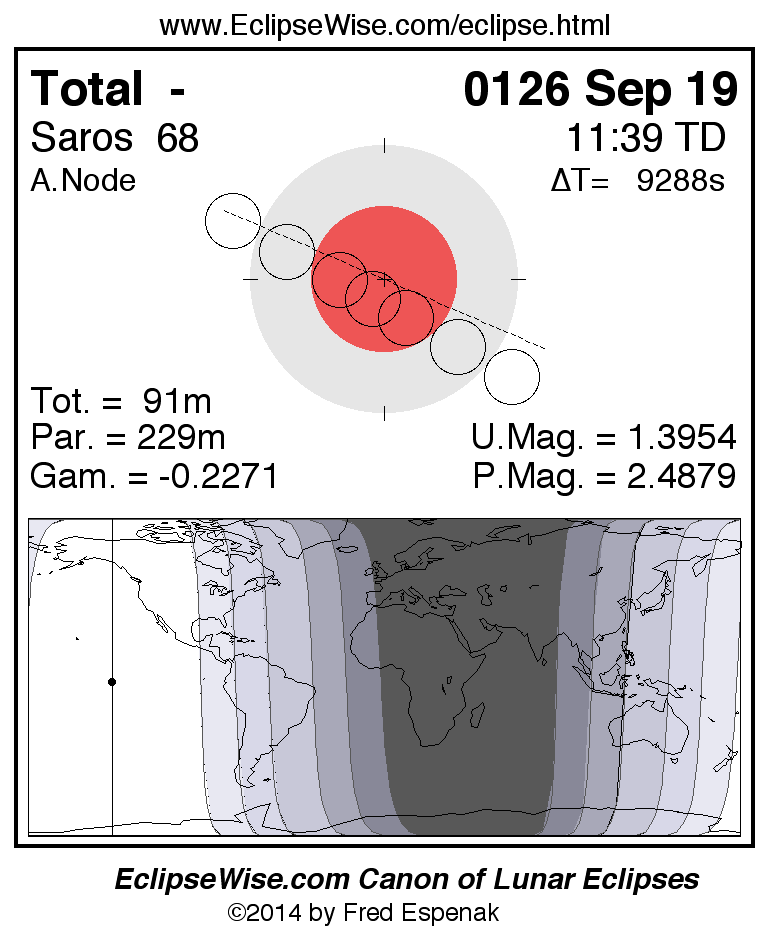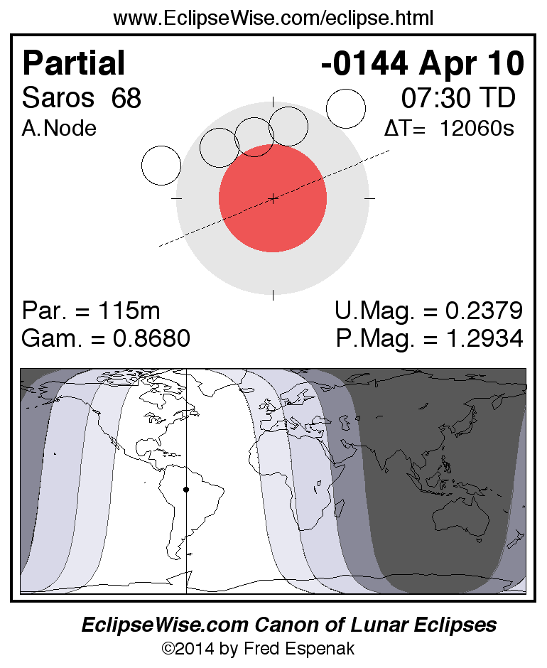 A panorama of all lunar eclipses belonging to Saros 68 is presented here. Each figure shows the Moon's path with respect to Earth's penumbral and umbral shadows. Below the path is a map depicting the geographic region of visibility for the eclipse. The date and time are given for the instant of Greatest Eclipse. Every figure serves as a hyperlink to the EclipseWise Prime page for that eclipse with a larger figure and complete details for the eclipse. Visit the Key to Lunar Eclipse Figures for a detailed explanation of these diagrams. Near the bottom of this page are a series of hyperlinks for more on lunar eclipses.