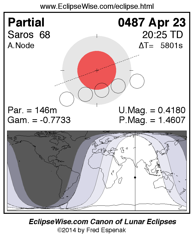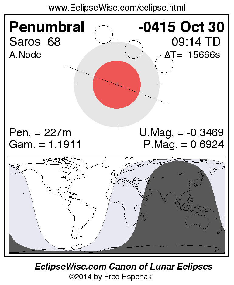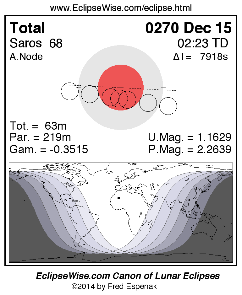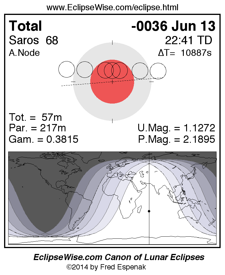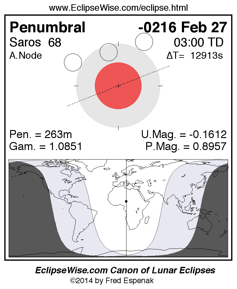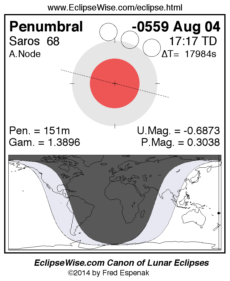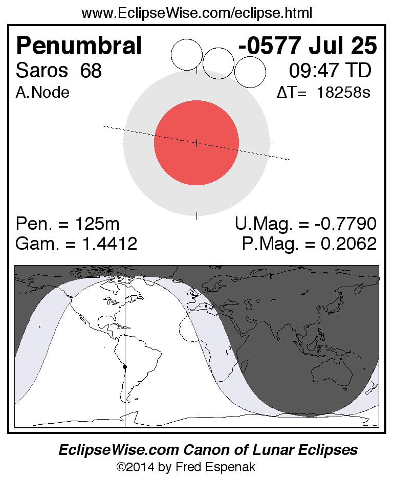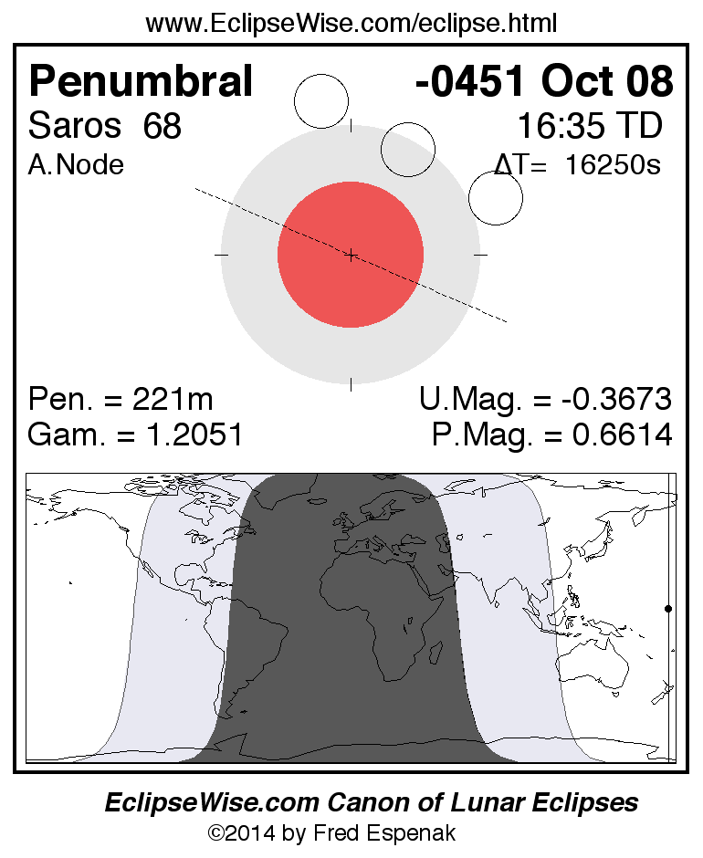 A panorama of all lunar eclipses belonging to Saros 68 is presented here. Each figure shows the Moon's path with respect to Earth's penumbral and umbral shadows. Below the path is a map depicting the geographic region of visibility for the eclipse. The date and time are given for the instant of Greatest Eclipse. Every figure serves as a hyperlink to the EclipseWise Prime page for that eclipse with a larger figure and complete details for the eclipse. Visit the Key to Lunar Eclipse Figures for a detailed explanation of these diagrams. Near the bottom of this page are a series of hyperlinks for more on lunar eclipses.