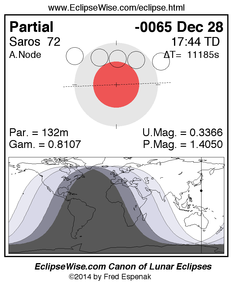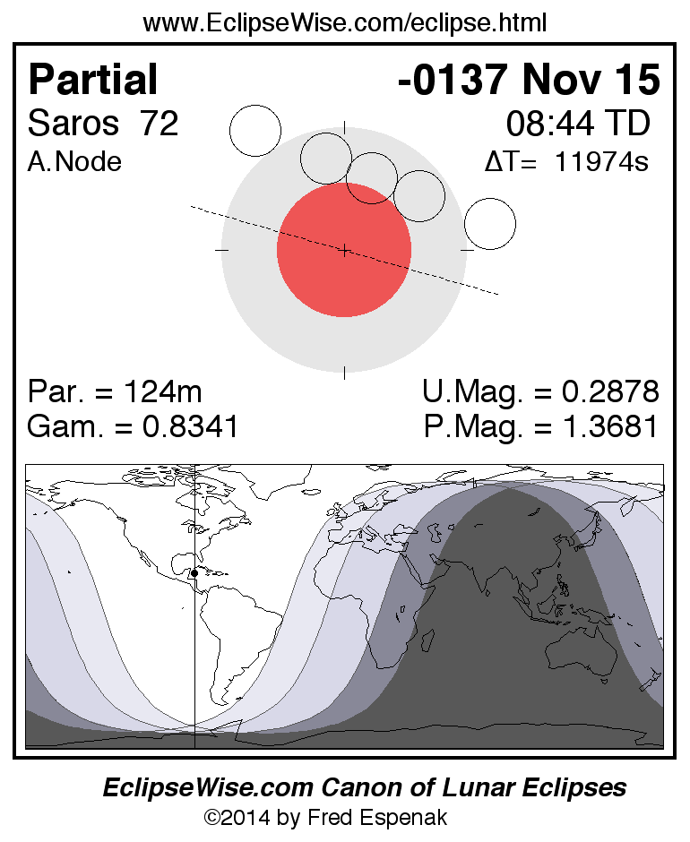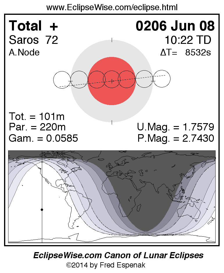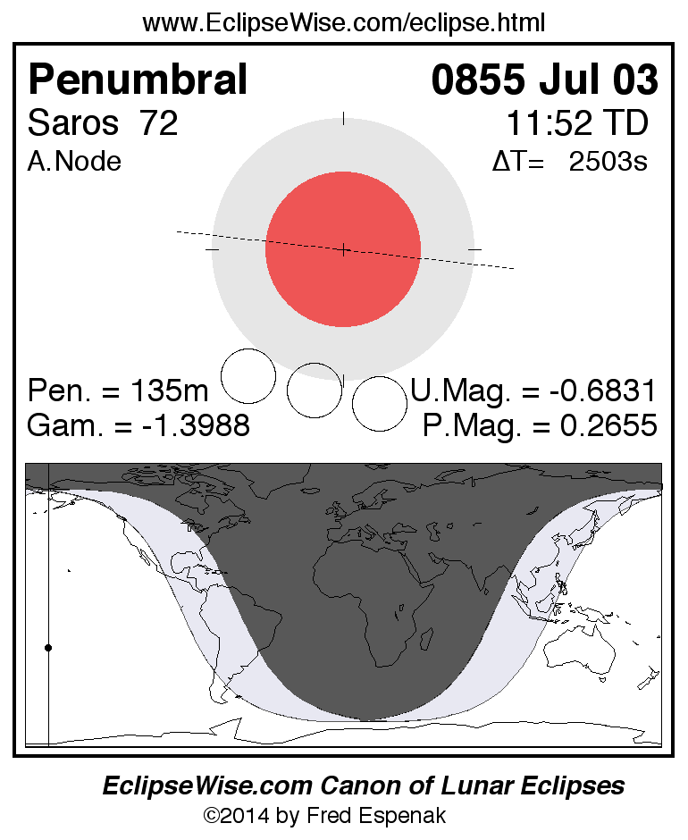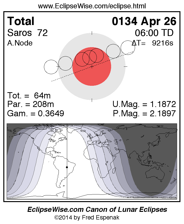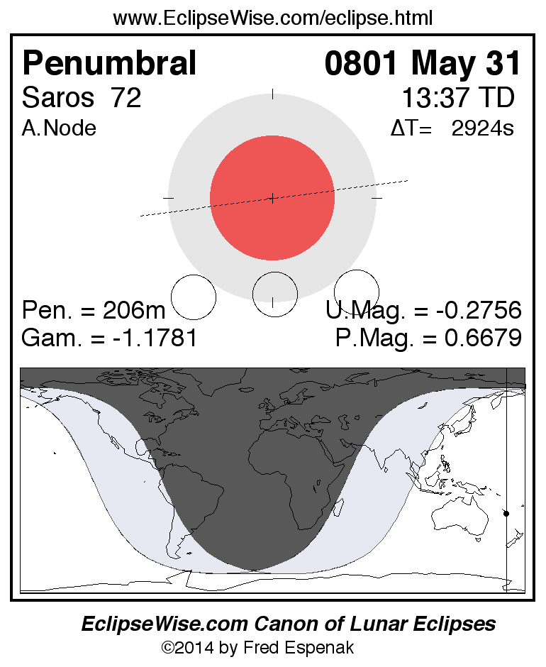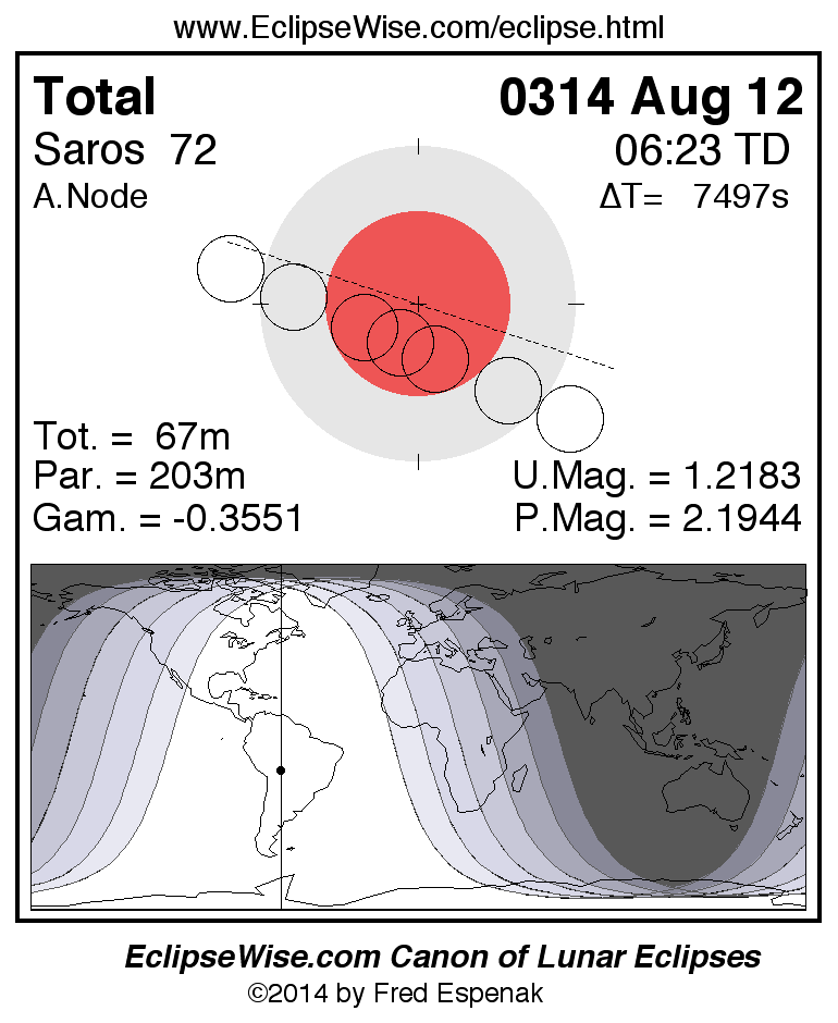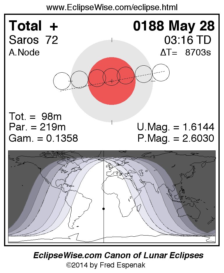 A panorama of all lunar eclipses belonging to Saros 72 is presented here. Each figure shows the Moon's path with respect to Earth's penumbral and umbral shadows. Below the path is a map depicting the geographic region of visibility for the eclipse. The date and time are given for the instant of Greatest Eclipse. Every figure serves as a hyperlink to the EclipseWise Prime page for that eclipse with a larger figure and complete details for the eclipse. Visit the Key to Lunar Eclipse Figures for a detailed explanation of these diagrams. Near the bottom of this page are a series of hyperlinks for more on lunar eclipses.