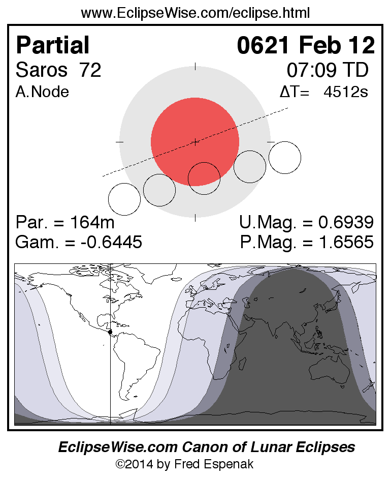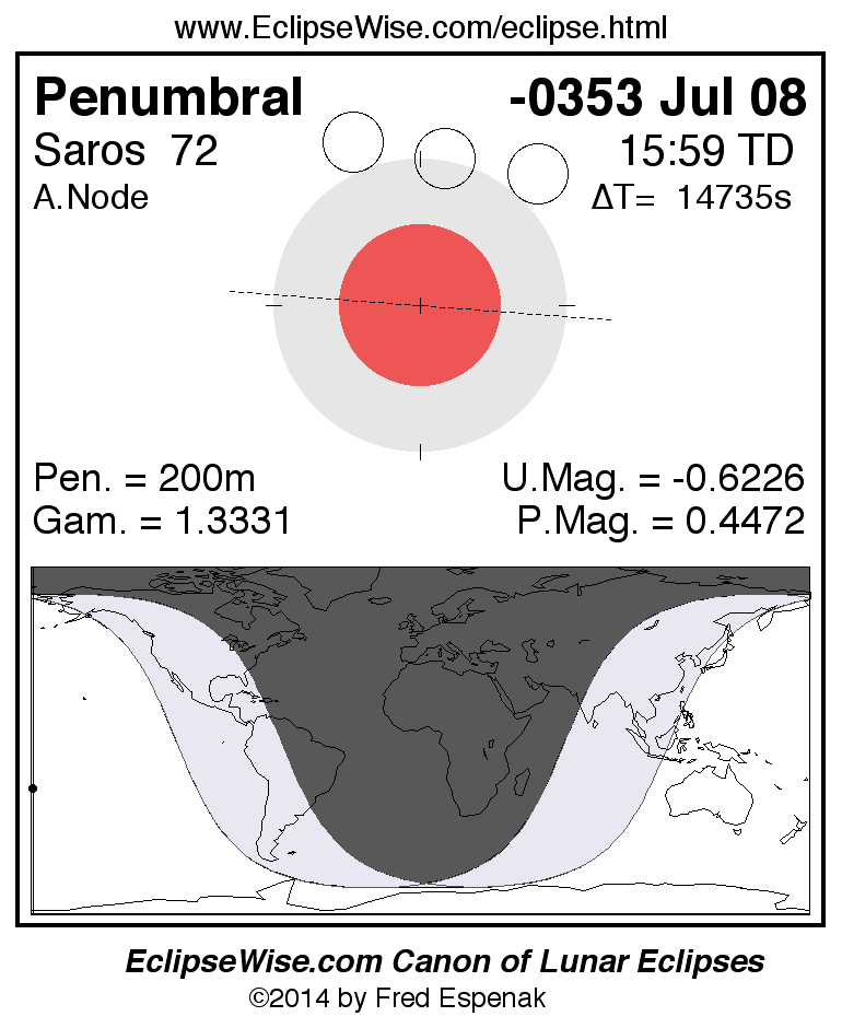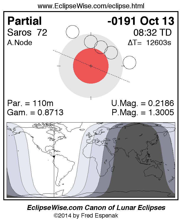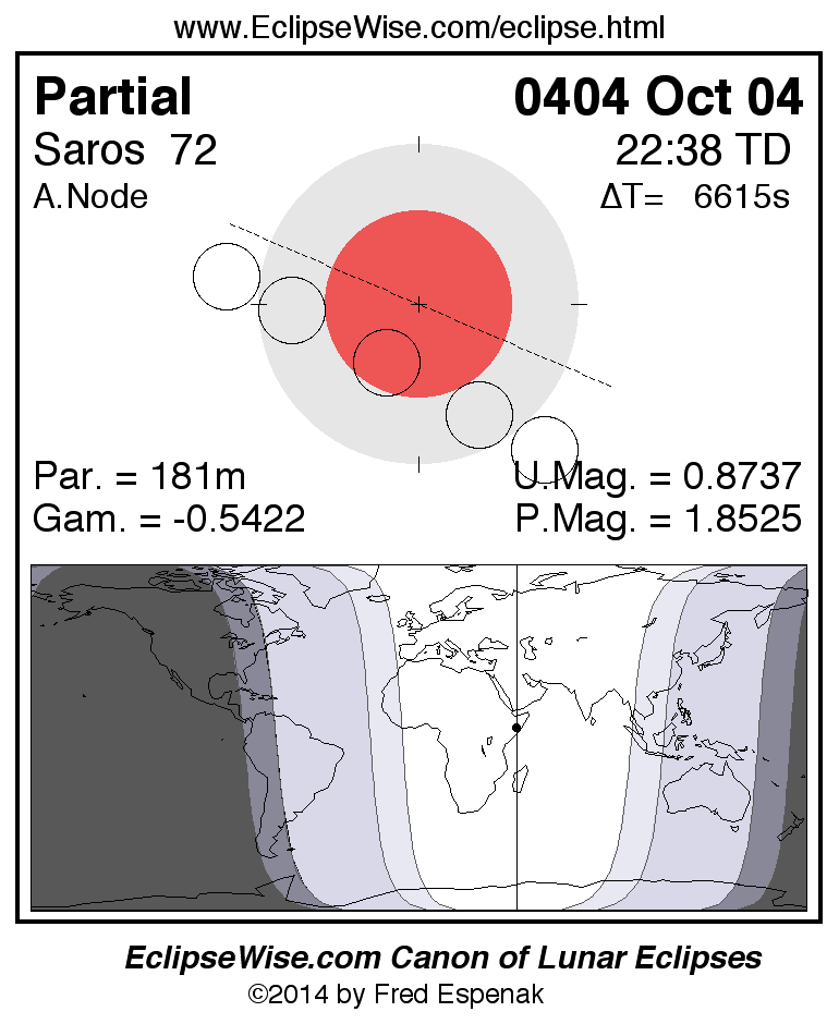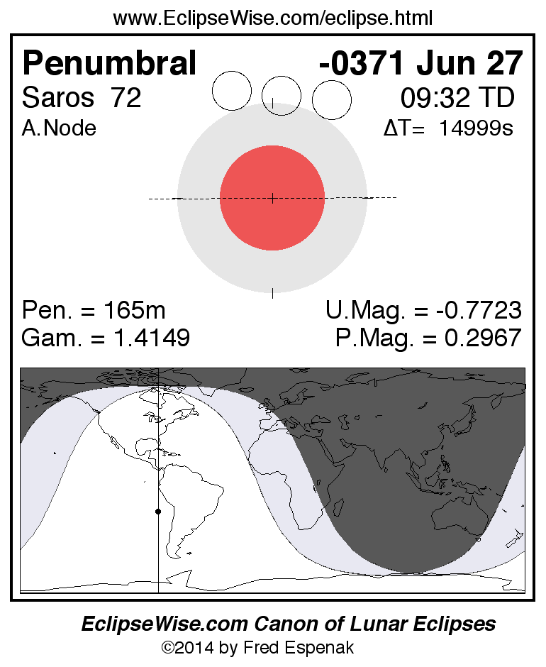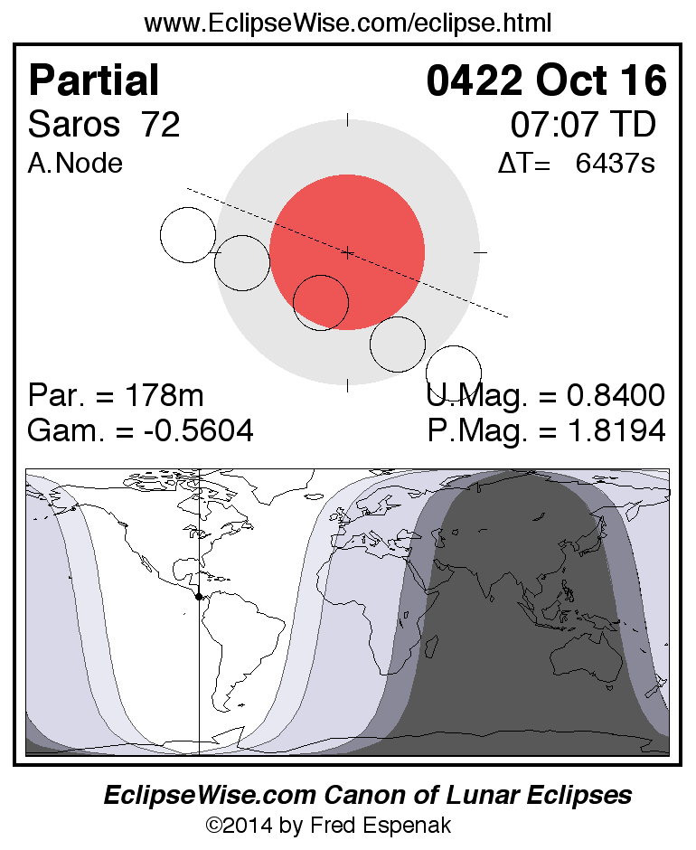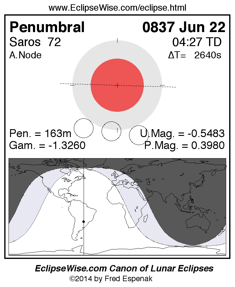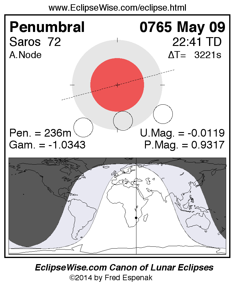 A panorama of all lunar eclipses belonging to Saros 72 is presented here. Each figure shows the Moon's path with respect to Earth's penumbral and umbral shadows. Below the path is a map depicting the geographic region of visibility for the eclipse. The date and time are given for the instant of Greatest Eclipse. Every figure serves as a hyperlink to the EclipseWise Prime page for that eclipse with a larger figure and complete details for the eclipse. Visit the Key to Lunar Eclipse Figures for a detailed explanation of these diagrams. Near the bottom of this page are a series of hyperlinks for more on lunar eclipses.