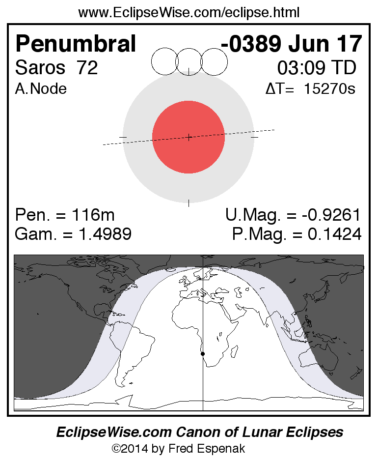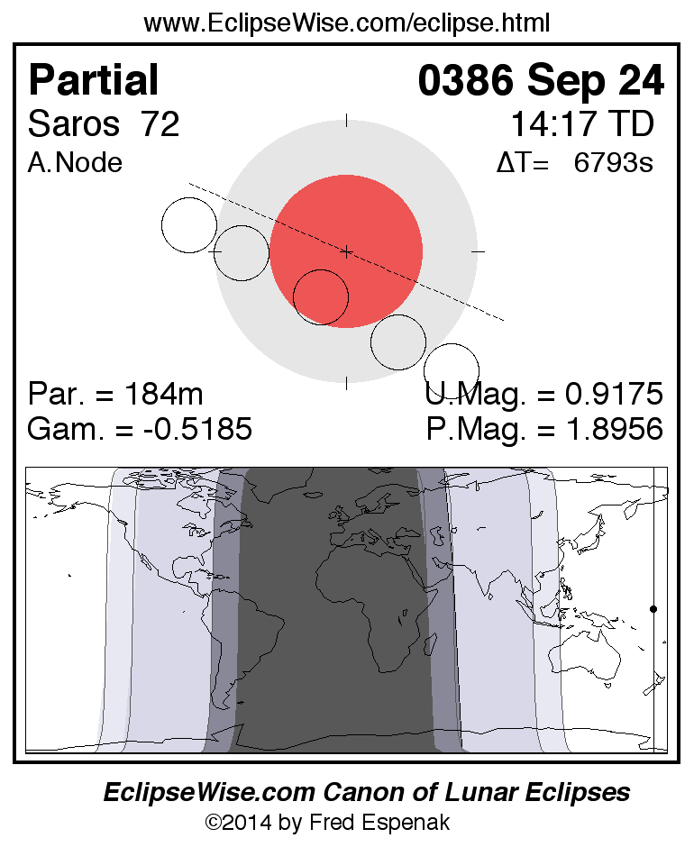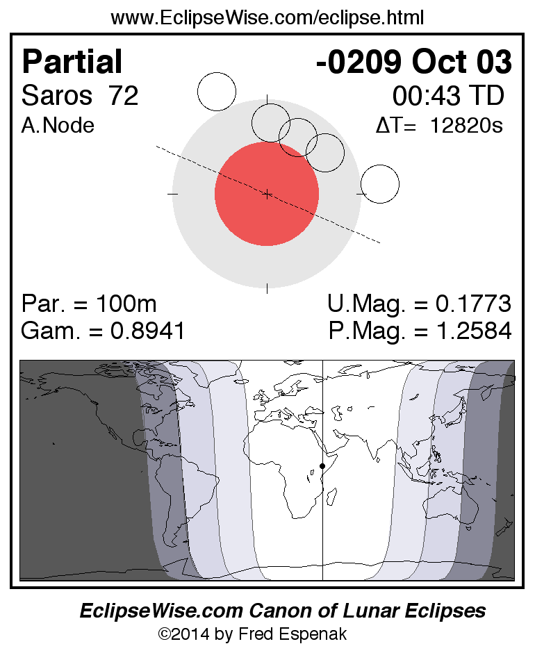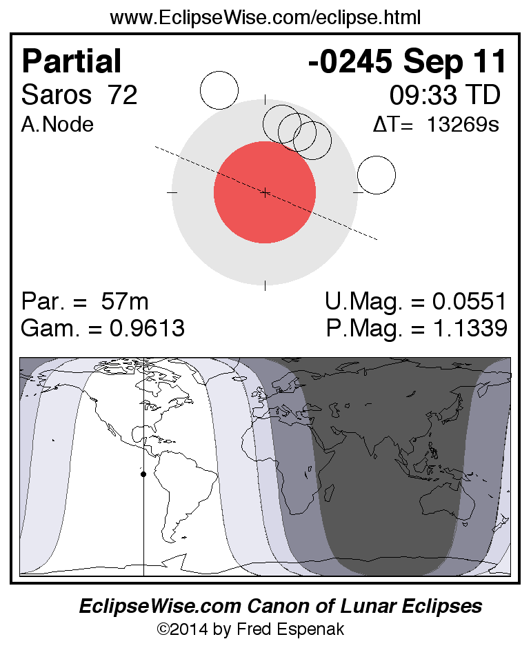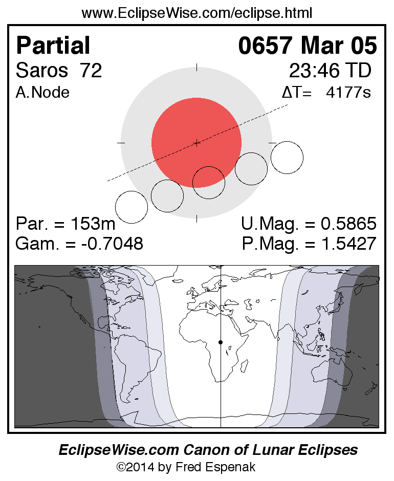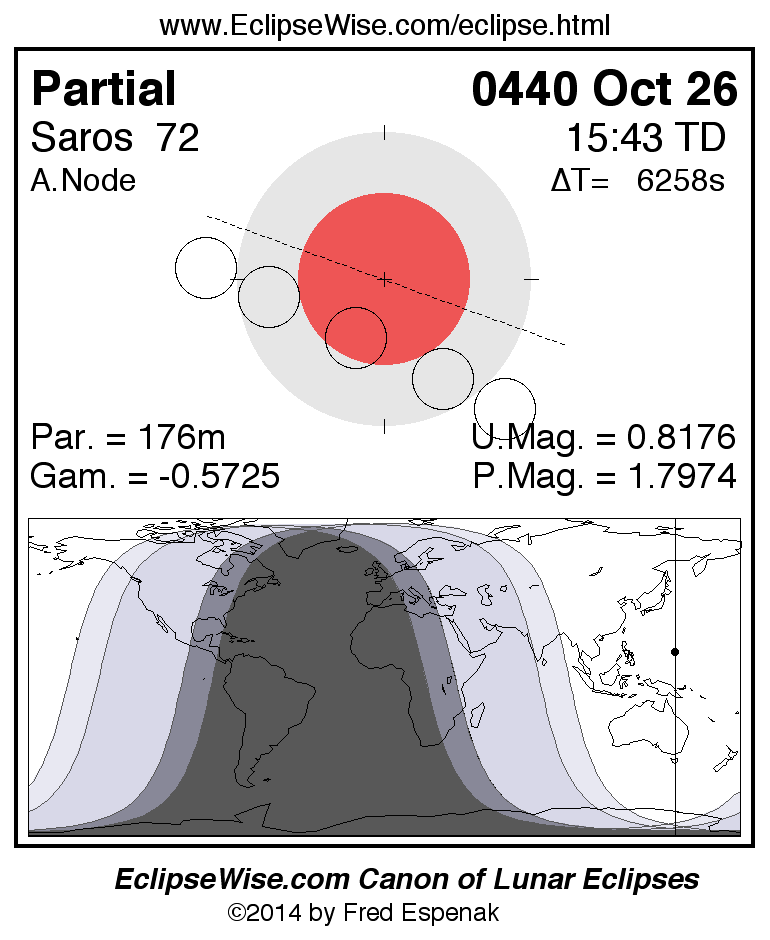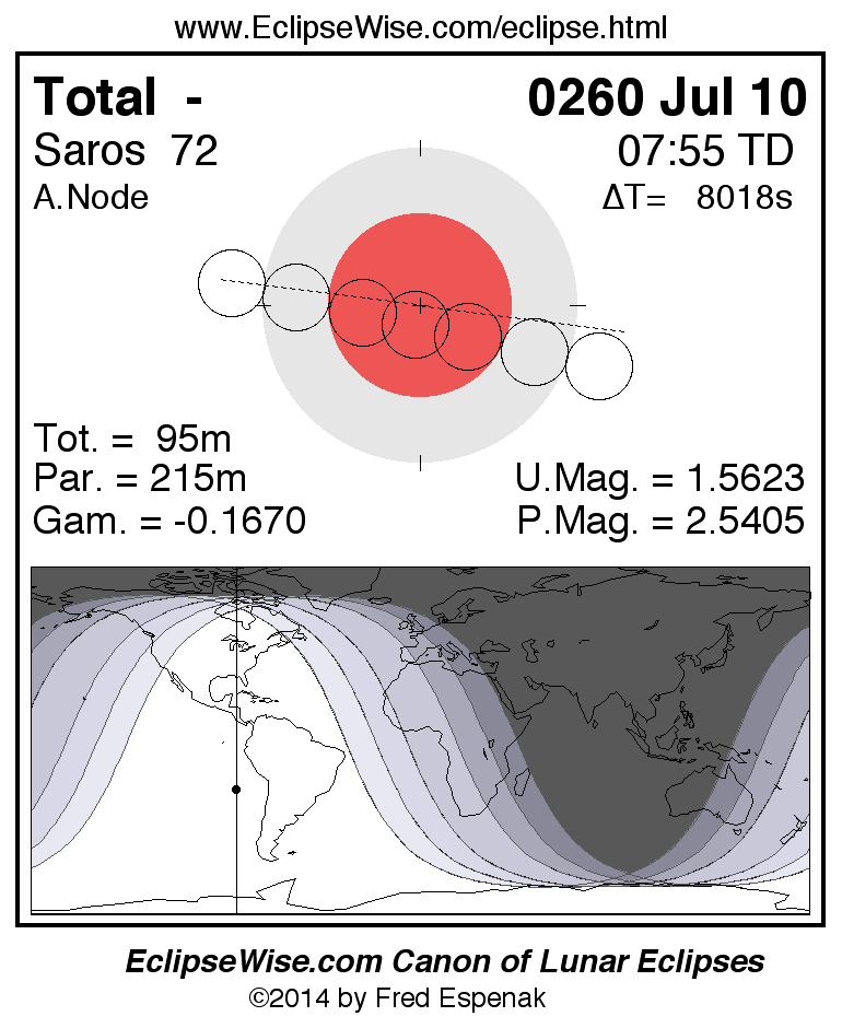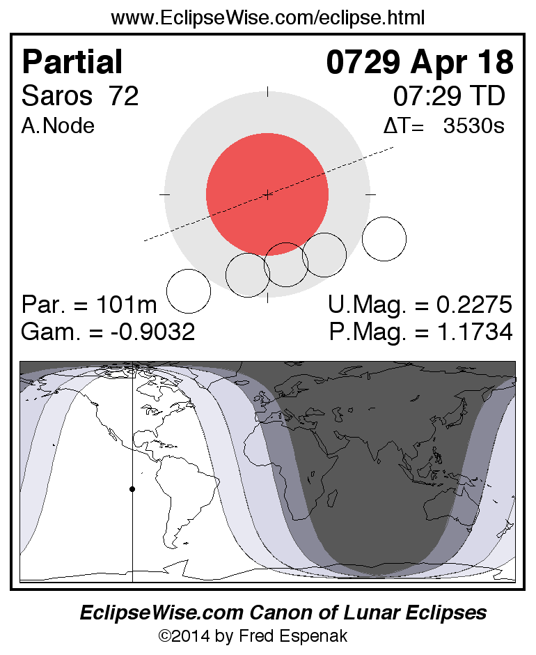 A panorama of all lunar eclipses belonging to Saros 72 is presented here. Each figure shows the Moon's path with respect to Earth's penumbral and umbral shadows. Below the path is a map depicting the geographic region of visibility for the eclipse. The date and time are given for the instant of Greatest Eclipse. Every figure serves as a hyperlink to the EclipseWise Prime page for that eclipse with a larger figure and complete details for the eclipse. Visit the Key to Lunar Eclipse Figures for a detailed explanation of these diagrams. Near the bottom of this page are a series of hyperlinks for more on lunar eclipses.