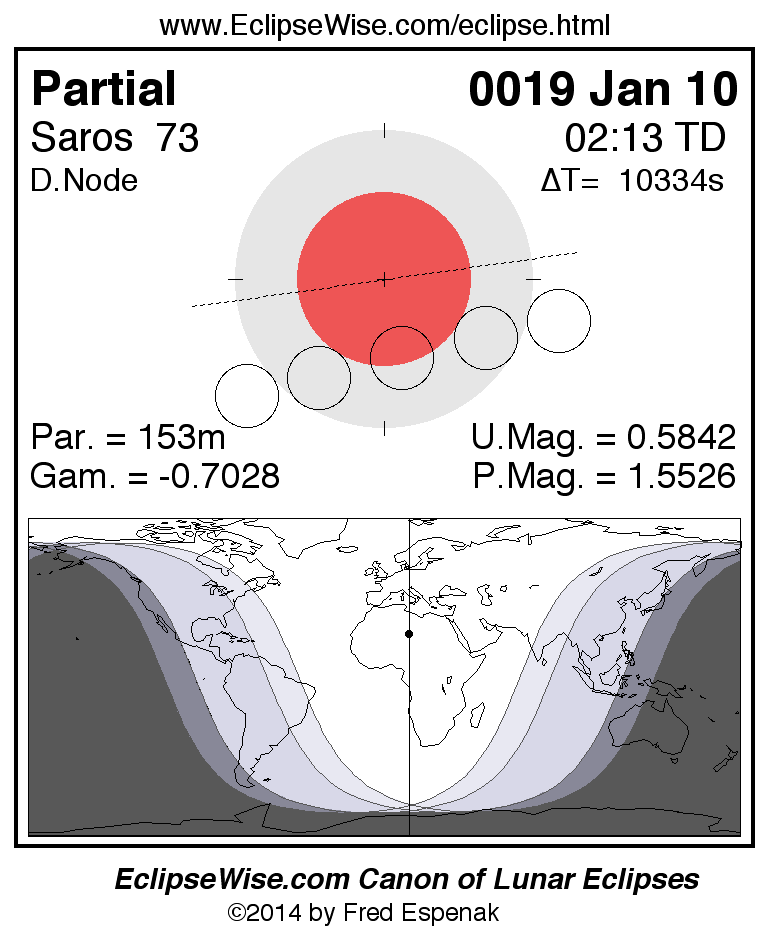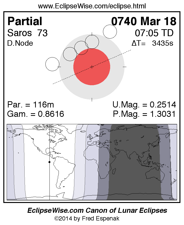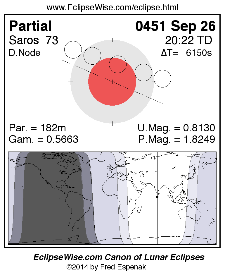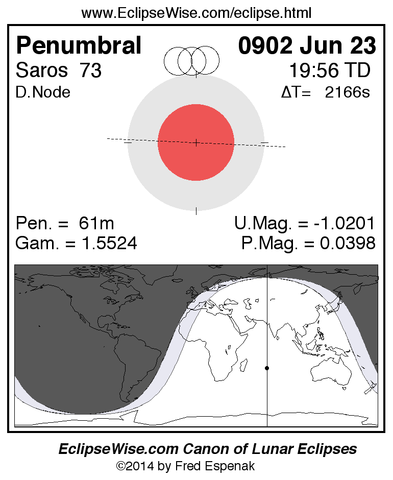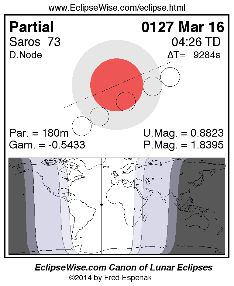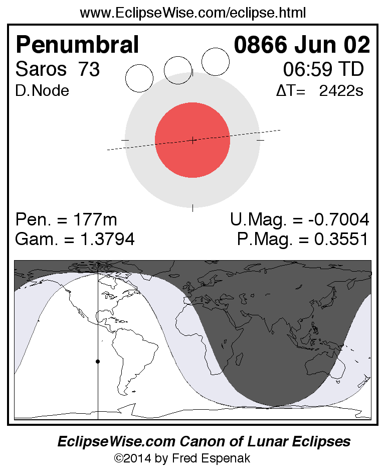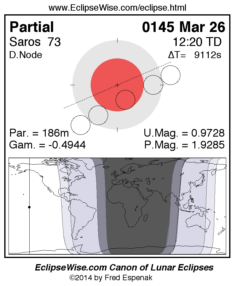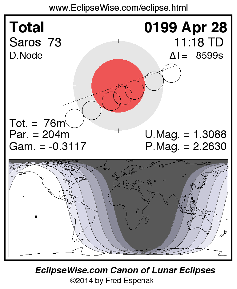 A panorama of all lunar eclipses belonging to Saros 73 is presented here. Each figure shows the Moon's path with respect to Earth's penumbral and umbral shadows. Below the path is a map depicting the geographic region of visibility for the eclipse. The date and time are given for the instant of Greatest Eclipse. Every figure serves as a hyperlink to the EclipseWise Prime page for that eclipse with a larger figure and complete details for the eclipse. Visit the Key to Lunar Eclipse Figures for a detailed explanation of these diagrams. Near the bottom of this page are a series of hyperlinks for more on lunar eclipses.