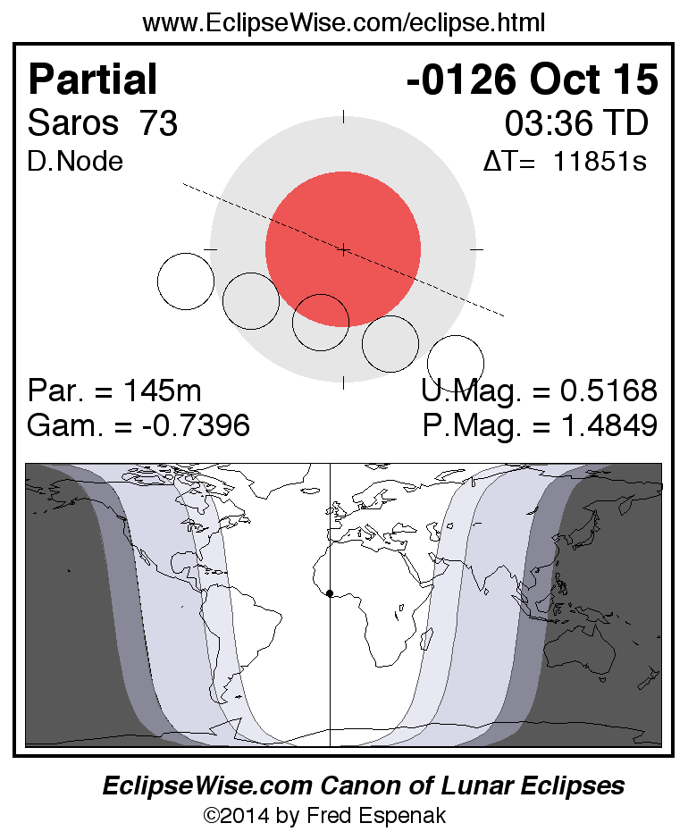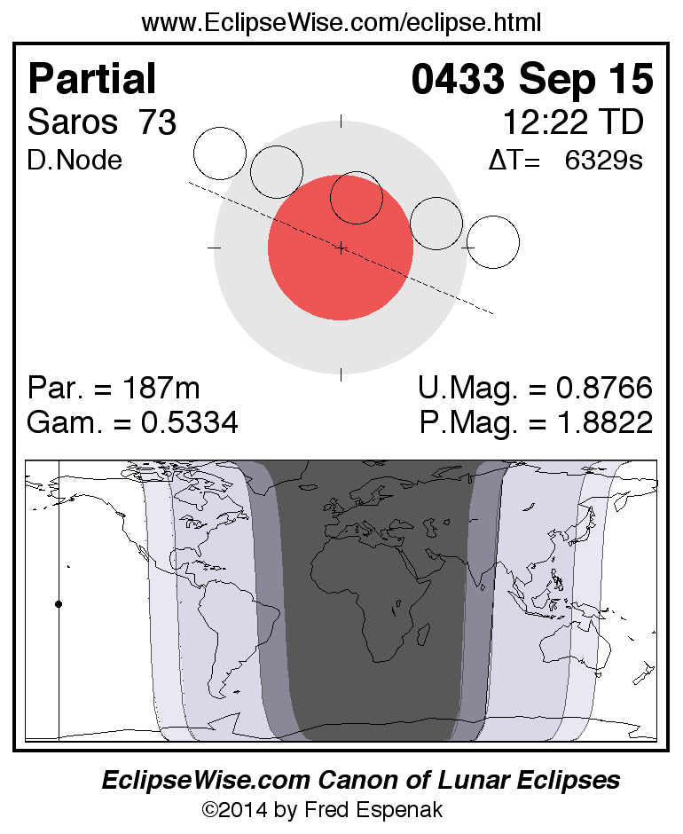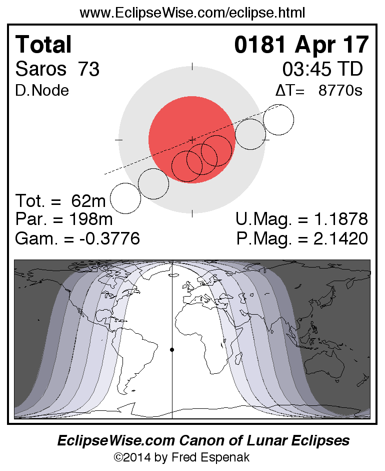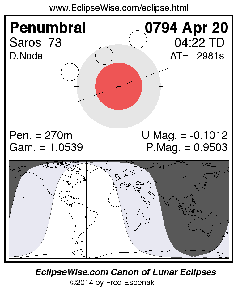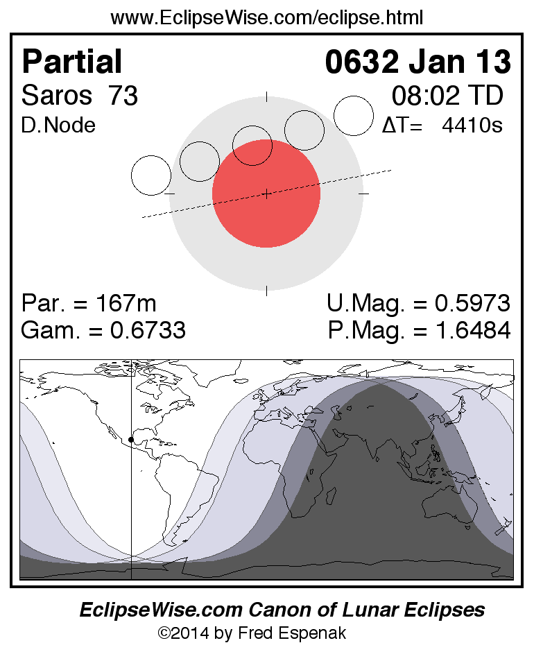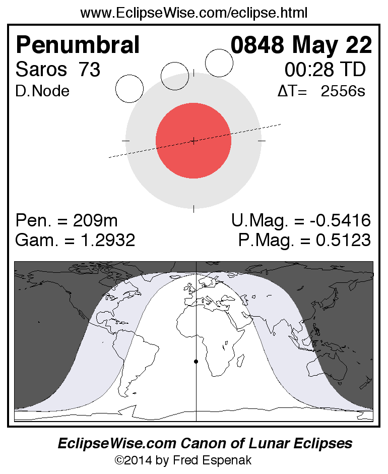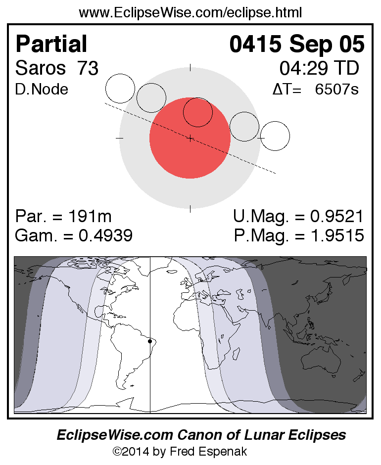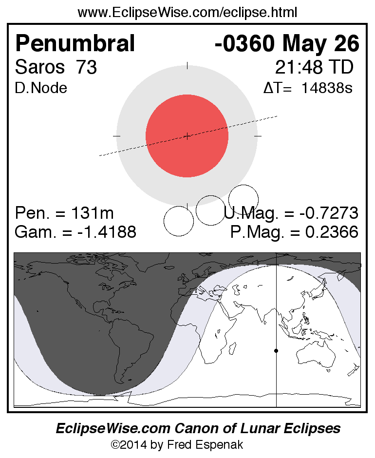 A panorama of all lunar eclipses belonging to Saros 73 is presented here. Each figure shows the Moon's path with respect to Earth's penumbral and umbral shadows. Below the path is a map depicting the geographic region of visibility for the eclipse. The date and time are given for the instant of Greatest Eclipse. Every figure serves as a hyperlink to the EclipseWise Prime page for that eclipse with a larger figure and complete details for the eclipse. Visit the Key to Lunar Eclipse Figures for a detailed explanation of these diagrams. Near the bottom of this page are a series of hyperlinks for more on lunar eclipses.
