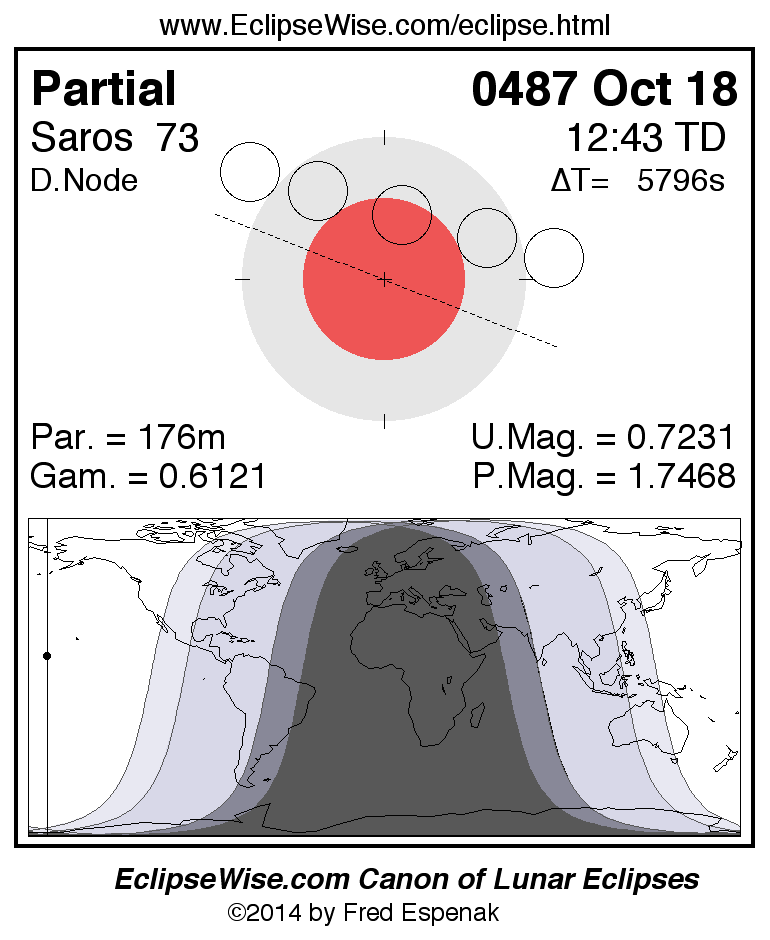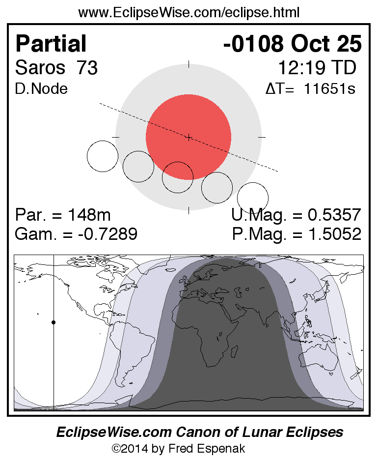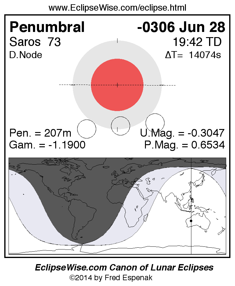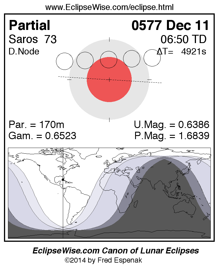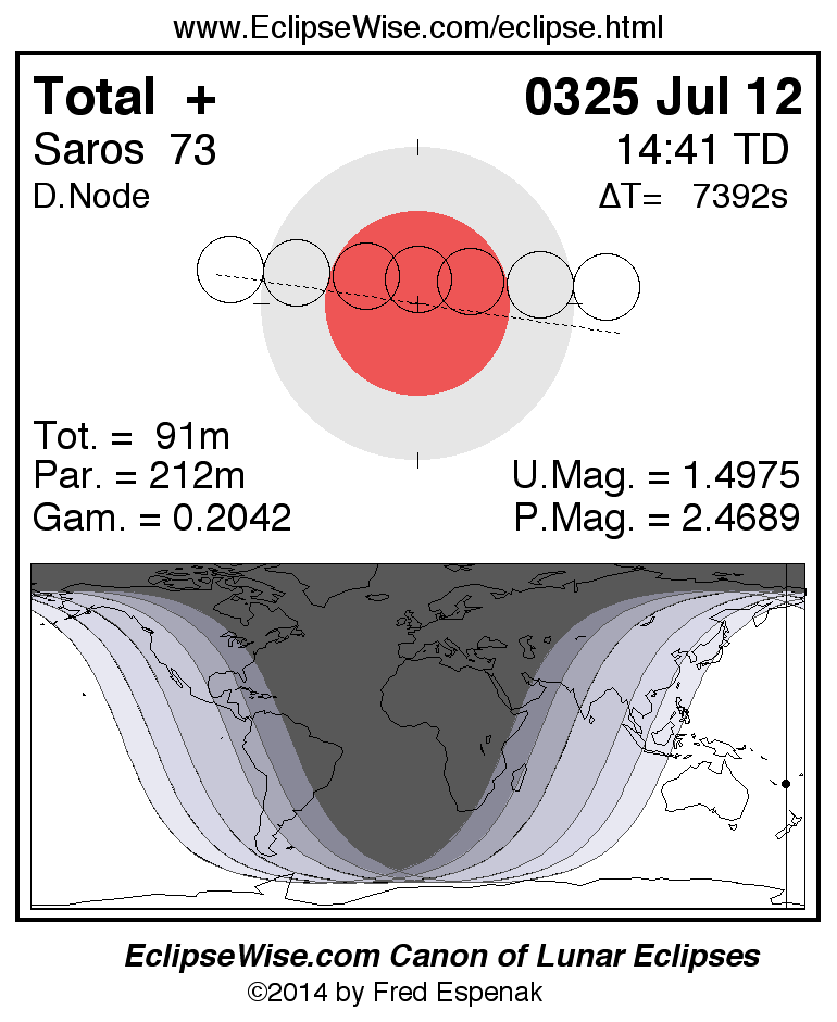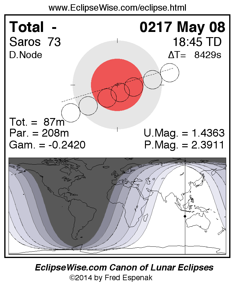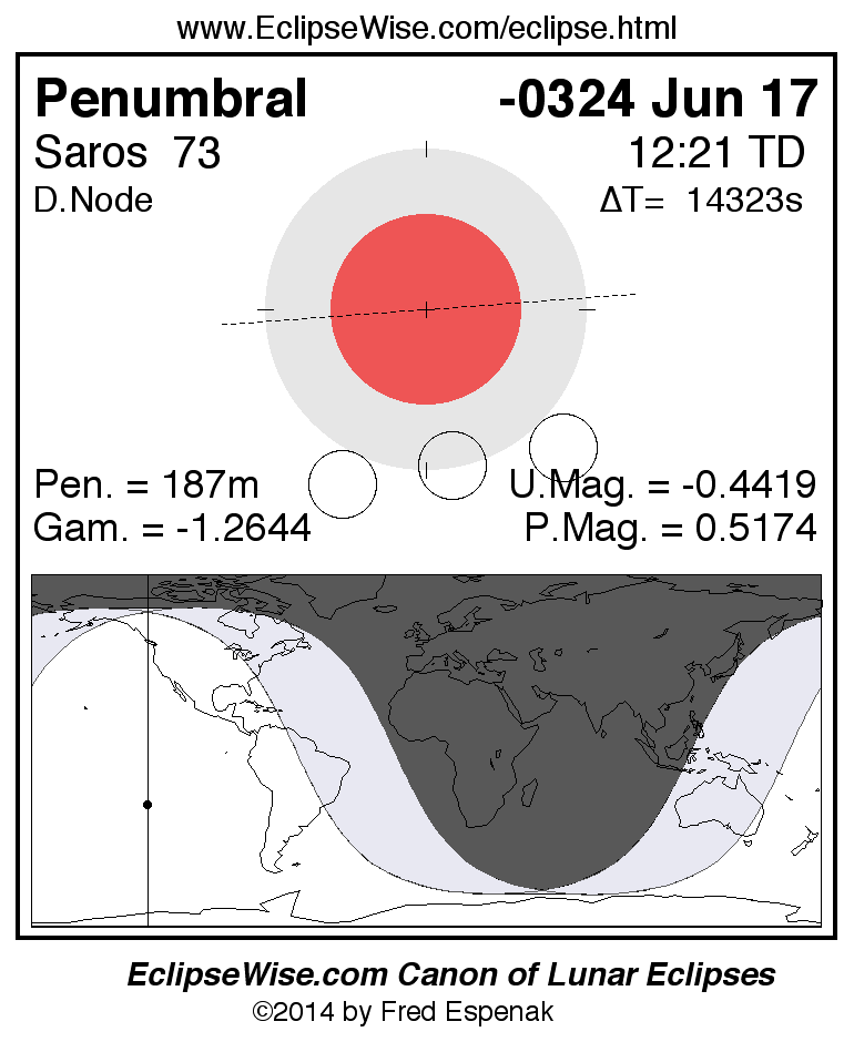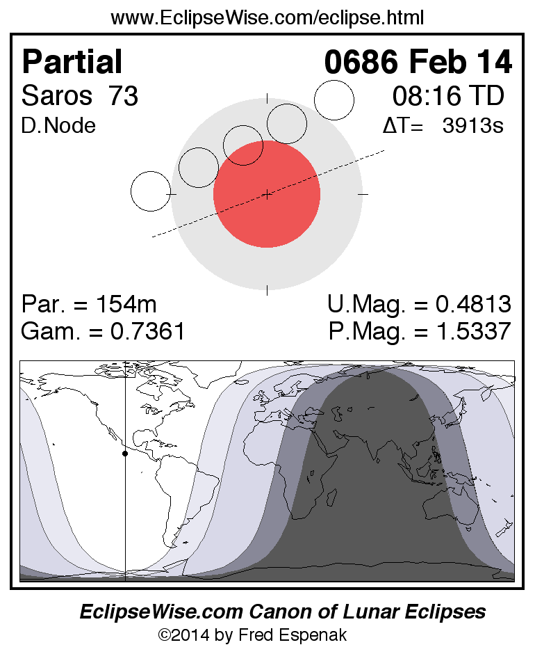 A panorama of all lunar eclipses belonging to Saros 73 is presented here. Each figure shows the Moon's path with respect to Earth's penumbral and umbral shadows. Below the path is a map depicting the geographic region of visibility for the eclipse. The date and time are given for the instant of Greatest Eclipse. Every figure serves as a hyperlink to the EclipseWise Prime page for that eclipse with a larger figure and complete details for the eclipse. Visit the Key to Lunar Eclipse Figures for a detailed explanation of these diagrams. Near the bottom of this page are a series of hyperlinks for more on lunar eclipses.