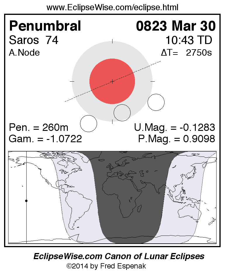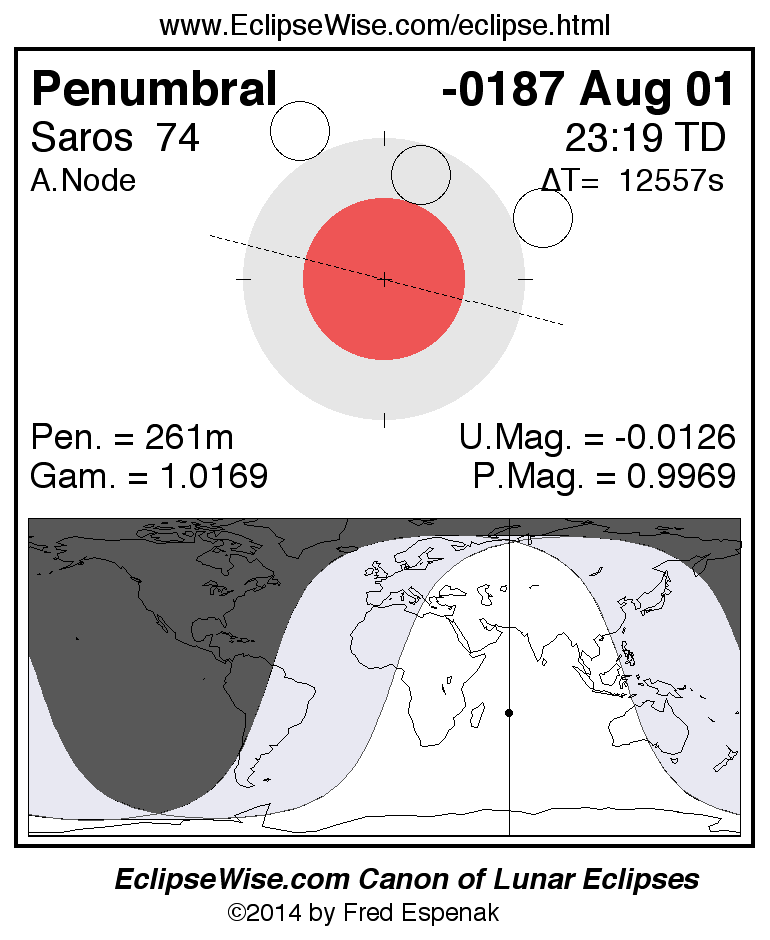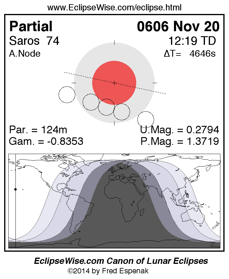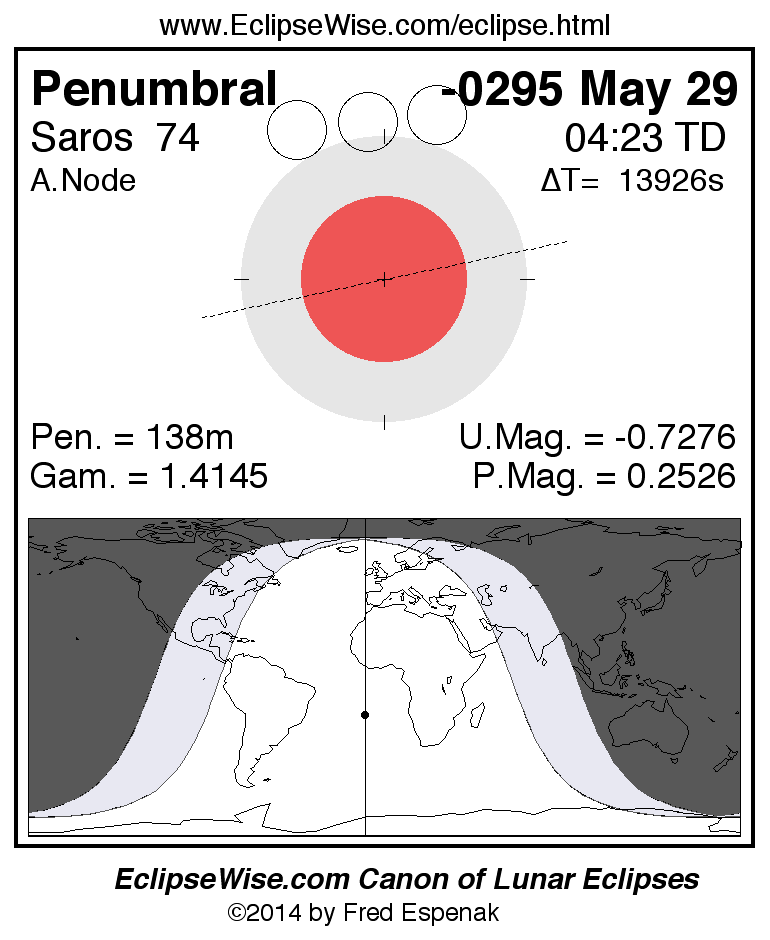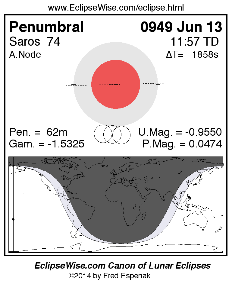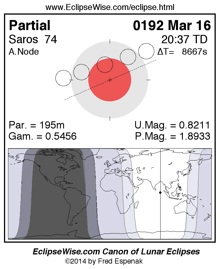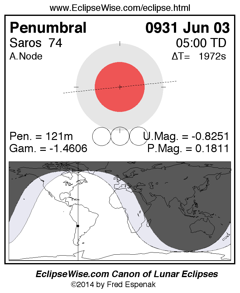 A panorama of all lunar eclipses belonging to Saros 74 is presented here. Each figure shows the Moon's path with respect to Earth's penumbral and umbral shadows. Below the path is a map depicting the geographic region of visibility for the eclipse. The date and time are given for the instant of Greatest Eclipse. Every figure serves as a hyperlink to the EclipseWise Prime page for that eclipse with a larger figure and complete details for the eclipse. Visit the Key to Lunar Eclipse Figures for a detailed explanation of these diagrams. Near the bottom of this page are a series of hyperlinks for more on lunar eclipses.