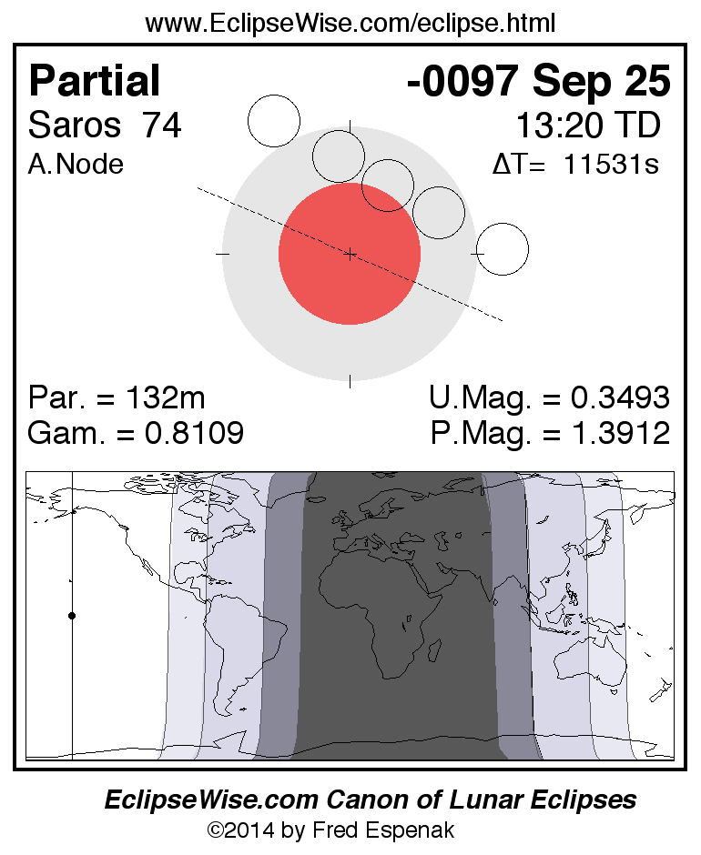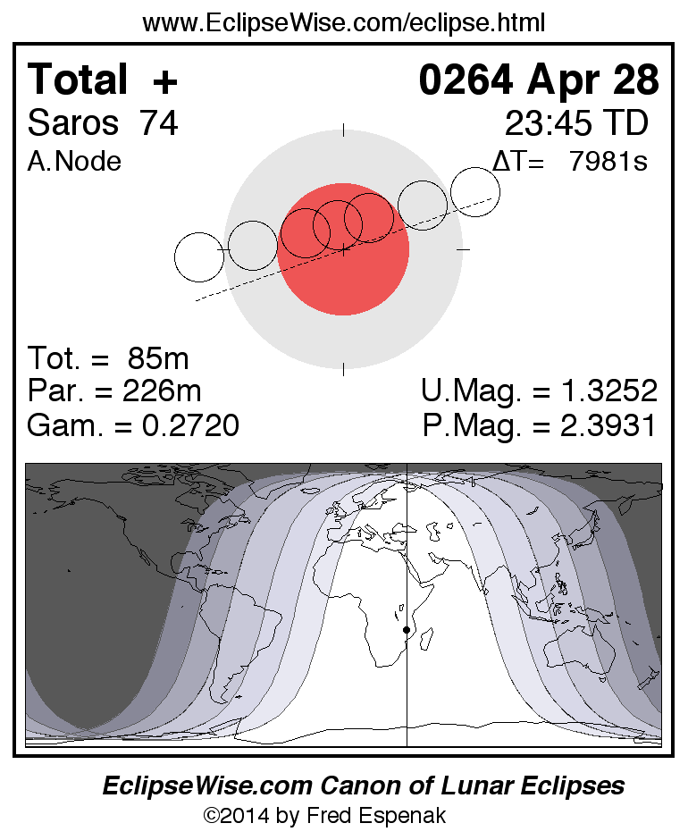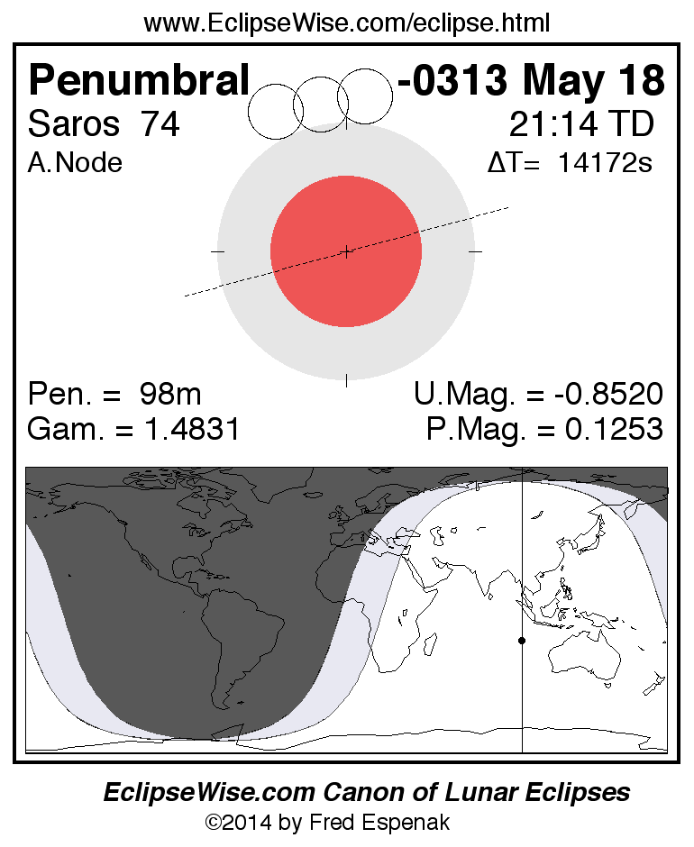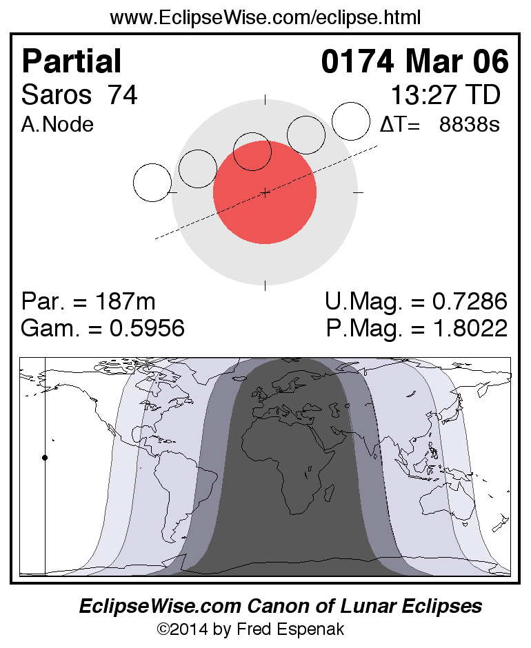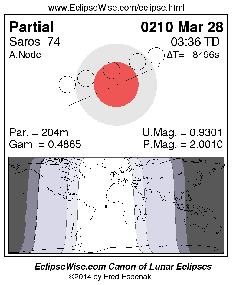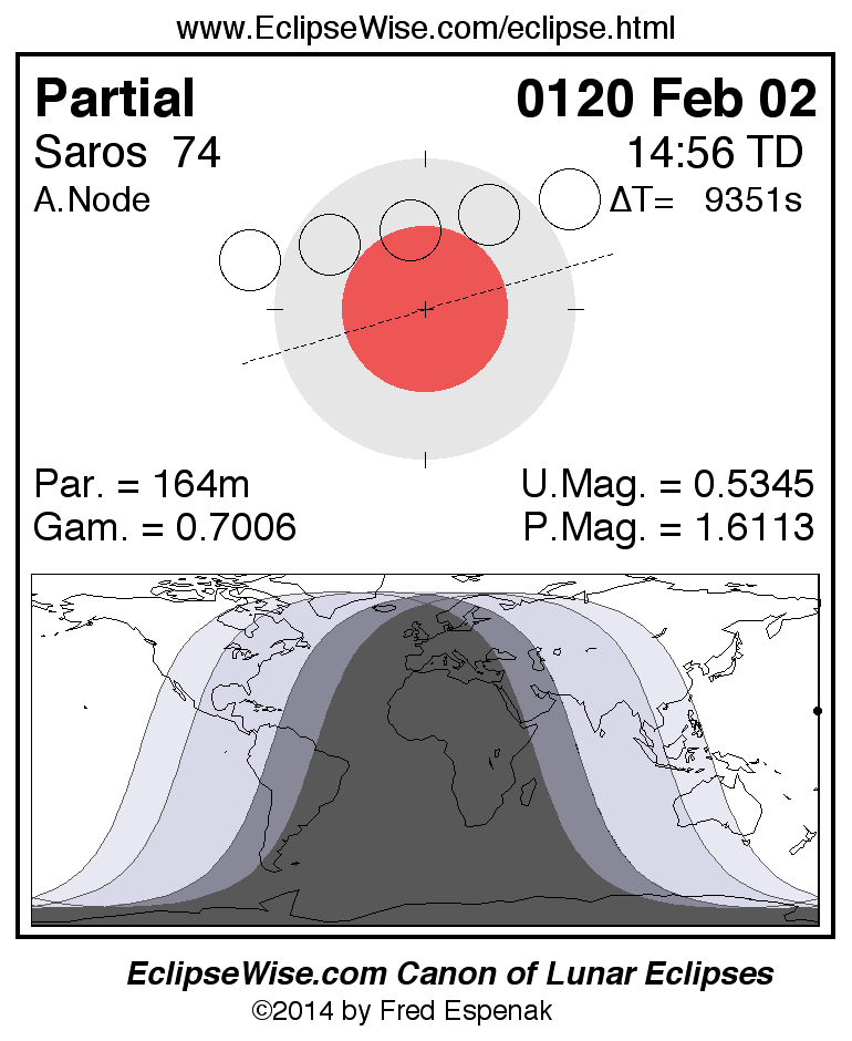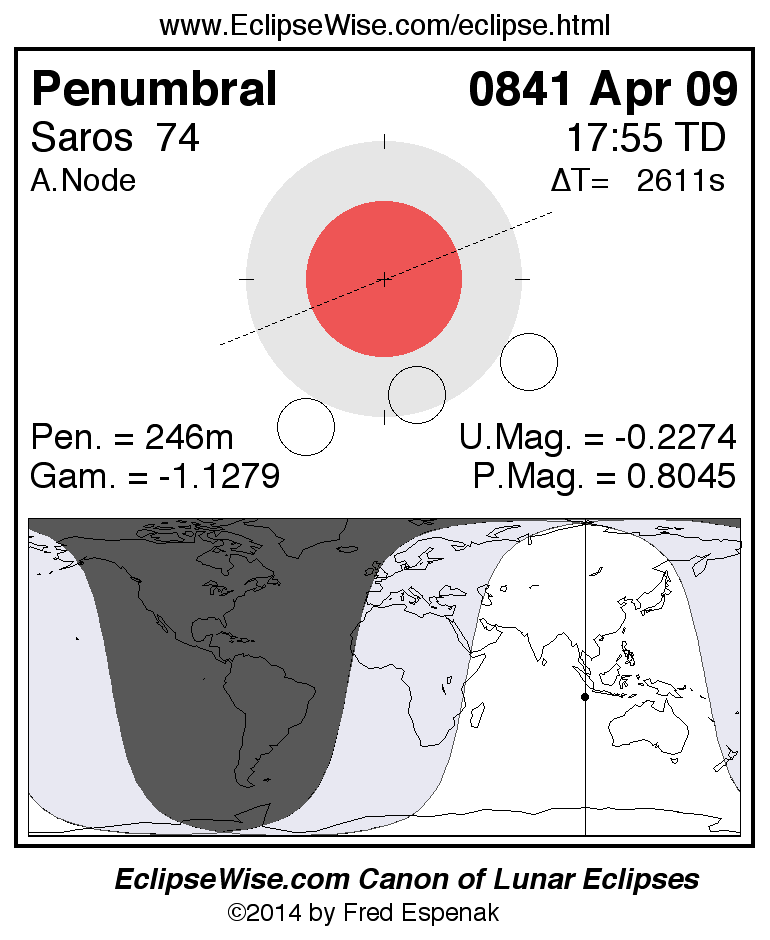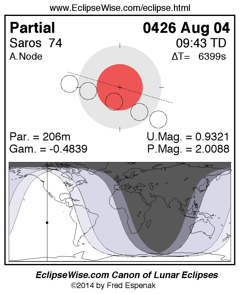 A panorama of all lunar eclipses belonging to Saros 74 is presented here. Each figure shows the Moon's path with respect to Earth's penumbral and umbral shadows. Below the path is a map depicting the geographic region of visibility for the eclipse. The date and time are given for the instant of Greatest Eclipse. Every figure serves as a hyperlink to the EclipseWise Prime page for that eclipse with a larger figure and complete details for the eclipse. Visit the Key to Lunar Eclipse Figures for a detailed explanation of these diagrams. Near the bottom of this page are a series of hyperlinks for more on lunar eclipses.