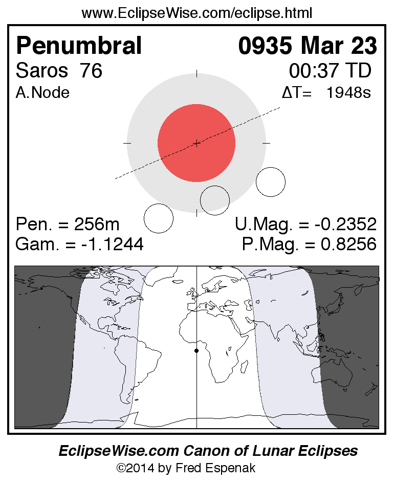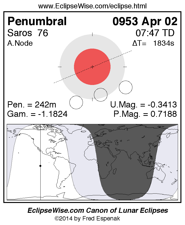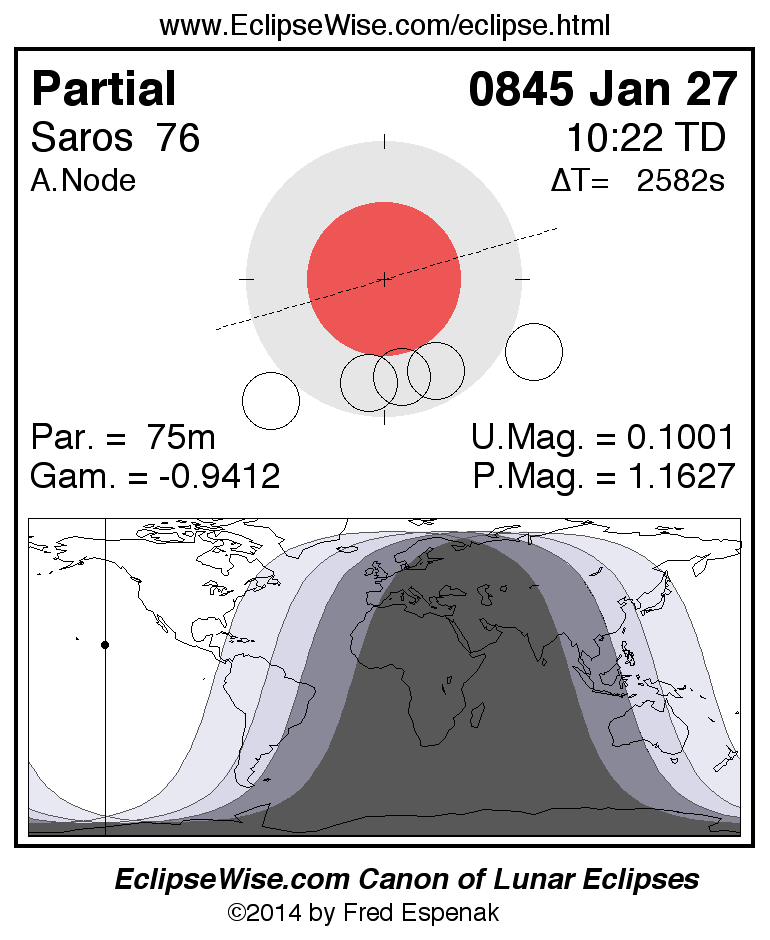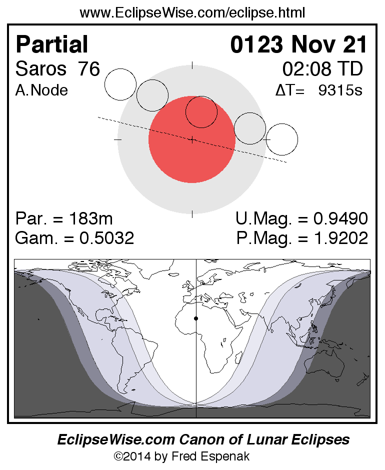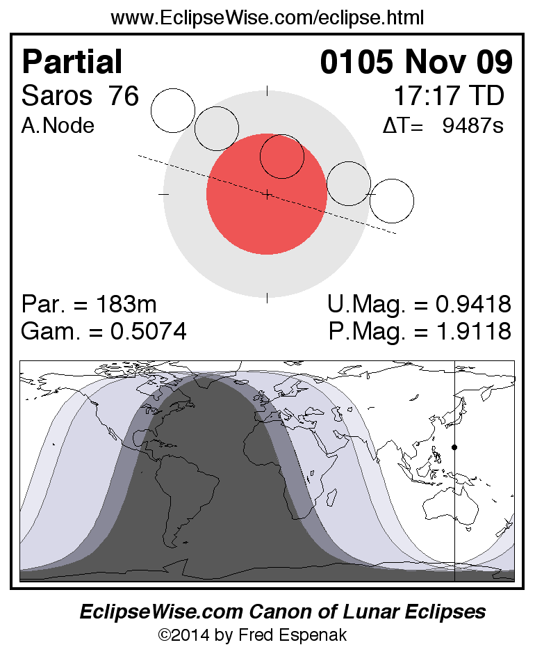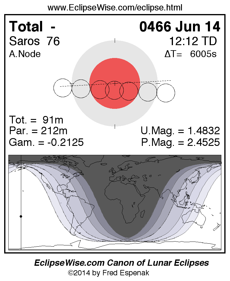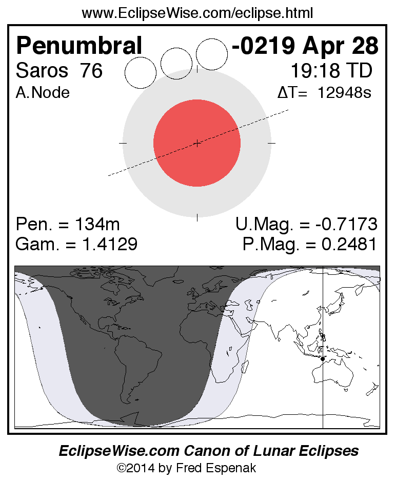A panorama of all lunar eclipses belonging to Saros 76 is presented here. Each figure shows the Moon's path with respect to Earth's penumbral and umbral shadows. Below the path is a map depicting the geographic region of visibility for the eclipse. The date and time are given for the instant of Greatest Eclipse. Every figure serves as a hyperlink to the EclipseWise Prime page for that eclipse with a larger figure and complete details for the eclipse. Visit the Key to Lunar Eclipse Figures for a detailed explanation of these diagrams. Near the bottom of this page are a series of hyperlinks for more on lunar eclipses.