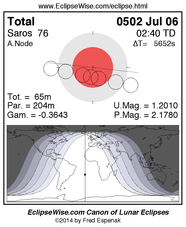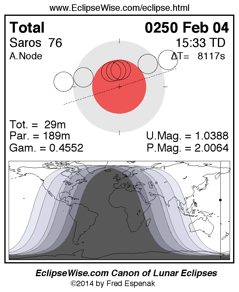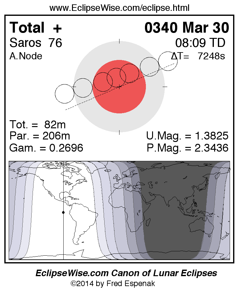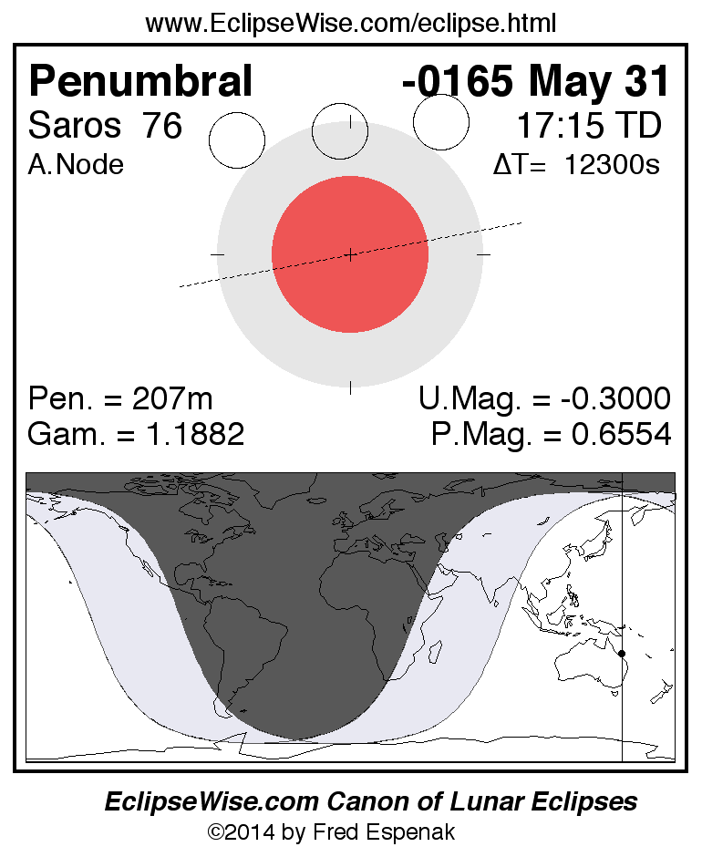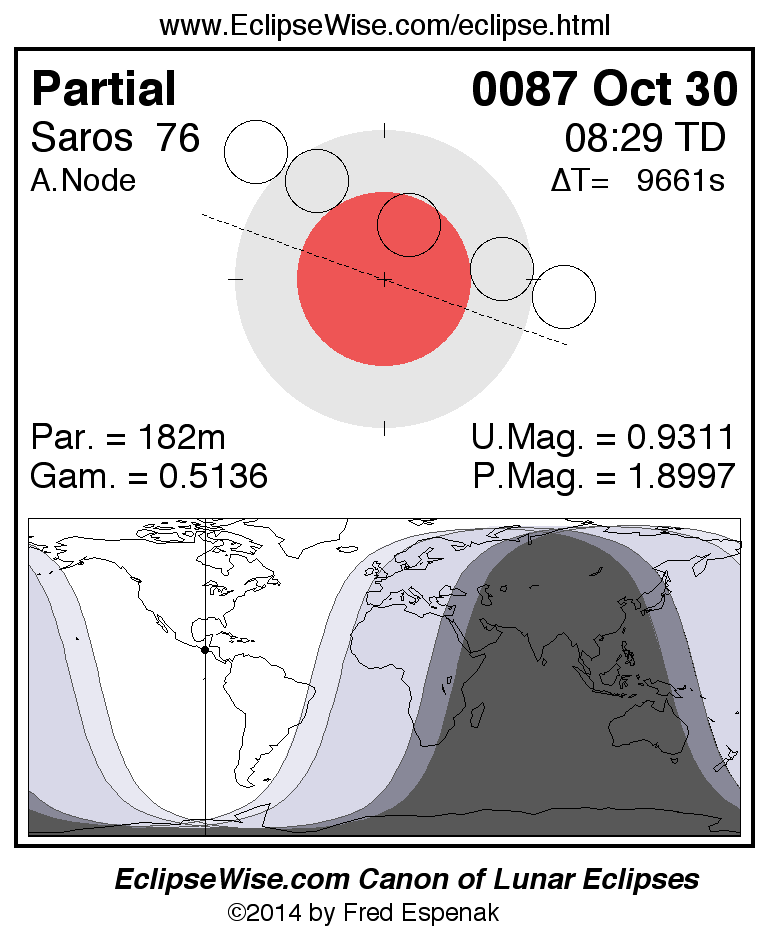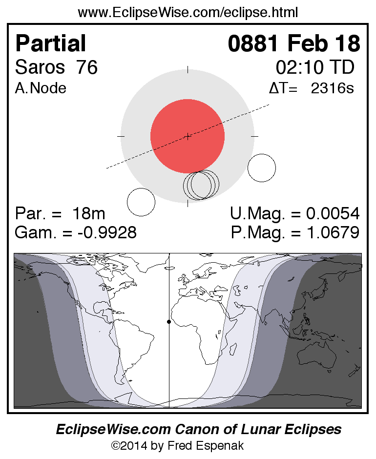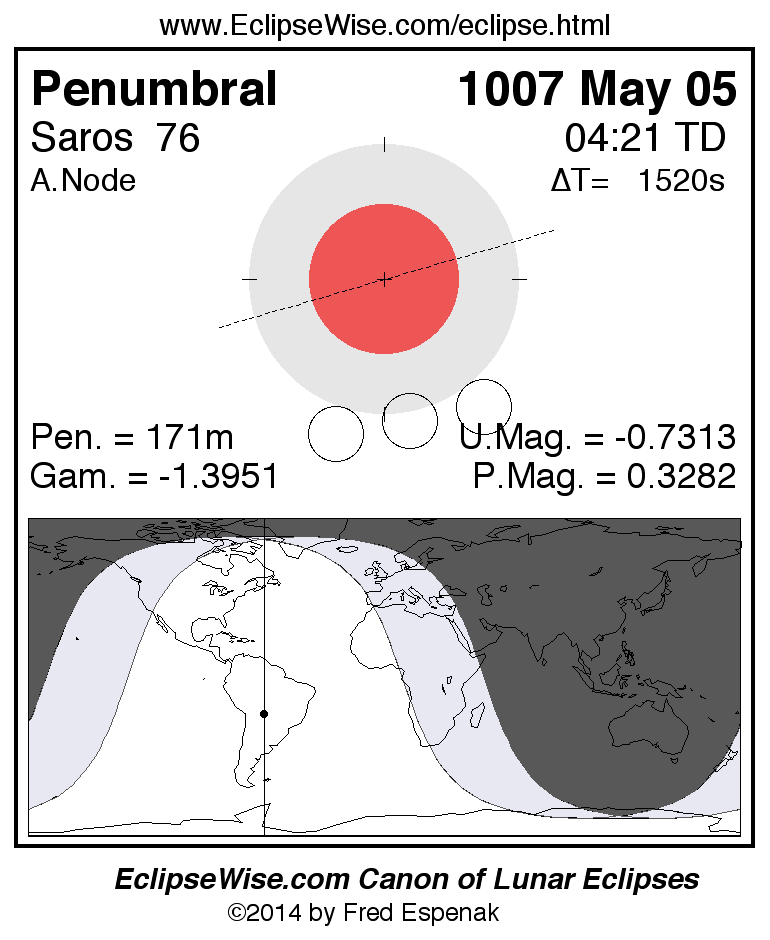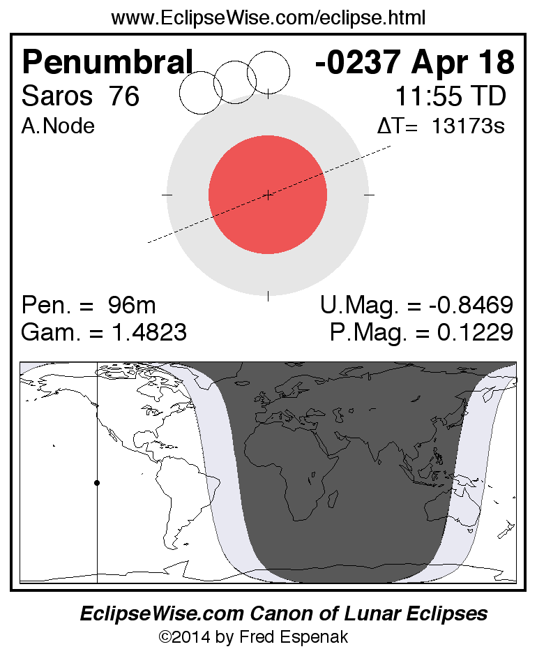 A panorama of all lunar eclipses belonging to Saros 76 is presented here. Each figure shows the Moon's path with respect to Earth's penumbral and umbral shadows. Below the path is a map depicting the geographic region of visibility for the eclipse. The date and time are given for the instant of Greatest Eclipse. Every figure serves as a hyperlink to the EclipseWise Prime page for that eclipse with a larger figure and complete details for the eclipse. Visit the Key to Lunar Eclipse Figures for a detailed explanation of these diagrams. Near the bottom of this page are a series of hyperlinks for more on lunar eclipses.