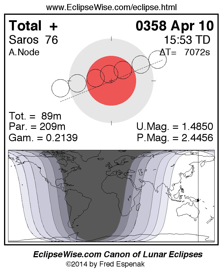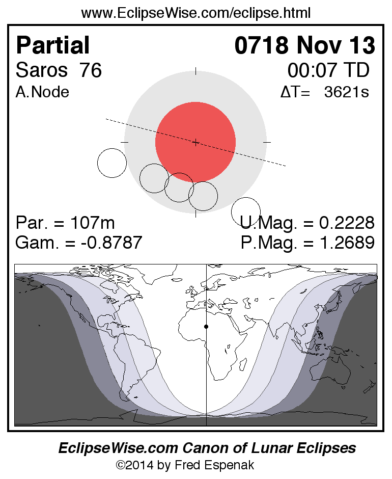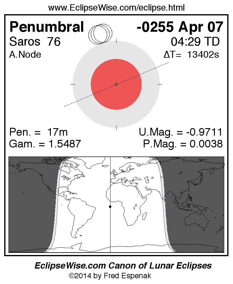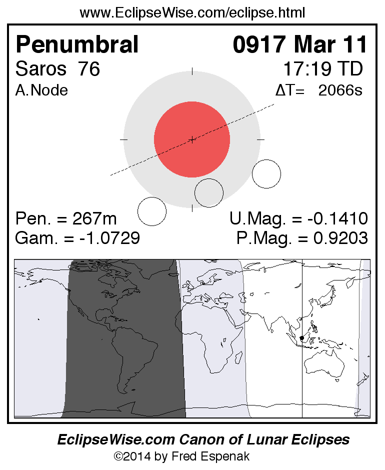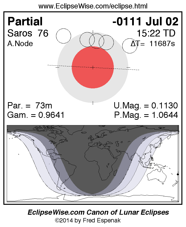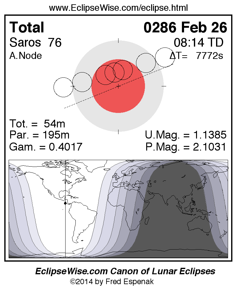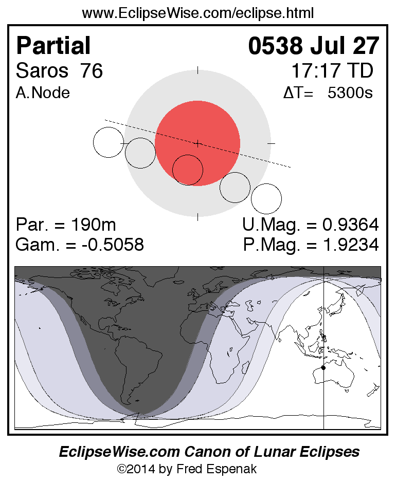 A panorama of all lunar eclipses belonging to Saros 76 is presented here. Each figure shows the Moon's path with respect to Earth's penumbral and umbral shadows. Below the path is a map depicting the geographic region of visibility for the eclipse. The date and time are given for the instant of Greatest Eclipse. Every figure serves as a hyperlink to the EclipseWise Prime page for that eclipse with a larger figure and complete details for the eclipse. Visit the Key to Lunar Eclipse Figures for a detailed explanation of these diagrams. Near the bottom of this page are a series of hyperlinks for more on lunar eclipses.
