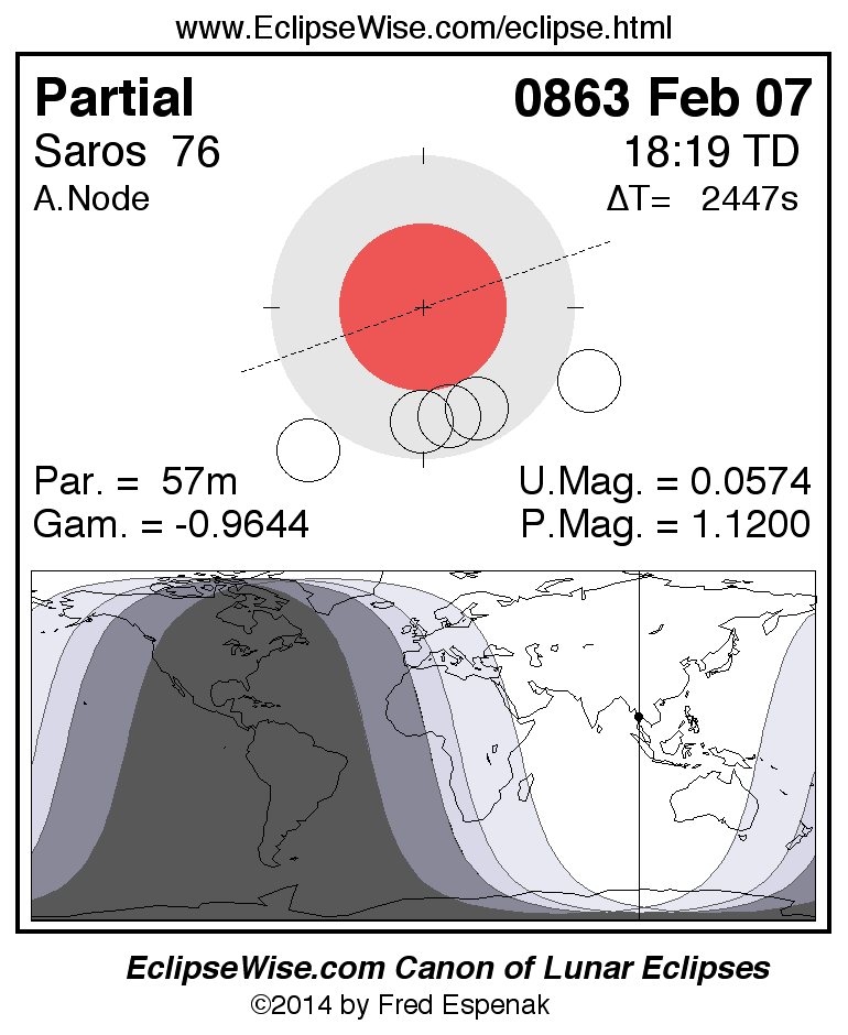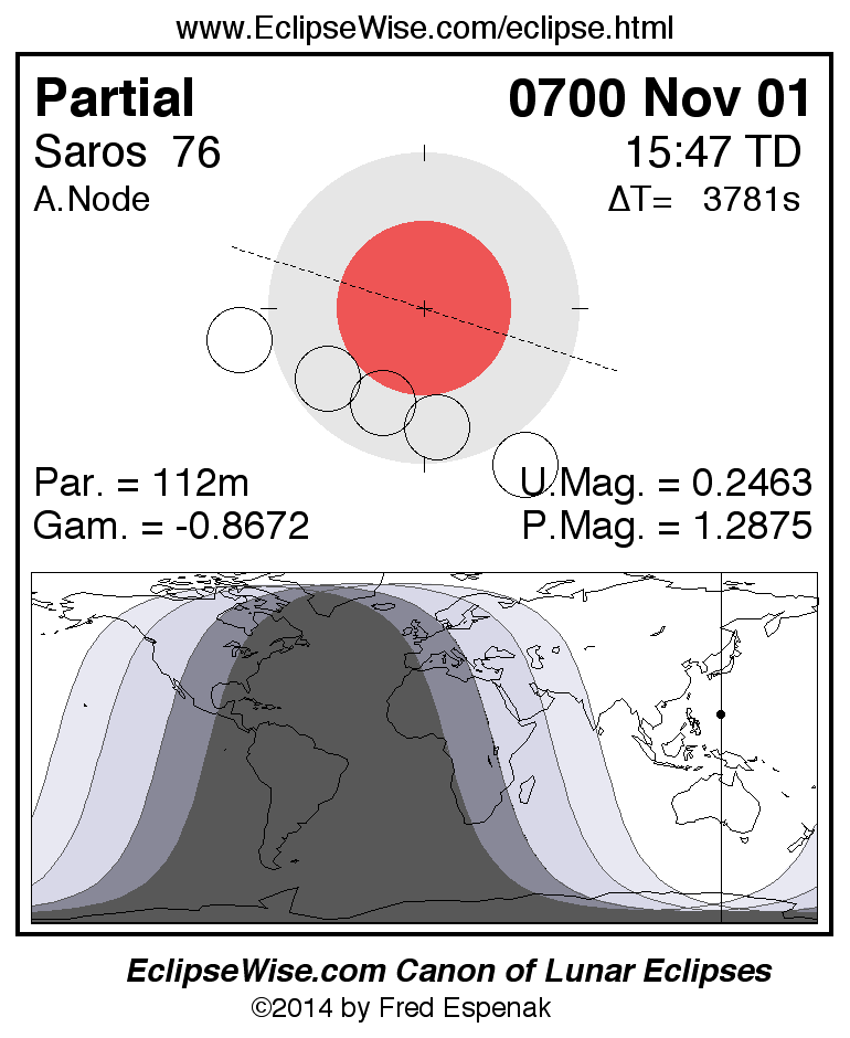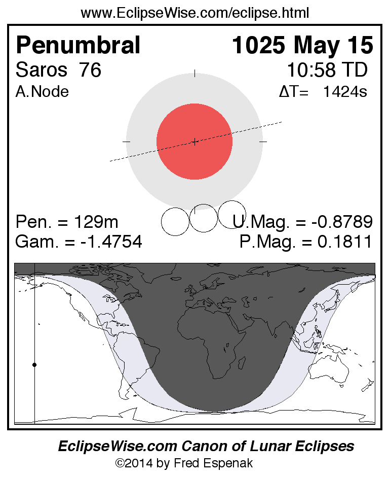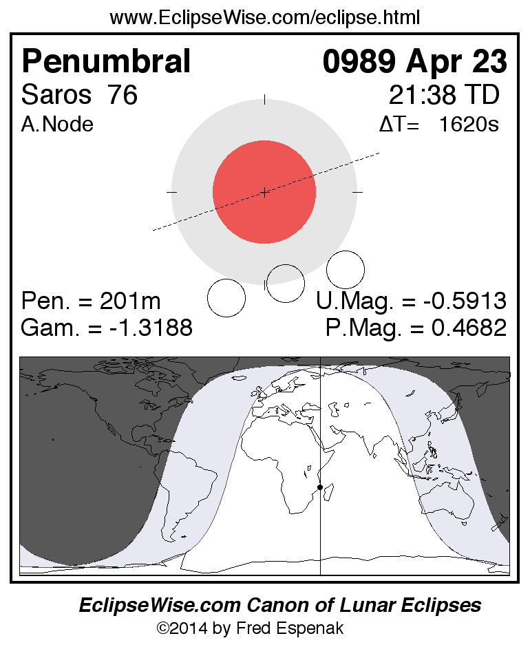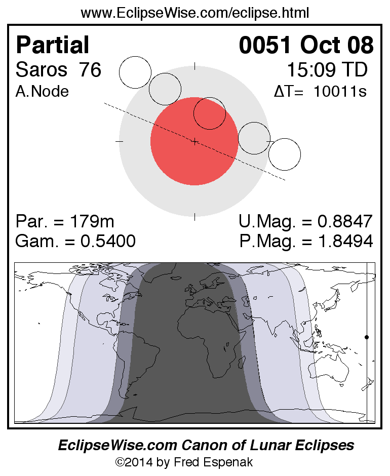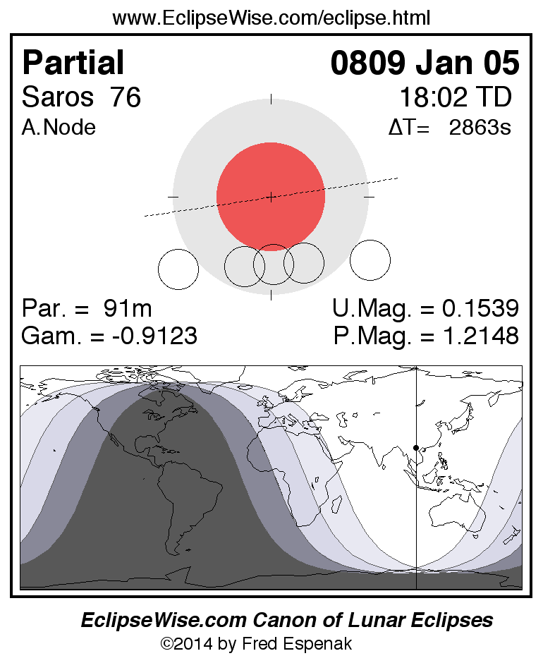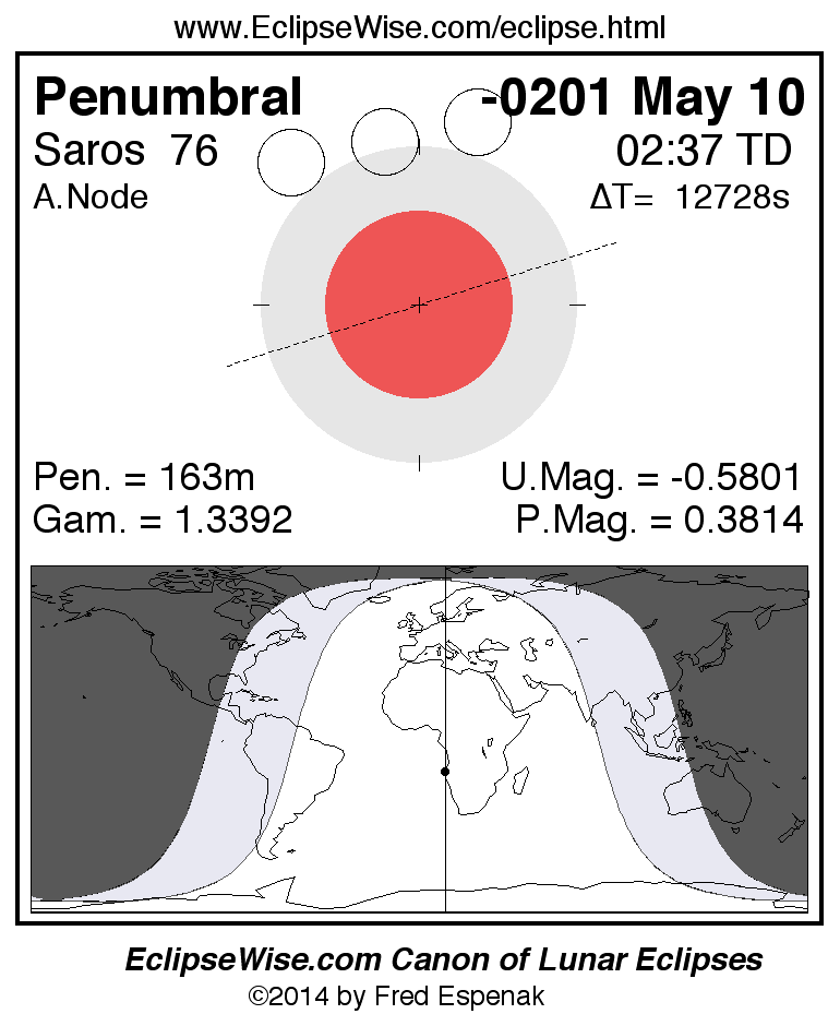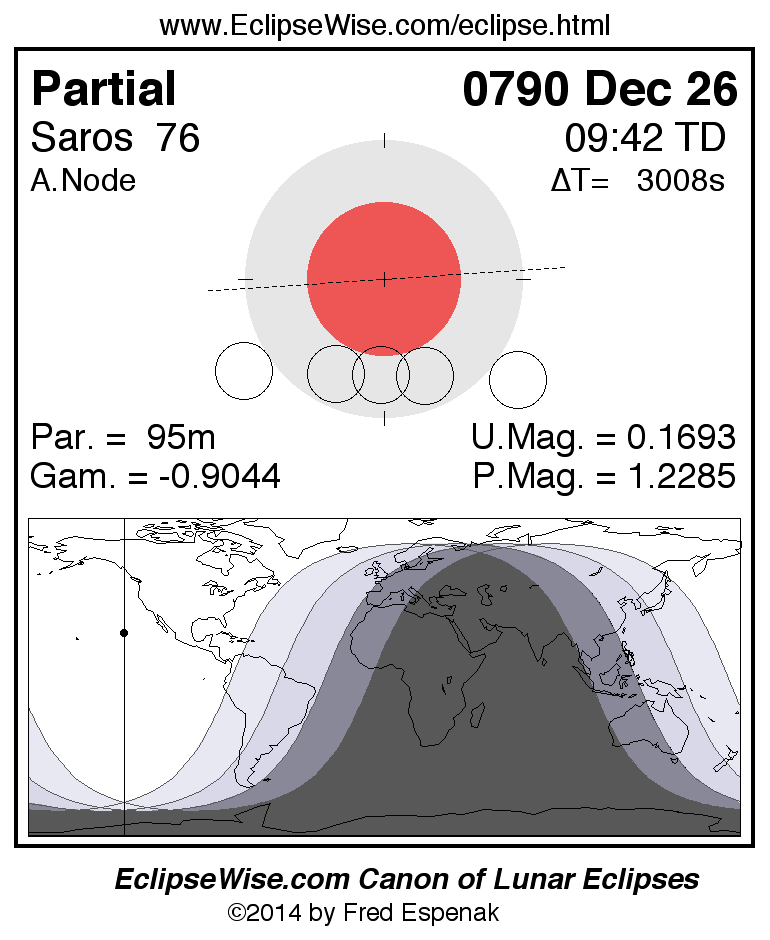 A panorama of all lunar eclipses belonging to Saros 76 is presented here. Each figure shows the Moon's path with respect to Earth's penumbral and umbral shadows. Below the path is a map depicting the geographic region of visibility for the eclipse. The date and time are given for the instant of Greatest Eclipse. Every figure serves as a hyperlink to the EclipseWise Prime page for that eclipse with a larger figure and complete details for the eclipse. Visit the Key to Lunar Eclipse Figures for a detailed explanation of these diagrams. Near the bottom of this page are a series of hyperlinks for more on lunar eclipses.