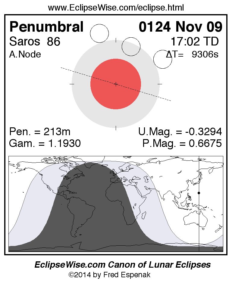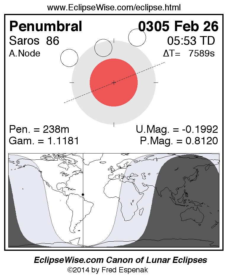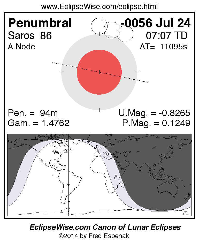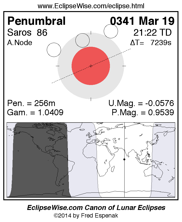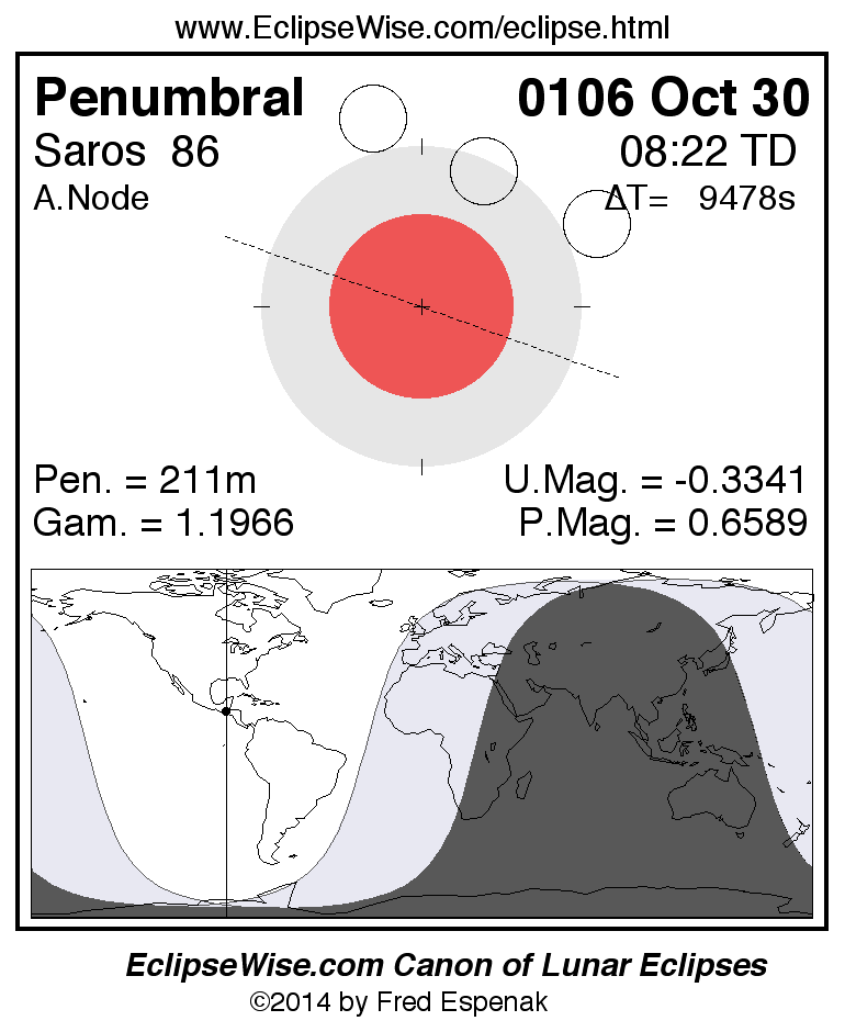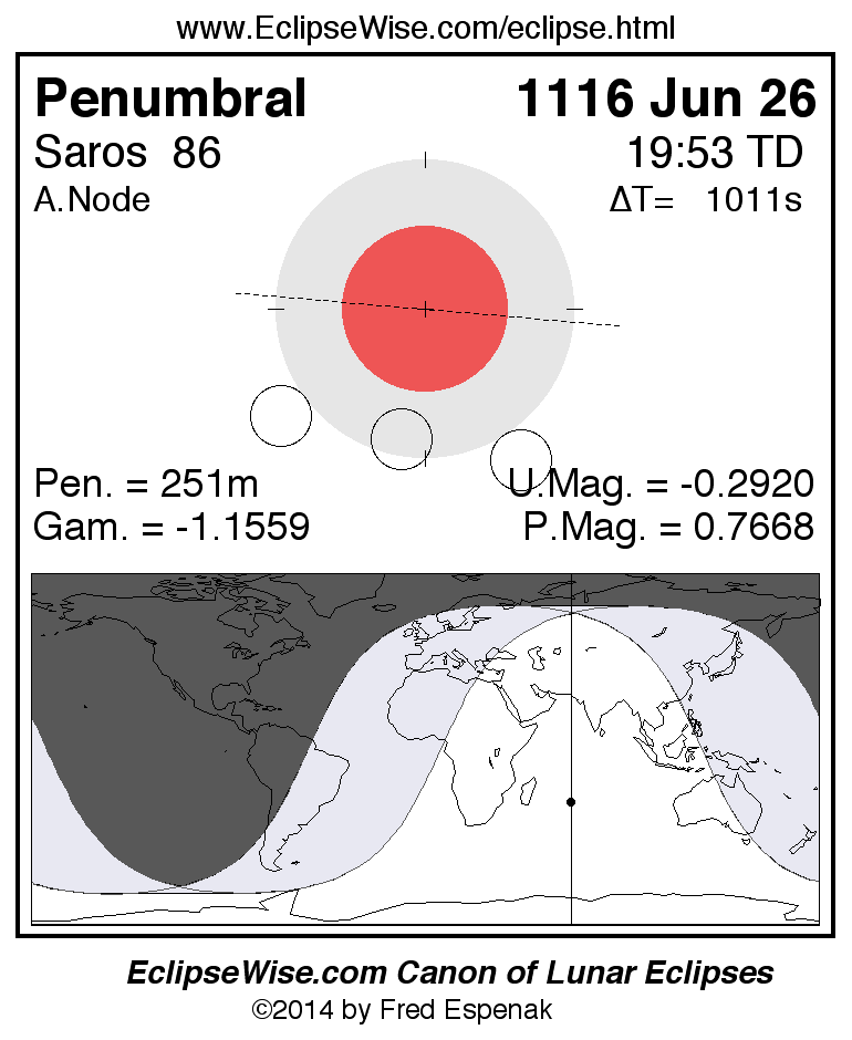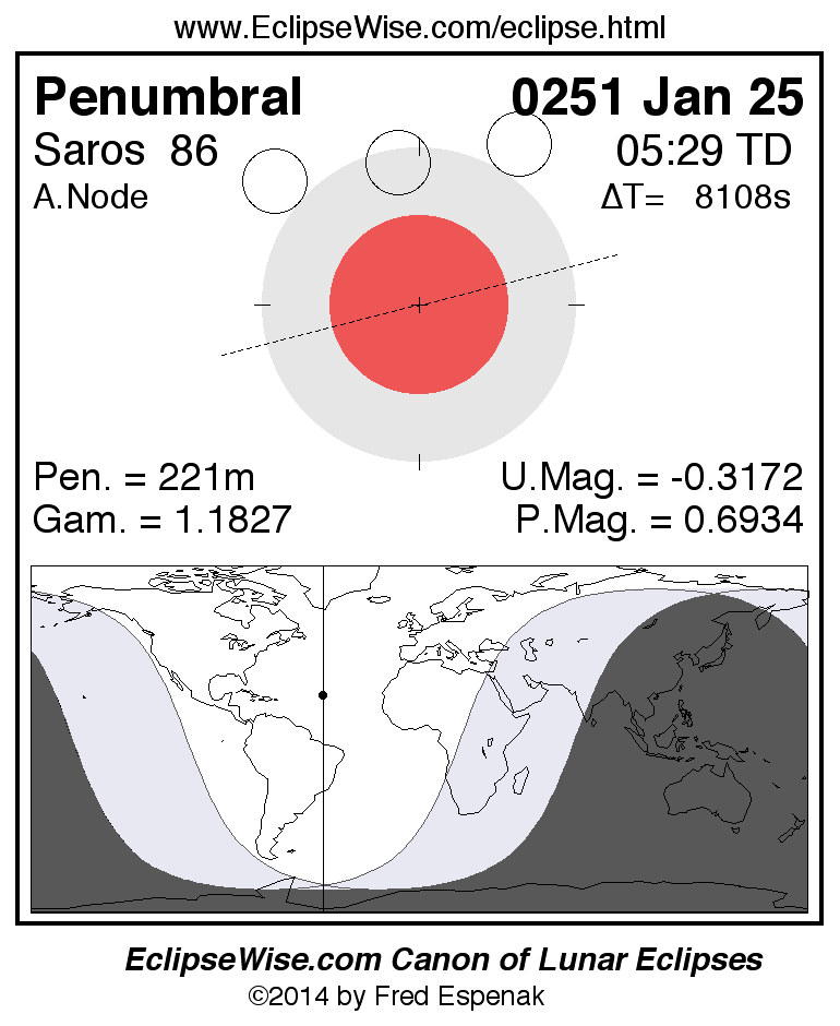 A panorama of all lunar eclipses belonging to Saros 86 is presented here. Each figure shows the Moon's path with respect to Earth's penumbral and umbral shadows. Below the path is a map depicting the geographic region of visibility for the eclipse. The date and time are given for the instant of Greatest Eclipse. Every figure serves as a hyperlink to the EclipseWise Prime page for that eclipse with a larger figure and complete details for the eclipse. Visit the Key to Lunar Eclipse Figures for a detailed explanation of these diagrams. Near the bottom of this page are a series of hyperlinks for more on lunar eclipses.