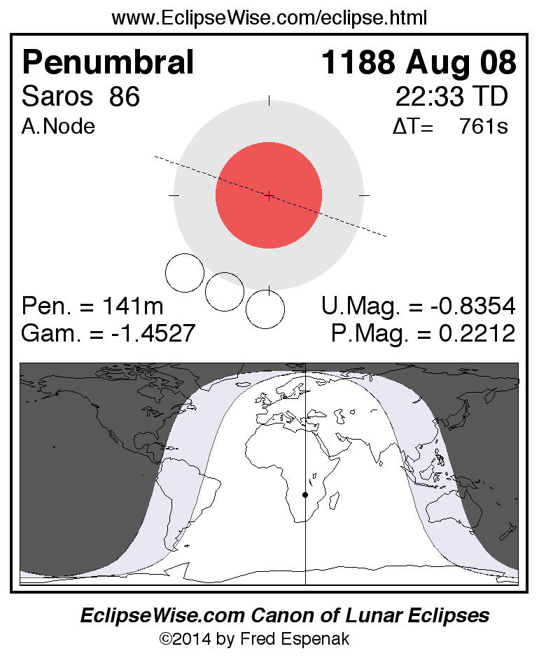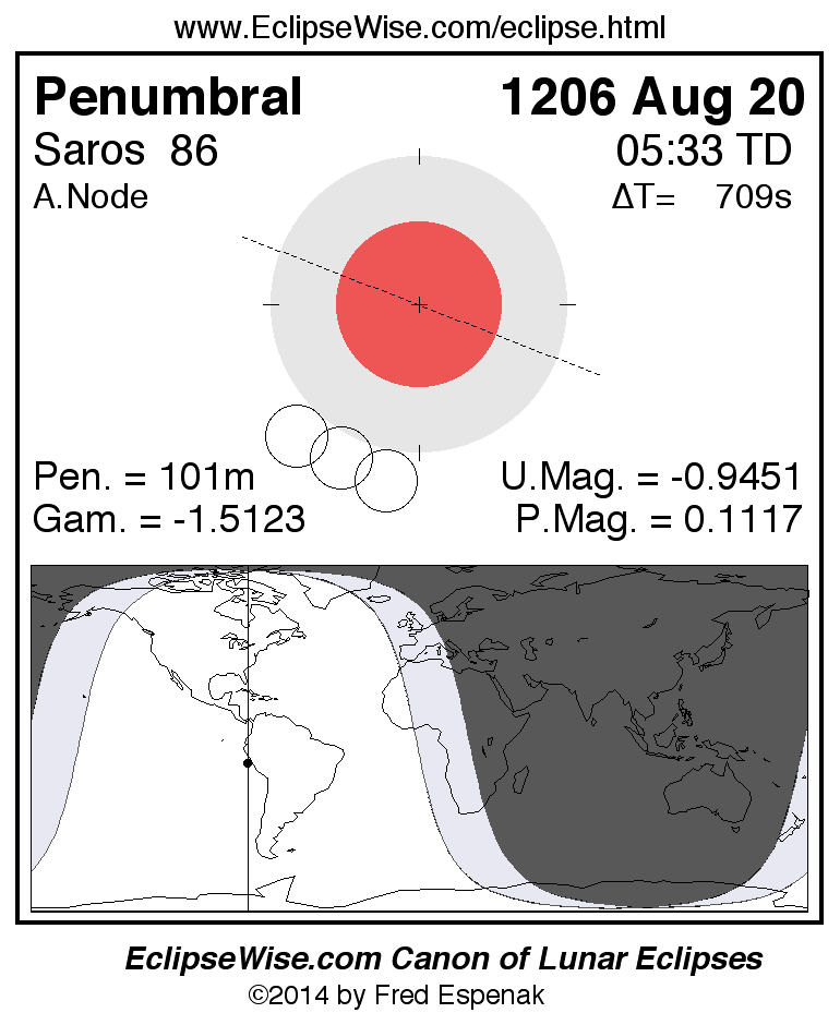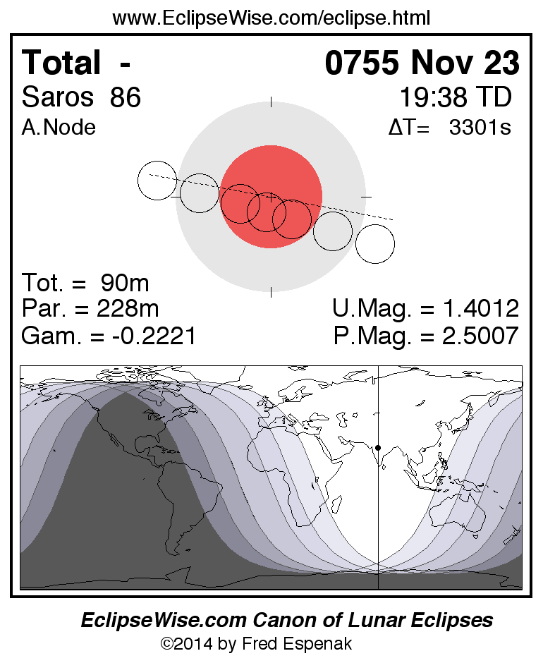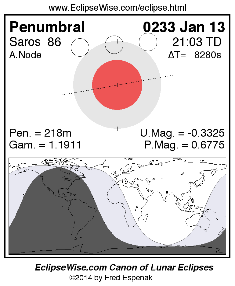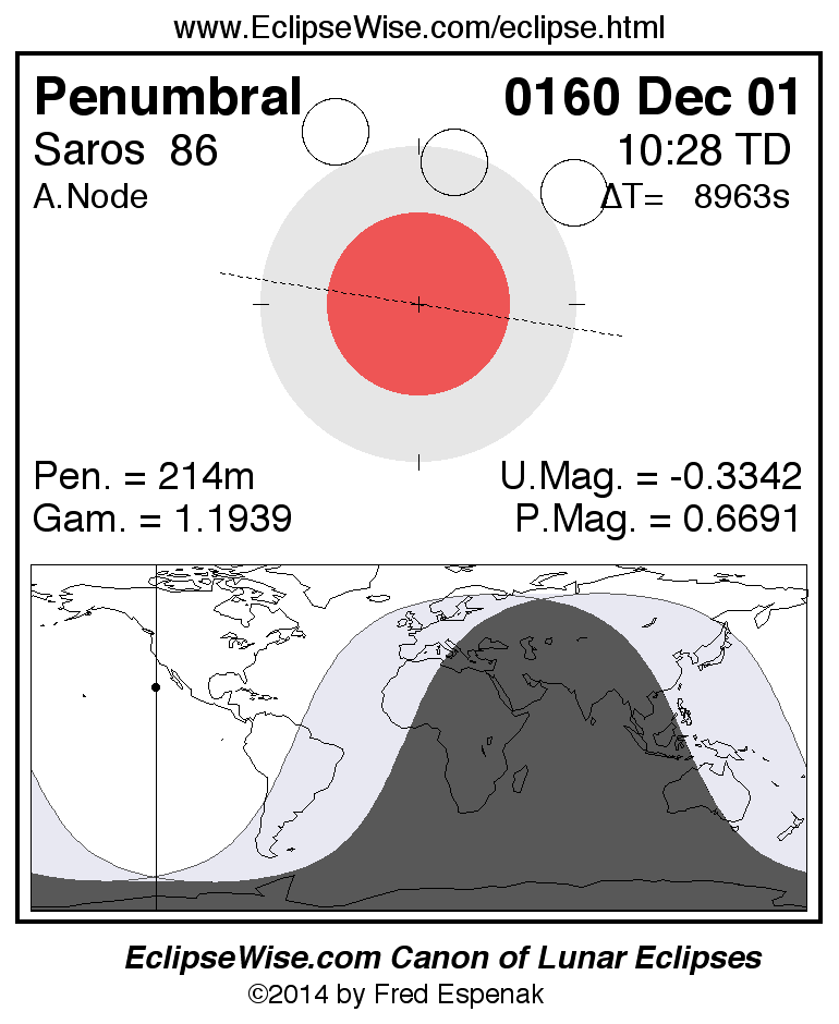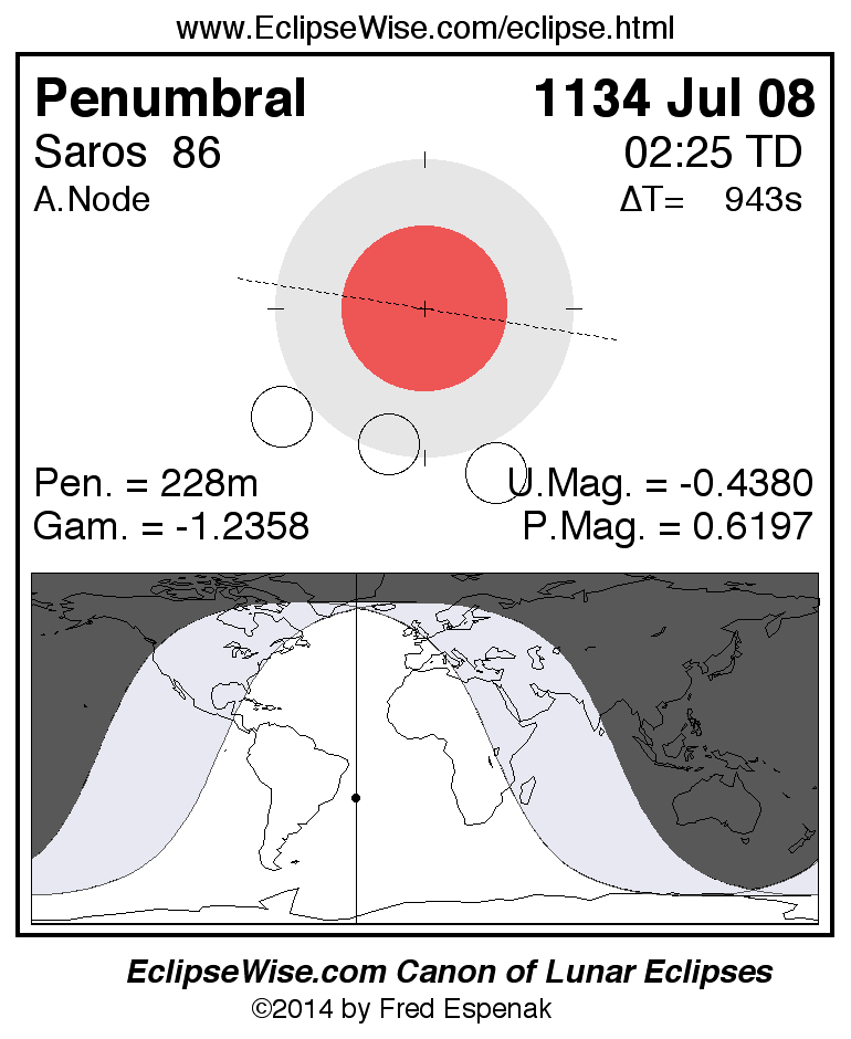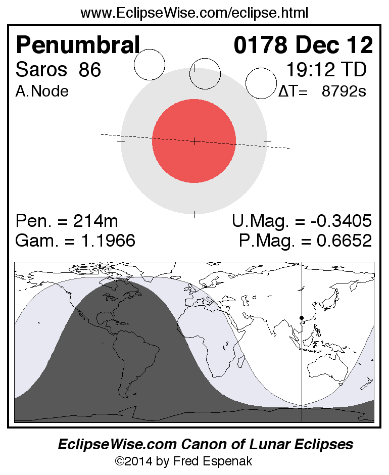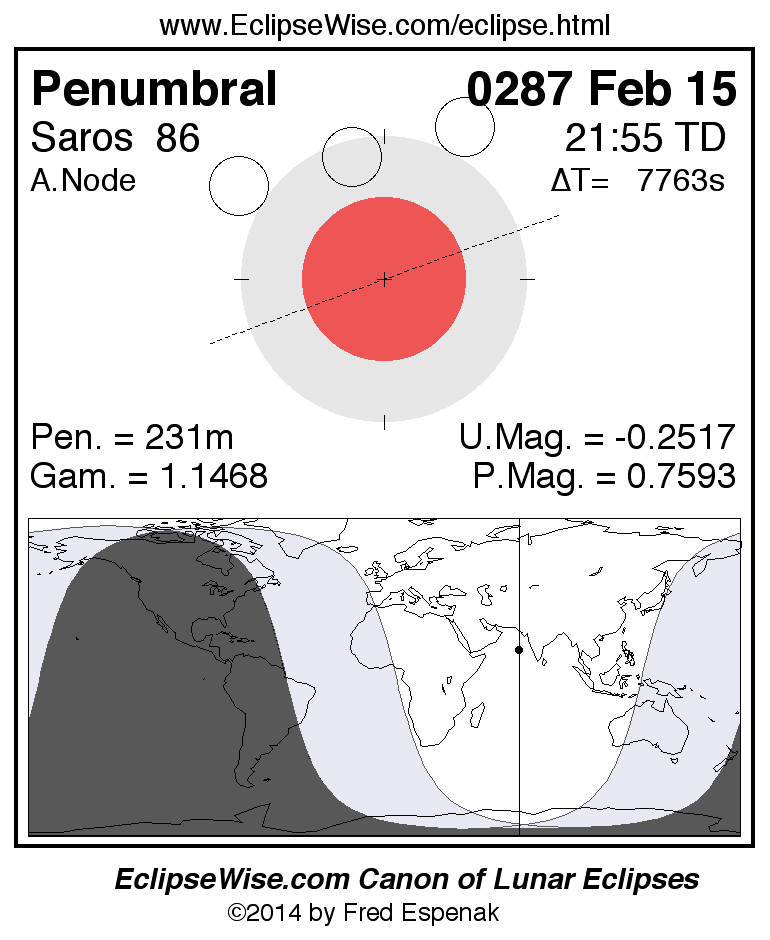 A panorama of all lunar eclipses belonging to Saros 86 is presented here. Each figure shows the Moon's path with respect to Earth's penumbral and umbral shadows. Below the path is a map depicting the geographic region of visibility for the eclipse. The date and time are given for the instant of Greatest Eclipse. Every figure serves as a hyperlink to the EclipseWise Prime page for that eclipse with a larger figure and complete details for the eclipse. Visit the Key to Lunar Eclipse Figures for a detailed explanation of these diagrams. Near the bottom of this page are a series of hyperlinks for more on lunar eclipses.