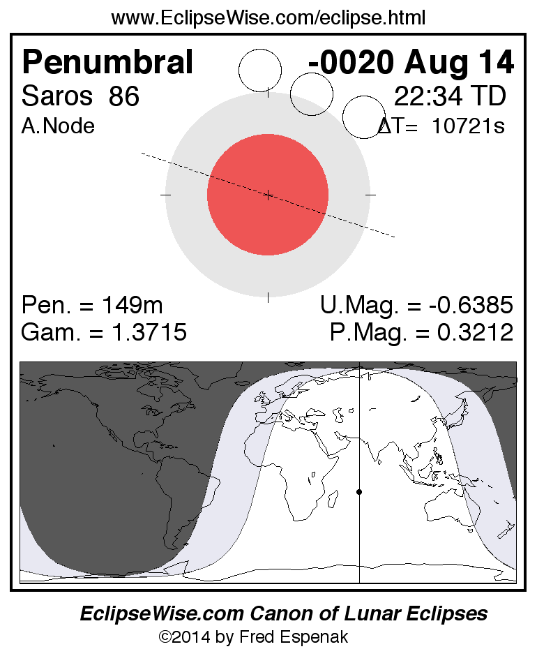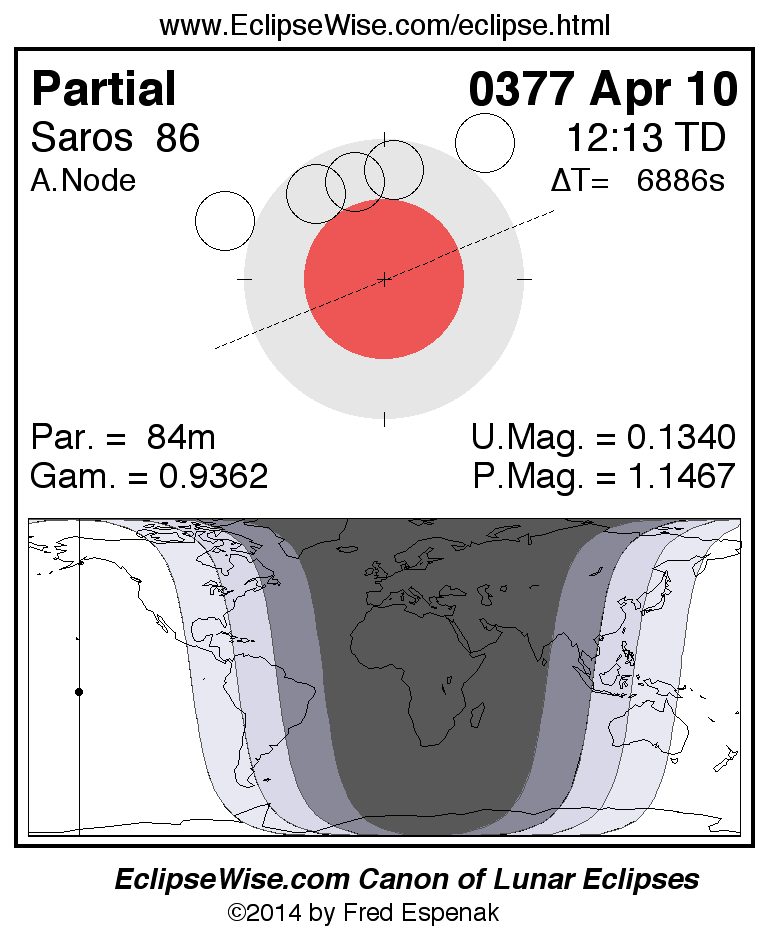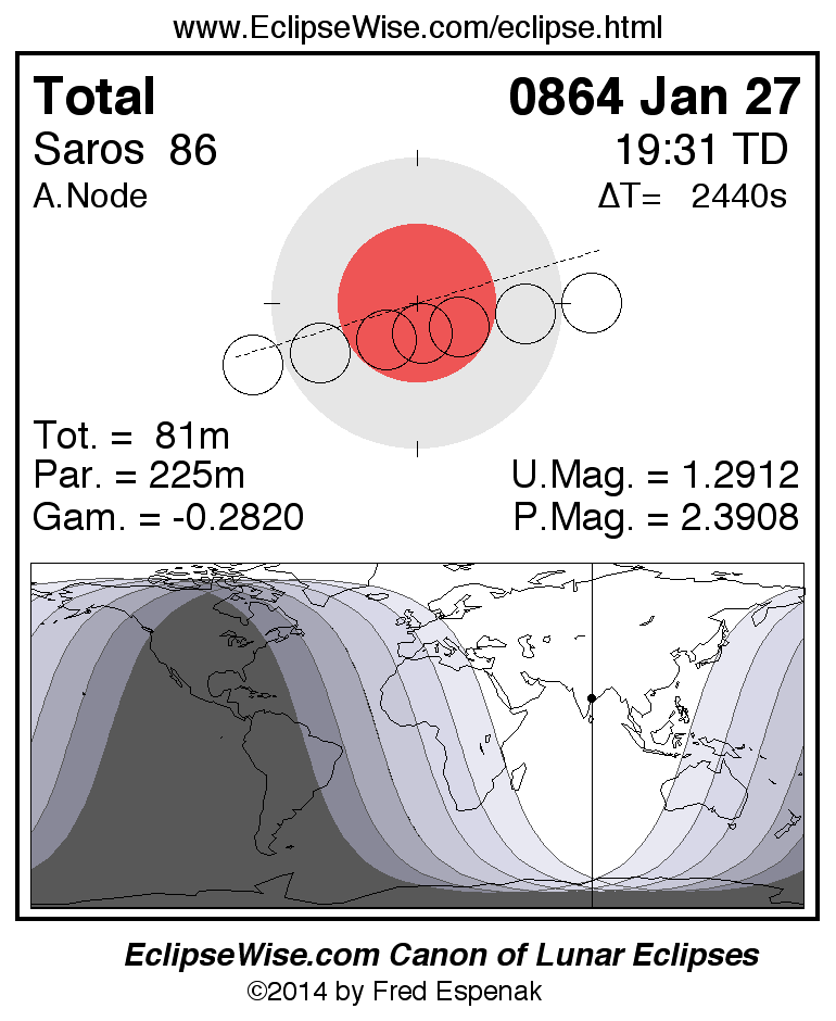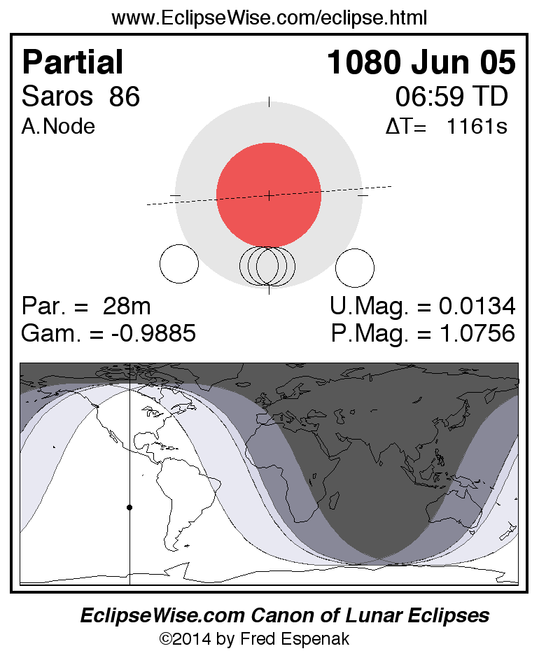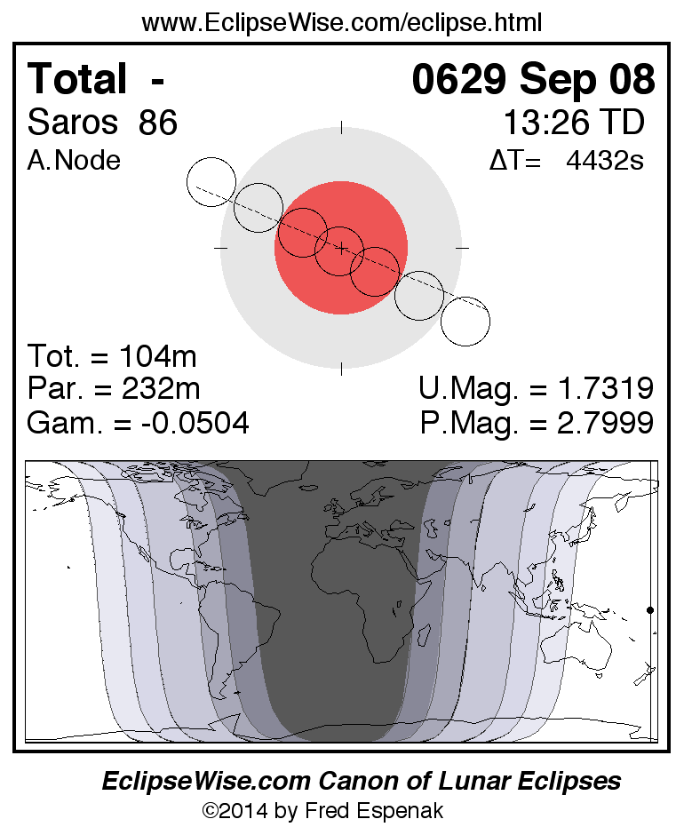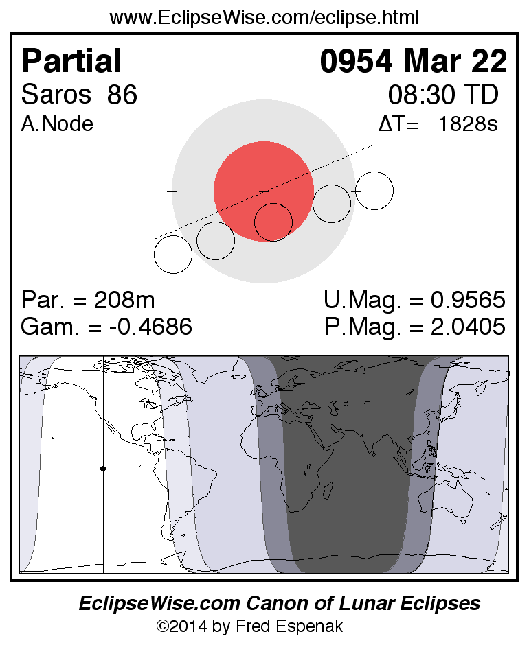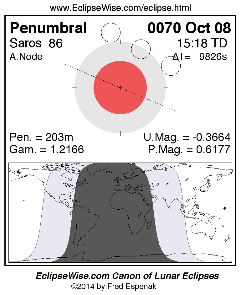 A panorama of all lunar eclipses belonging to Saros 86 is presented here. Each figure shows the Moon's path with respect to Earth's penumbral and umbral shadows. Below the path is a map depicting the geographic region of visibility for the eclipse. The date and time are given for the instant of Greatest Eclipse. Every figure serves as a hyperlink to the EclipseWise Prime page for that eclipse with a larger figure and complete details for the eclipse. Visit the Key to Lunar Eclipse Figures for a detailed explanation of these diagrams. Near the bottom of this page are a series of hyperlinks for more on lunar eclipses.