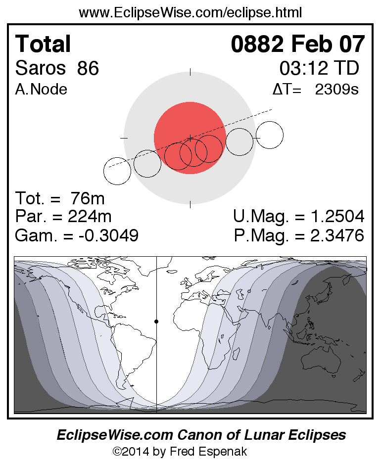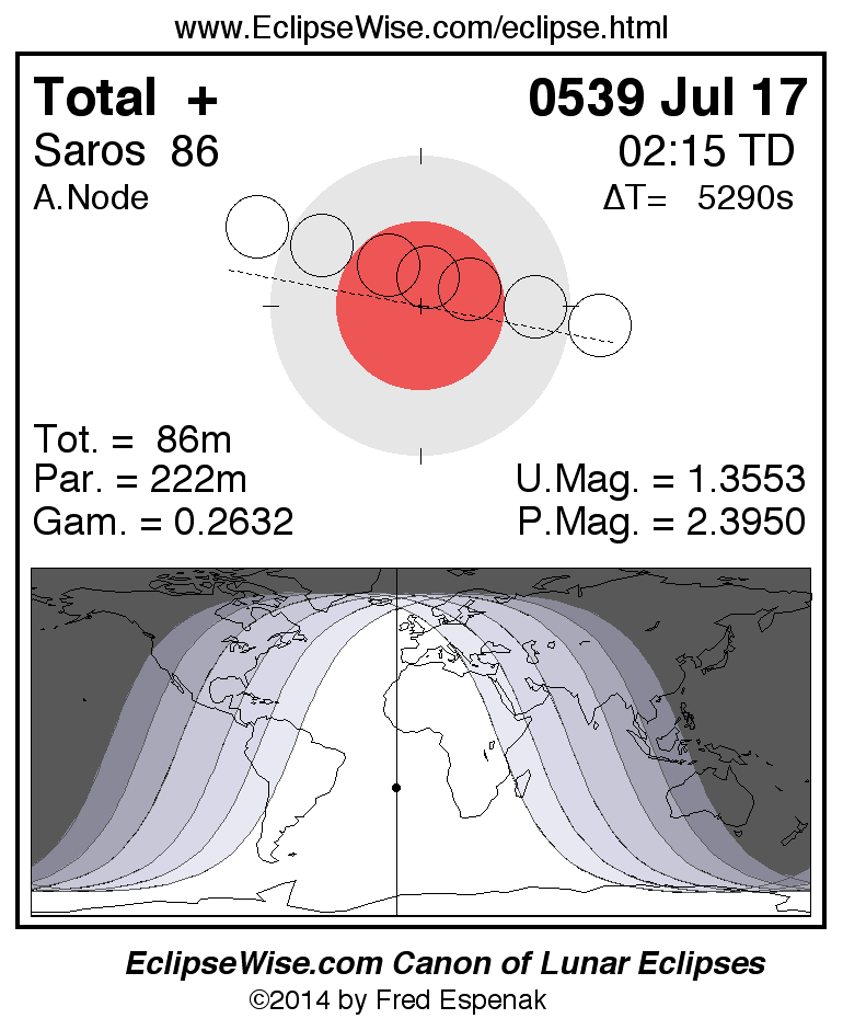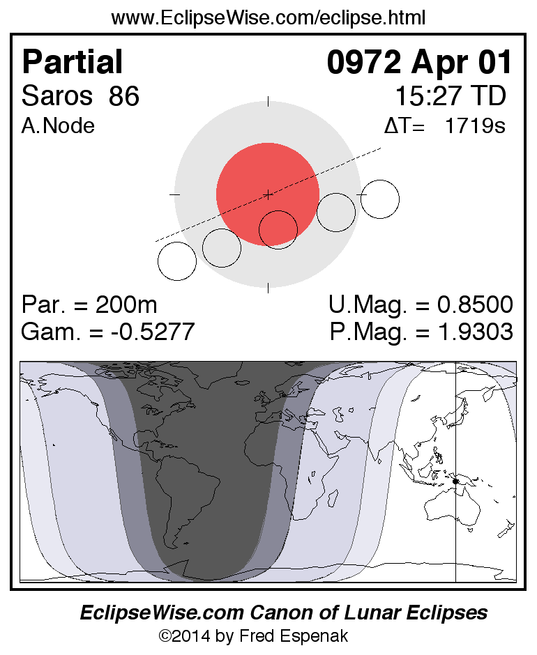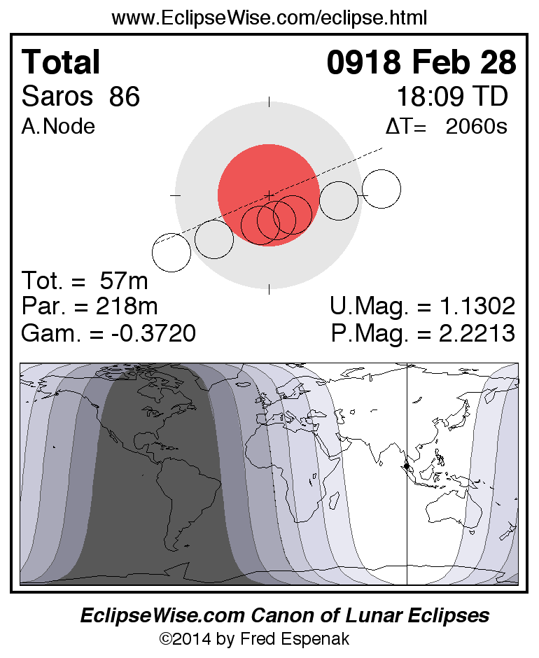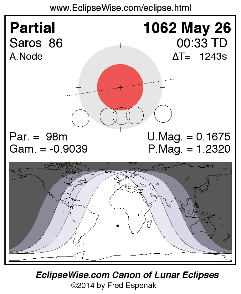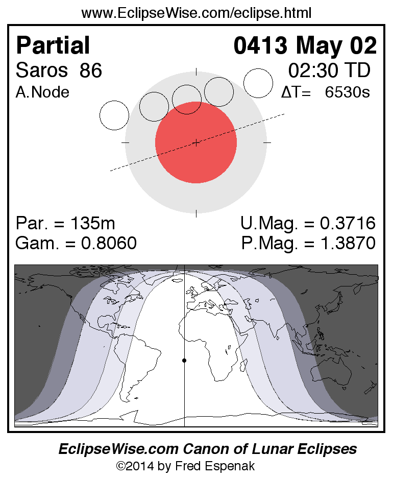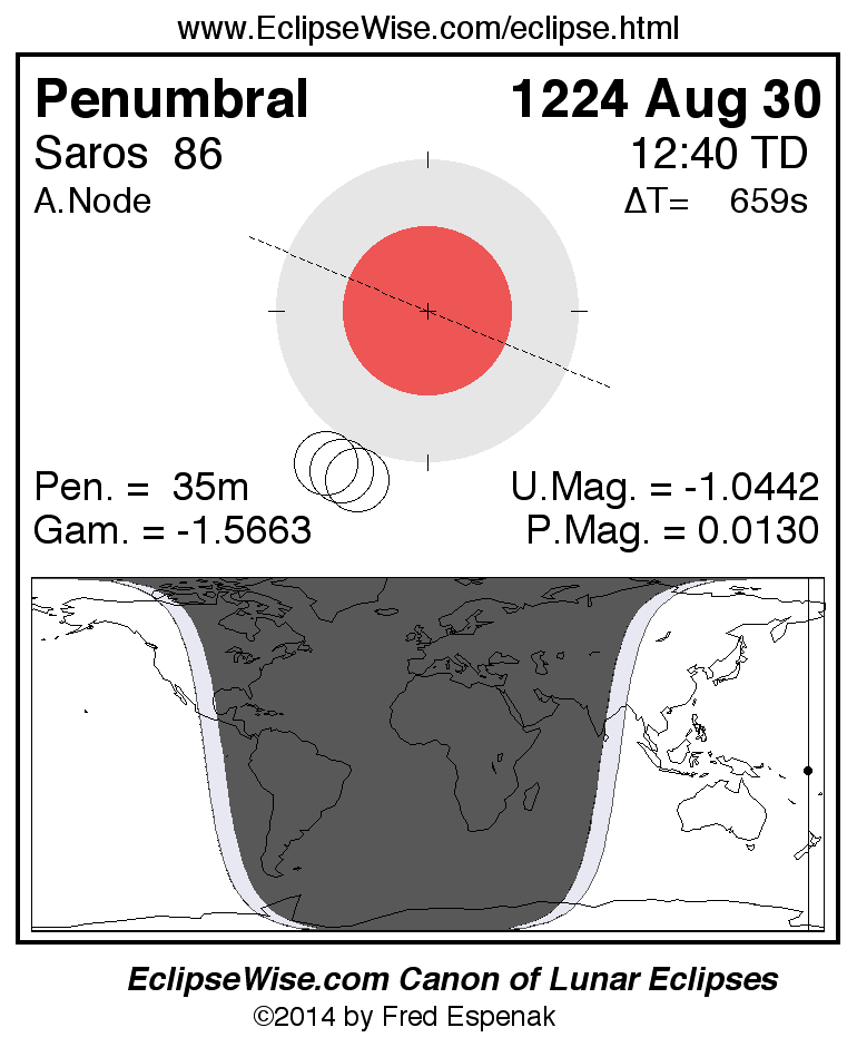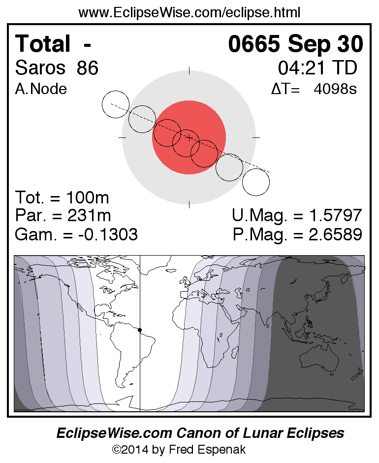 A panorama of all lunar eclipses belonging to Saros 86 is presented here. Each figure shows the Moon's path with respect to Earth's penumbral and umbral shadows. Below the path is a map depicting the geographic region of visibility for the eclipse. The date and time are given for the instant of Greatest Eclipse. Every figure serves as a hyperlink to the EclipseWise Prime page for that eclipse with a larger figure and complete details for the eclipse. Visit the Key to Lunar Eclipse Figures for a detailed explanation of these diagrams. Near the bottom of this page are a series of hyperlinks for more on lunar eclipses.