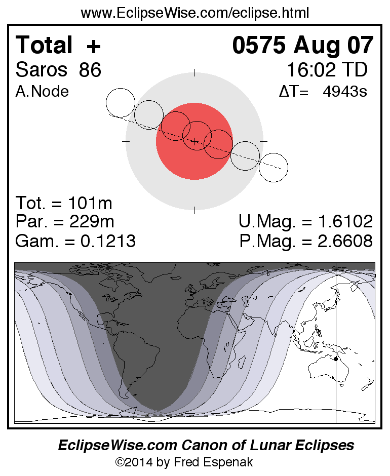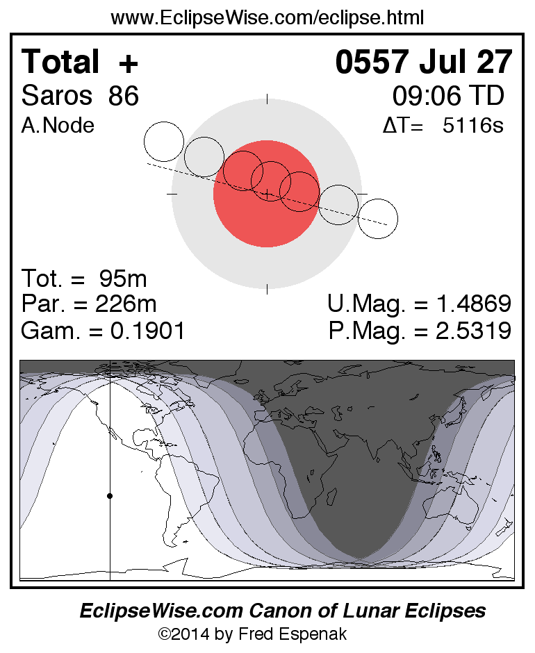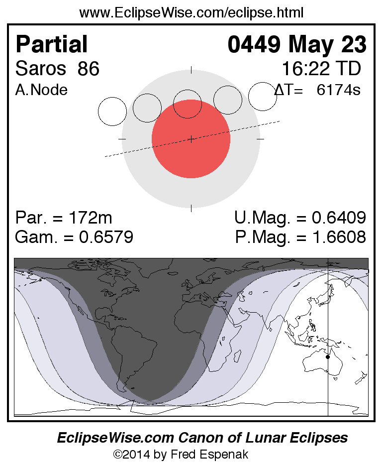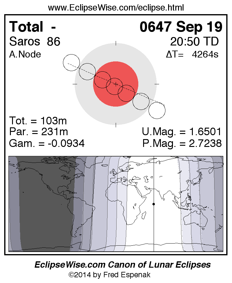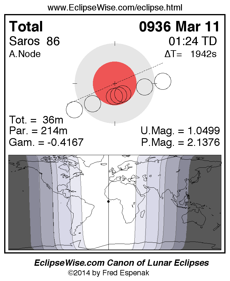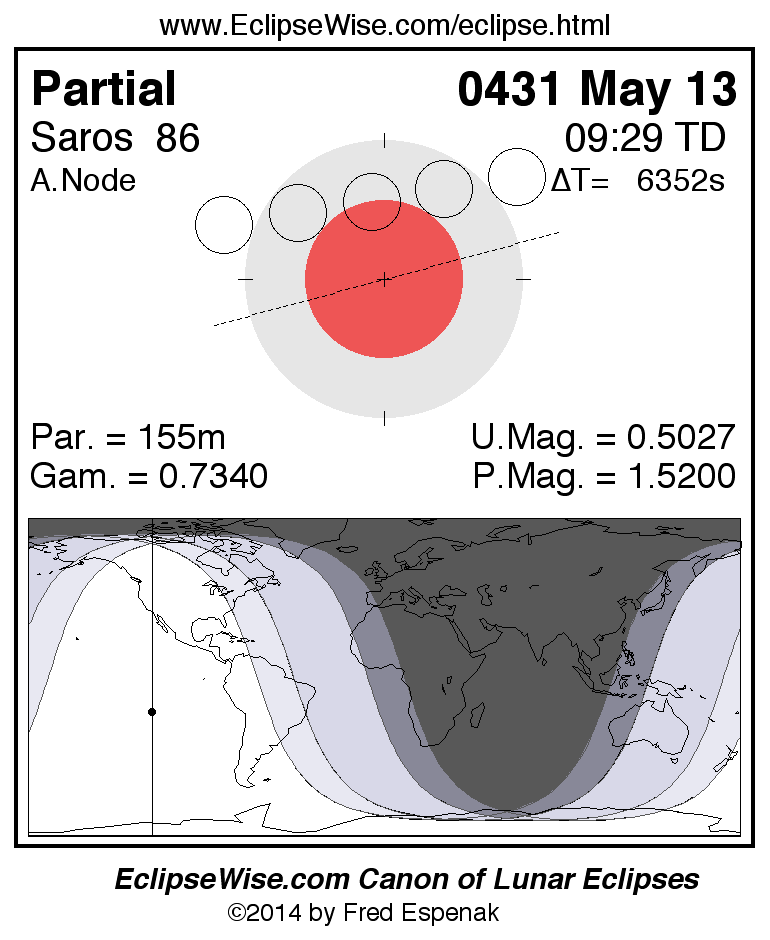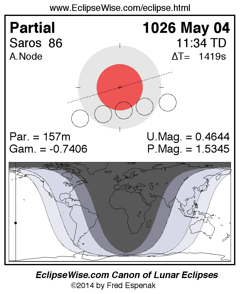 A panorama of all lunar eclipses belonging to Saros 86 is presented here. Each figure shows the Moon's path with respect to Earth's penumbral and umbral shadows. Below the path is a map depicting the geographic region of visibility for the eclipse. The date and time are given for the instant of Greatest Eclipse. Every figure serves as a hyperlink to the EclipseWise Prime page for that eclipse with a larger figure and complete details for the eclipse. Visit the Key to Lunar Eclipse Figures for a detailed explanation of these diagrams. Near the bottom of this page are a series of hyperlinks for more on lunar eclipses.