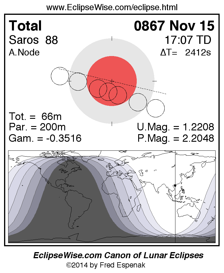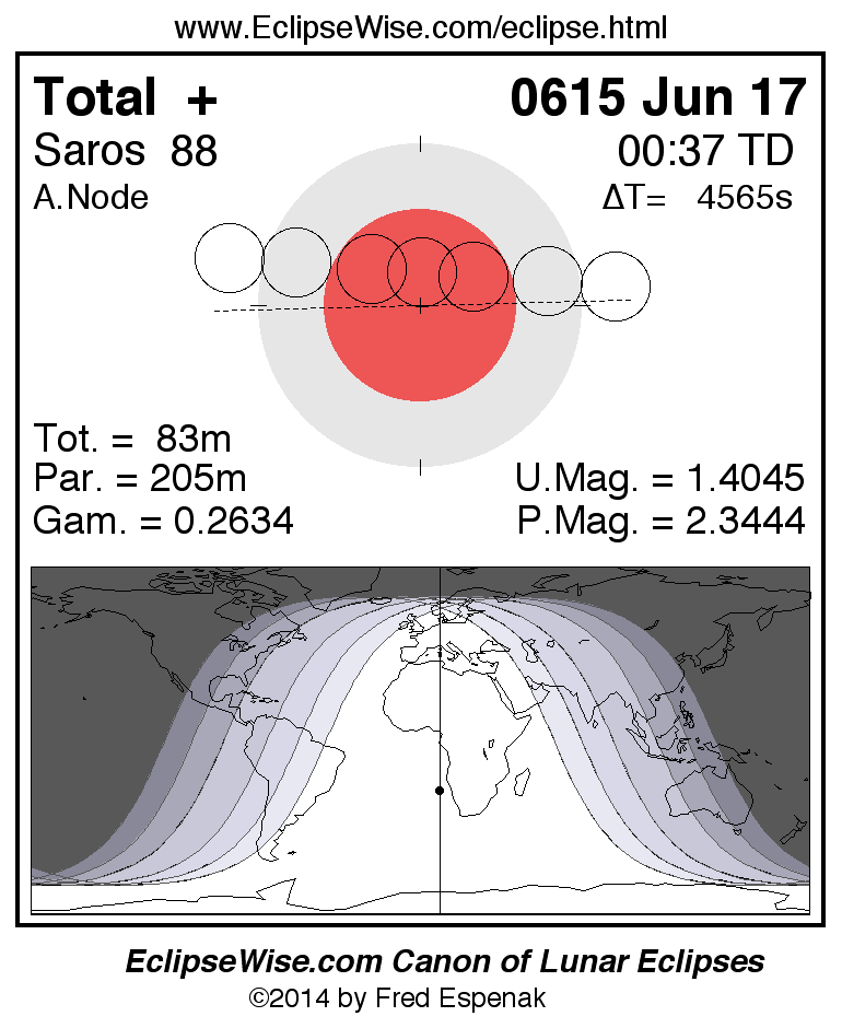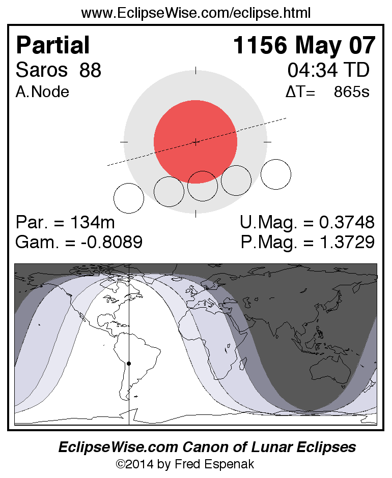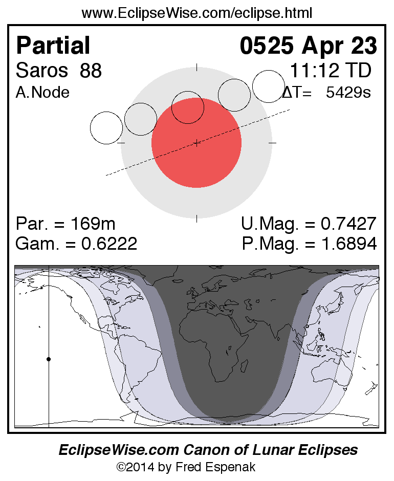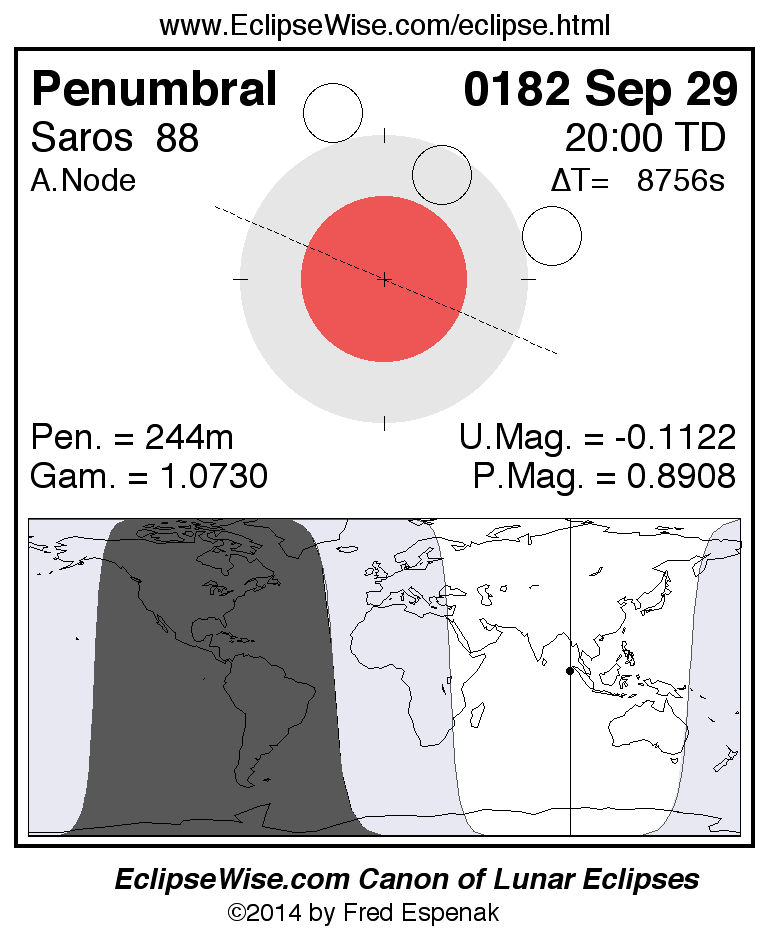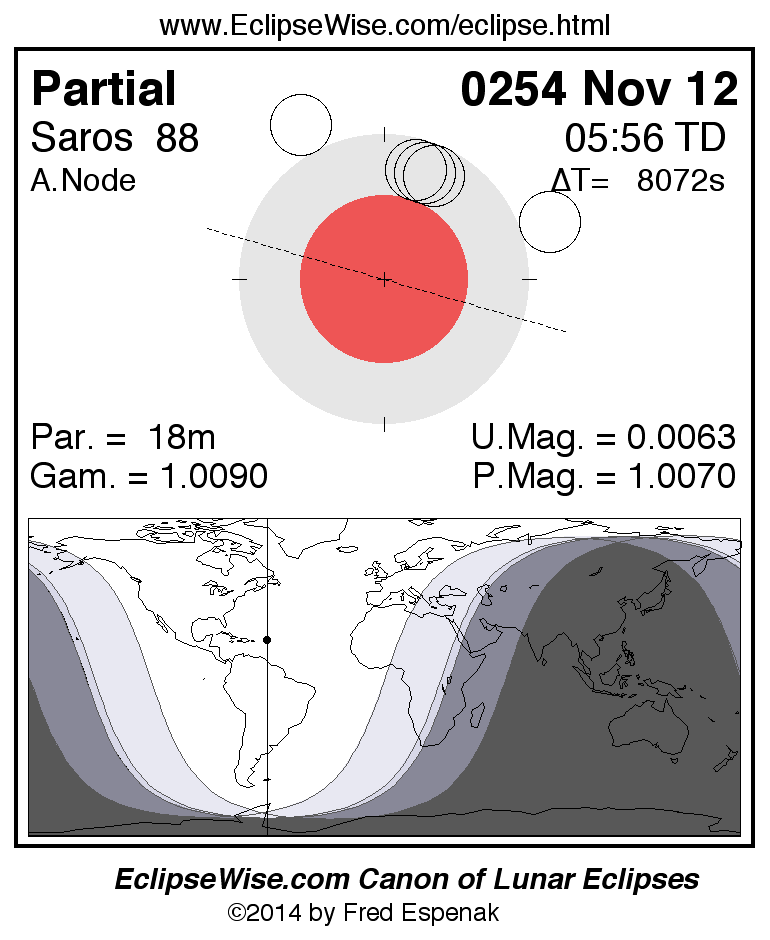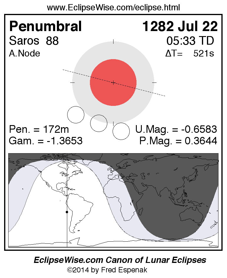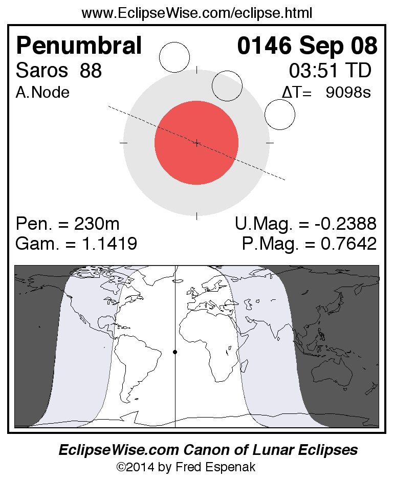 A panorama of all lunar eclipses belonging to Saros 88 is presented here. Each figure shows the Moon's path with respect to Earth's penumbral and umbral shadows. Below the path is a map depicting the geographic region of visibility for the eclipse. The date and time are given for the instant of Greatest Eclipse. Every figure serves as a hyperlink to the EclipseWise Prime page for that eclipse with a larger figure and complete details for the eclipse. Visit the Key to Lunar Eclipse Figures for a detailed explanation of these diagrams. Near the bottom of this page are a series of hyperlinks for more on lunar eclipses.