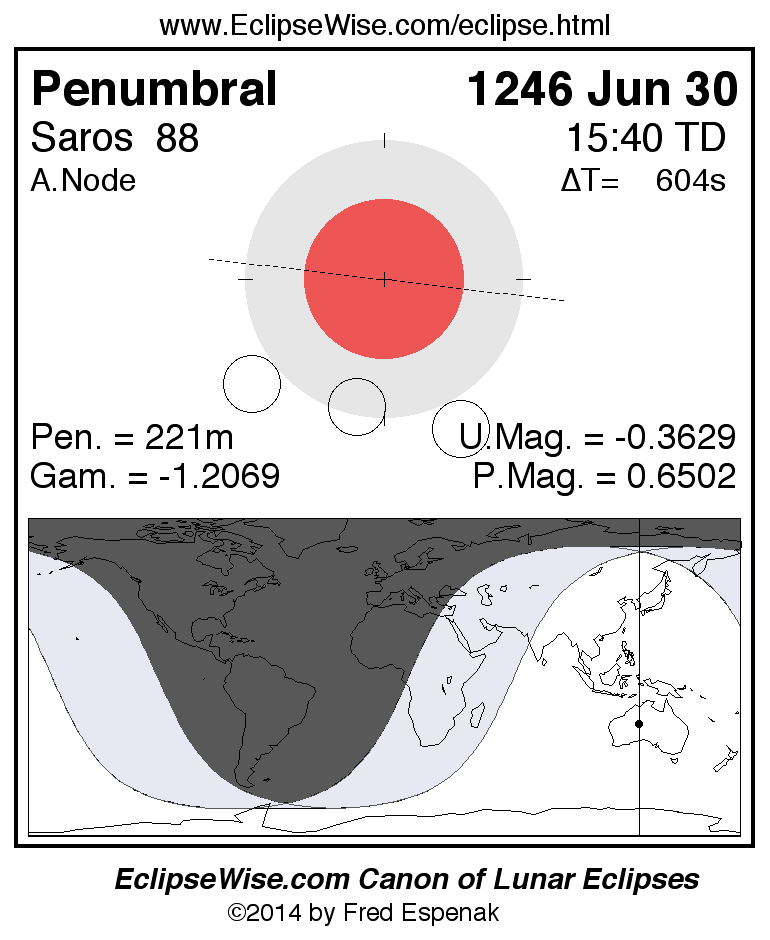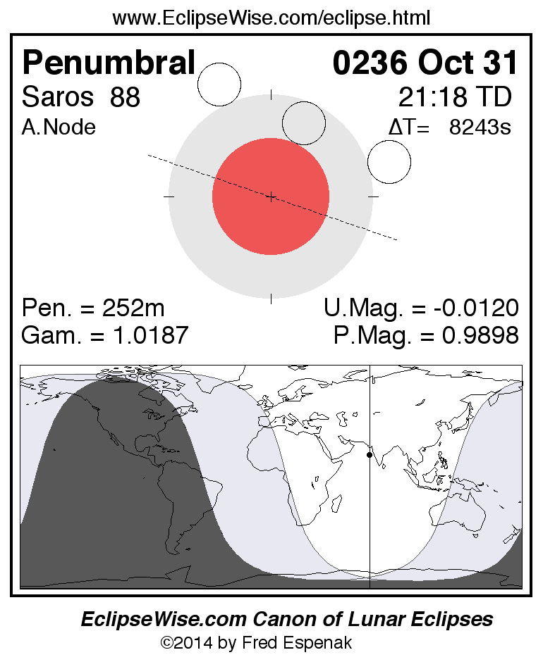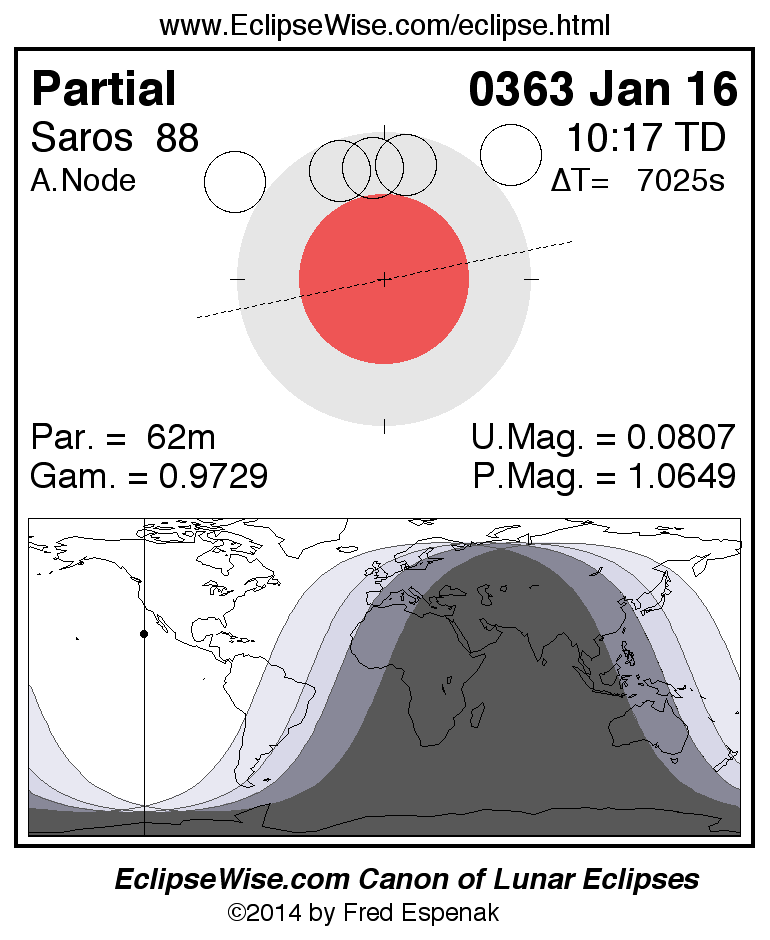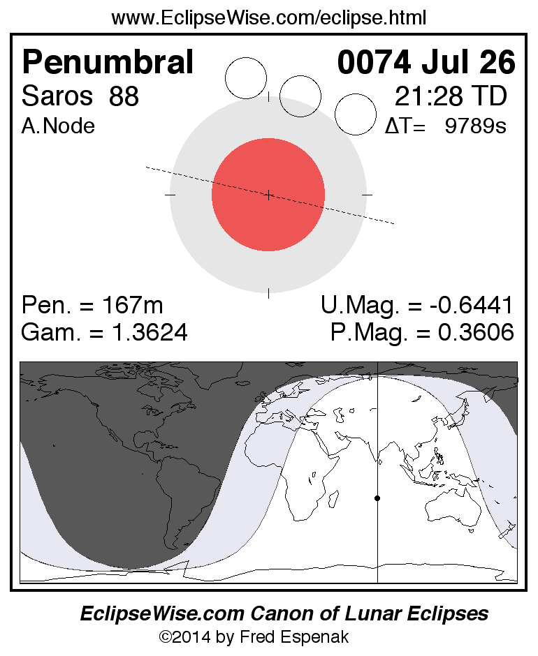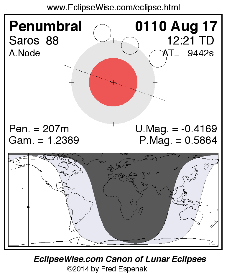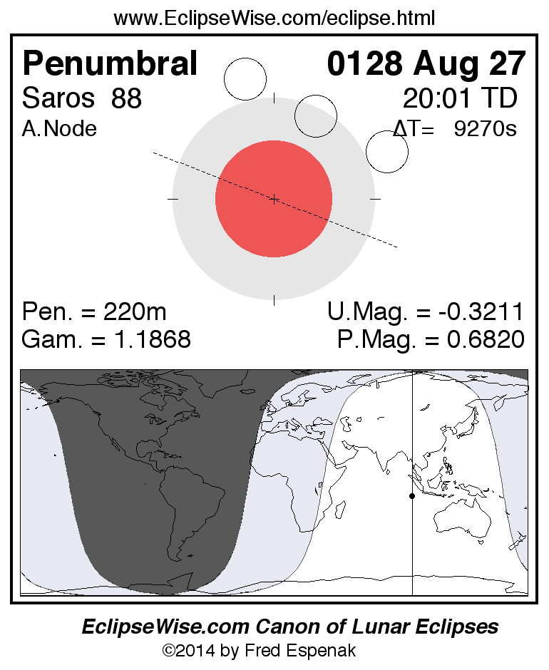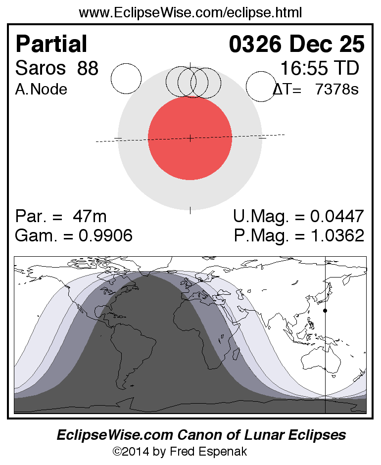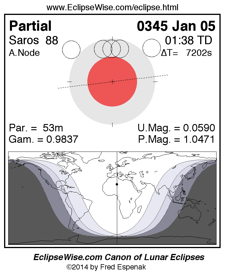 A panorama of all lunar eclipses belonging to Saros 88 is presented here. Each figure shows the Moon's path with respect to Earth's penumbral and umbral shadows. Below the path is a map depicting the geographic region of visibility for the eclipse. The date and time are given for the instant of Greatest Eclipse. Every figure serves as a hyperlink to the EclipseWise Prime page for that eclipse with a larger figure and complete details for the eclipse. Visit the Key to Lunar Eclipse Figures for a detailed explanation of these diagrams. Near the bottom of this page are a series of hyperlinks for more on lunar eclipses.