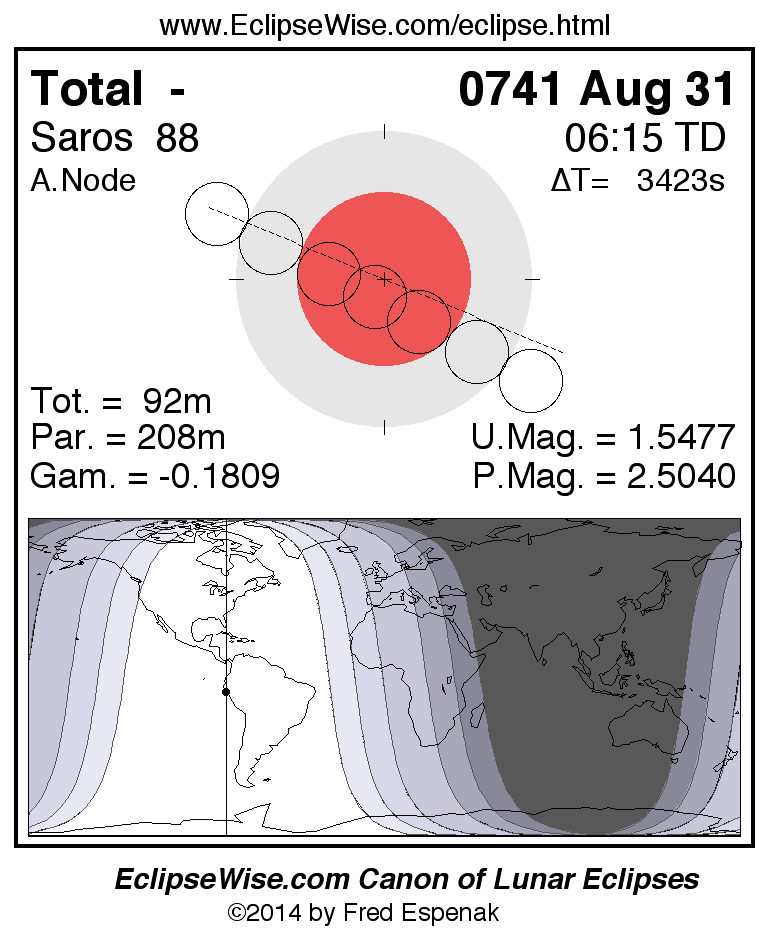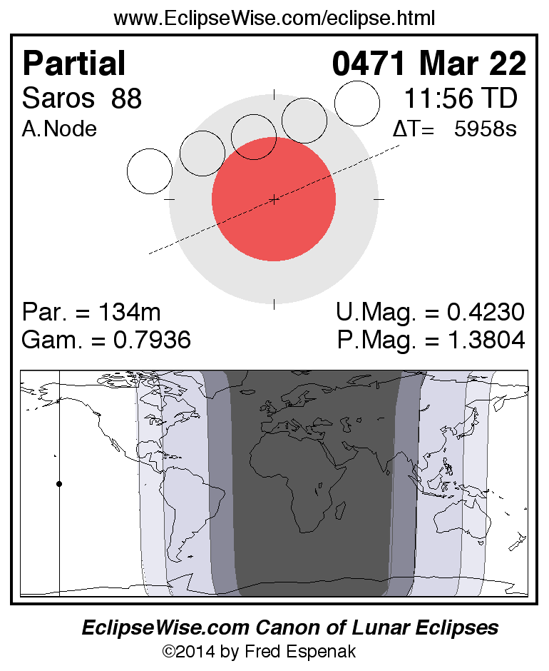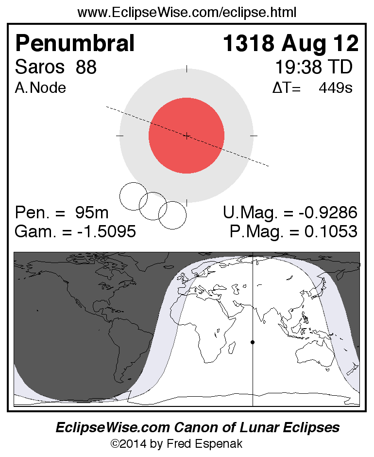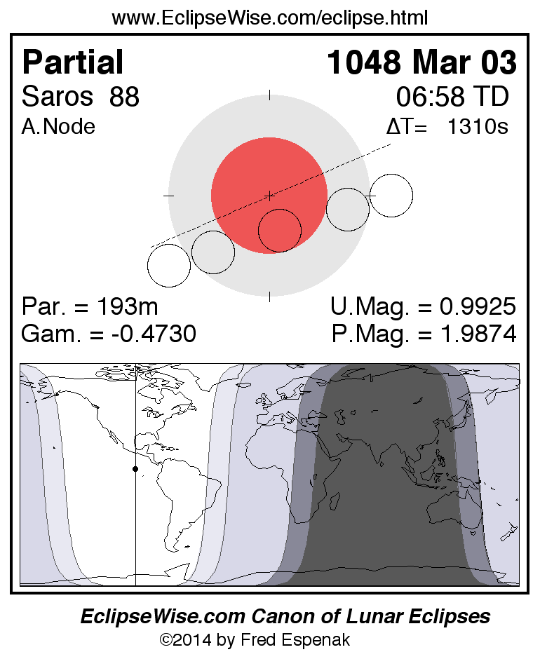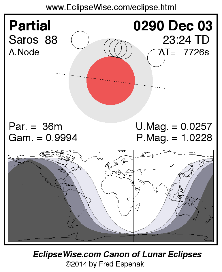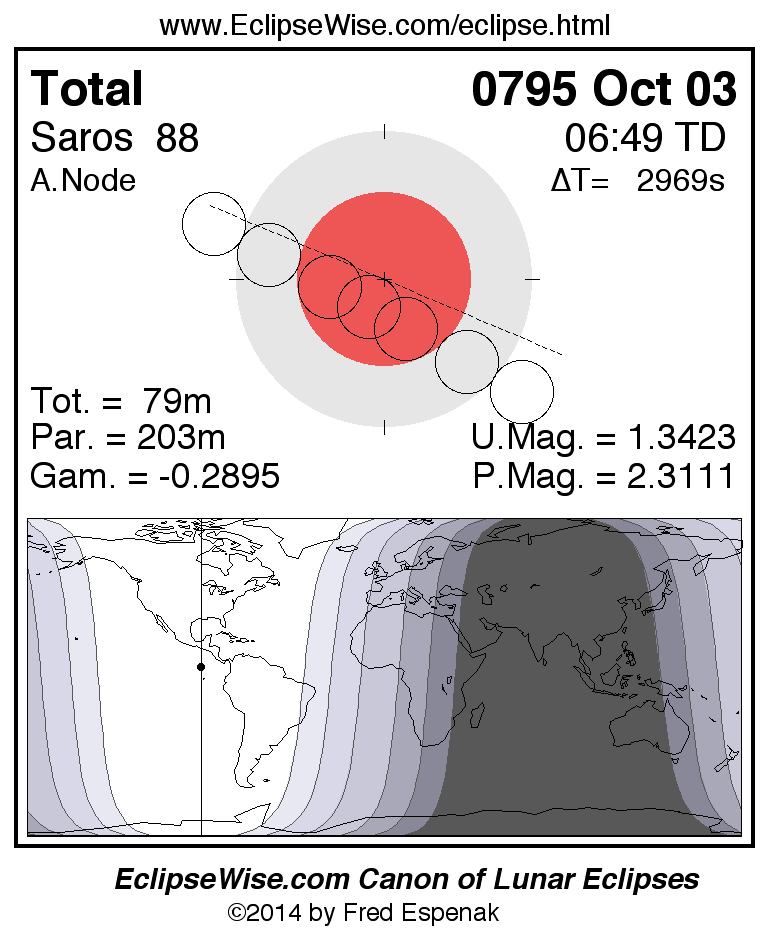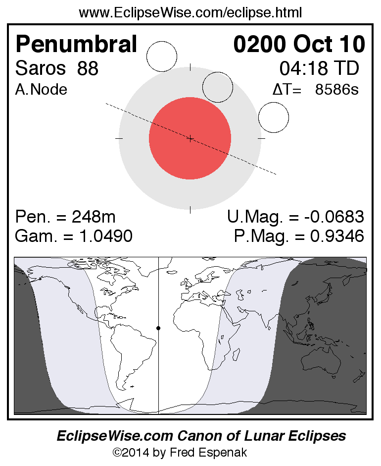 A panorama of all lunar eclipses belonging to Saros 88 is presented here. Each figure shows the Moon's path with respect to Earth's penumbral and umbral shadows. Below the path is a map depicting the geographic region of visibility for the eclipse. The date and time are given for the instant of Greatest Eclipse. Every figure serves as a hyperlink to the EclipseWise Prime page for that eclipse with a larger figure and complete details for the eclipse. Visit the Key to Lunar Eclipse Figures for a detailed explanation of these diagrams. Near the bottom of this page are a series of hyperlinks for more on lunar eclipses.