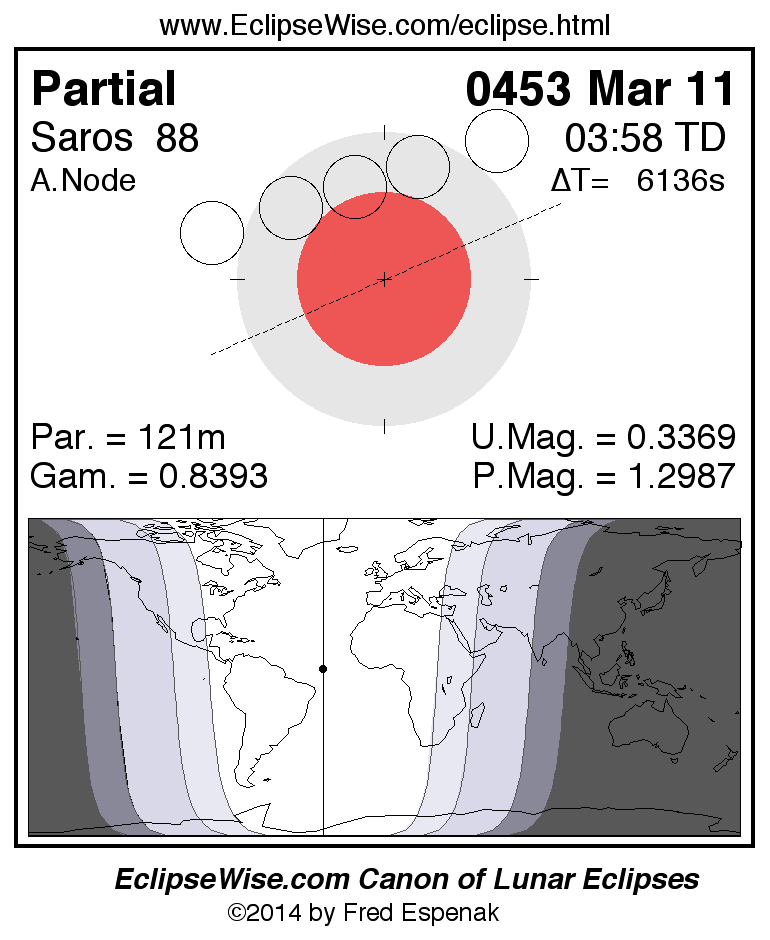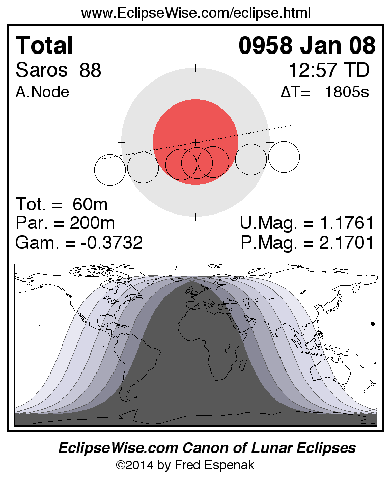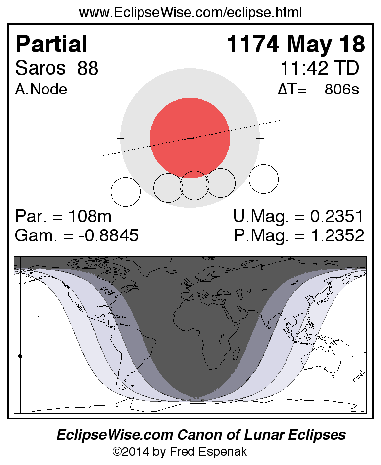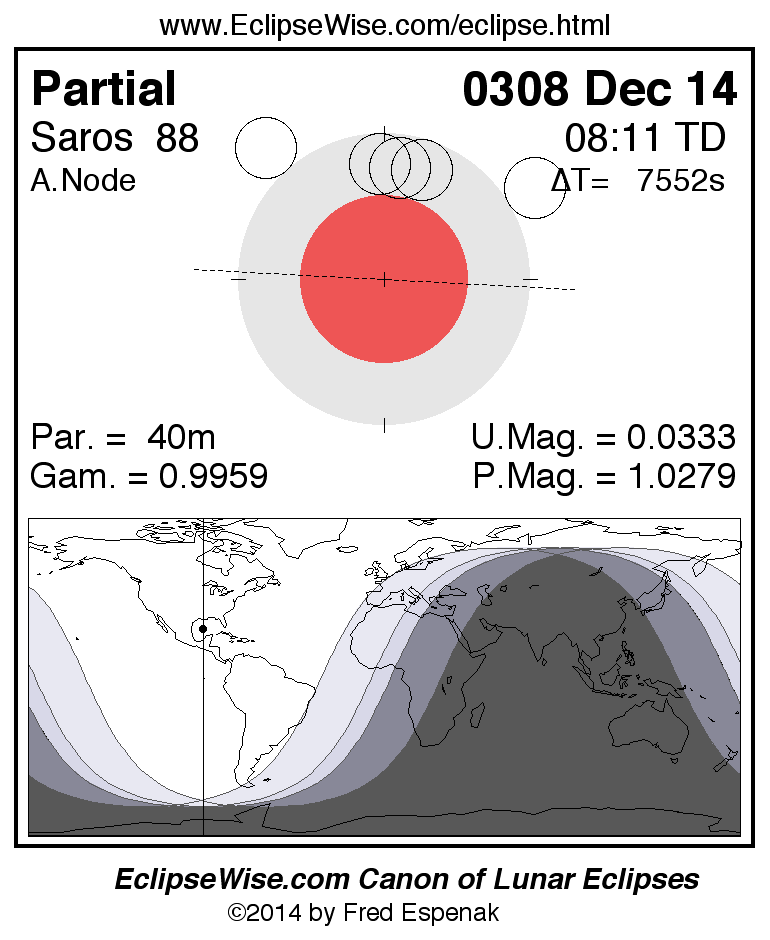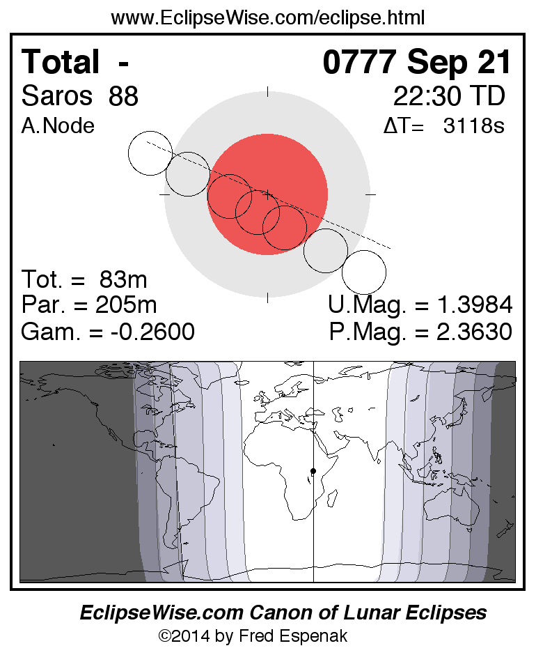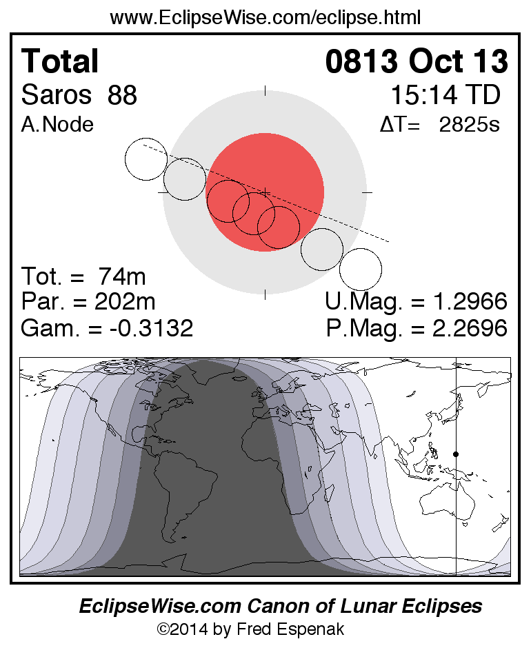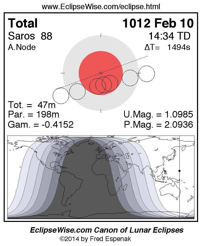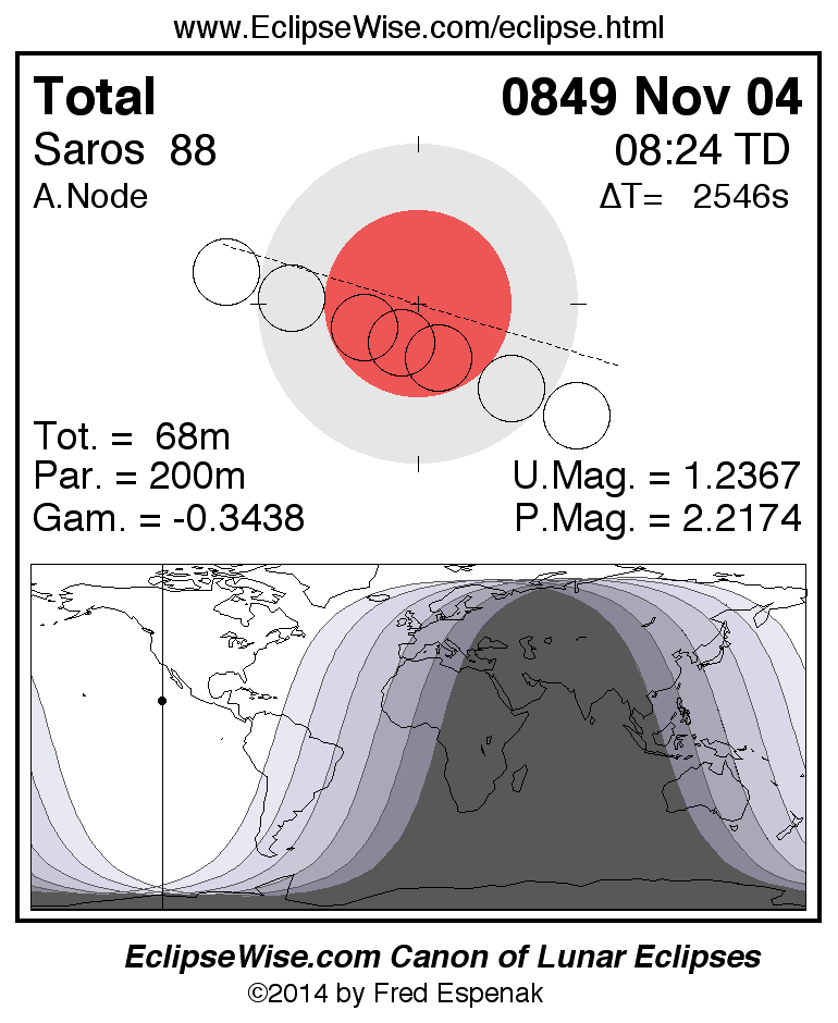 A panorama of all lunar eclipses belonging to Saros 88 is presented here. Each figure shows the Moon's path with respect to Earth's penumbral and umbral shadows. Below the path is a map depicting the geographic region of visibility for the eclipse. The date and time are given for the instant of Greatest Eclipse. Every figure serves as a hyperlink to the EclipseWise Prime page for that eclipse with a larger figure and complete details for the eclipse. Visit the Key to Lunar Eclipse Figures for a detailed explanation of these diagrams. Near the bottom of this page are a series of hyperlinks for more on lunar eclipses.