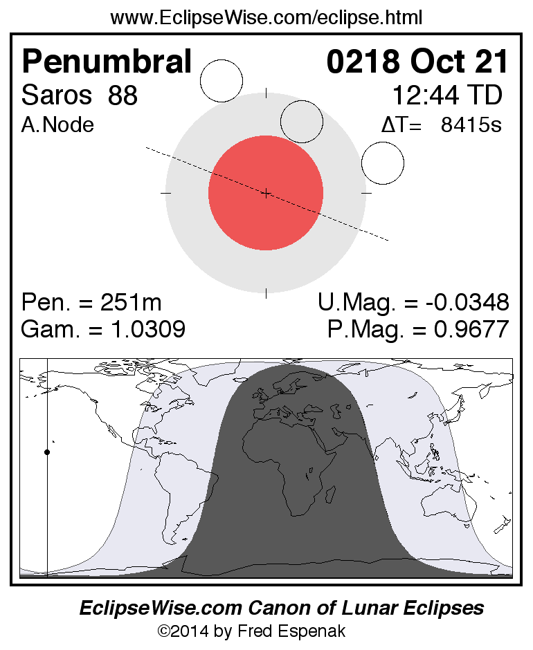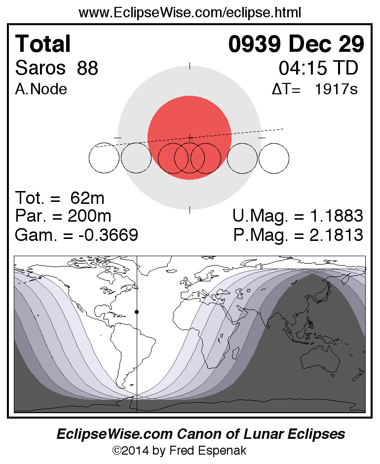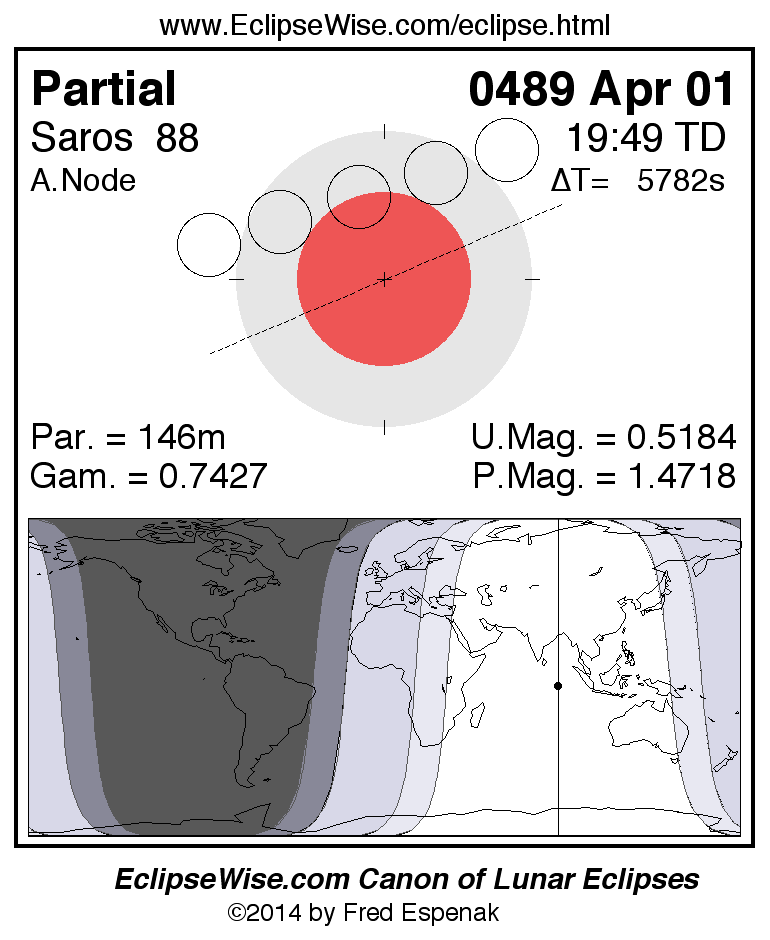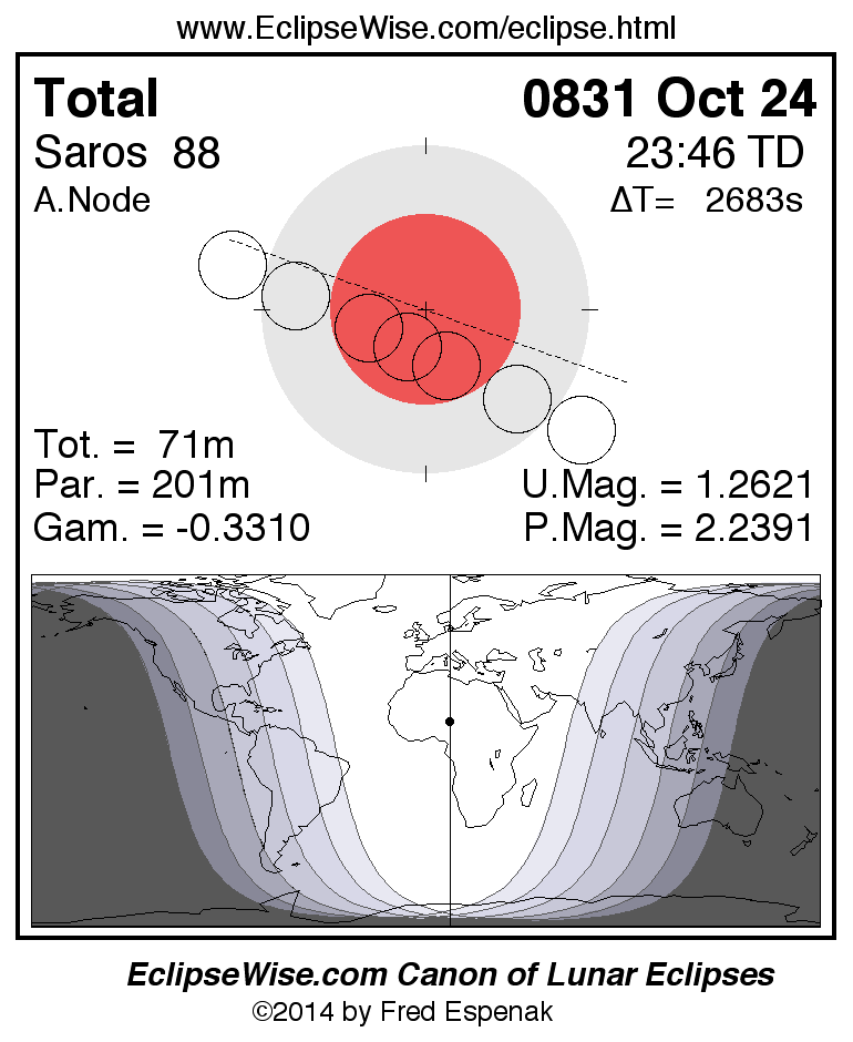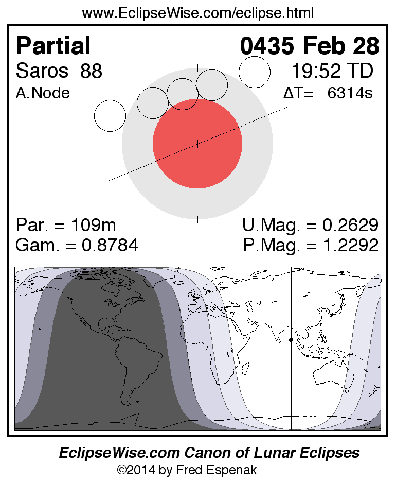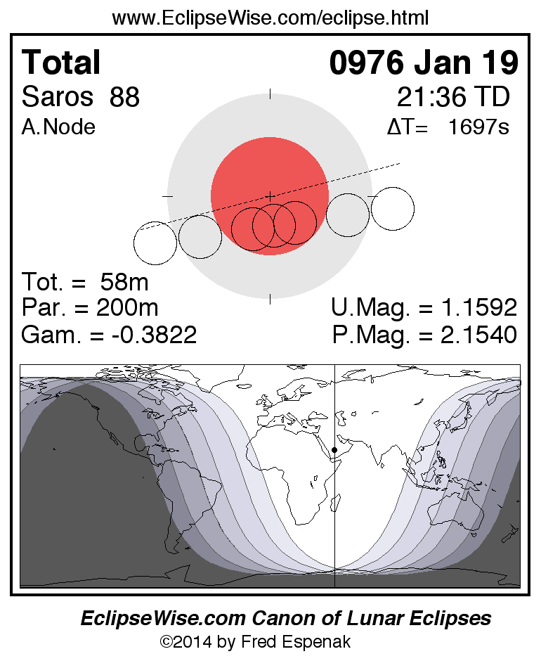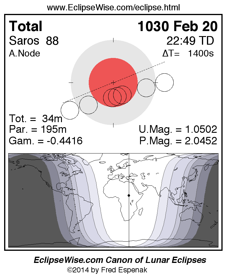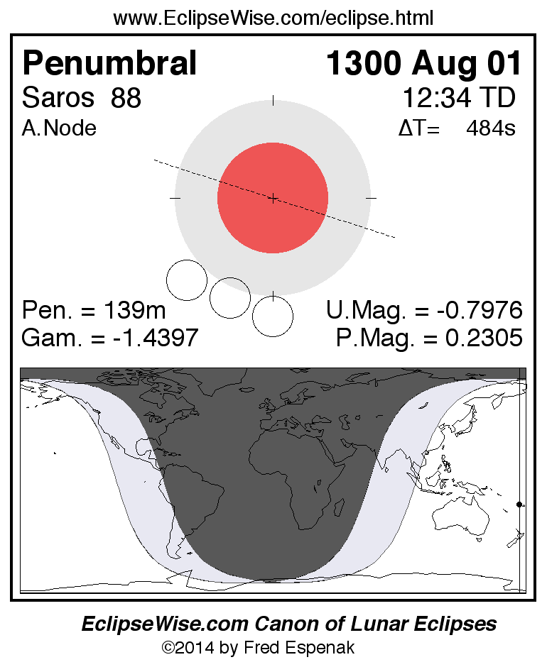 A panorama of all lunar eclipses belonging to Saros 88 is presented here. Each figure shows the Moon's path with respect to Earth's penumbral and umbral shadows. Below the path is a map depicting the geographic region of visibility for the eclipse. The date and time are given for the instant of Greatest Eclipse. Every figure serves as a hyperlink to the EclipseWise Prime page for that eclipse with a larger figure and complete details for the eclipse. Visit the Key to Lunar Eclipse Figures for a detailed explanation of these diagrams. Near the bottom of this page are a series of hyperlinks for more on lunar eclipses.